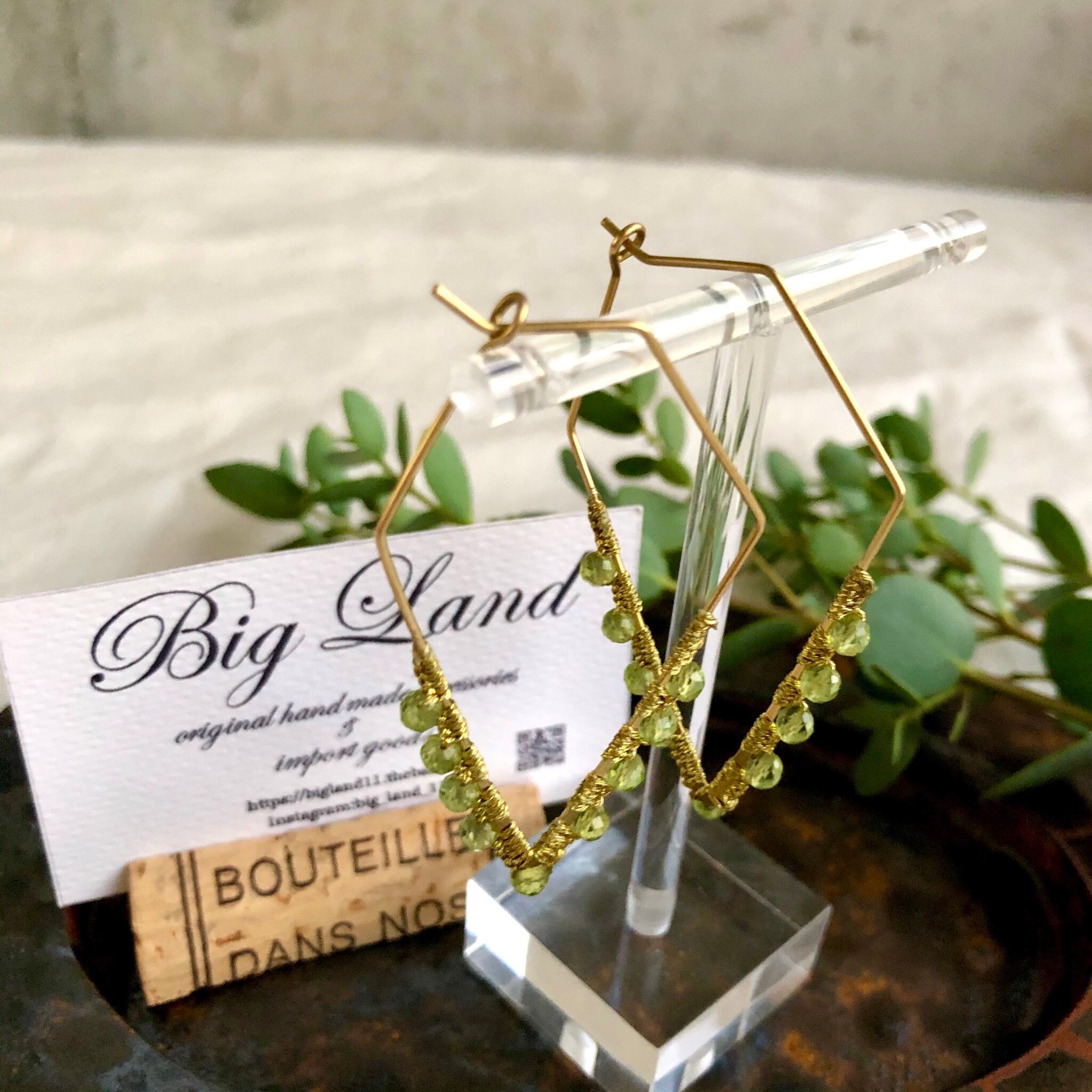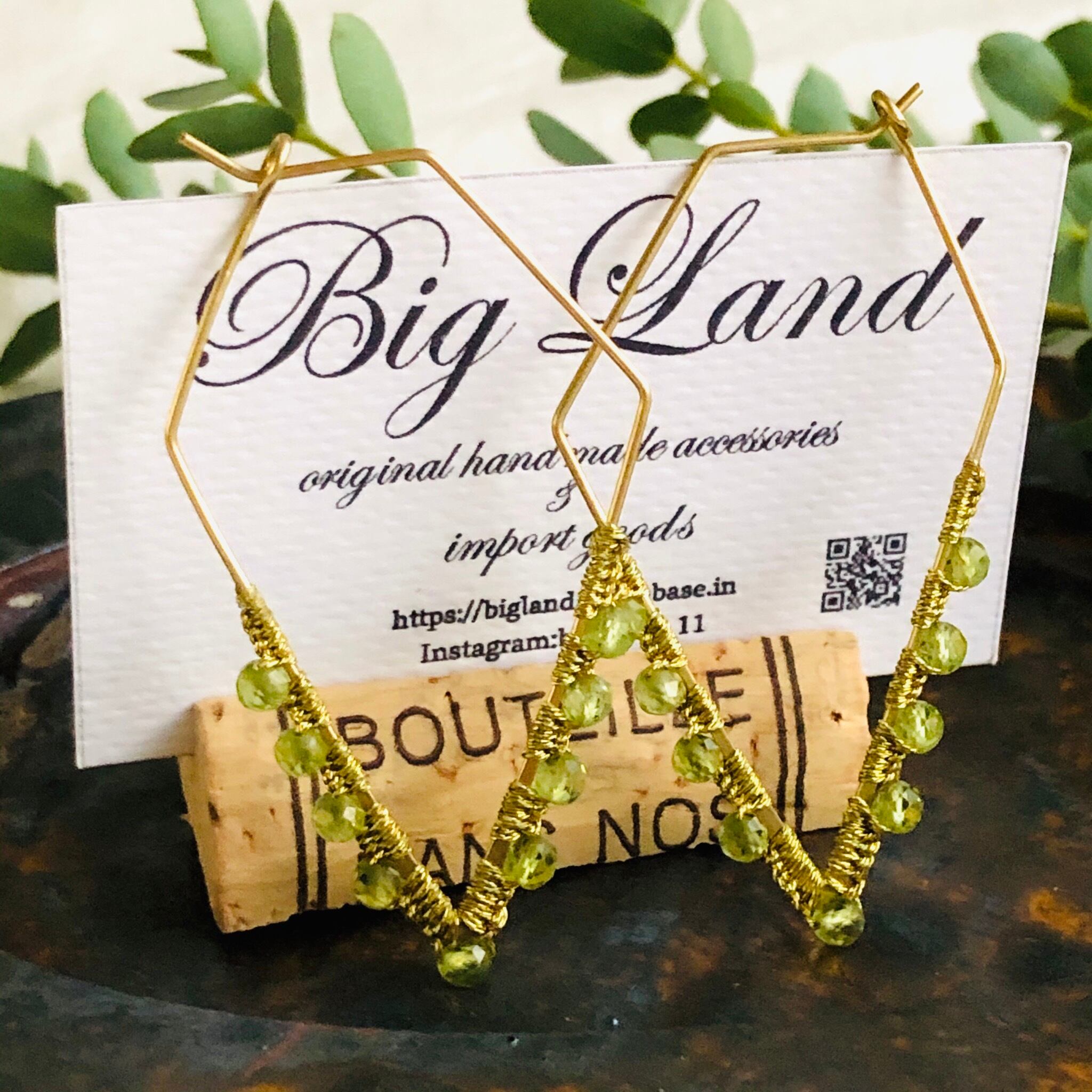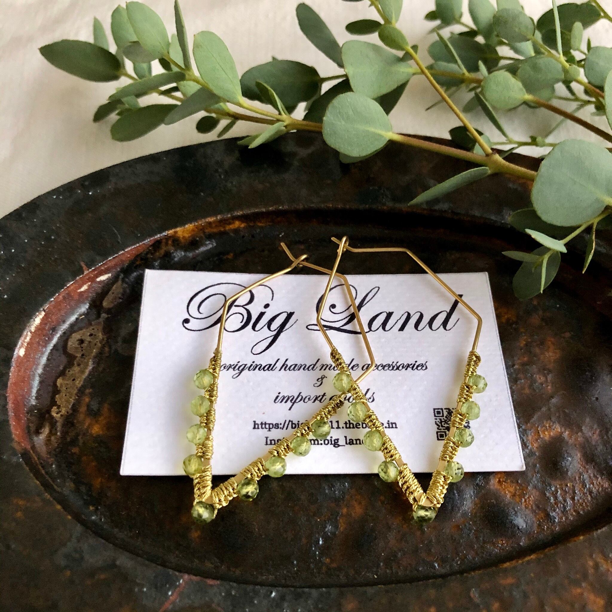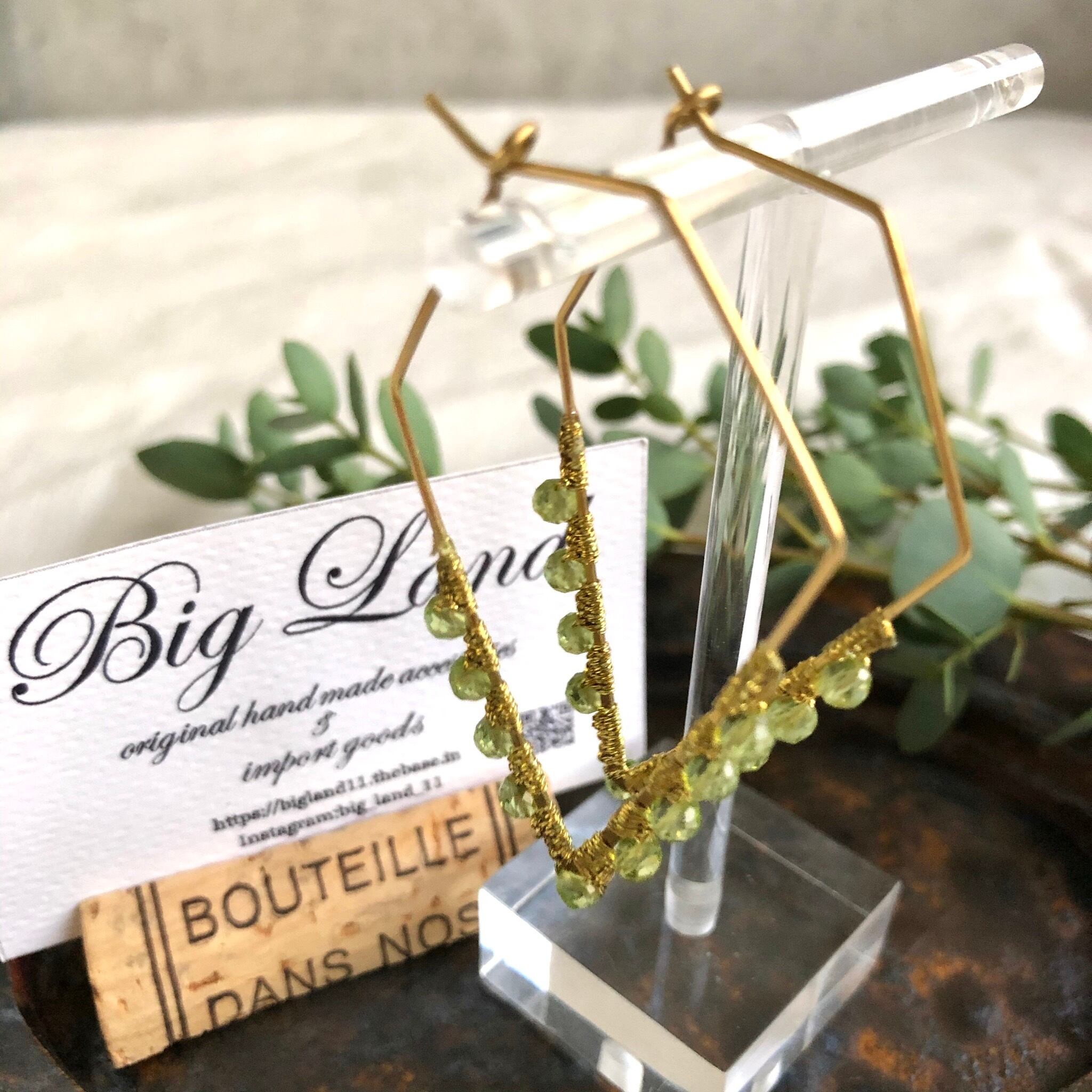ペリドットを真鍮素材にゴールドの糸で丁寧にひと編みひと編みし繊細なディテールをお楽しみ下さい✨こなれ感あるアンティーク風な感じに仕上がり、大振りで小顔効果あり!!