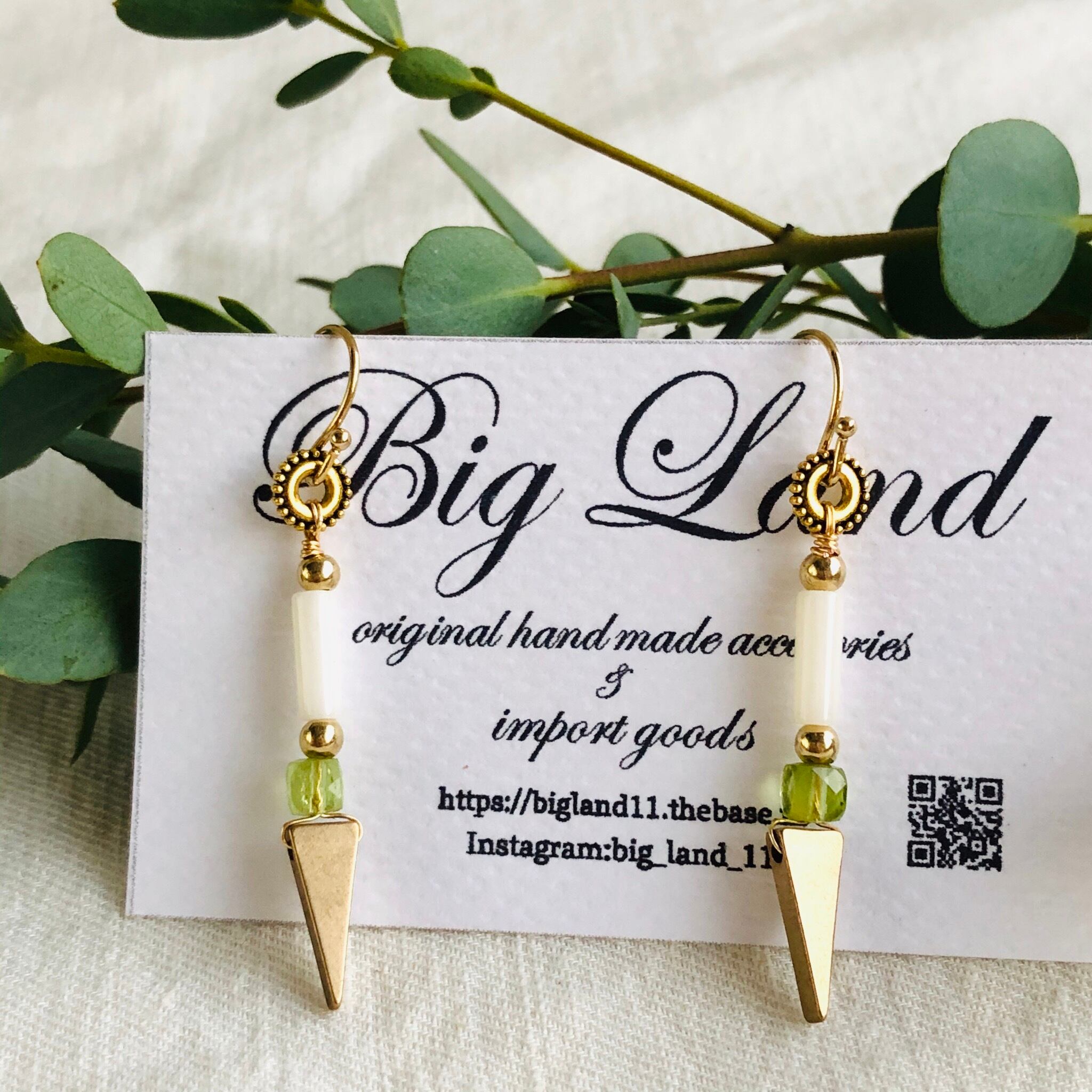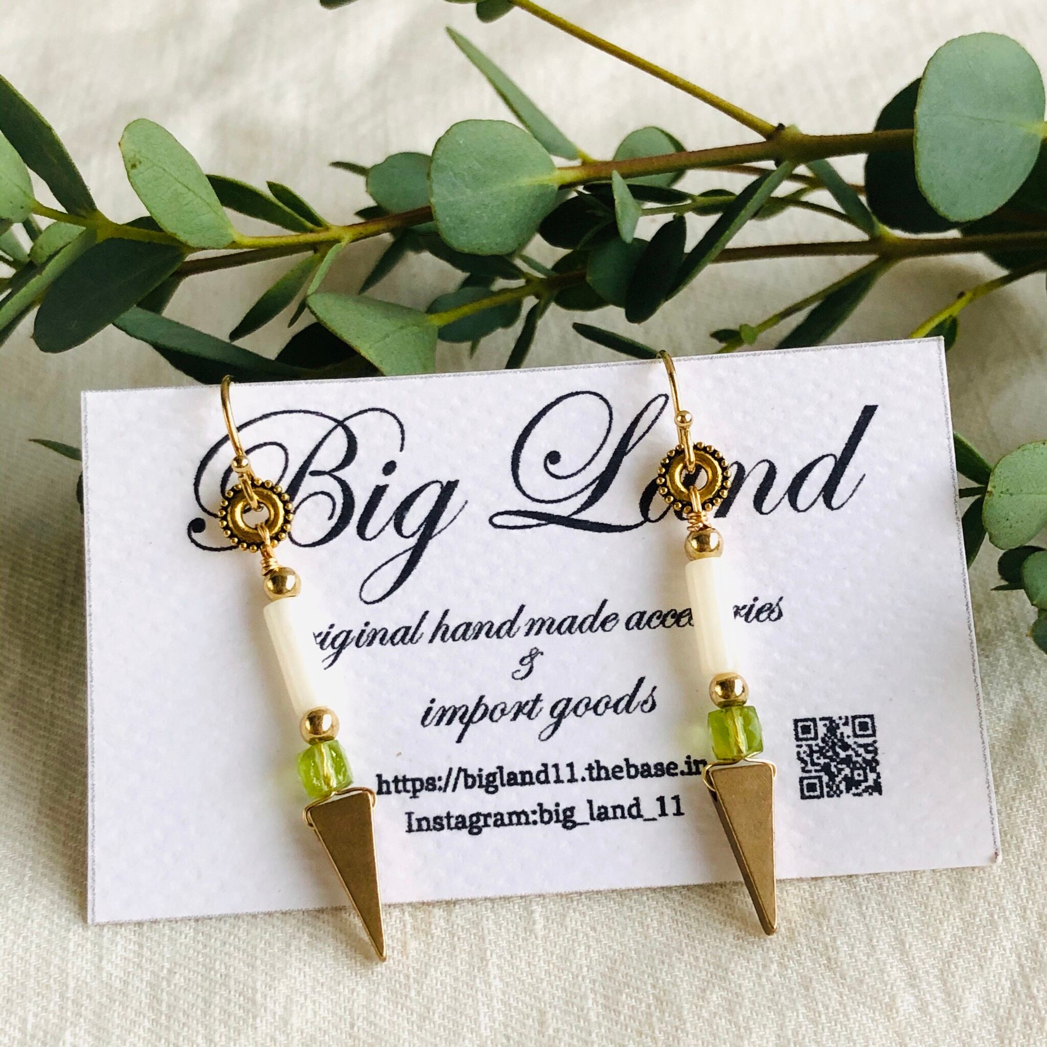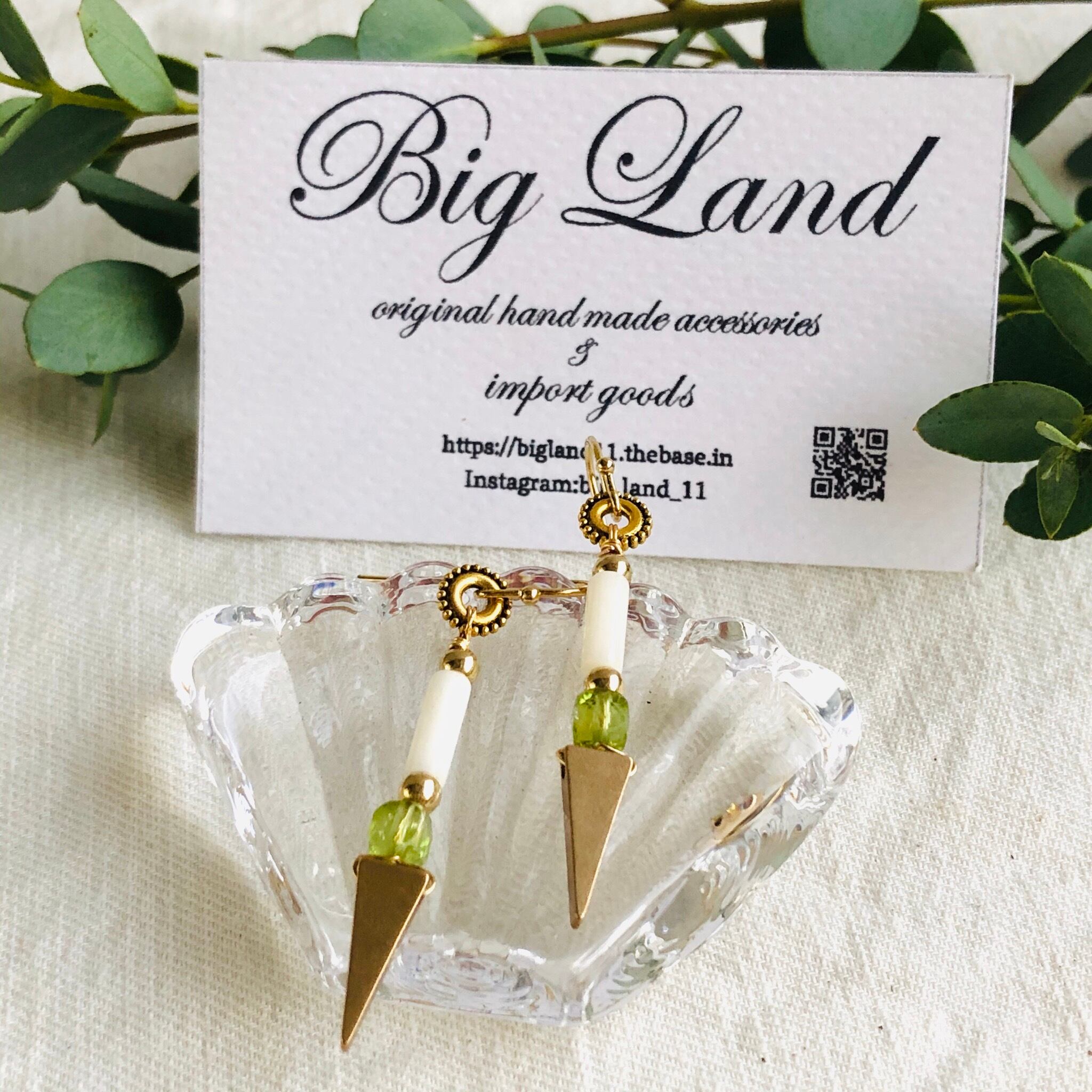 多面カットのペリドットを真鍮素材とホワイト珊瑚と組み合わせ、遊び心あるデザインに仕上げました✨