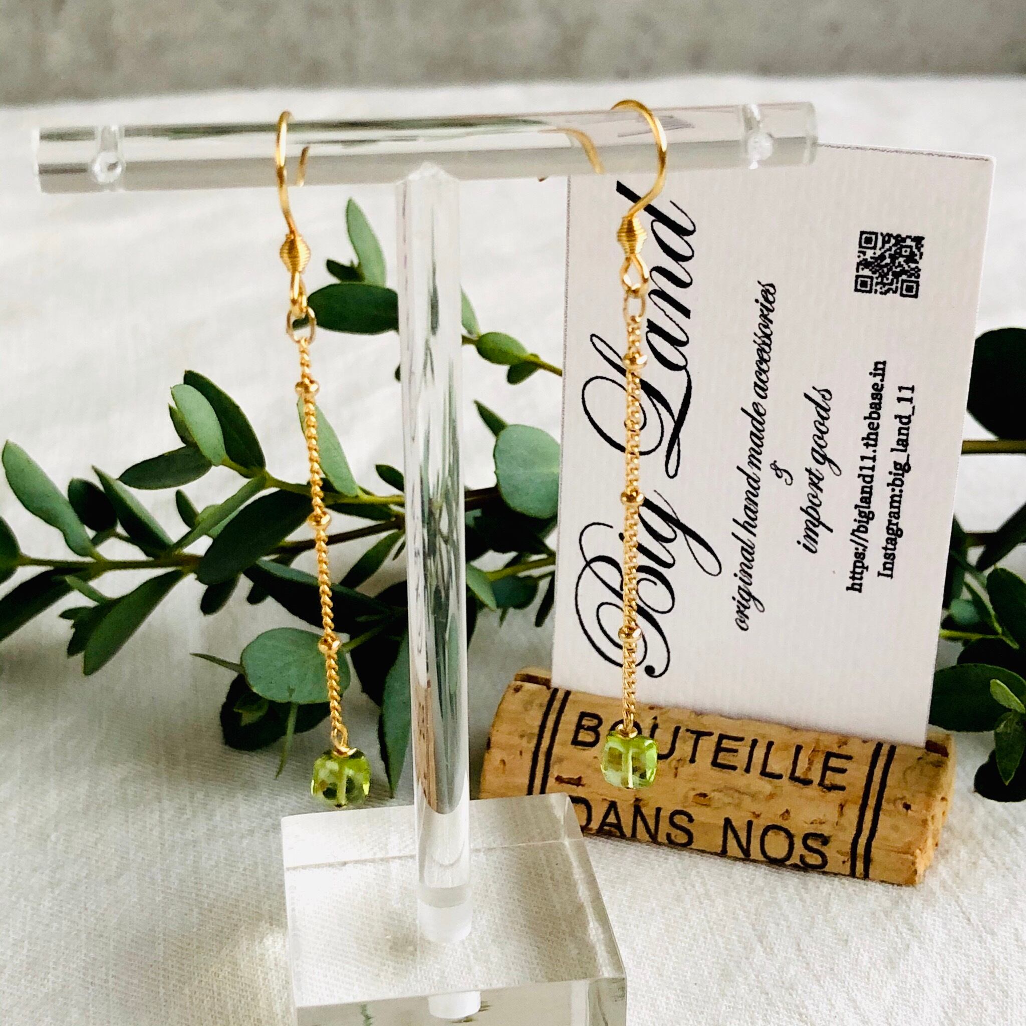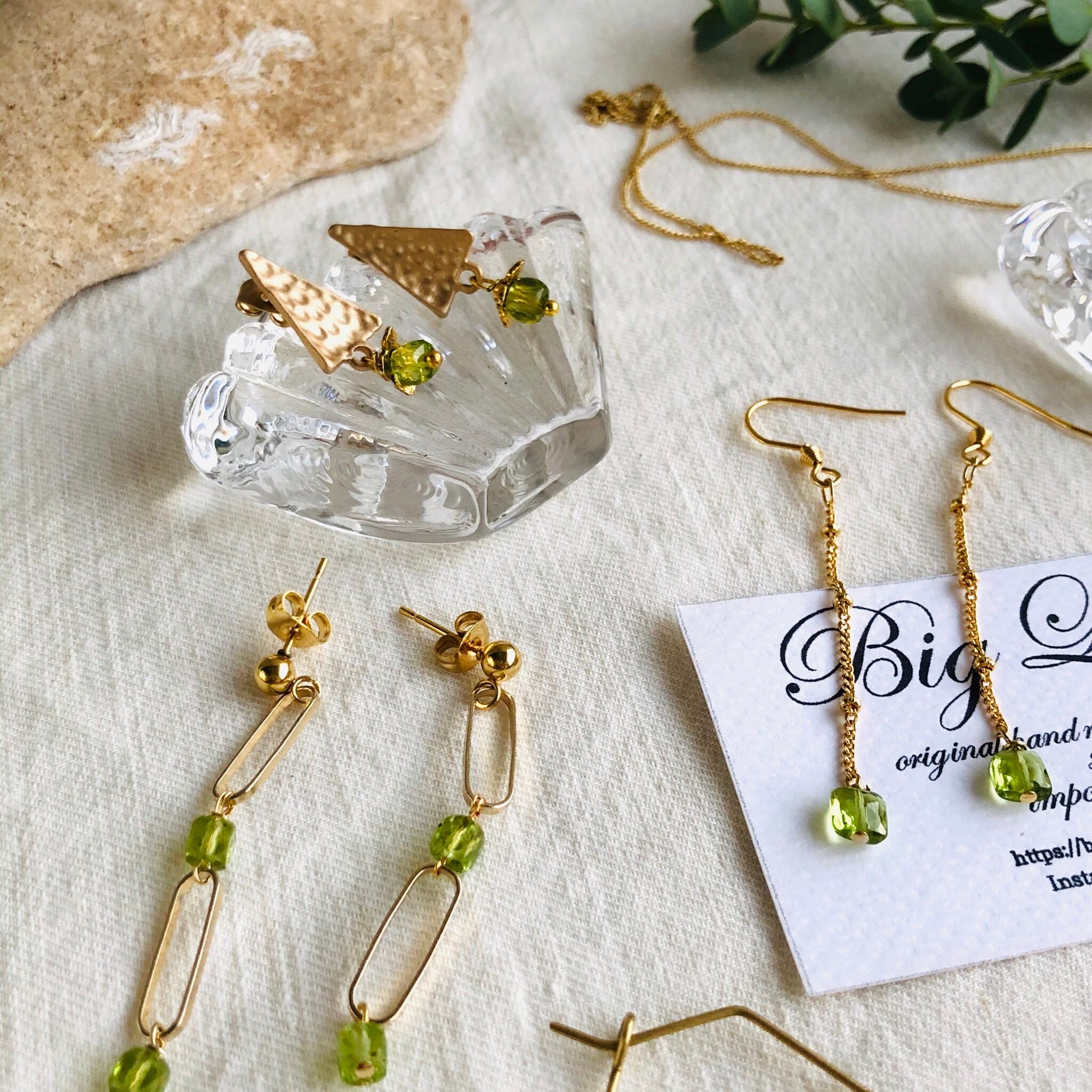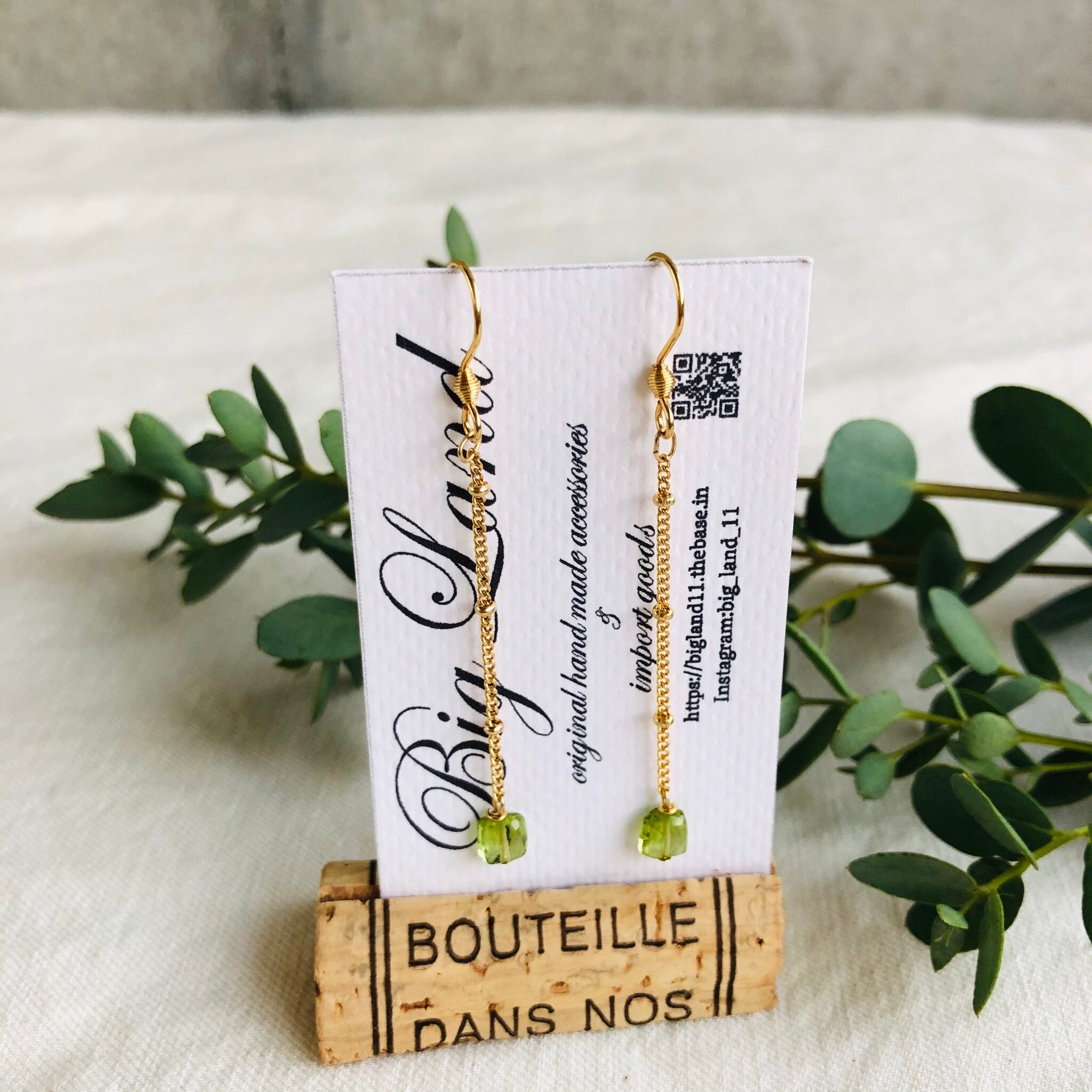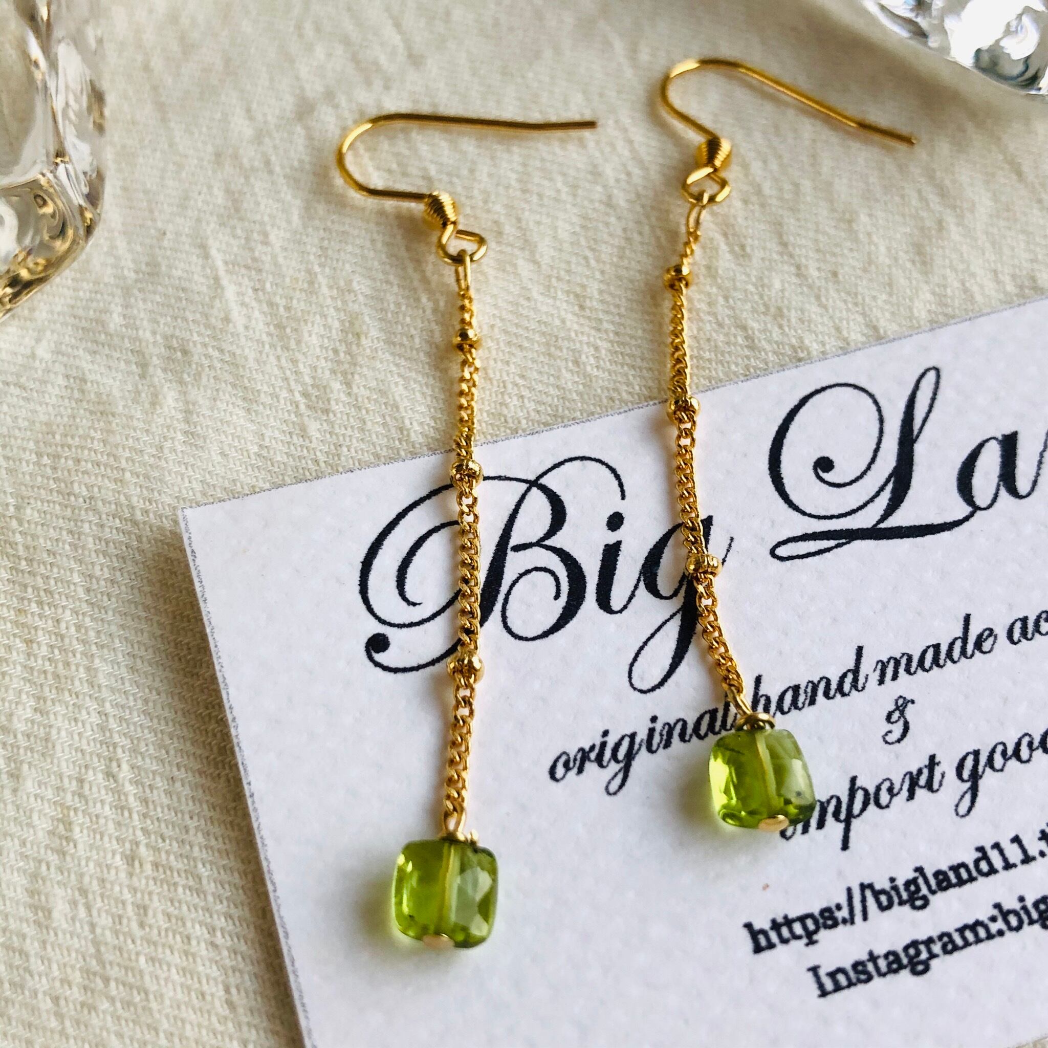 8月誕生石ペリドットと遊び心あるチェーンと組み合わせ揺れ感あるモテピアスに仕上げました✨綺麗目ファッションからカジュアルスタイルにもgood✨