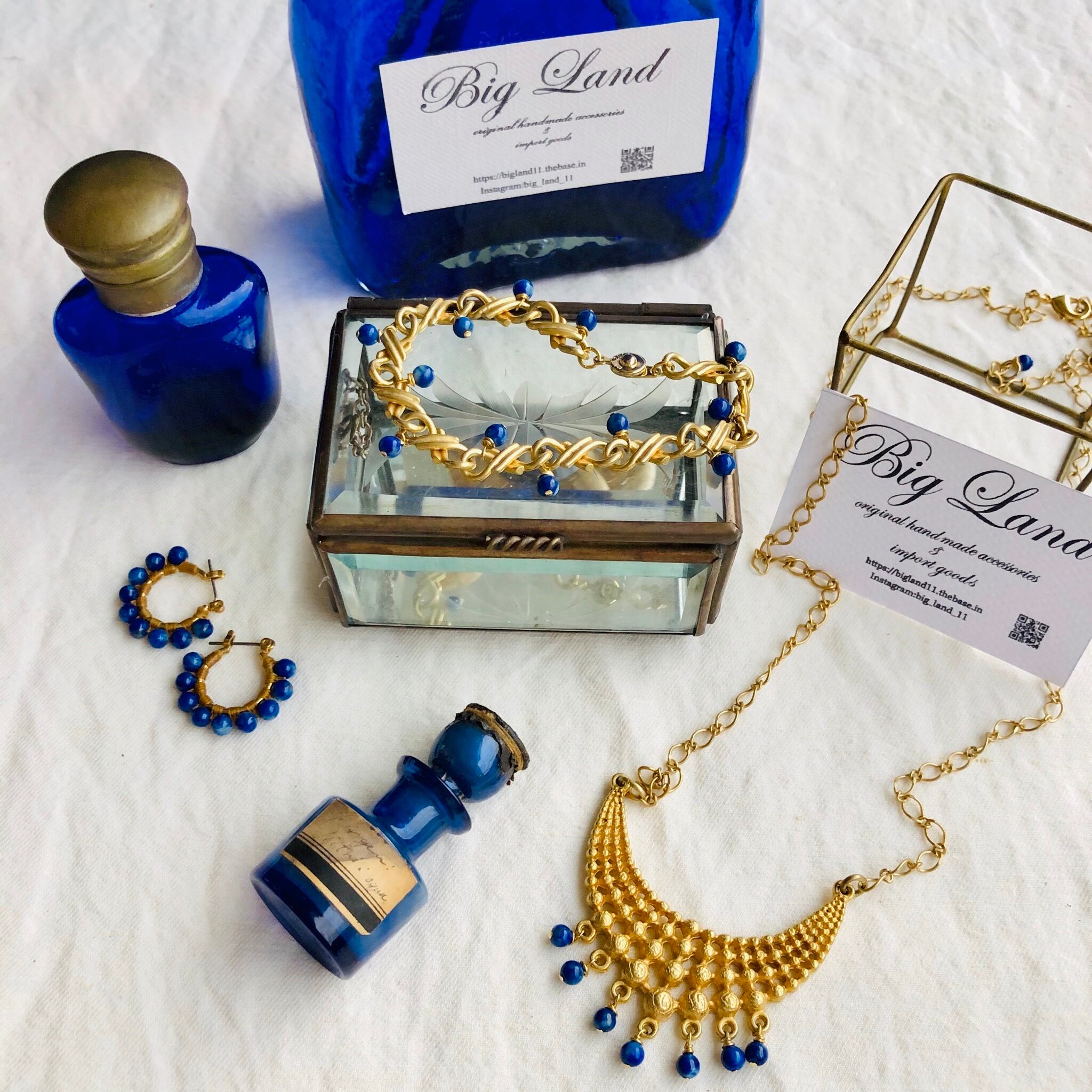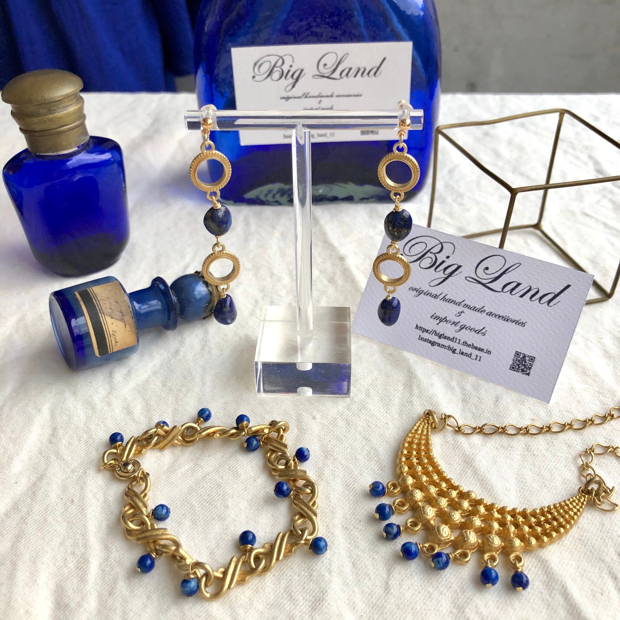 マットゴールドが大人っぽくラピスのブルーとウルトラマッチで高見えしレザー素材やシルバー色とコンビカラーで合わせてもオシャレ✨
