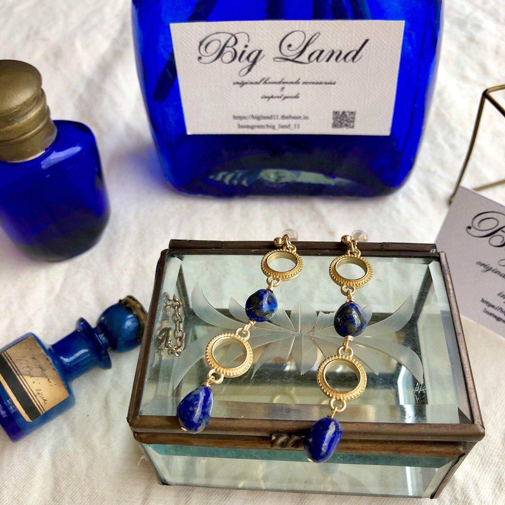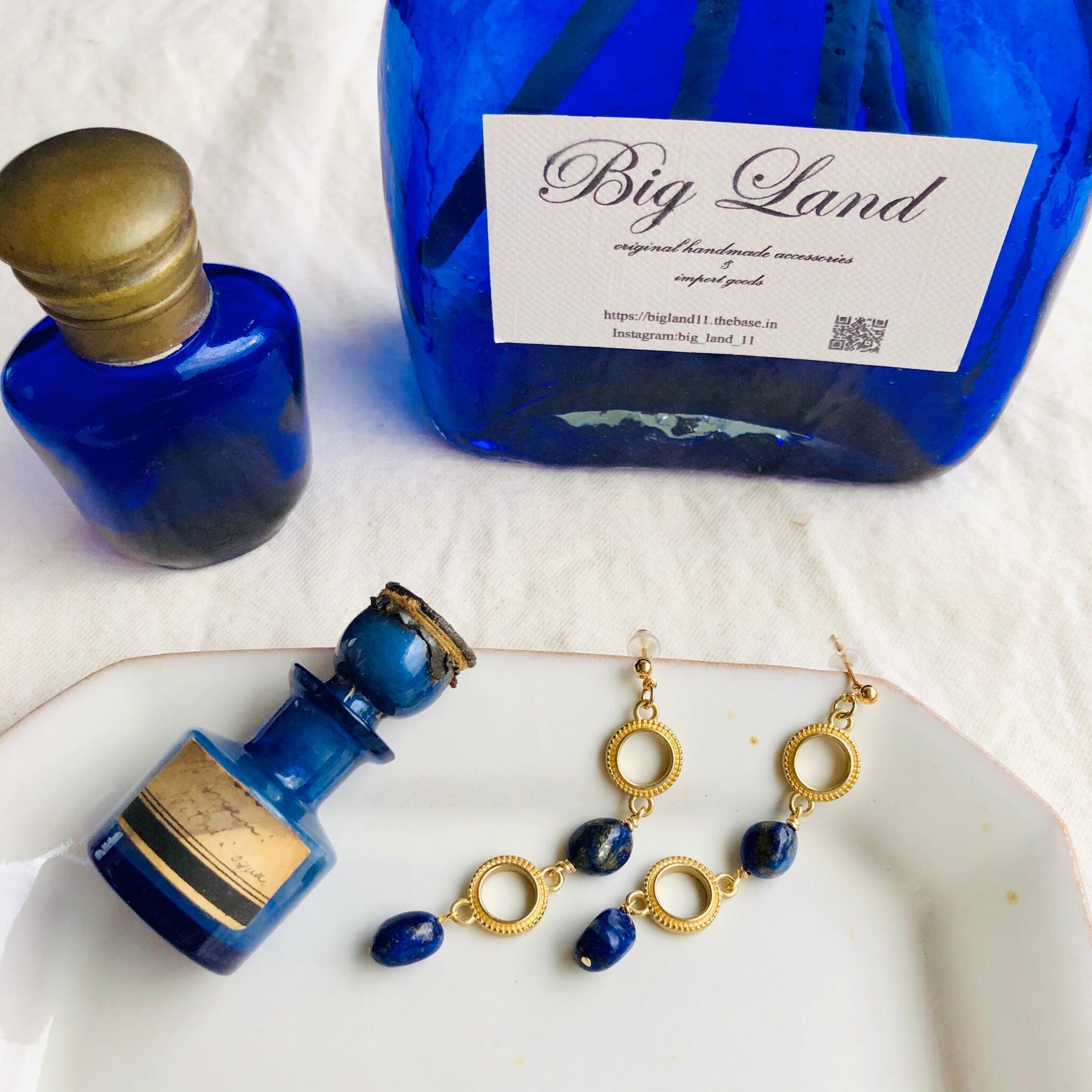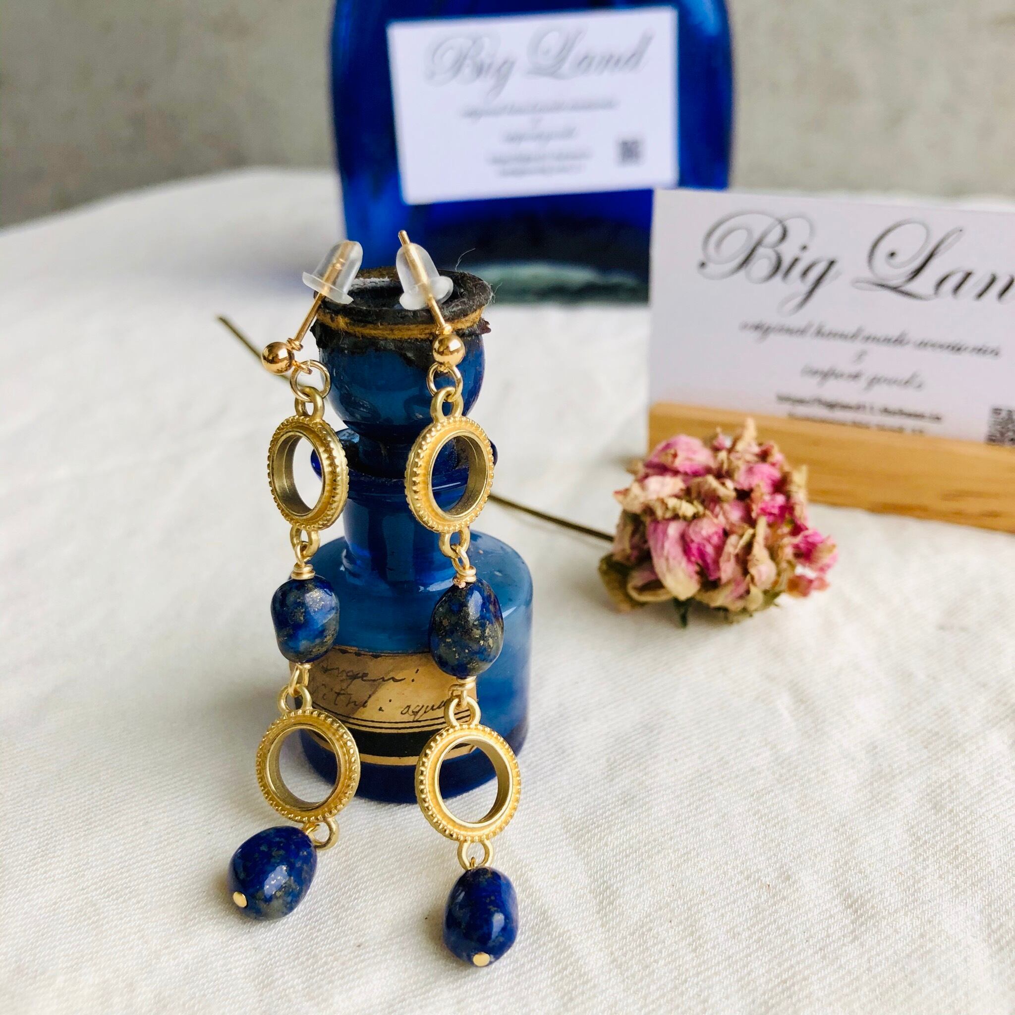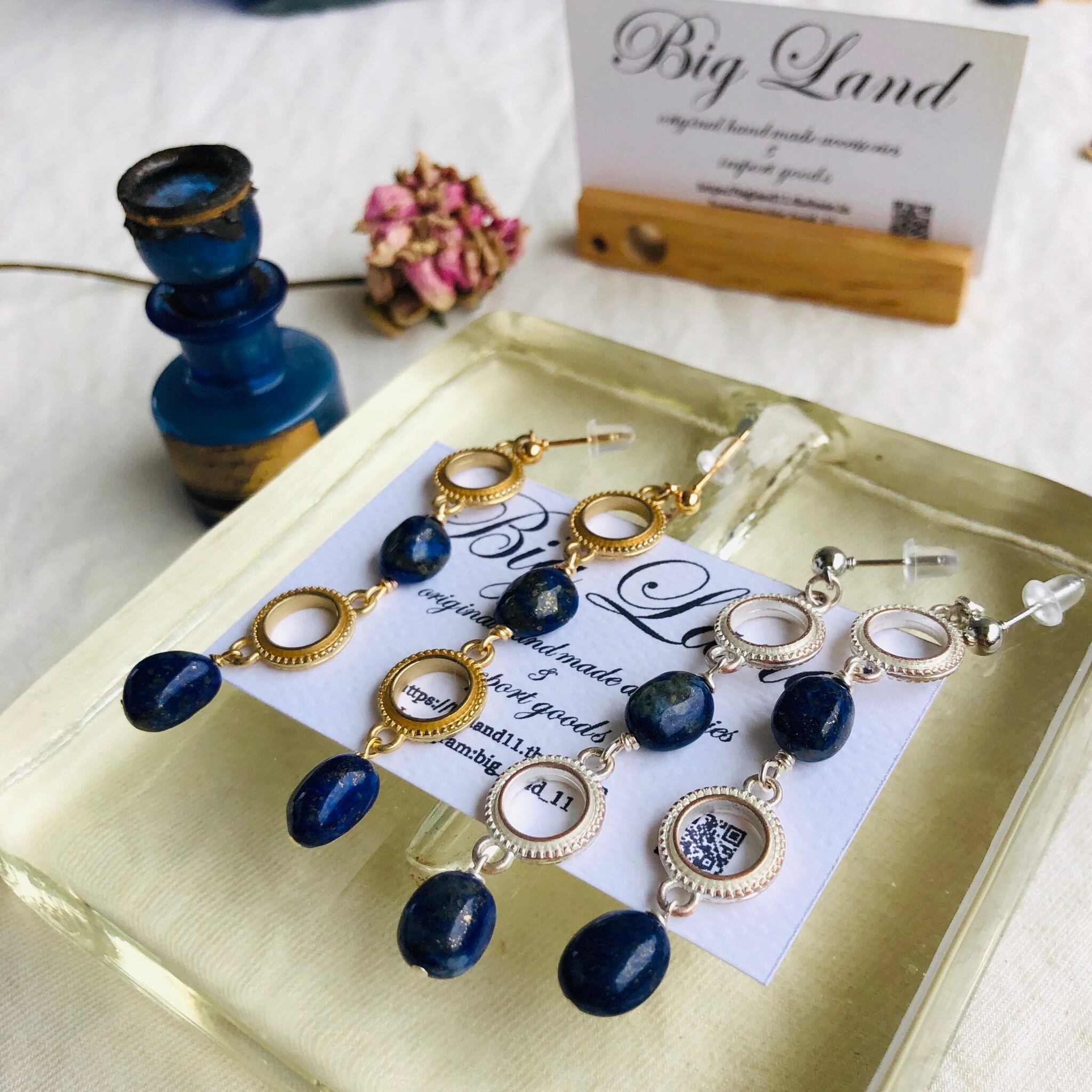 魅力的な深い青色とマットゴールドのコントラストが何とも言えない神秘さと妖艶な美しさ.....縦長にする事により小顔効果があり揺れるモテピアスに仕上げました✨ネックレスやブレス等セットで12月のお誕生日プレゼントにも使えそうですね!!