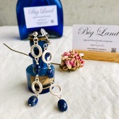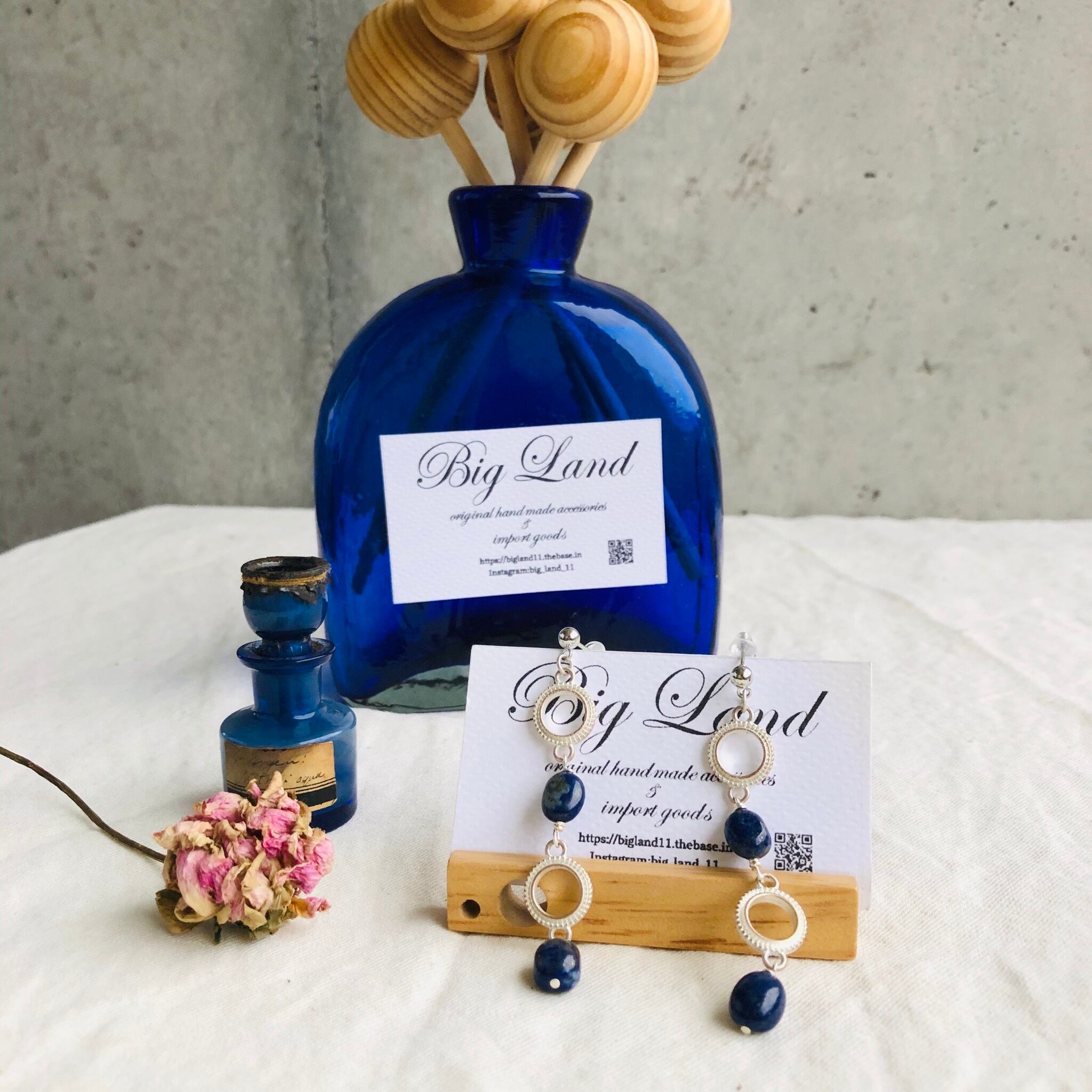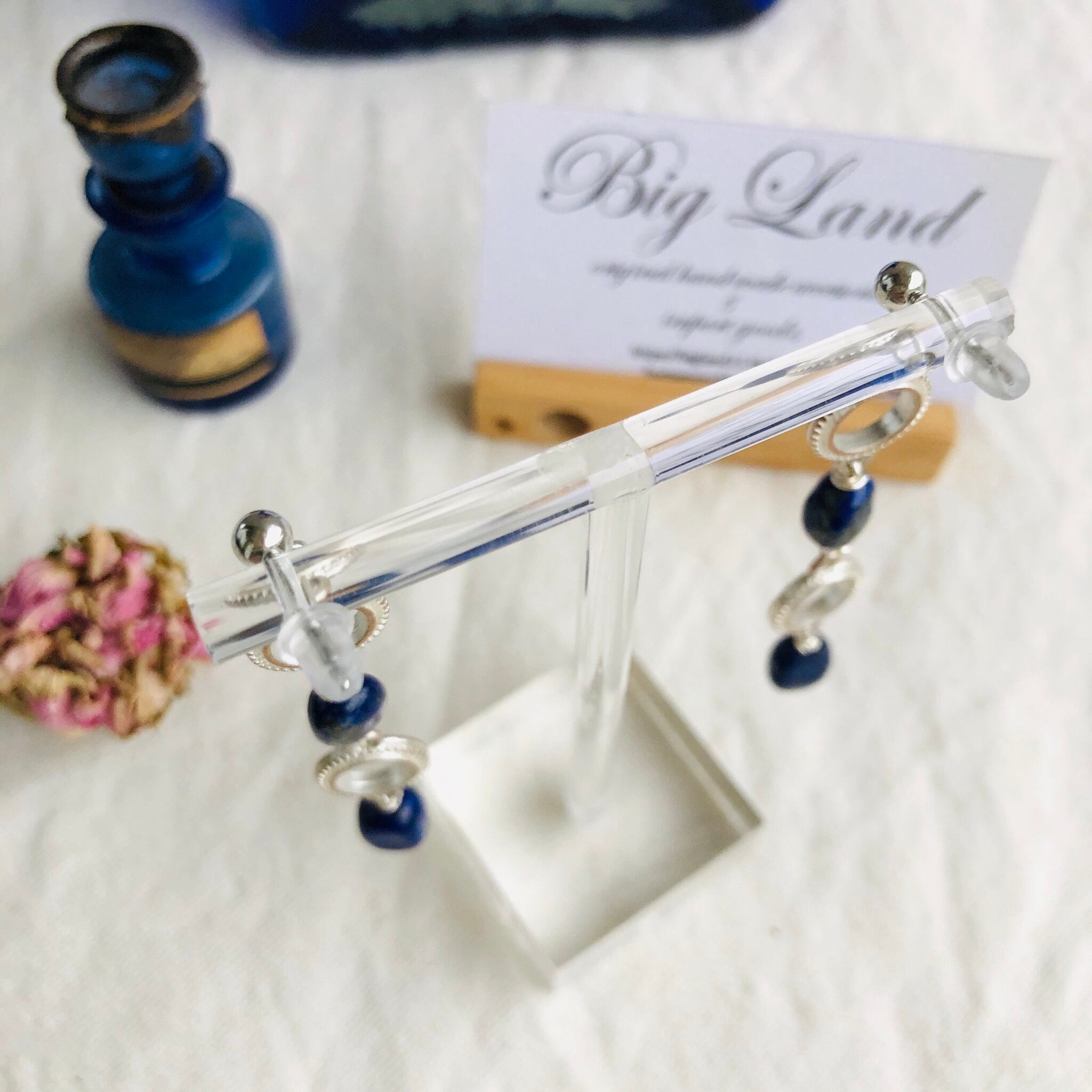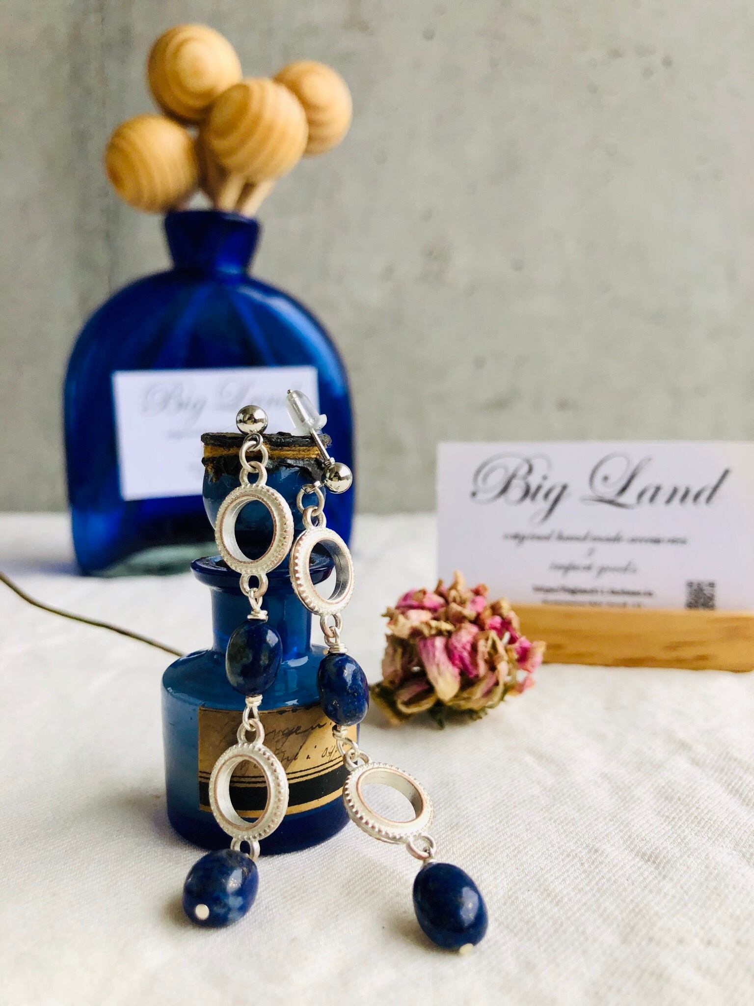 魅力的な深い青色とマットシルバー色のコントラストが爽やかでデニムコーデのカジュアルな格好にもマッチしラピスラズリの神秘さと縦長で小顔効果のある揺れるモテピアスに仕上げました✨
