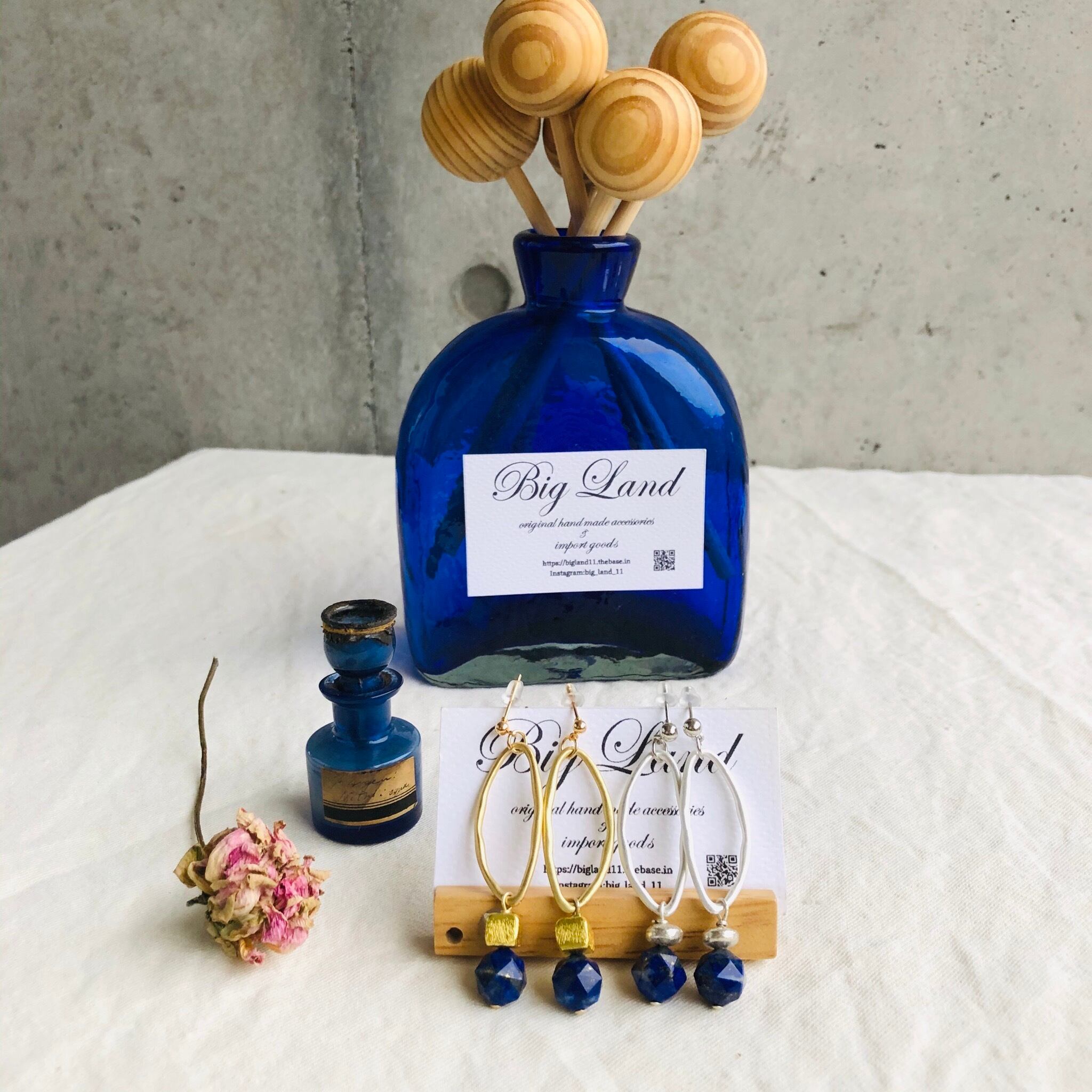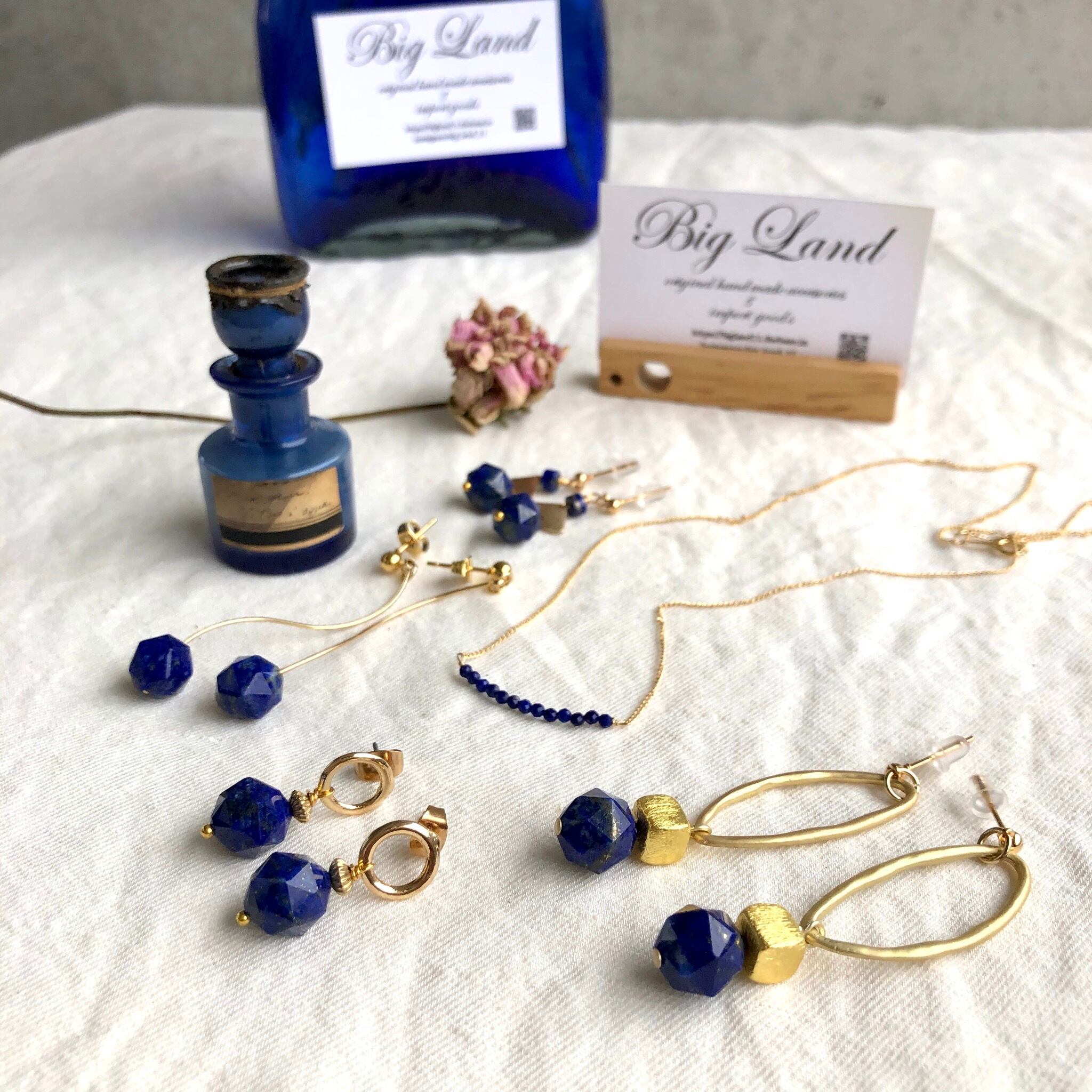 上質カットされた深い青色のラピスラズリと18金コーティングしたキューブ銅と組み合わせマットゴールドのコントラストが何とも言えない神秘さと妖艶な美しさ.....縦長にする事により小顔効果があり揺れるモテピアスでネックレスやブレス等セットで12月のお誕生日プレゼントにも使えそうですね^o^