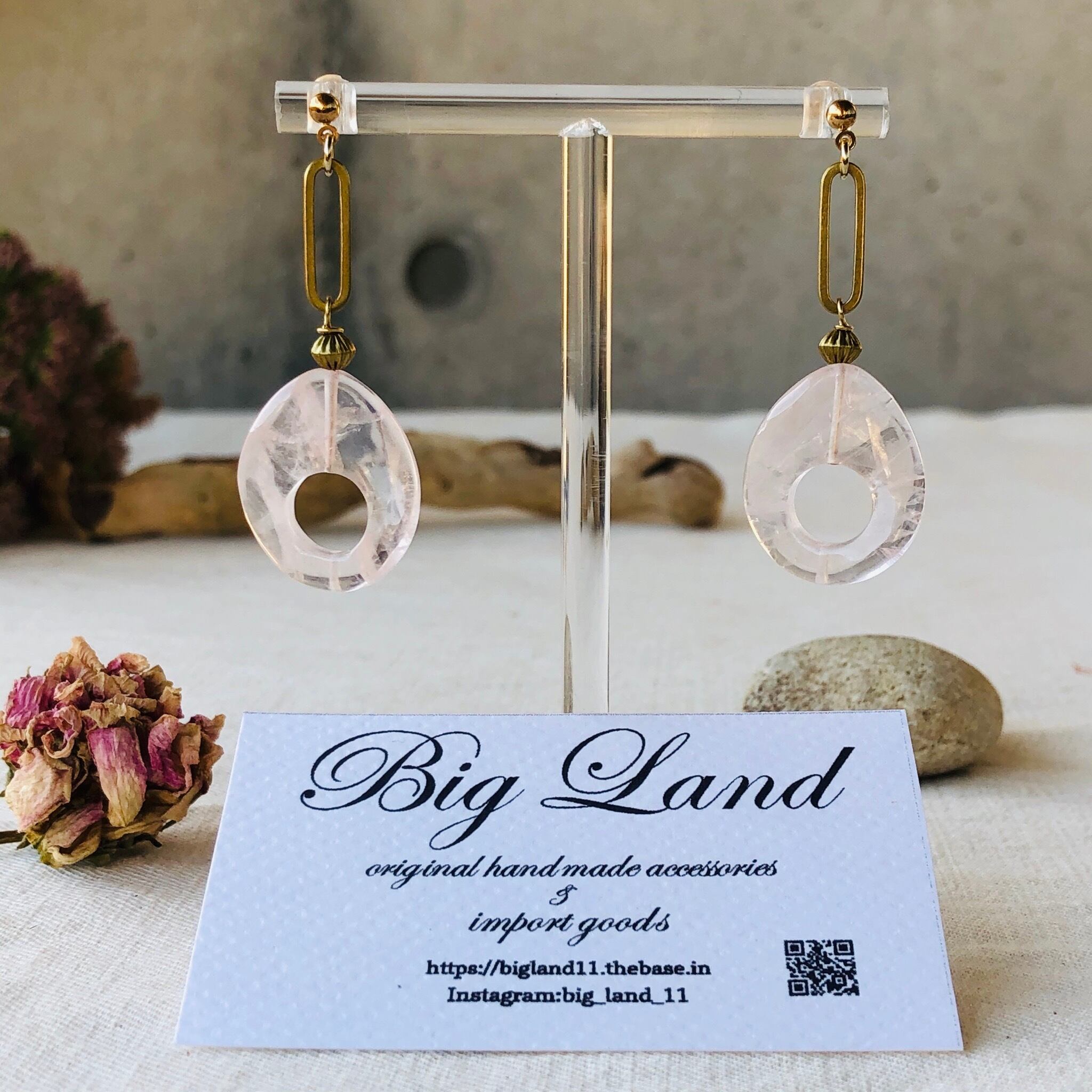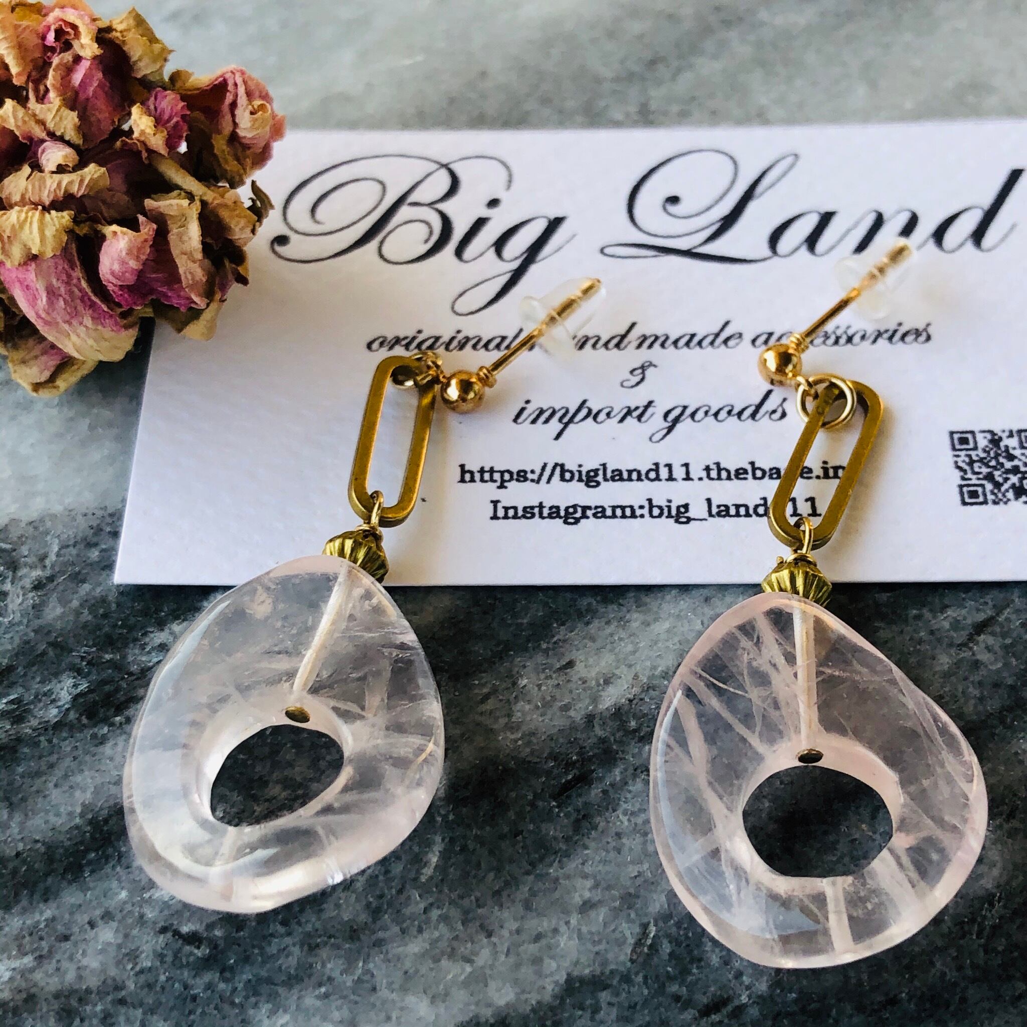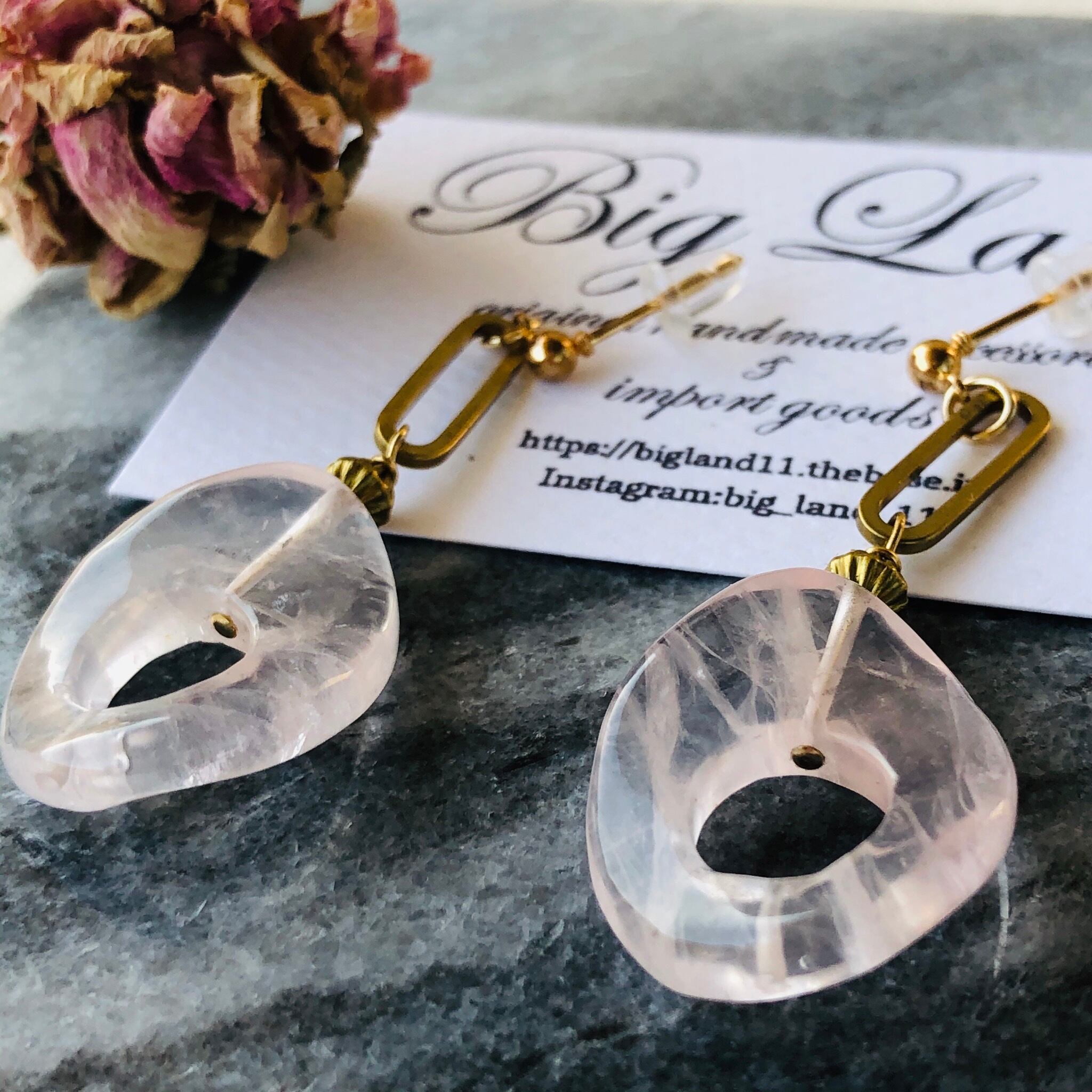 10月誕生石 ローズクォーツピアスと真鍮を組み合わせて仕上げ天然石の透き通ったピンク色がなんとも言えない神秘さを感じ先の見通しが良くなるような穴が遊び心もありワクワクしますね✨