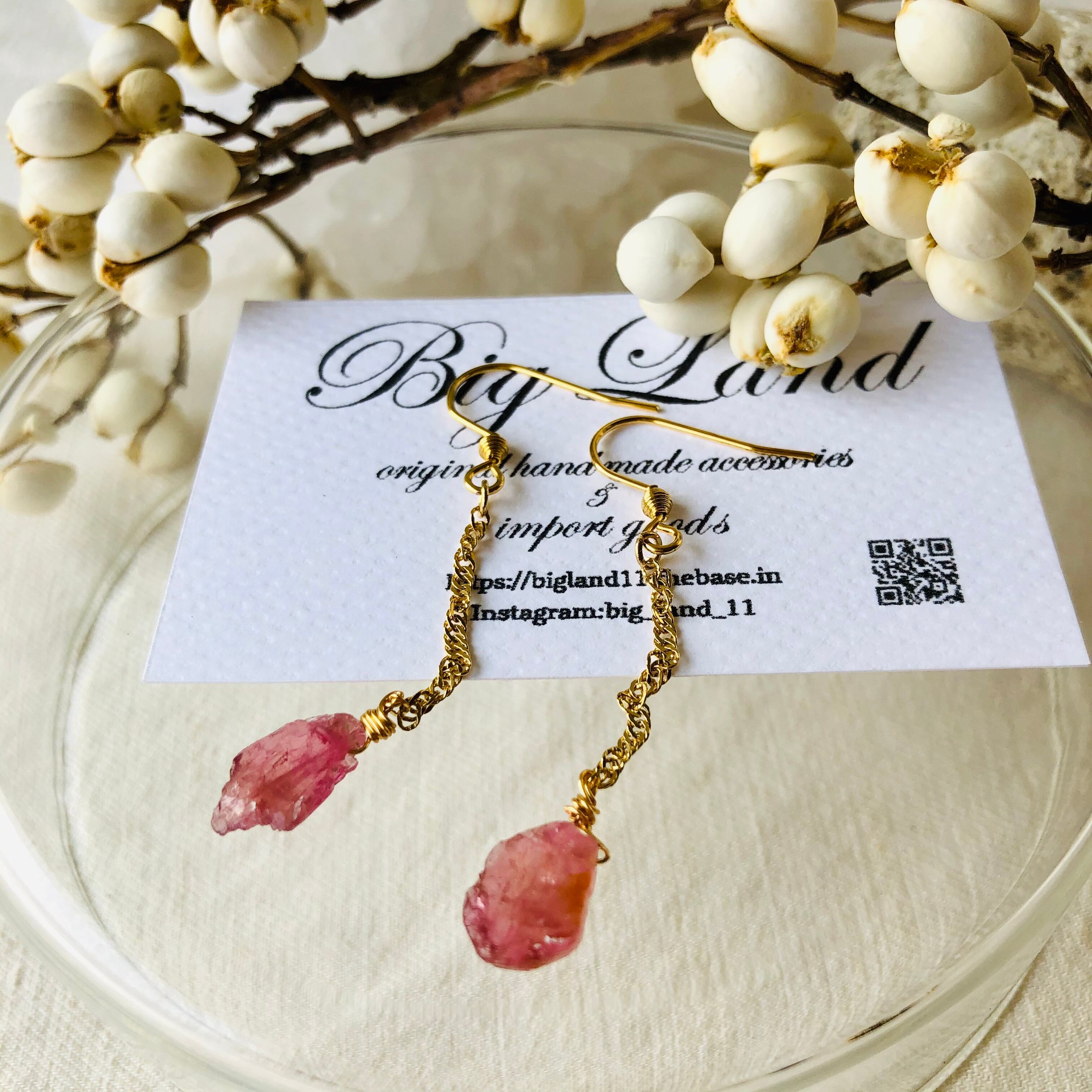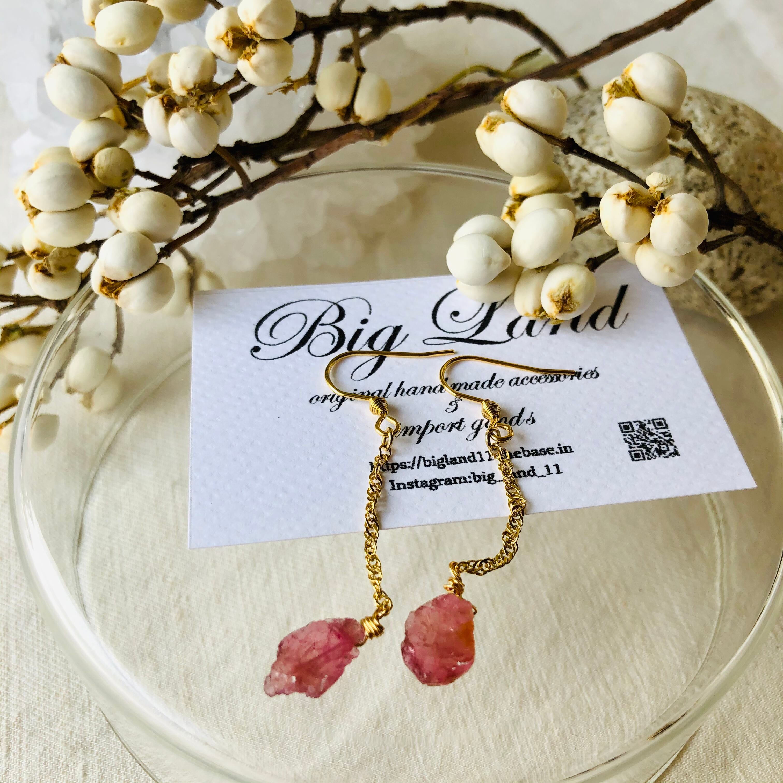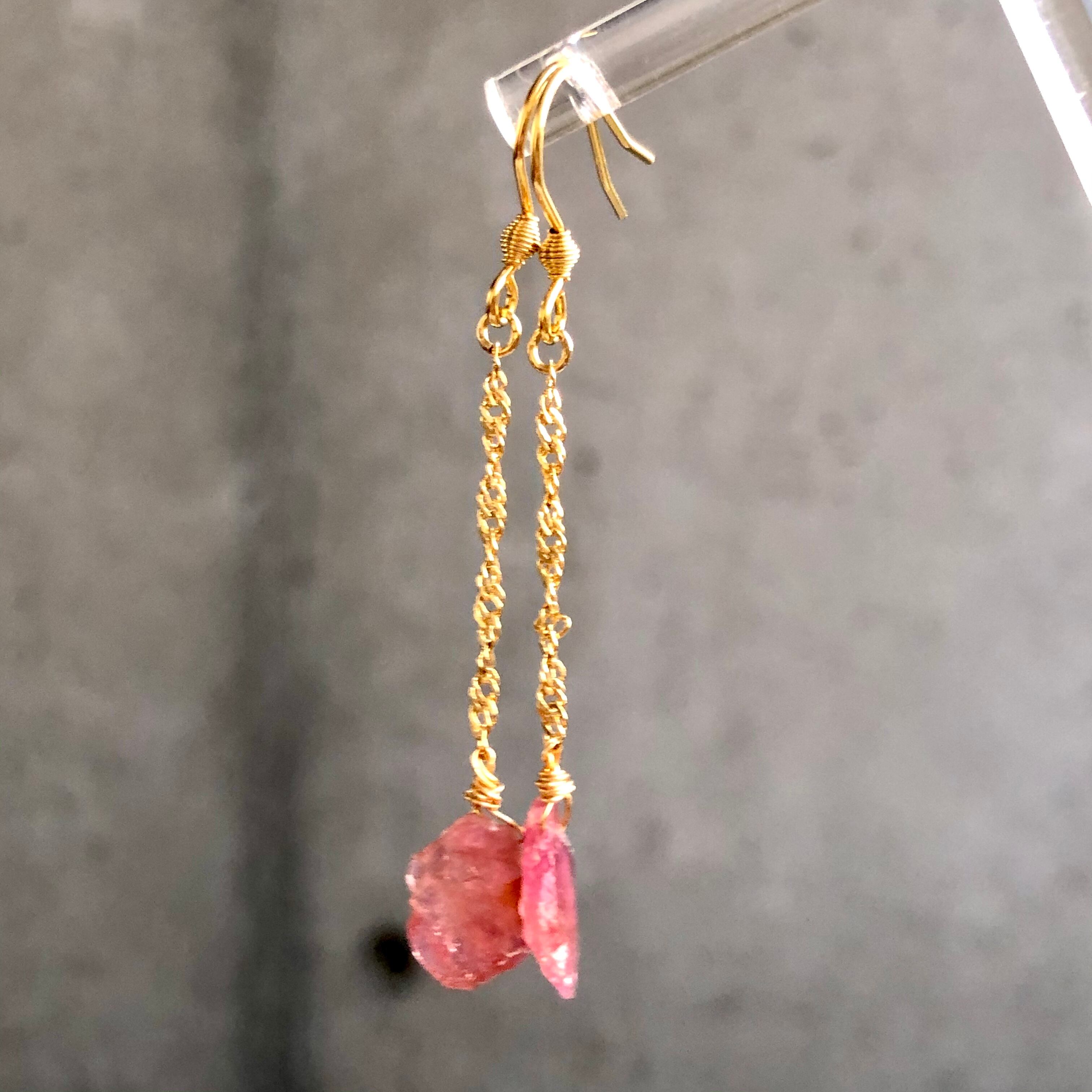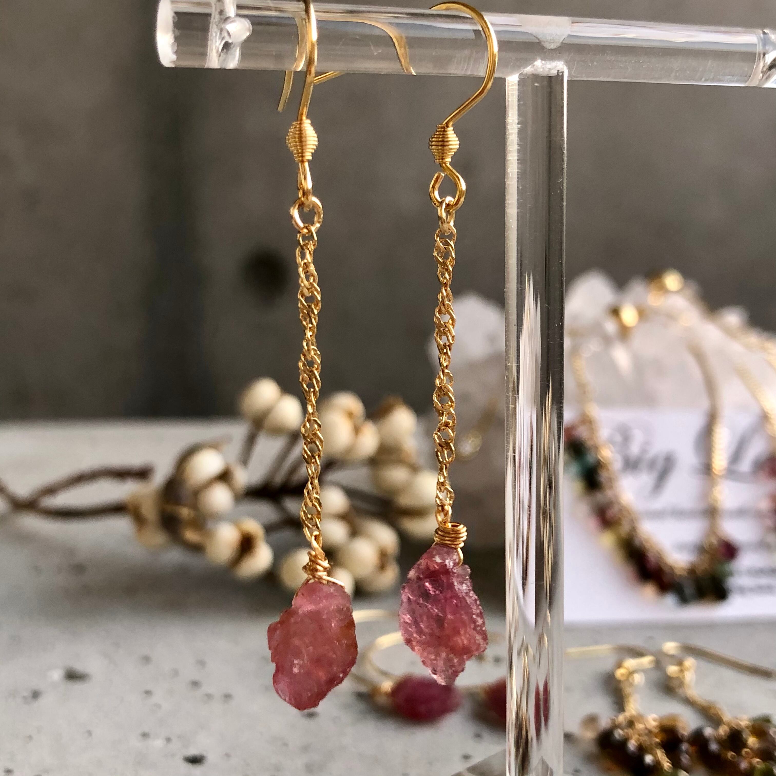 10月誕生石ピンクトルマリンの原石スライスカットと遊びのあるツイストチェーンとの組み合わせがとても素敵でお顔周りを華やかにし揺れるピアスはモテピアスとして大人気です✨