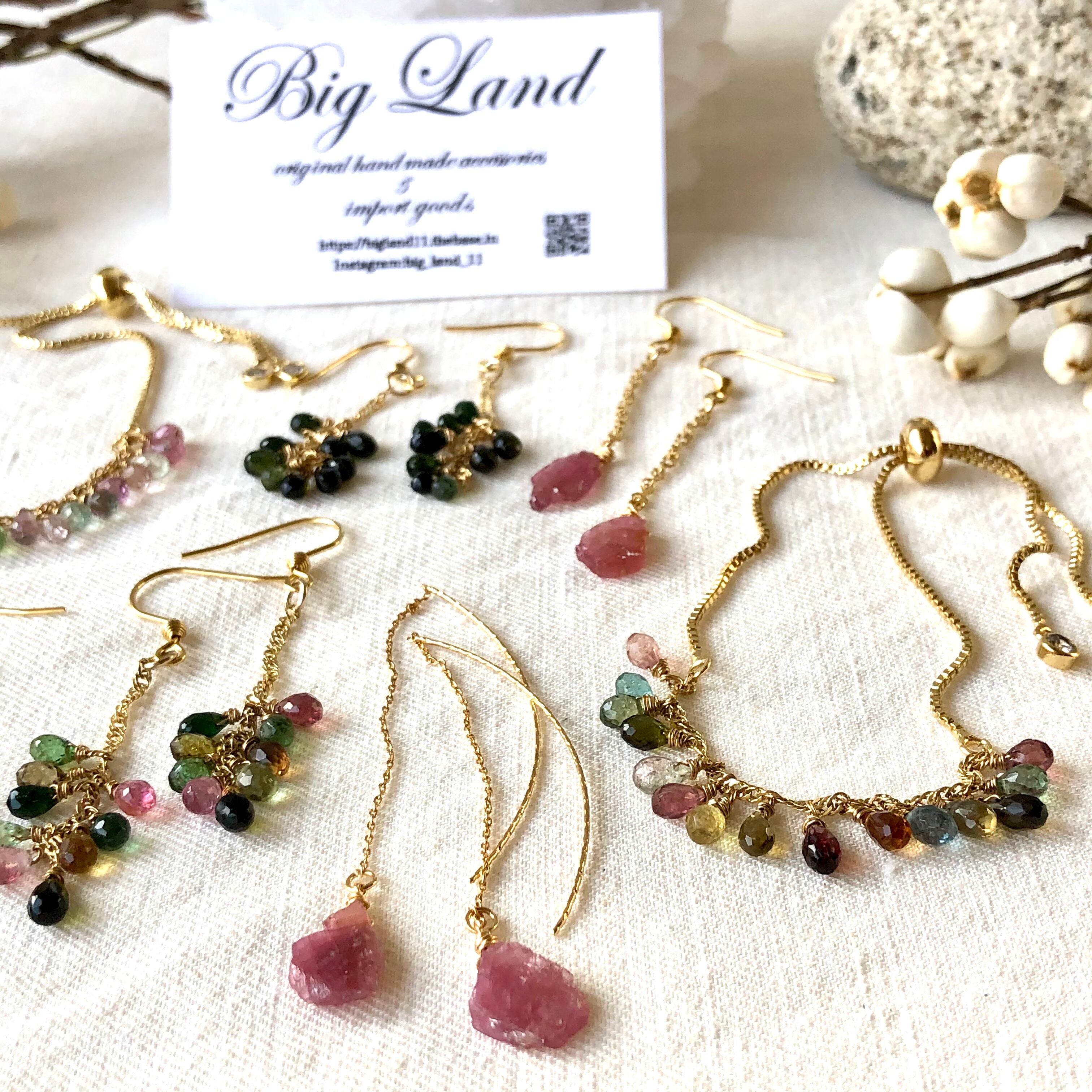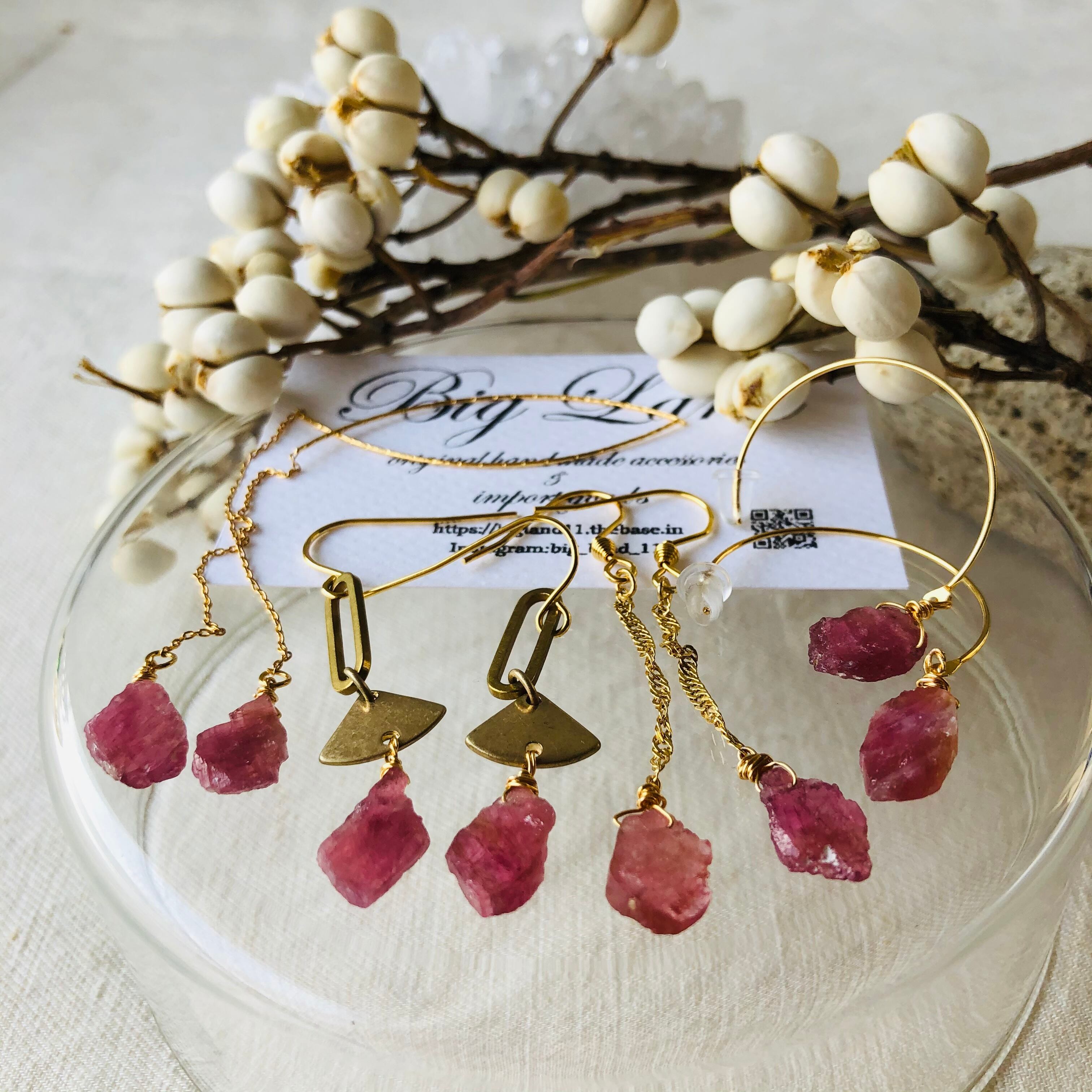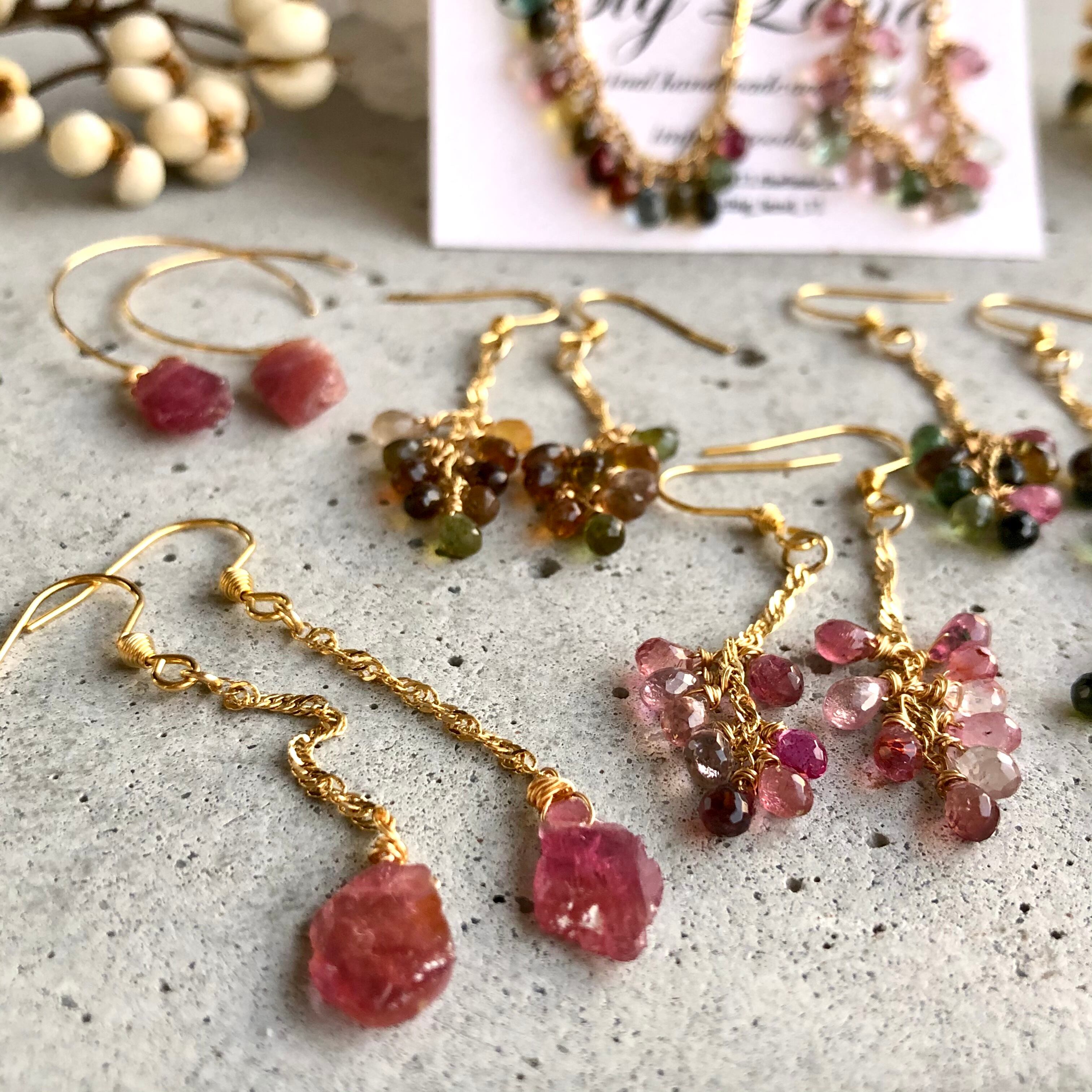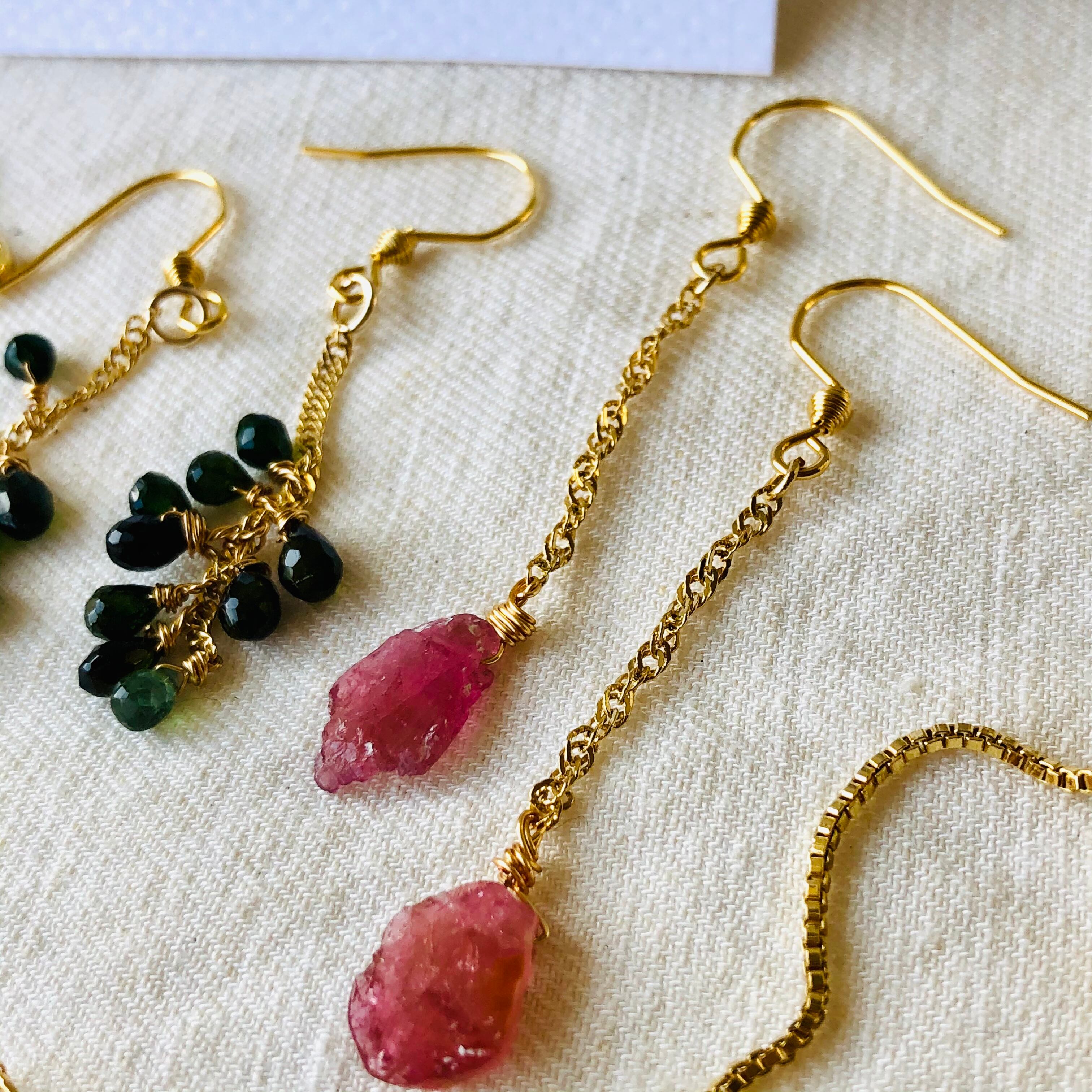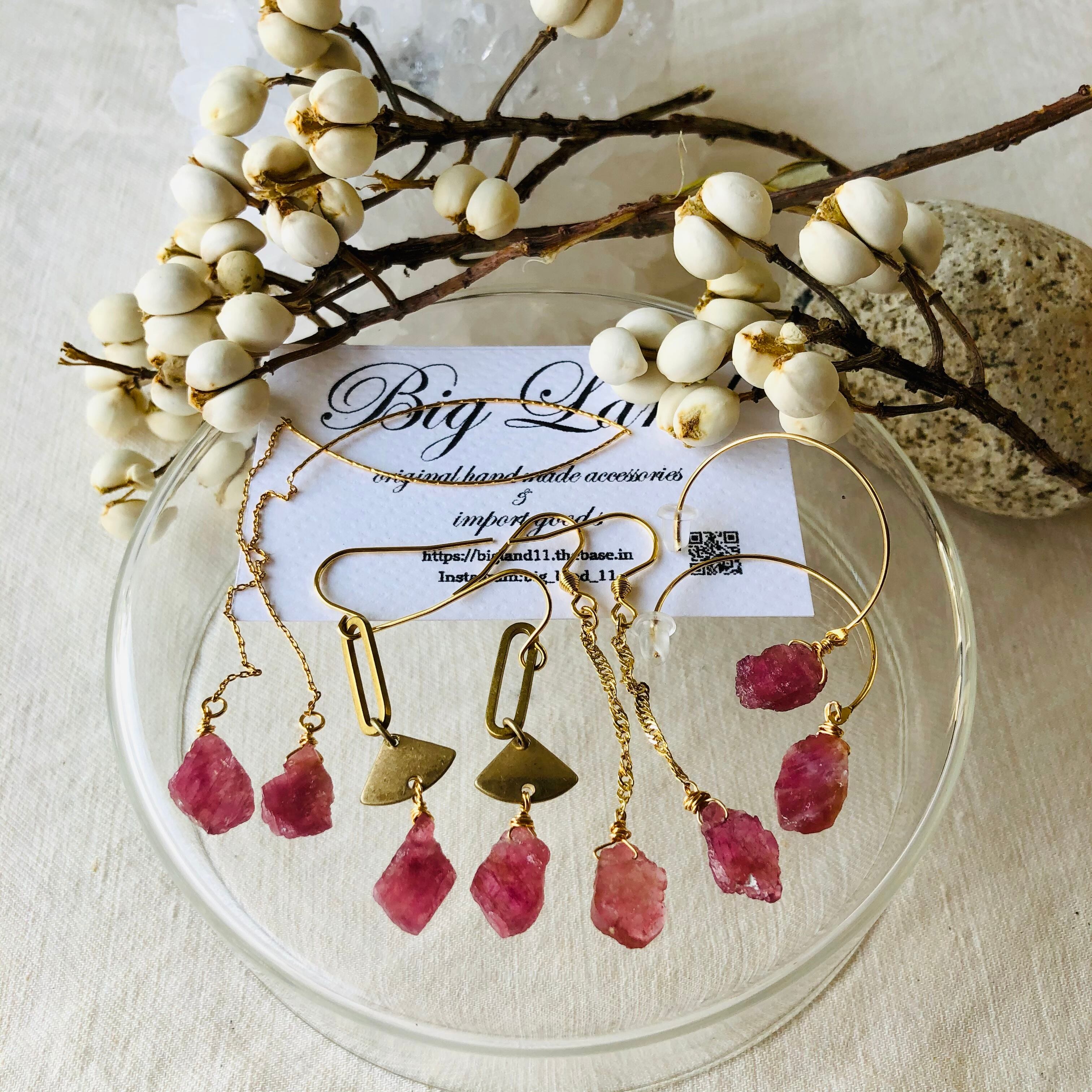 10月誕生石ピンクトルマリンの原石スライスカットと遊びのあるツイストチェーンとの組み合わせがとても素敵でお顔周りを華やかにし揺れるピアスはモテピアスとして大人気です✨