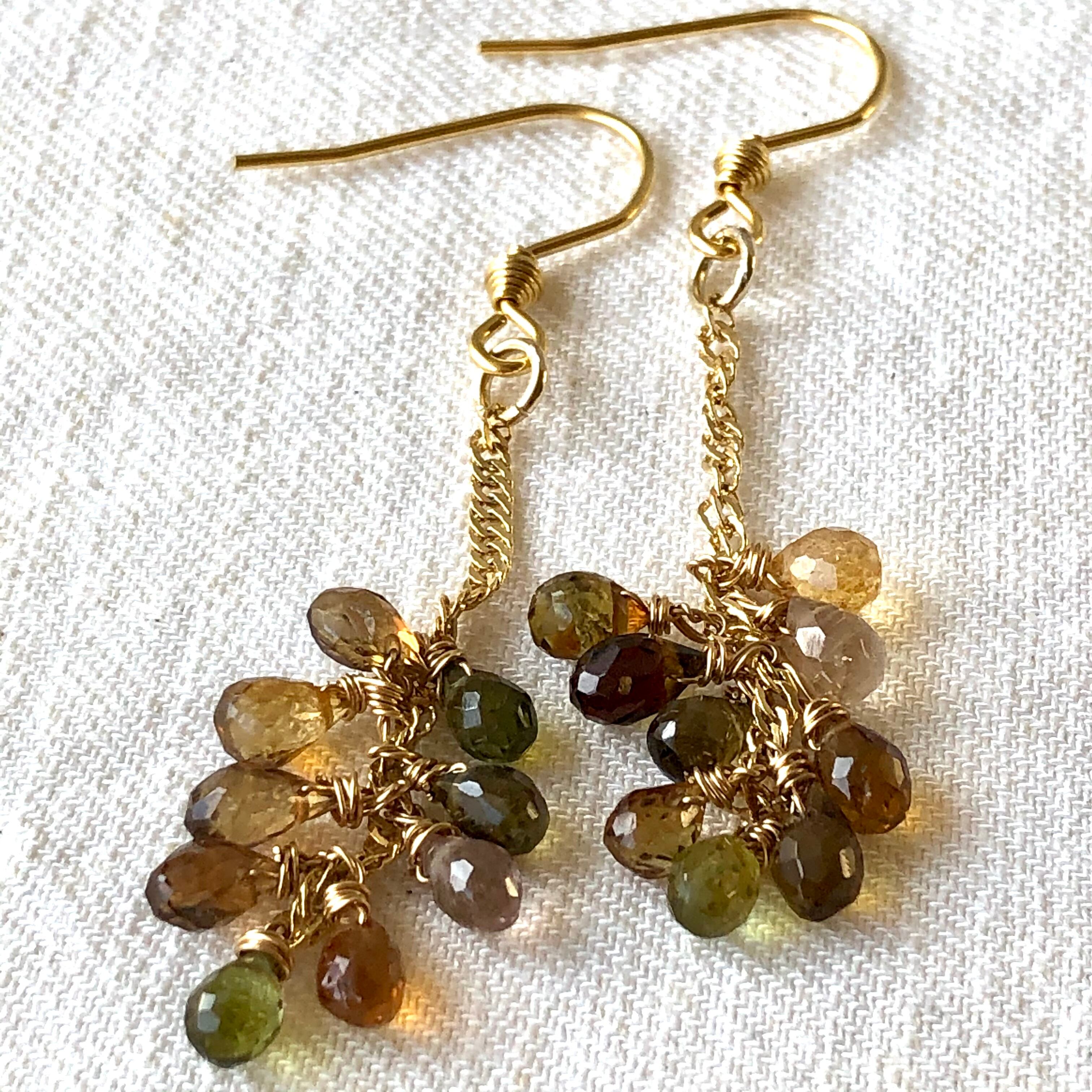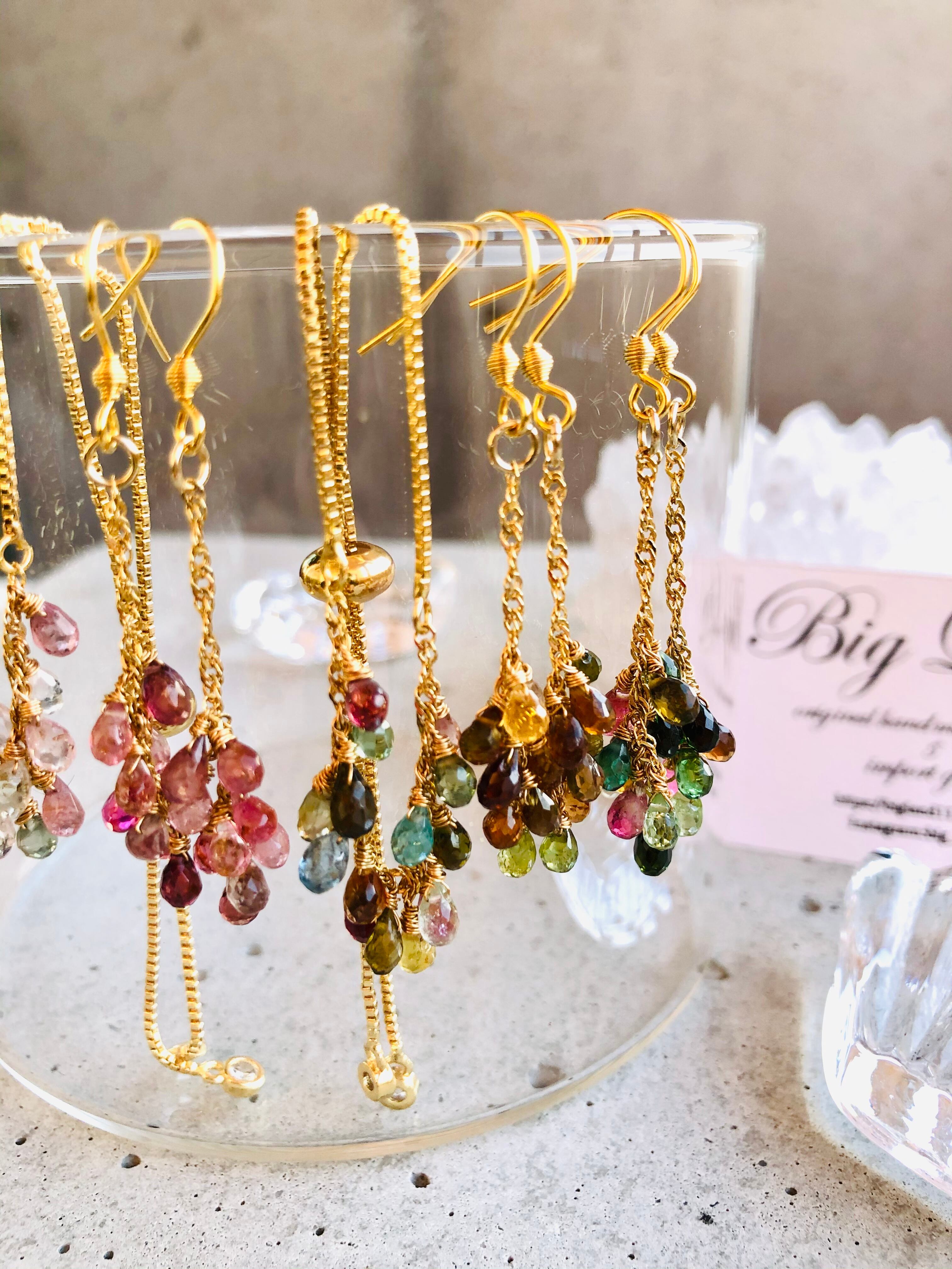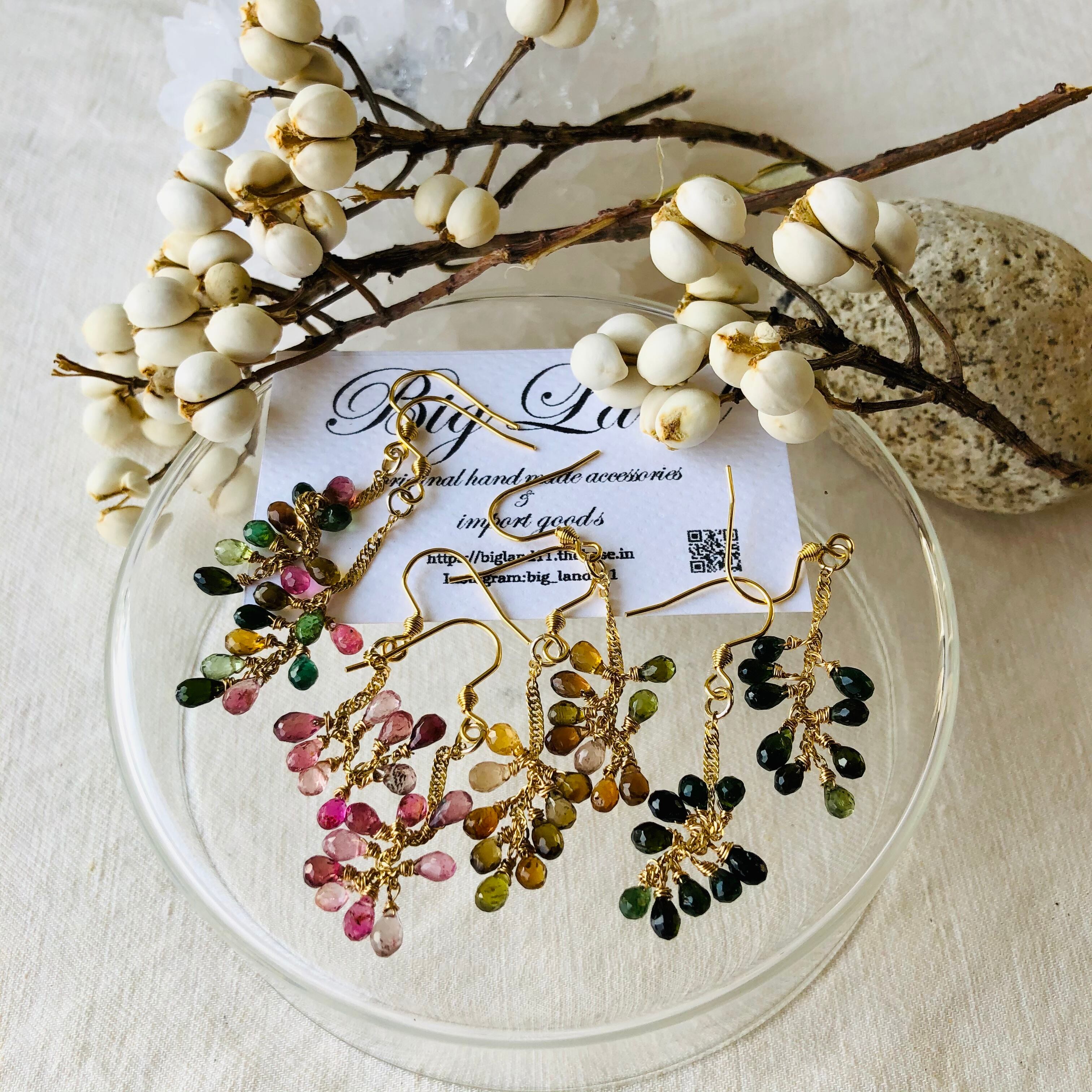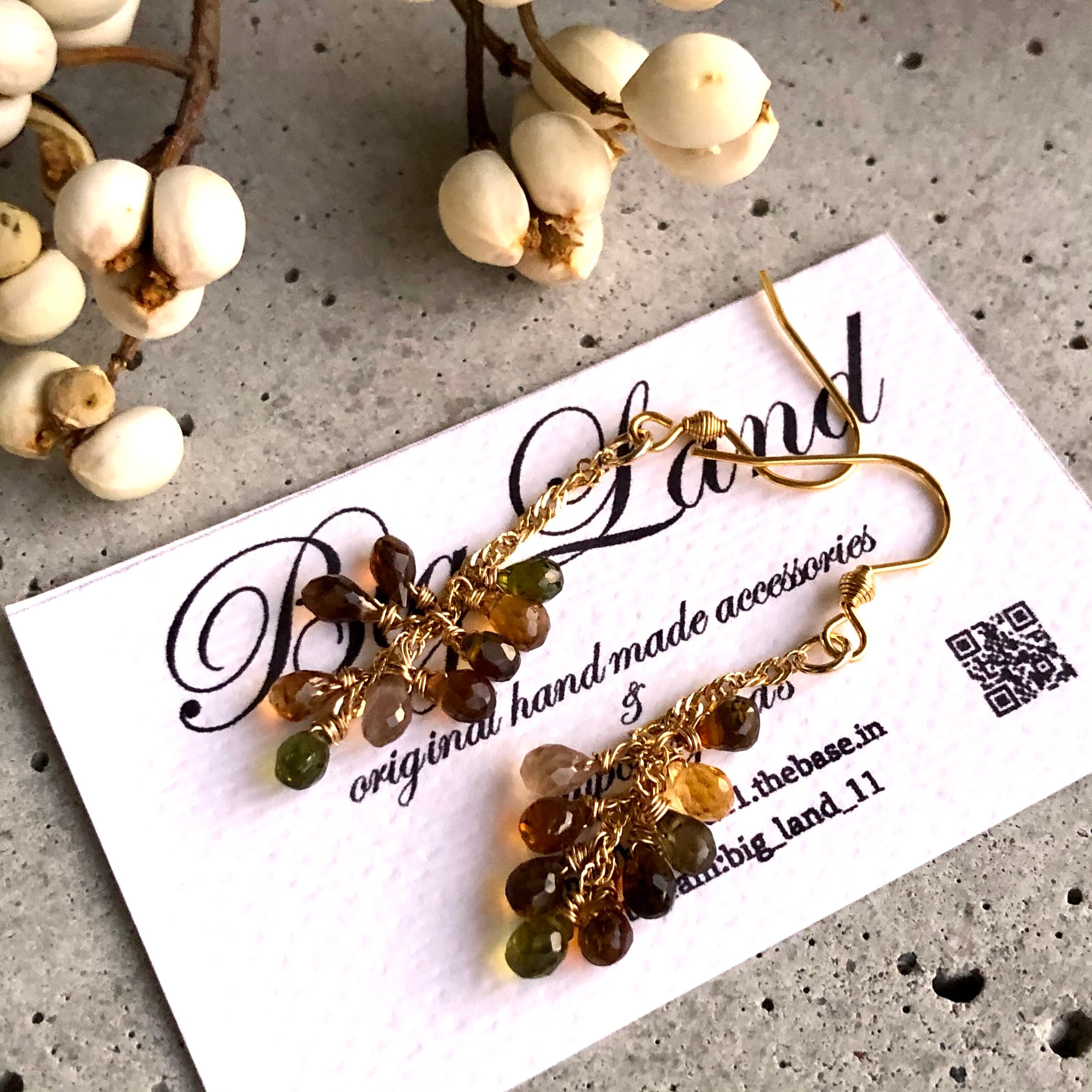 ブラウン系の濃淡をバランス良く組み合わせ、天然石の良さが引き立つ美しいカッティングとツイストチェーンが耳元でキラキラと輝き小粒のトルマリンが何とも言えないキュートさと上品さを兼ね備え高級感があります✨