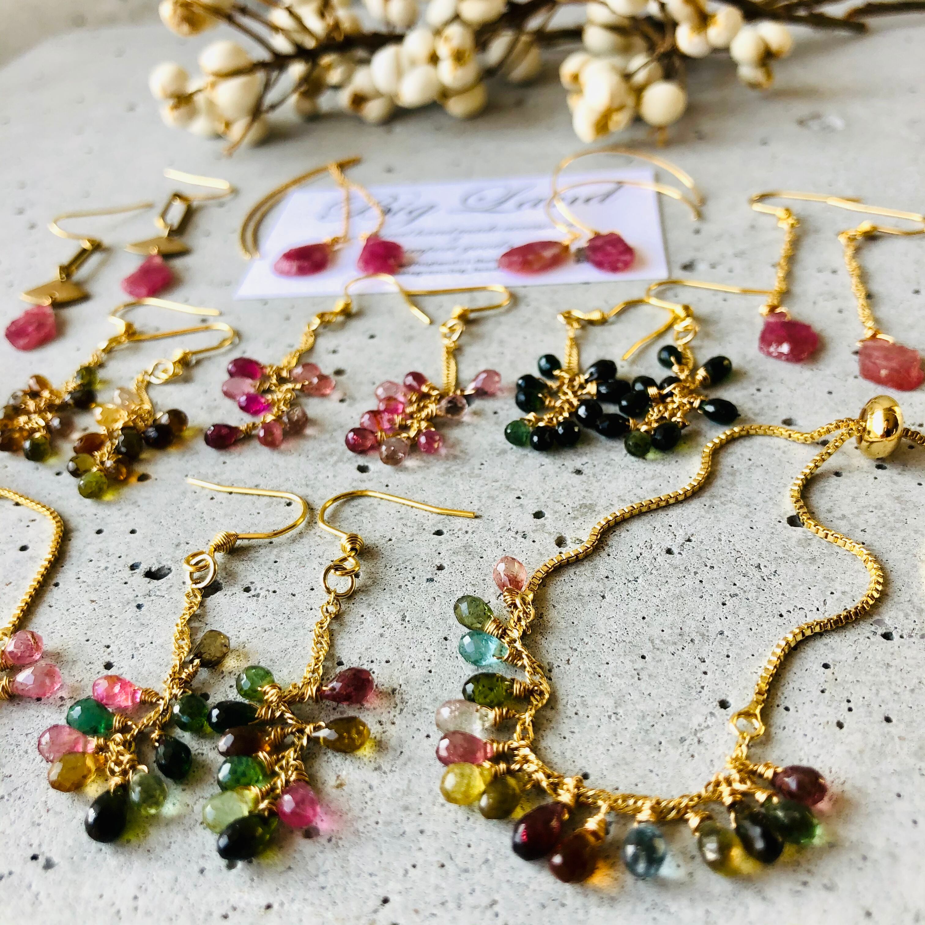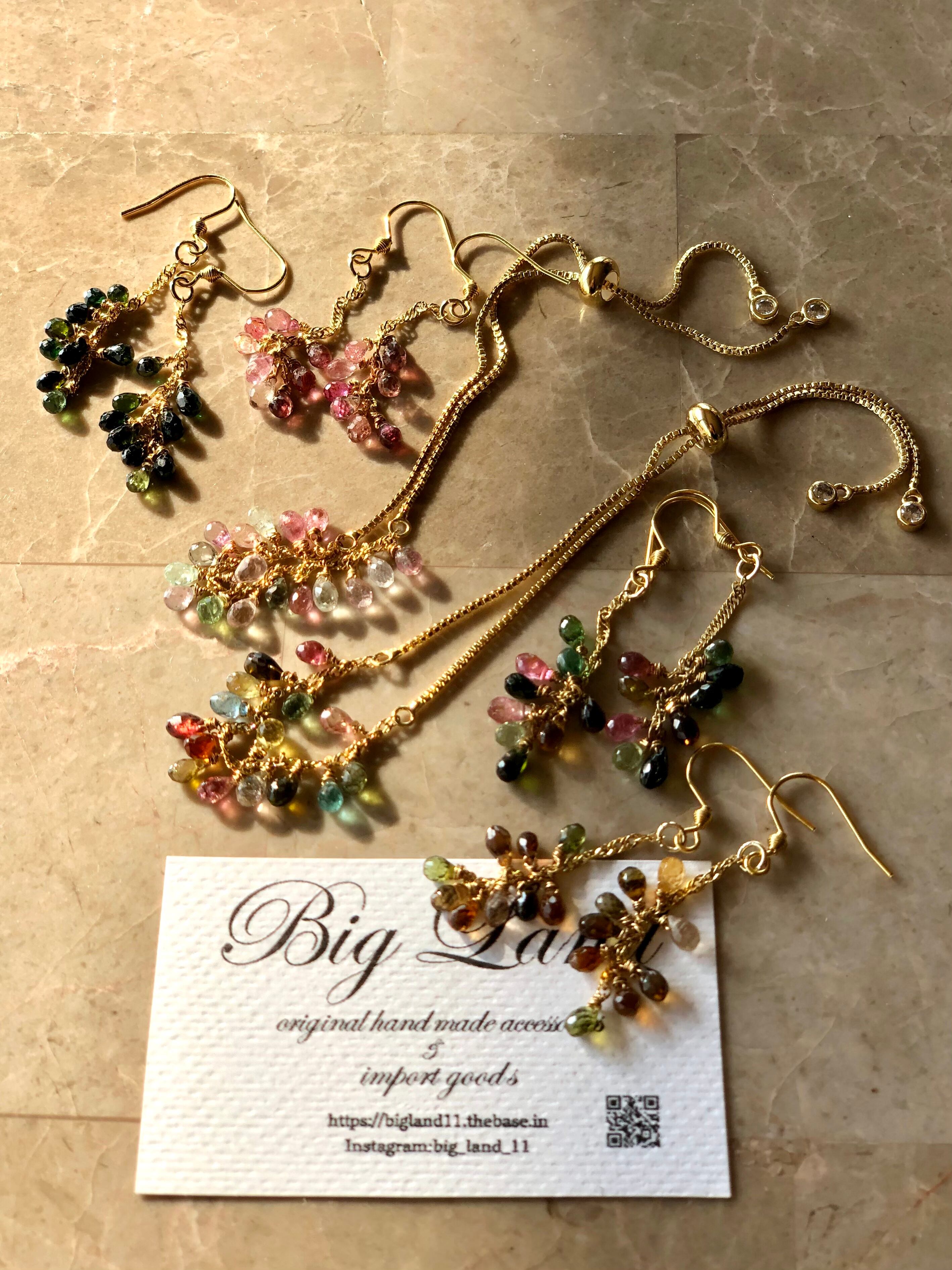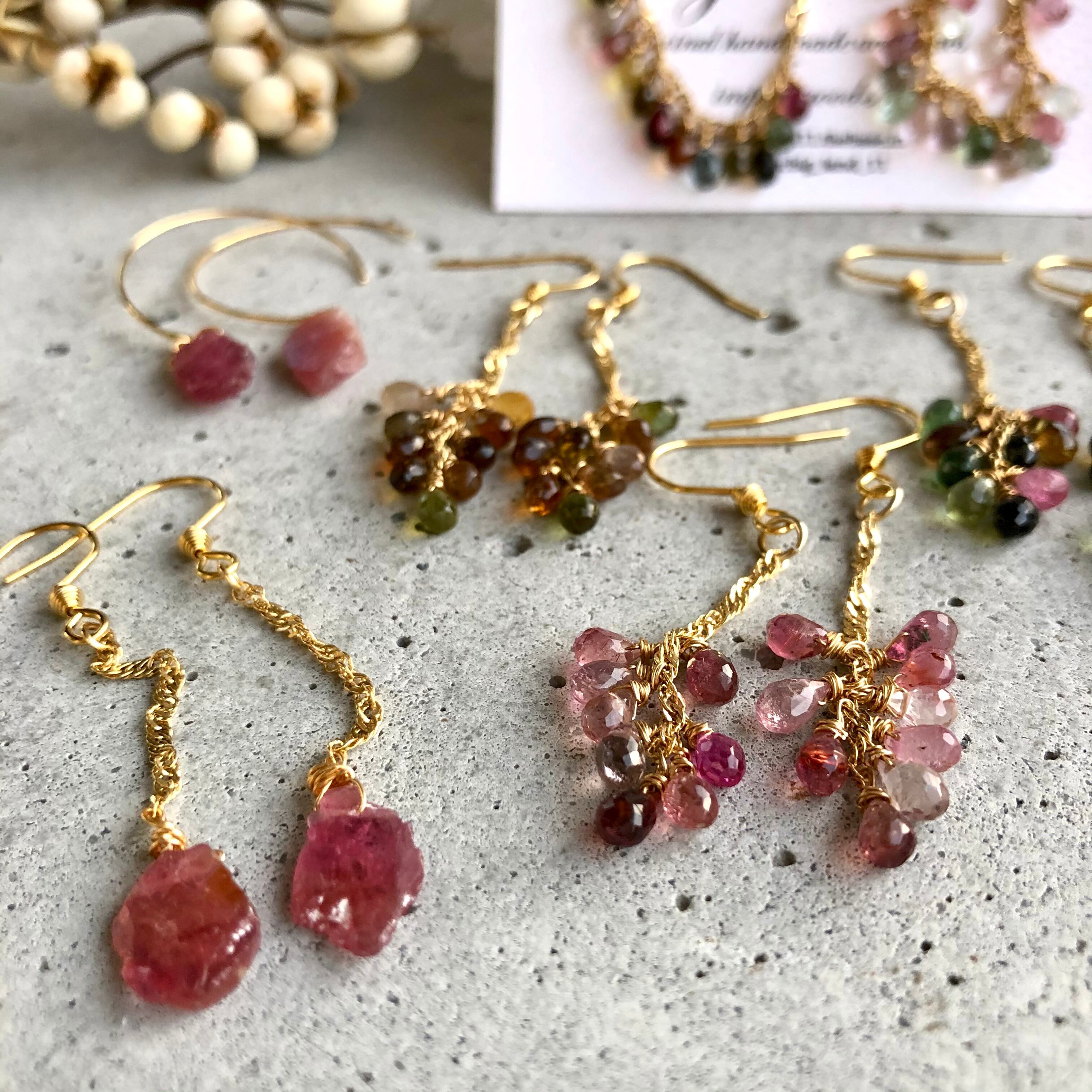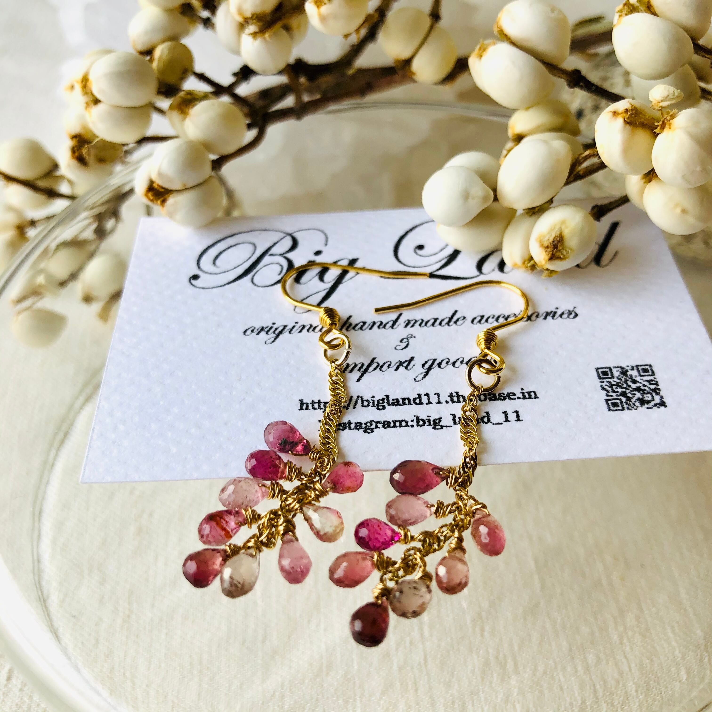 ピンクトルマリンの濃淡をバランス良く組み合わせ、天然石の良さが引き立つ美しいカッティングとツイストチェーンが耳元でキラキラと輝き小粒のトルマリンが何とも言えないキュートさと上品さを兼ね備え高級感があります✨