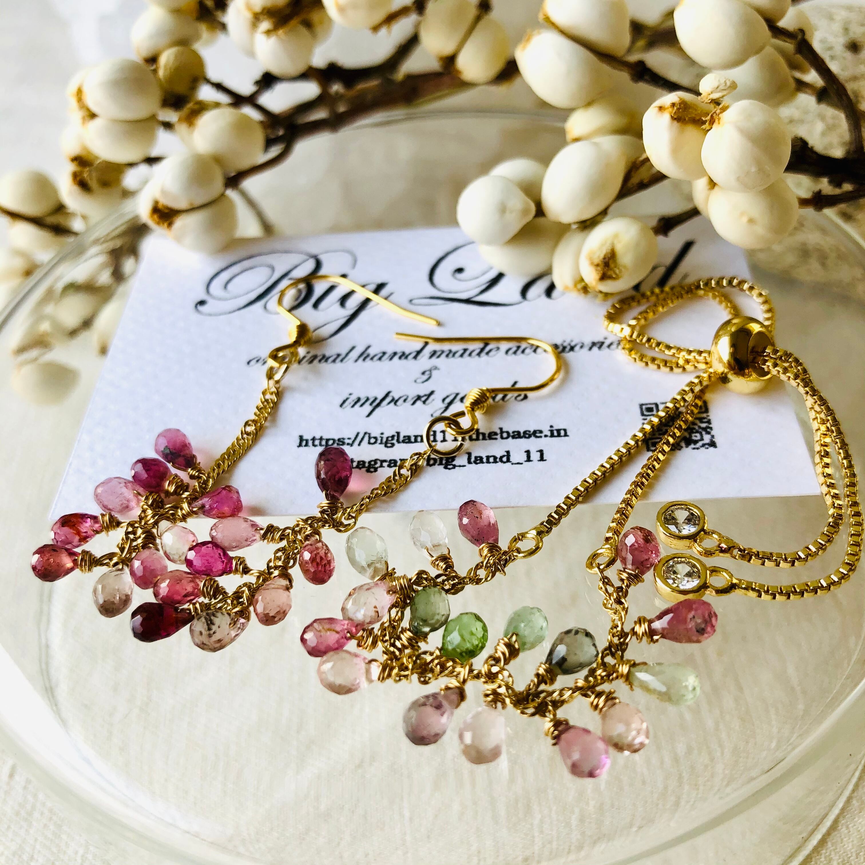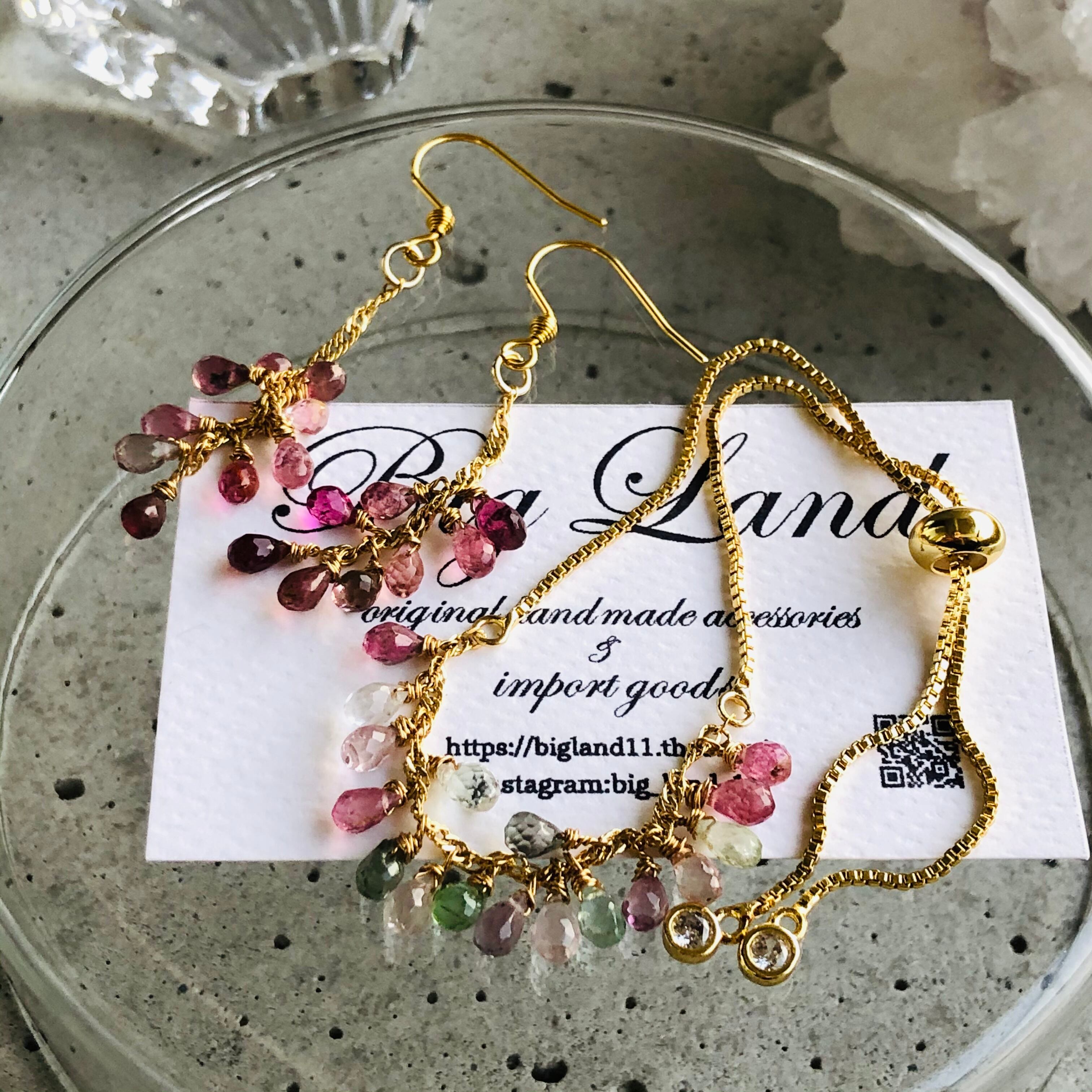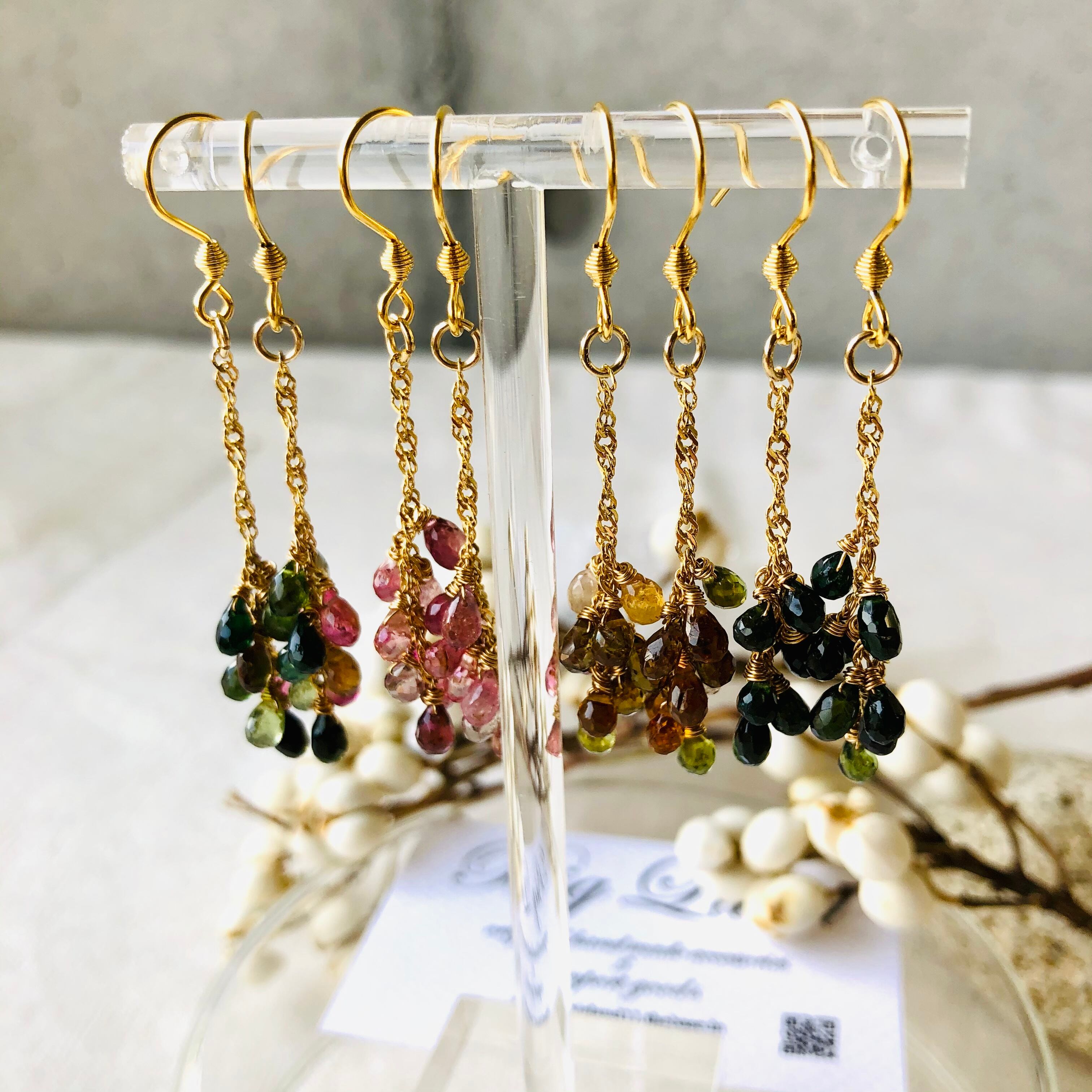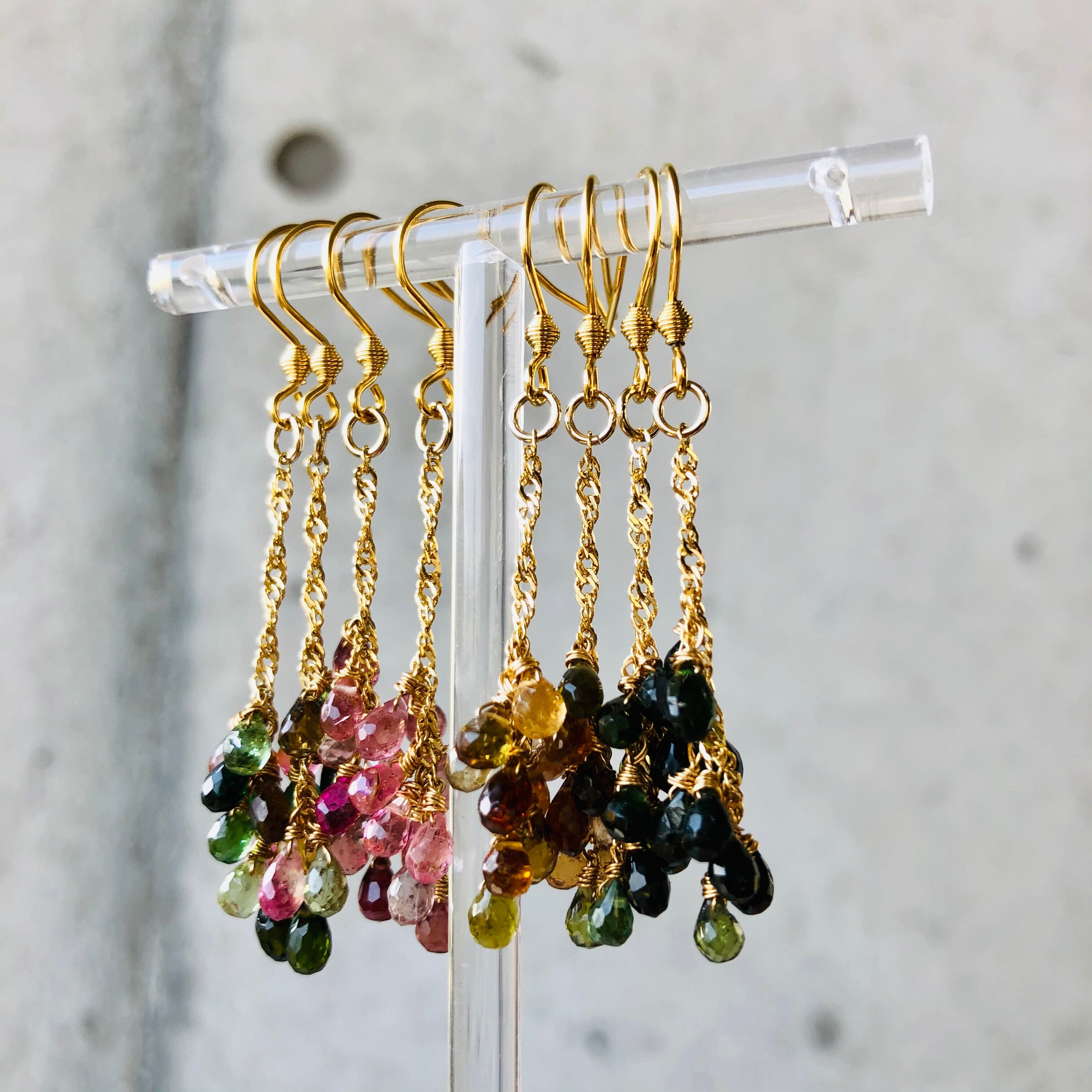 ピンクトルマリンの濃淡をバランス良く組み合わせ、天然石の良さが引き立つ美しいカッティングとツイストチェーンが耳元でキラキラと輝き小粒のトルマリンが何とも言えないキュートさと上品さを兼ね備え高級感があります✨