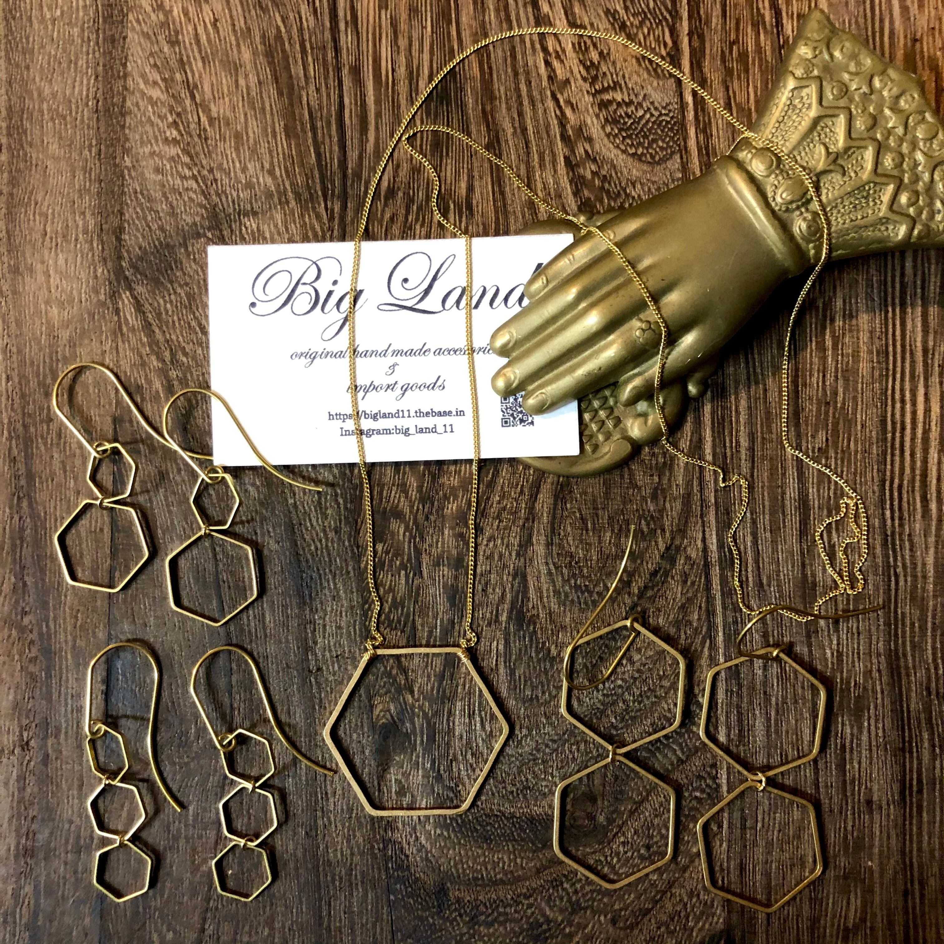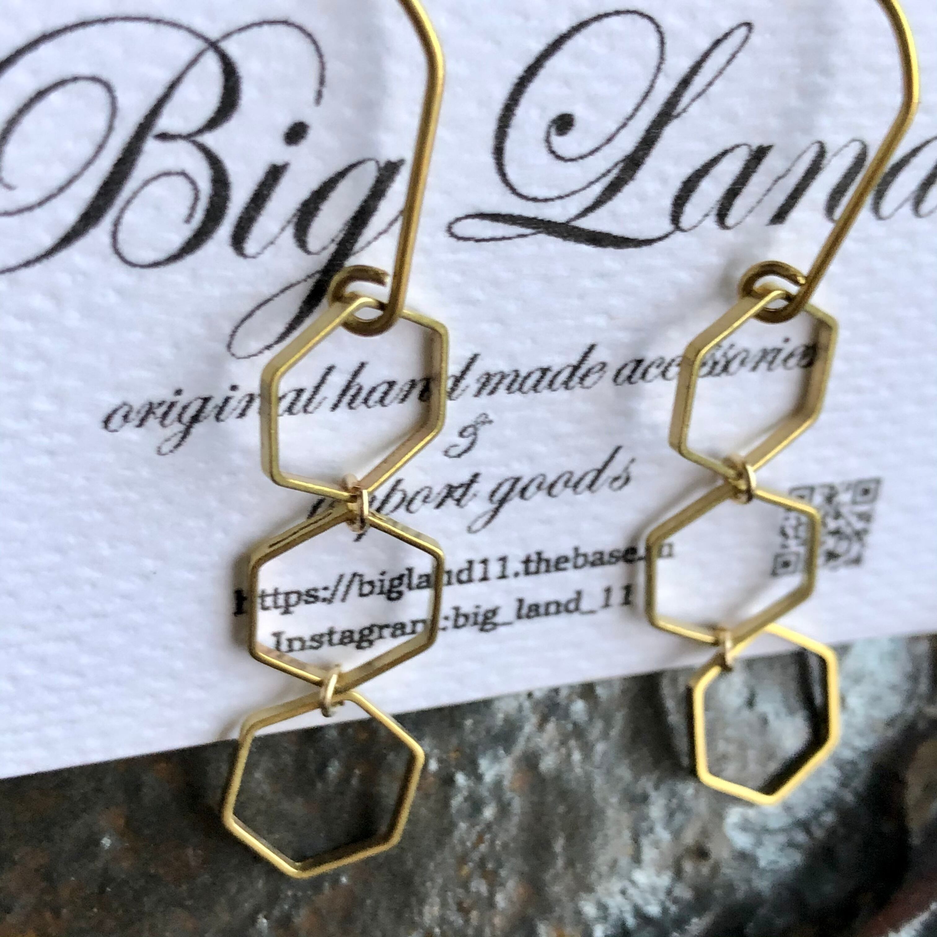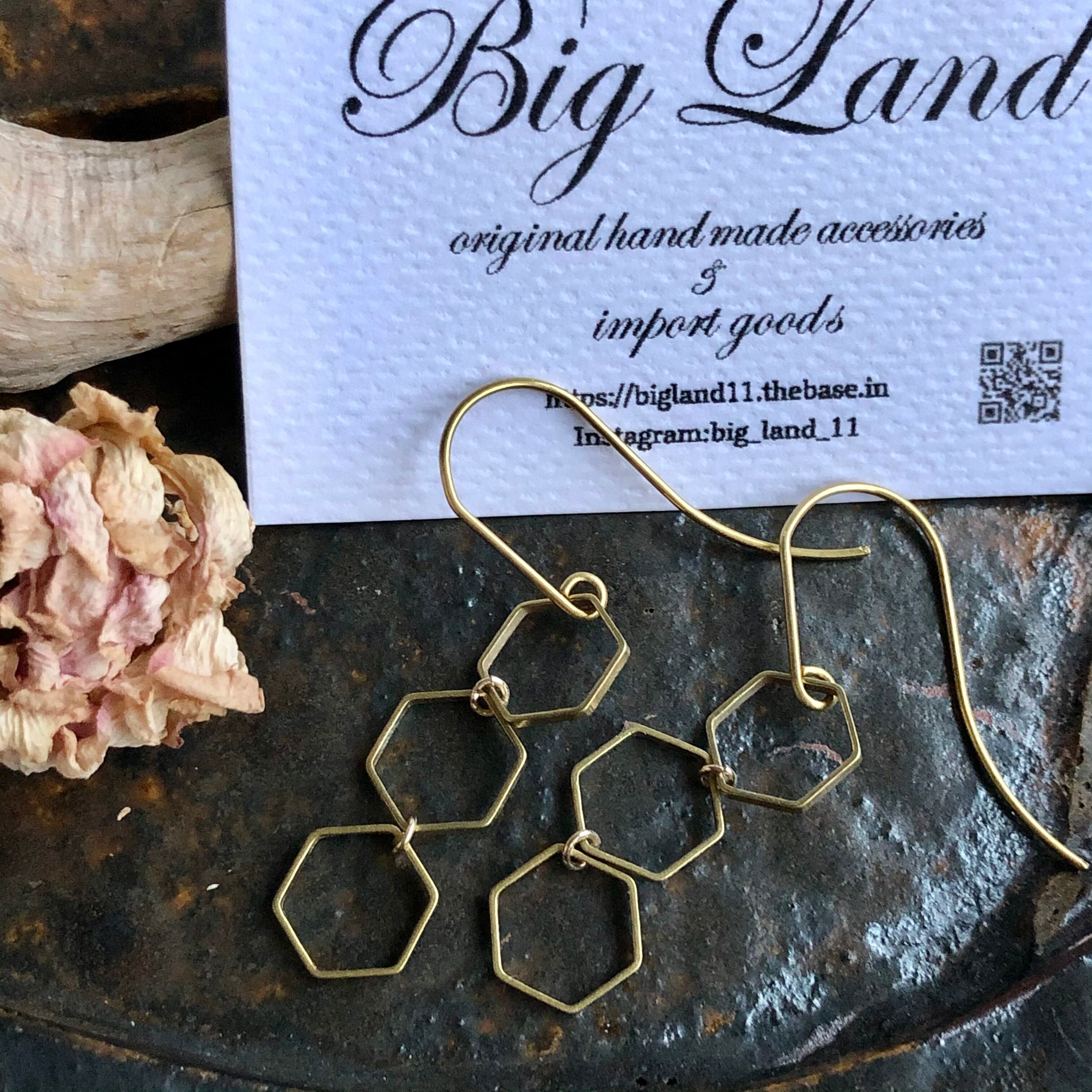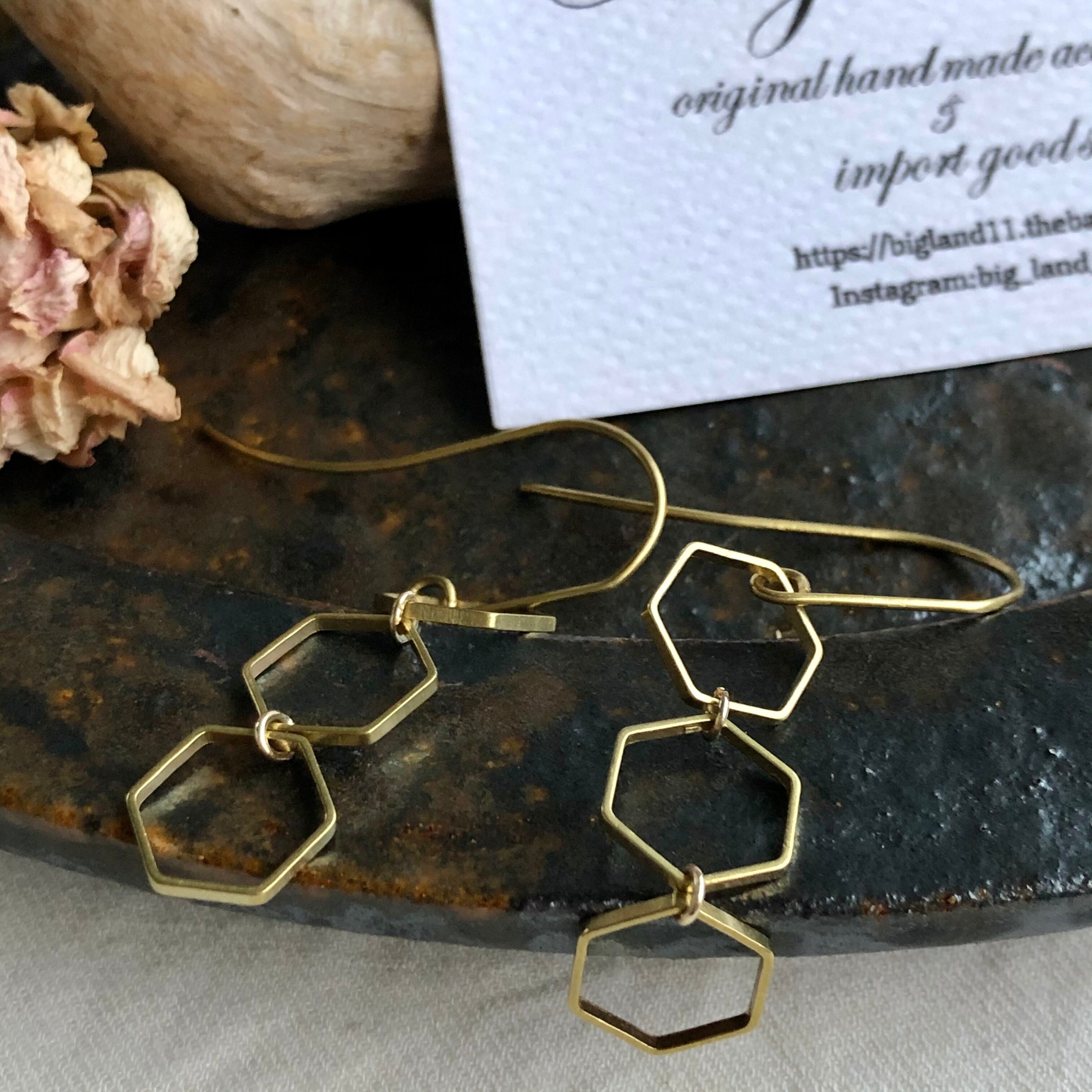 六角&ピアスフック全て真鍮素材を使いアンティーク且つデザイナーズなスタイルに仕上げピアスフックが長めなのがオシャレ