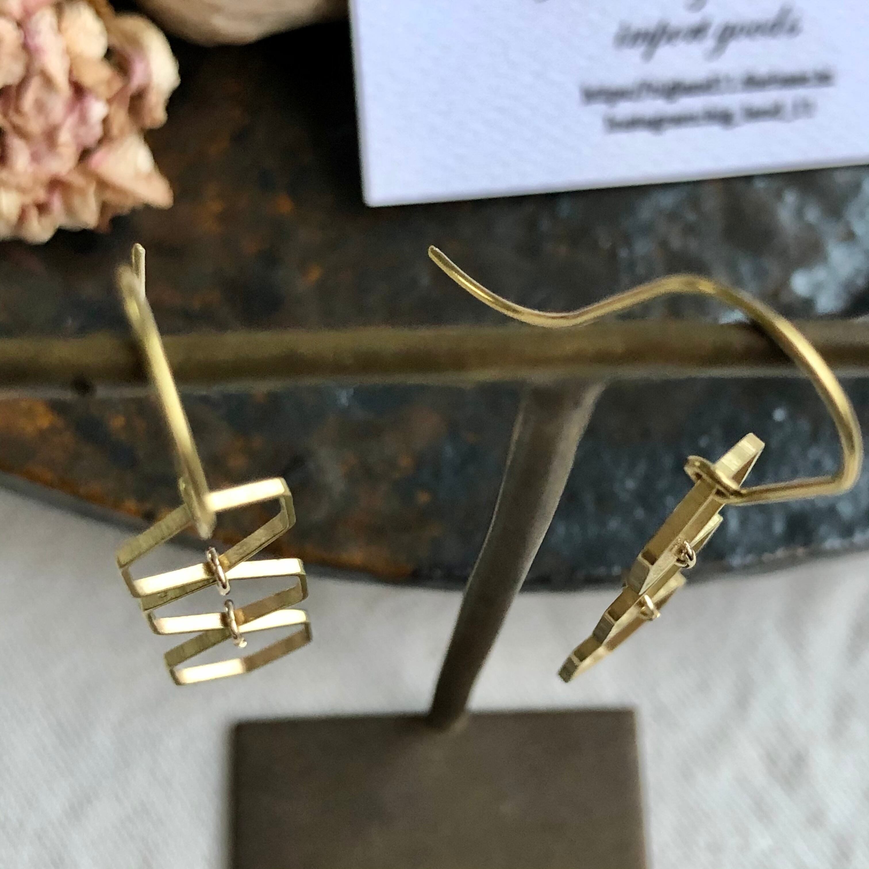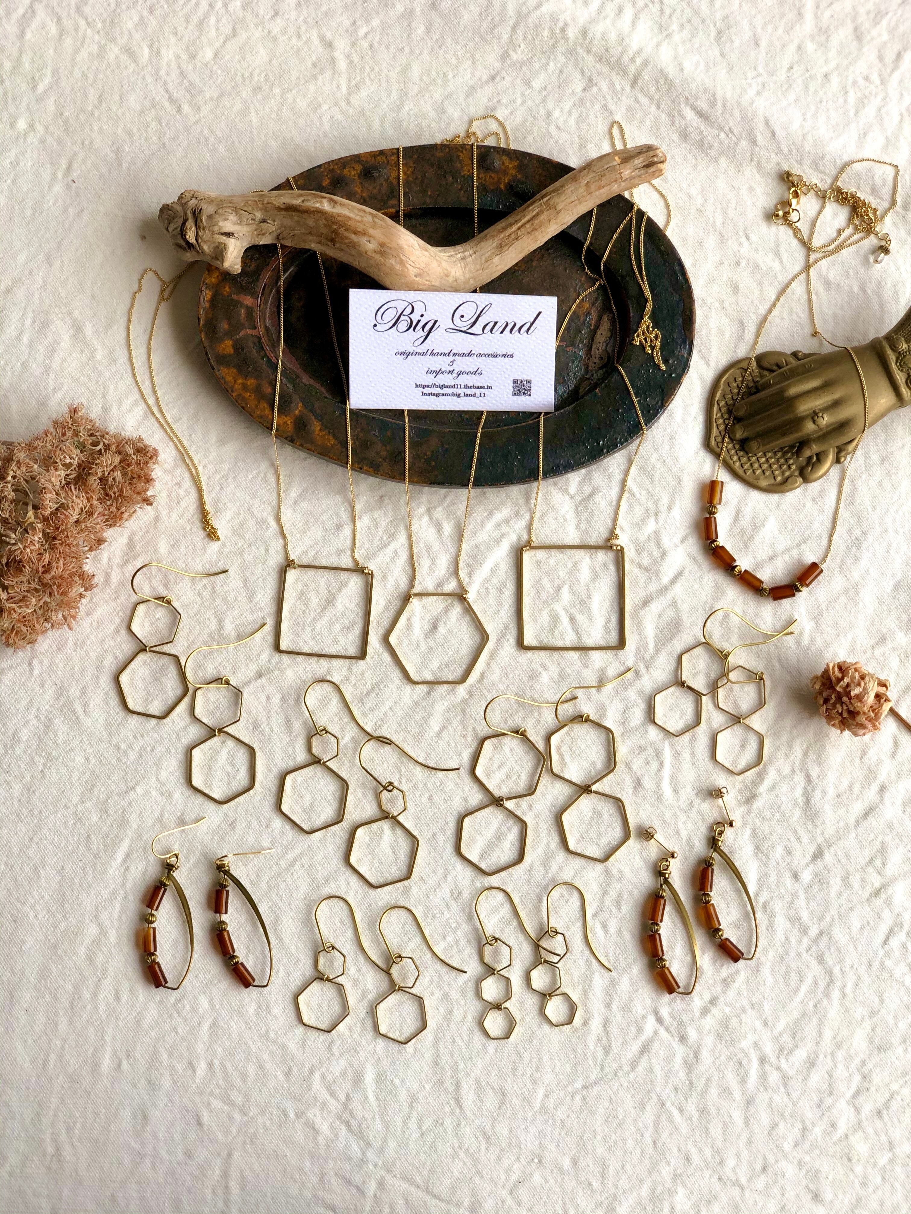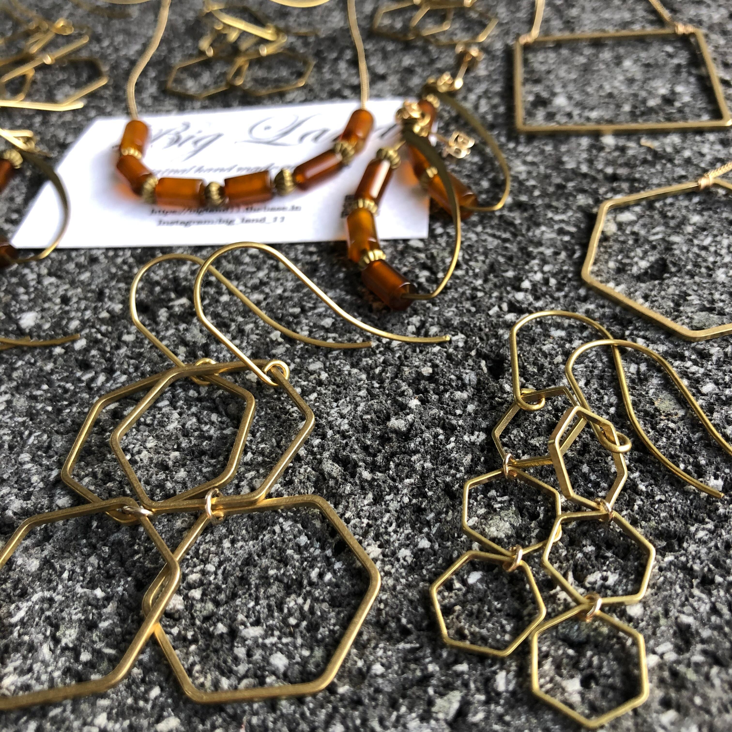 六角&ピアスフック全て真鍮素材を使いアンティーク且つデザイナーズなスタイルに仕上げピアスフックが長めなのがオシャレ