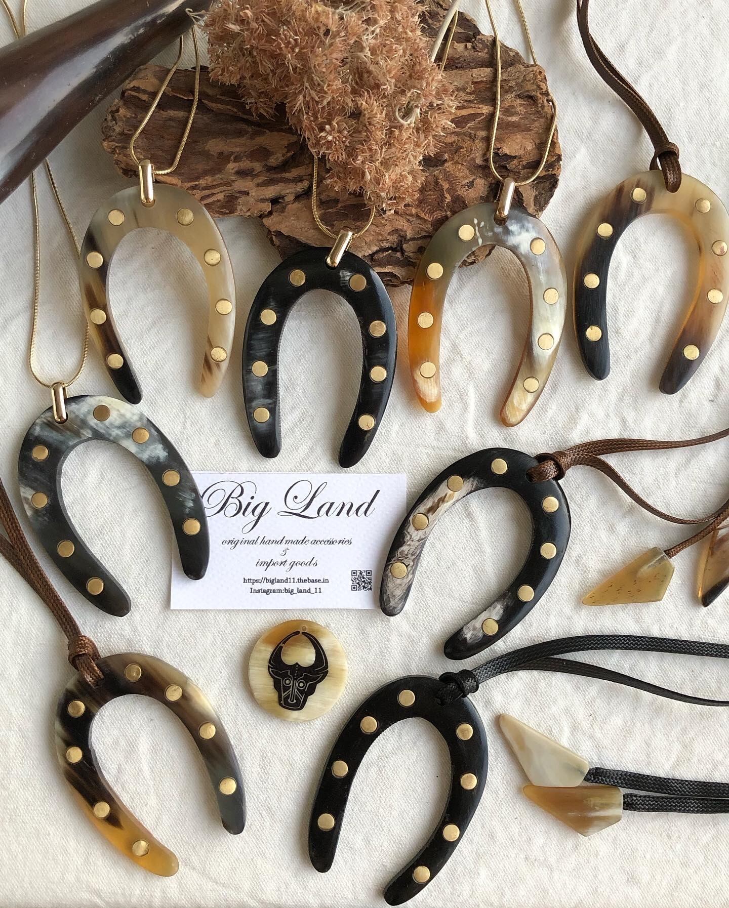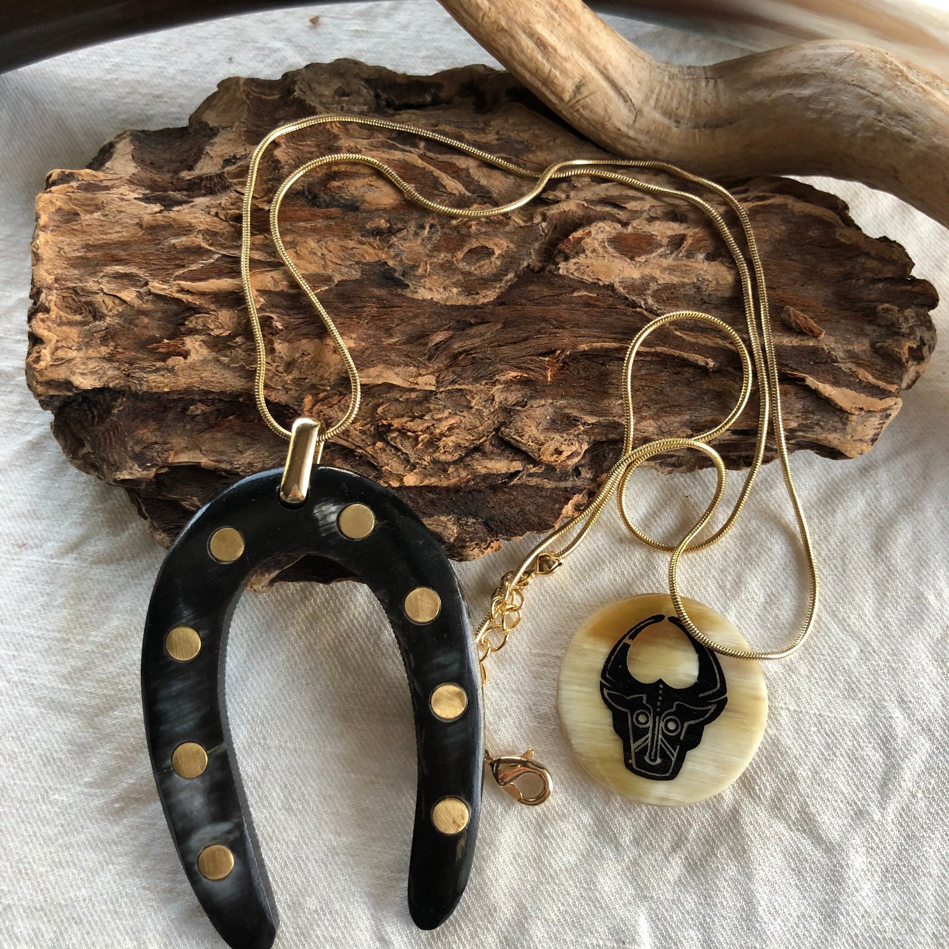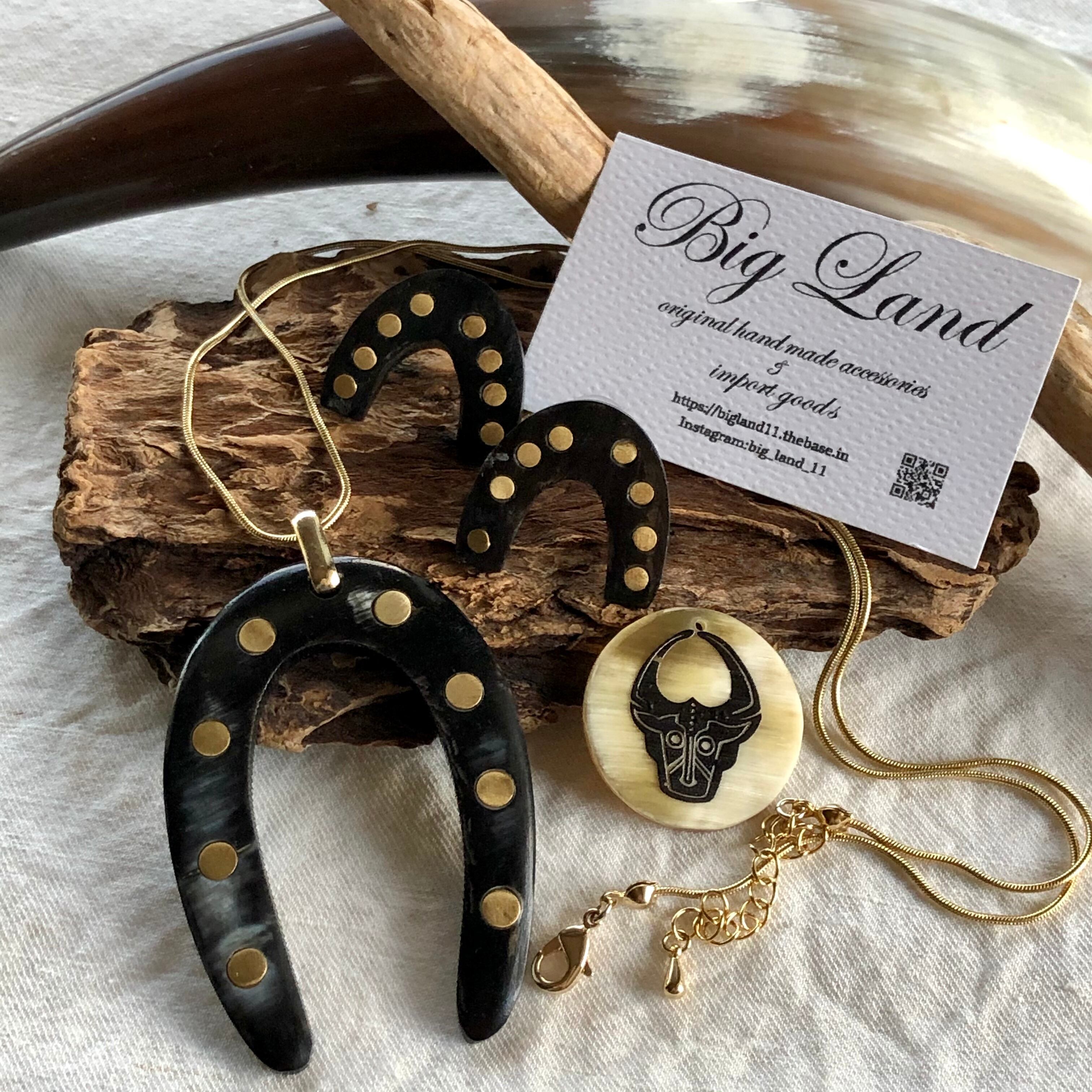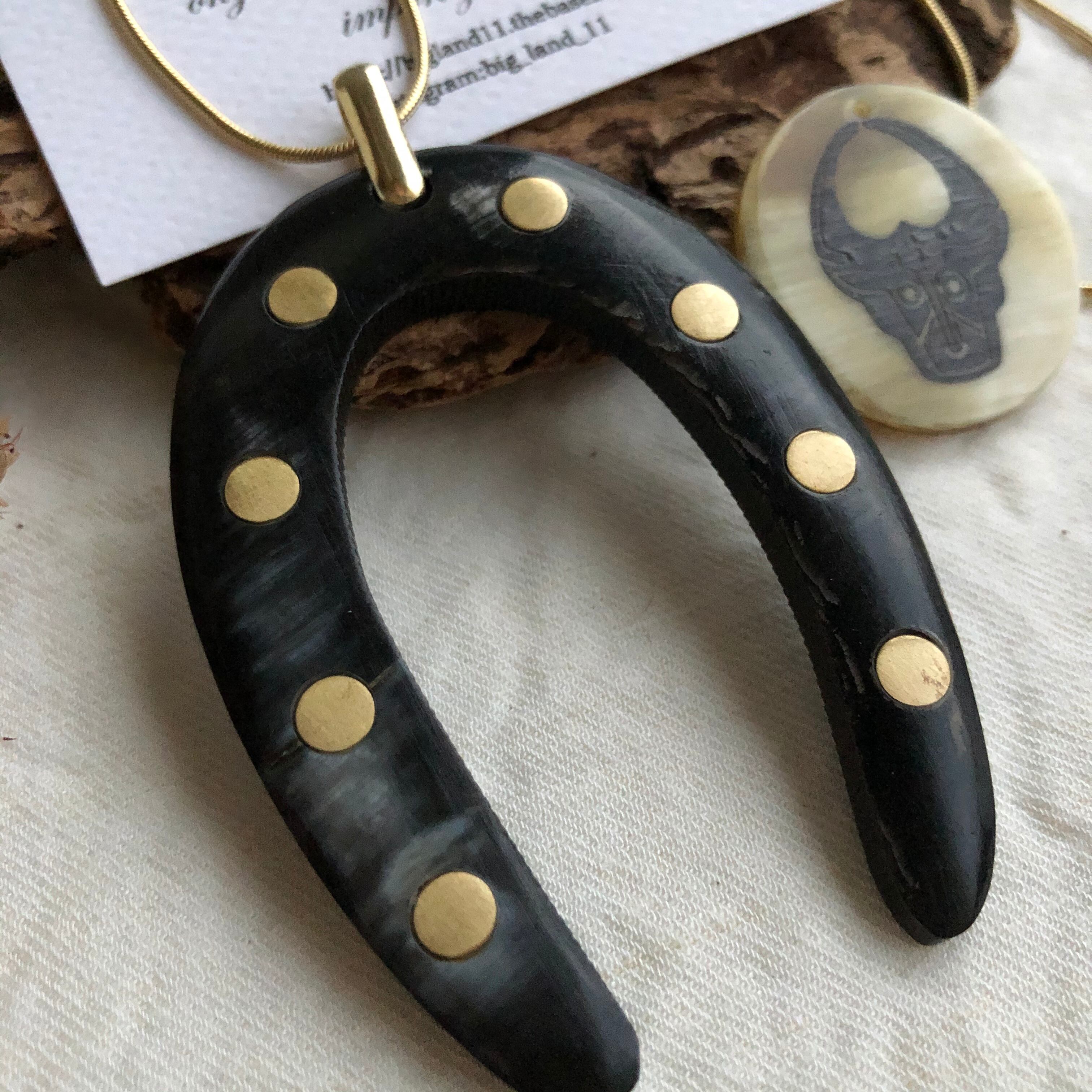 水牛と真鍮の異素材を組み合わせラッキーモチーフの馬蹄(ばてい)は品のあるアンティークな雰囲気で高見えします✨ペンダントはどんな方にも合わせやすいベストなサイズ感にし、ピアスとセットコーデもオススメで真鍮Loveなイチ推しデザインです☺️❤️