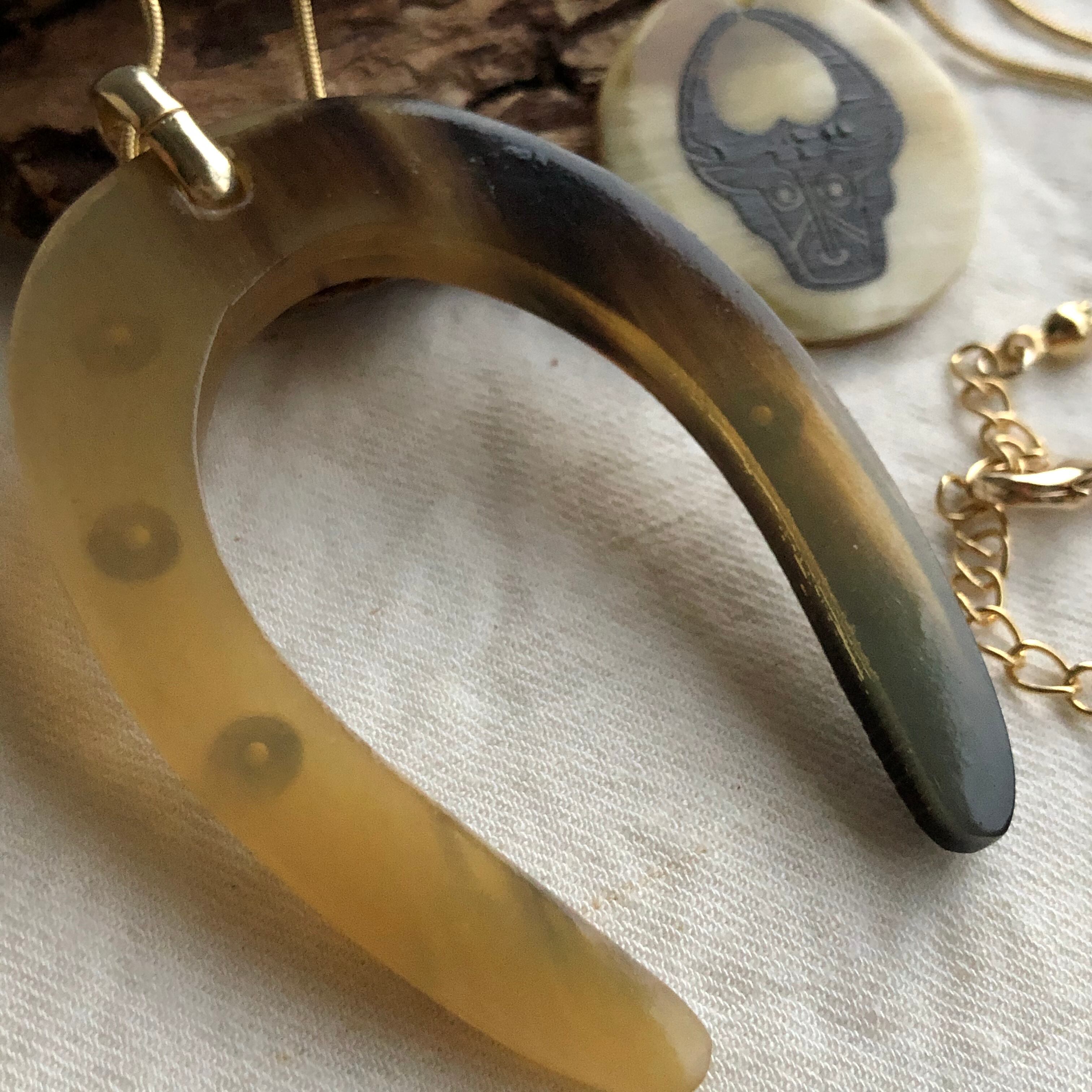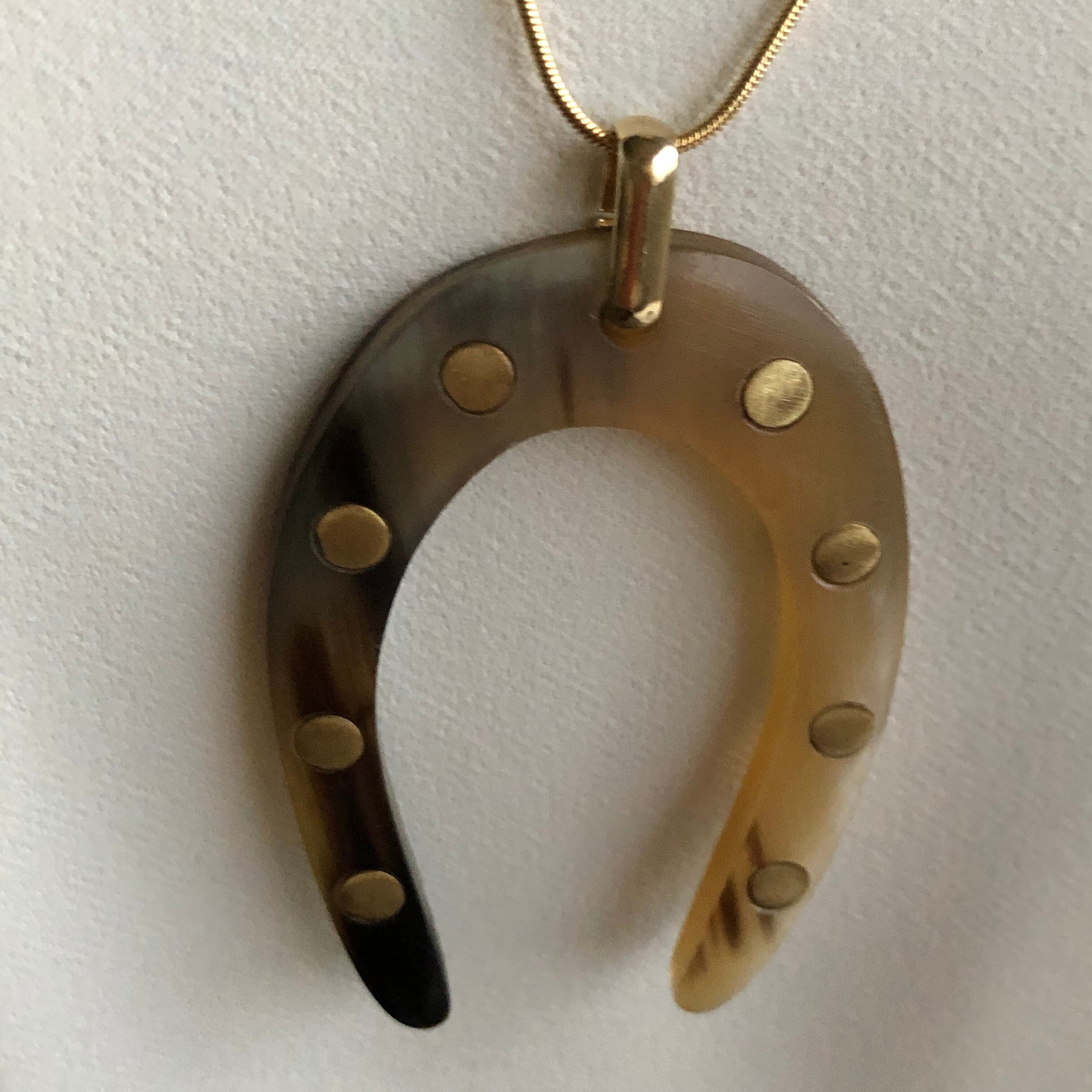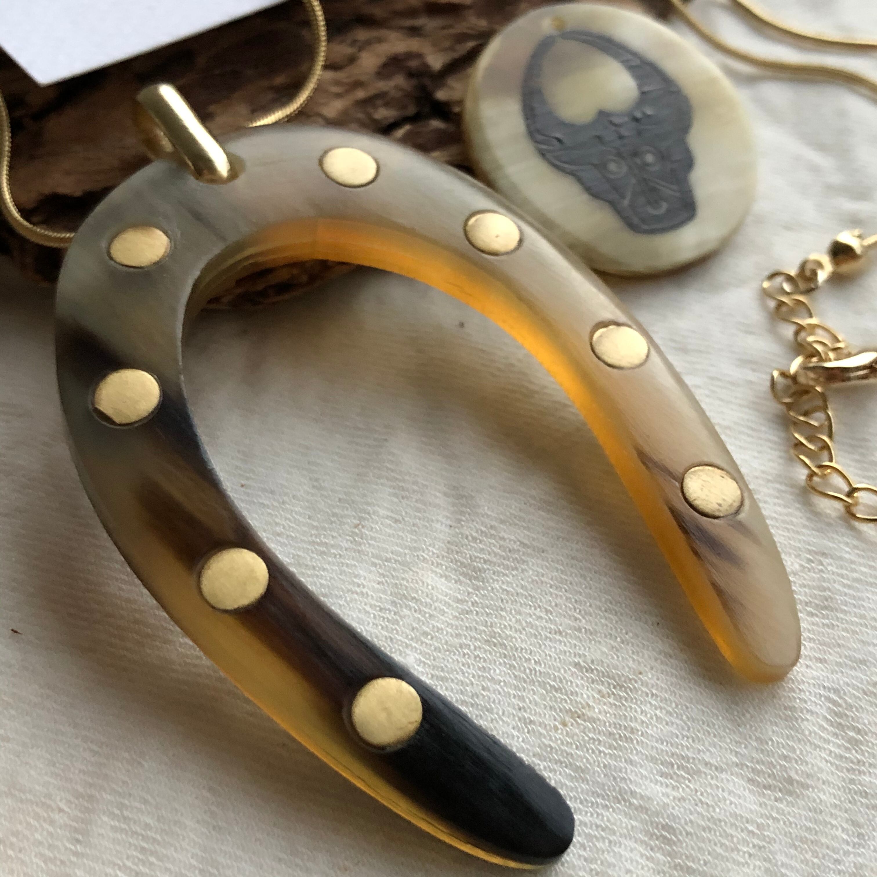 水牛と真鍮の異素材を組み合わせラッキーモチーフの馬蹄(ばてい)は品のあるアンティークな雰囲気で高見えします✨ペンダントはどんな方にも合わせやすいベストなサイズ感にし、ピアスとセットコーデもオススメで真鍮Loveなイチ推しデザインです☺️❤️