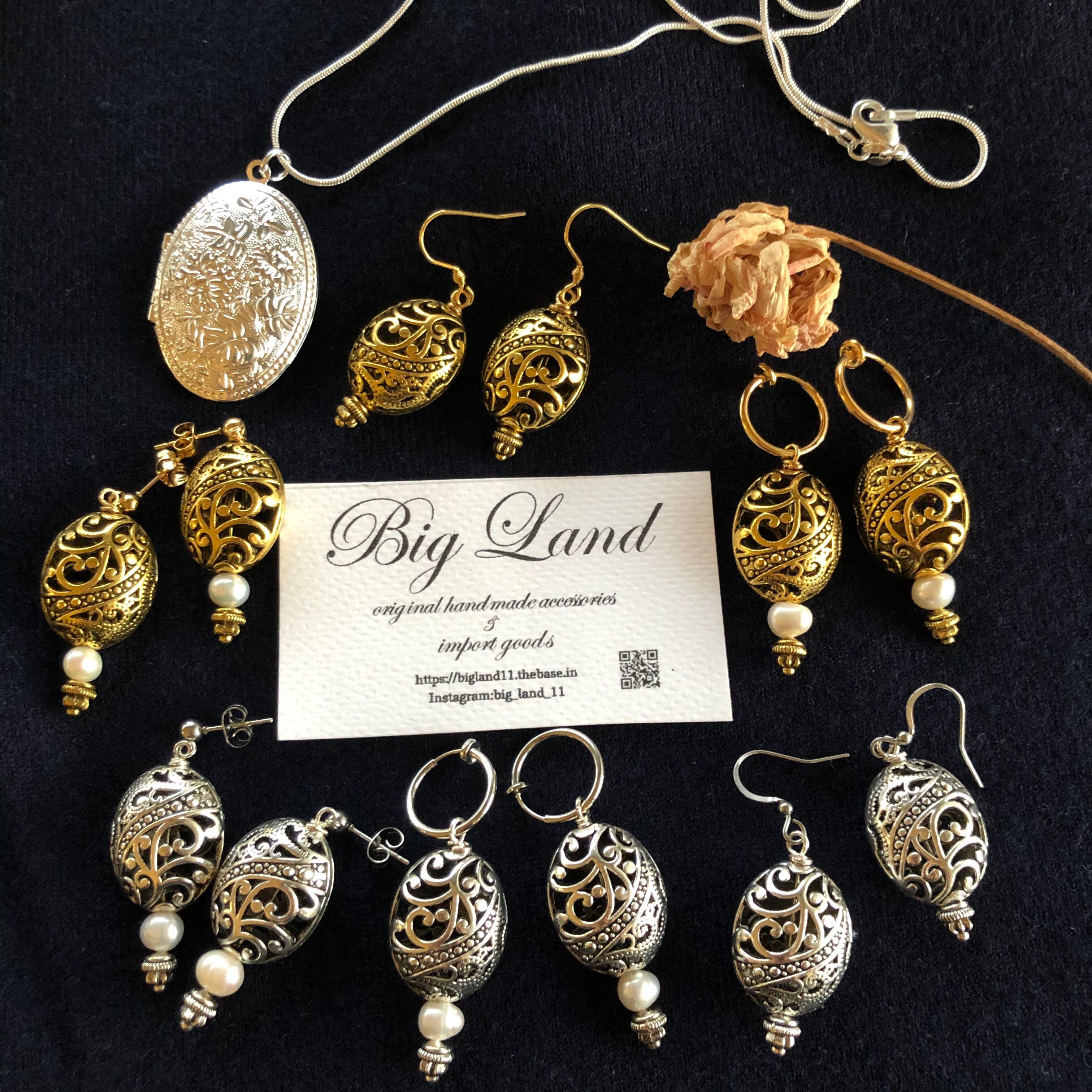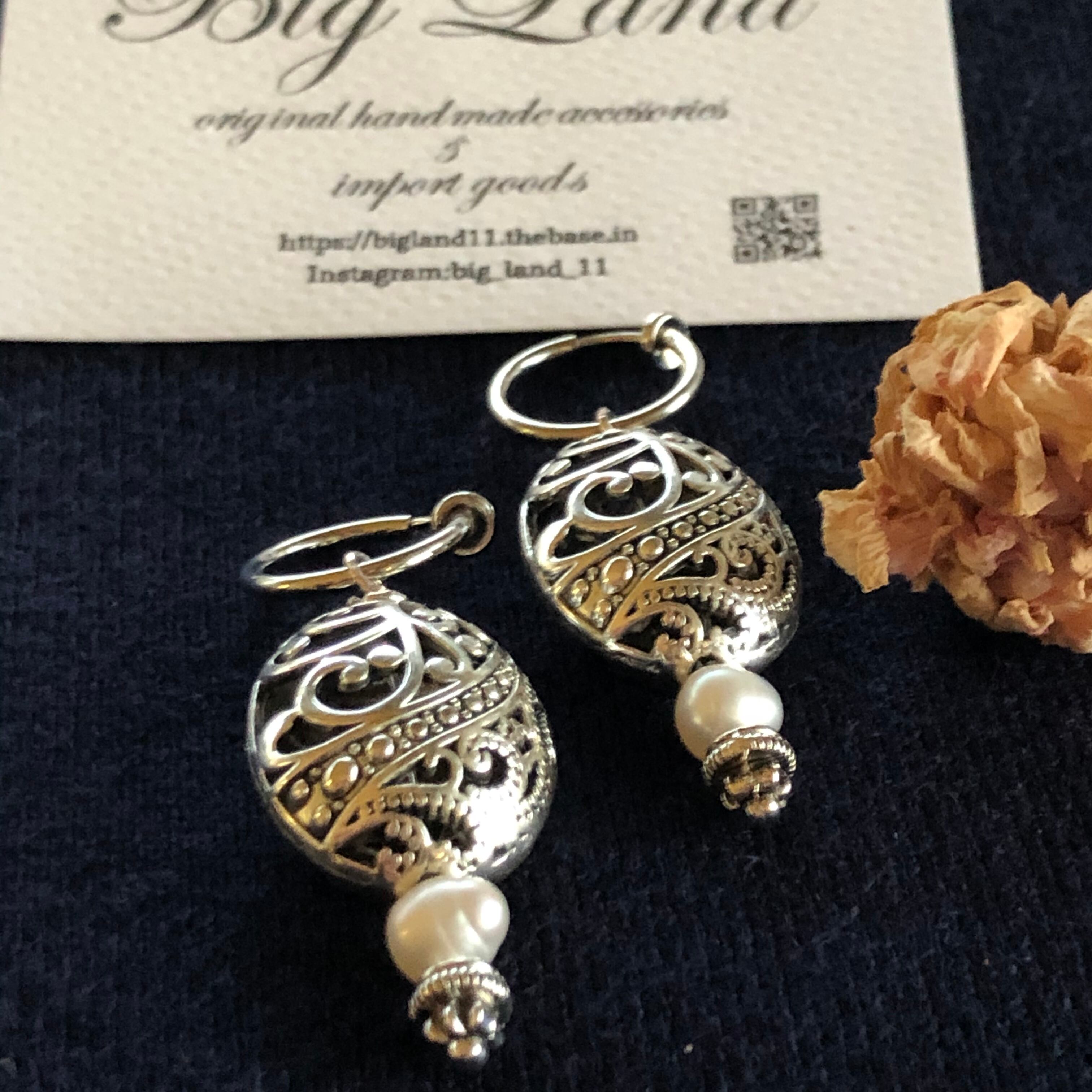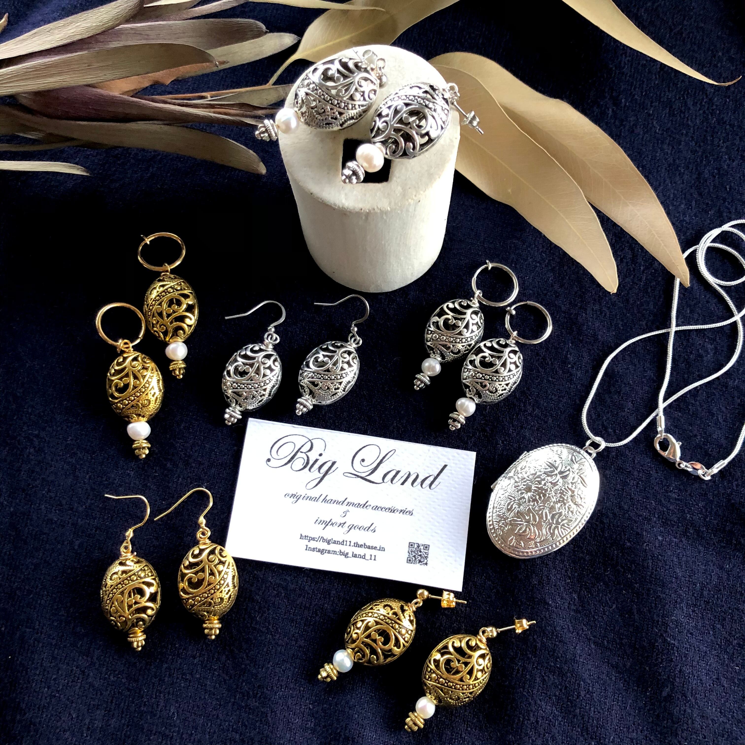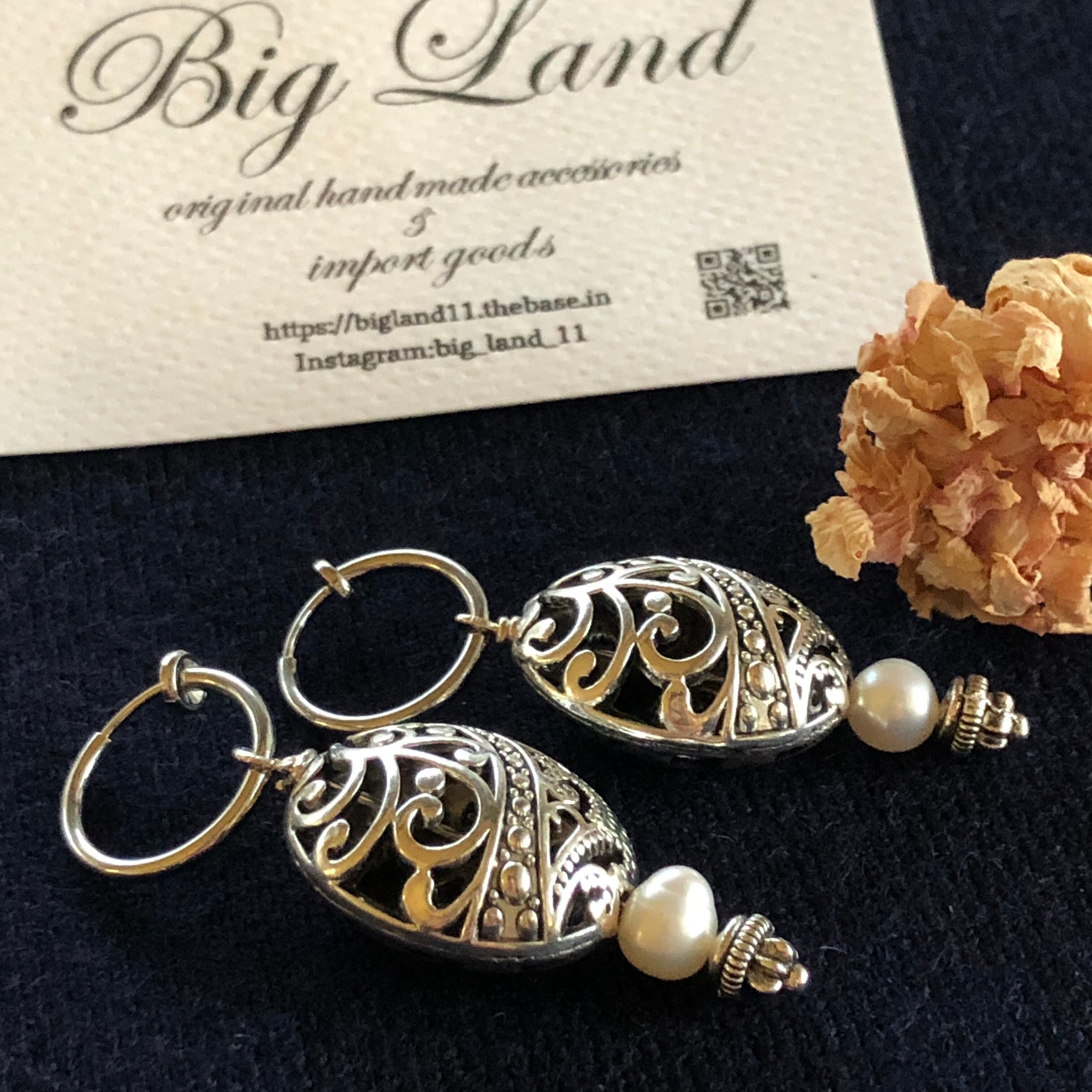 インドジュエリーを彷彿するようなエキゾチックなぽってりとした透かしデザインとパールを組み合わせ、存在感のある個性溢れるデザインに仕上げました✨