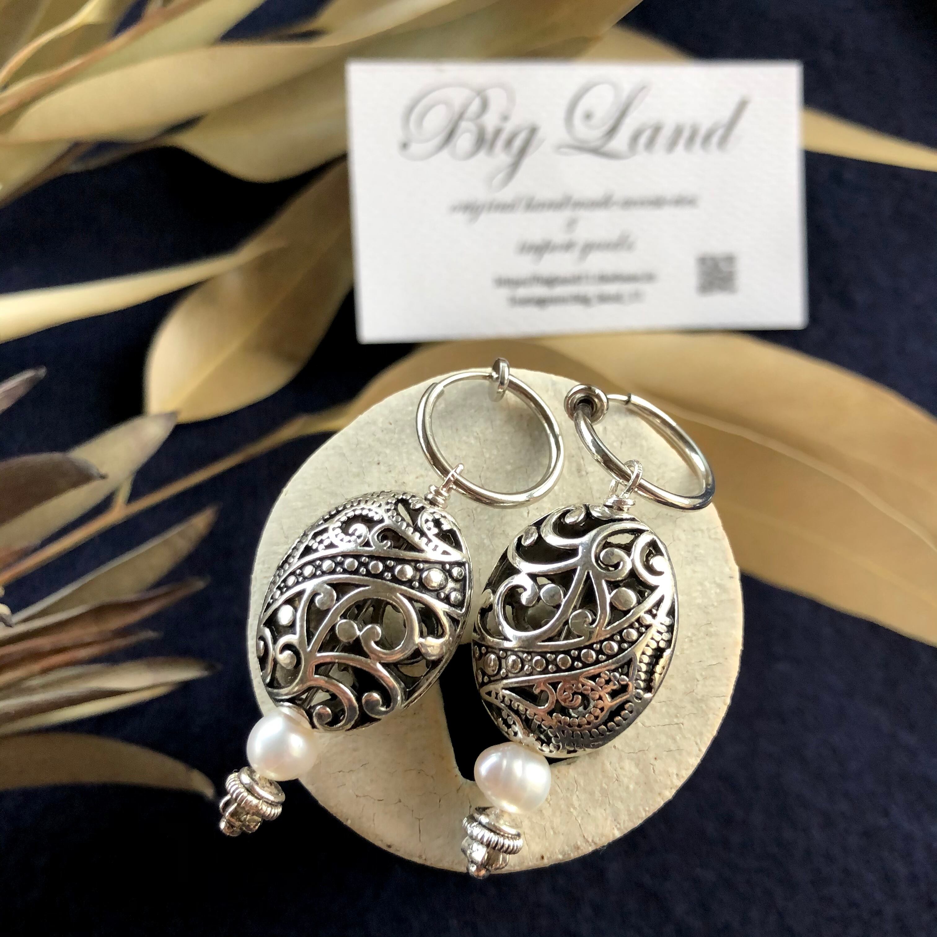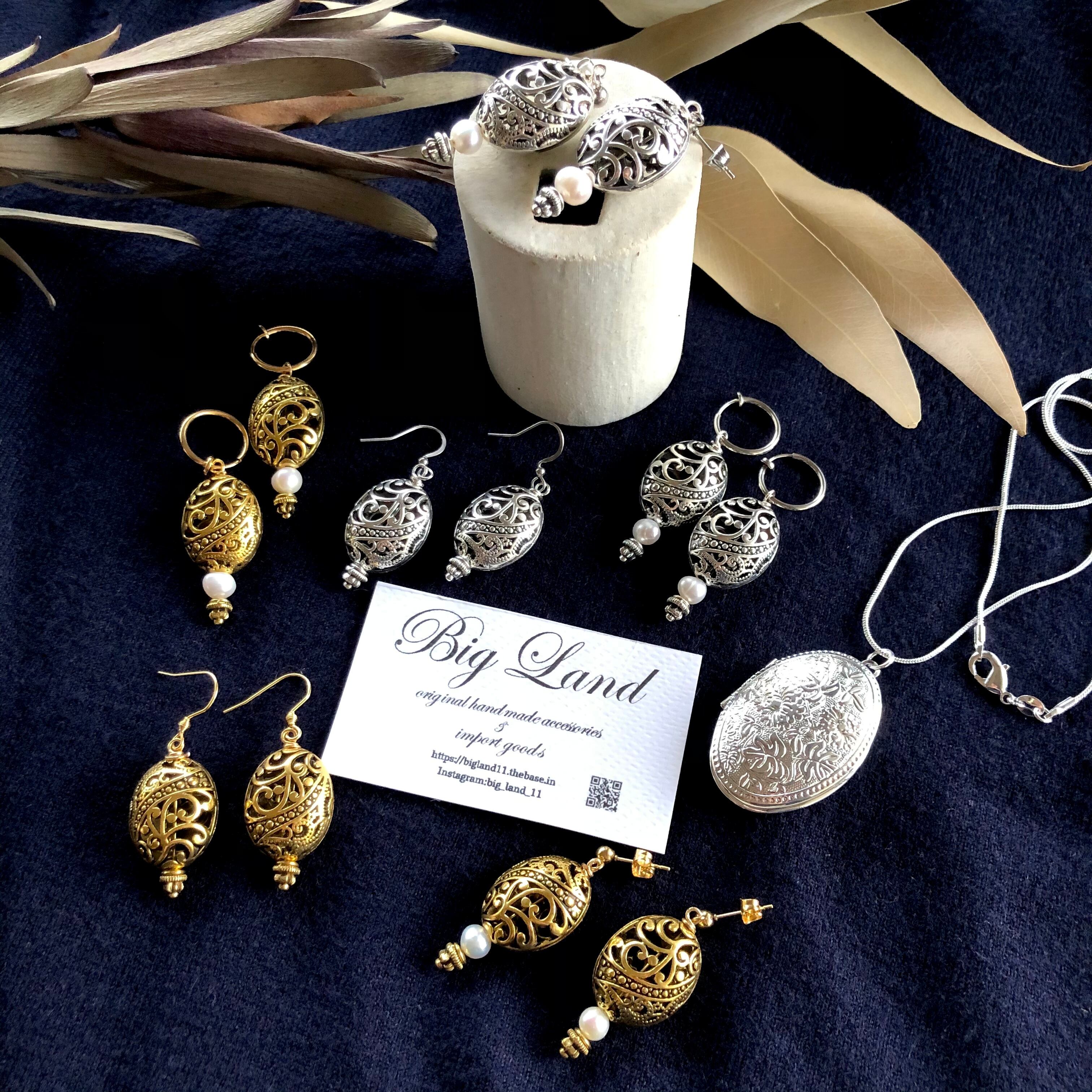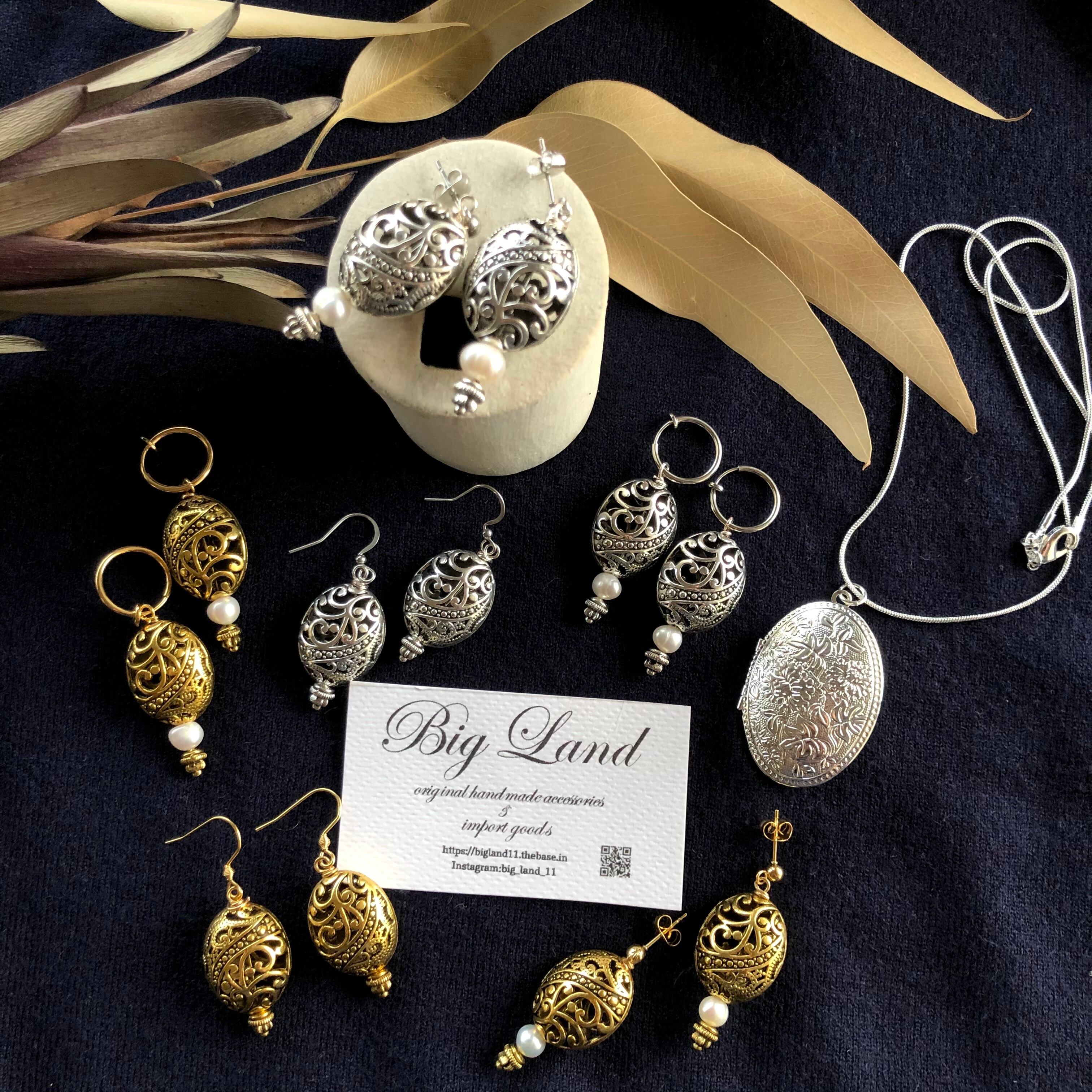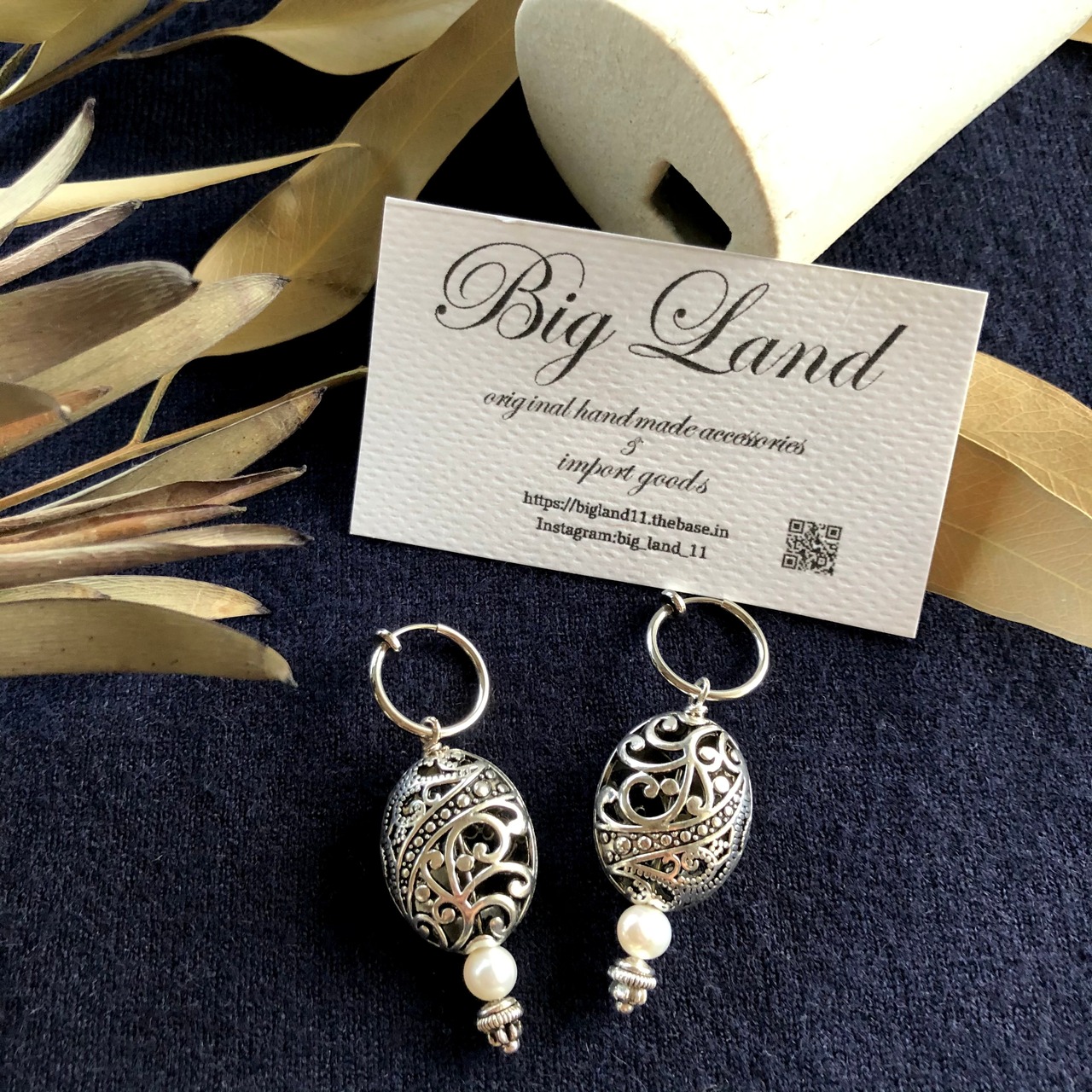 インドジュエリーを彷彿するようなエキゾチックなぽってりとした透かしデザインとパールを組み合わせ、存在感のある個性溢れるデザインに仕上げました✨