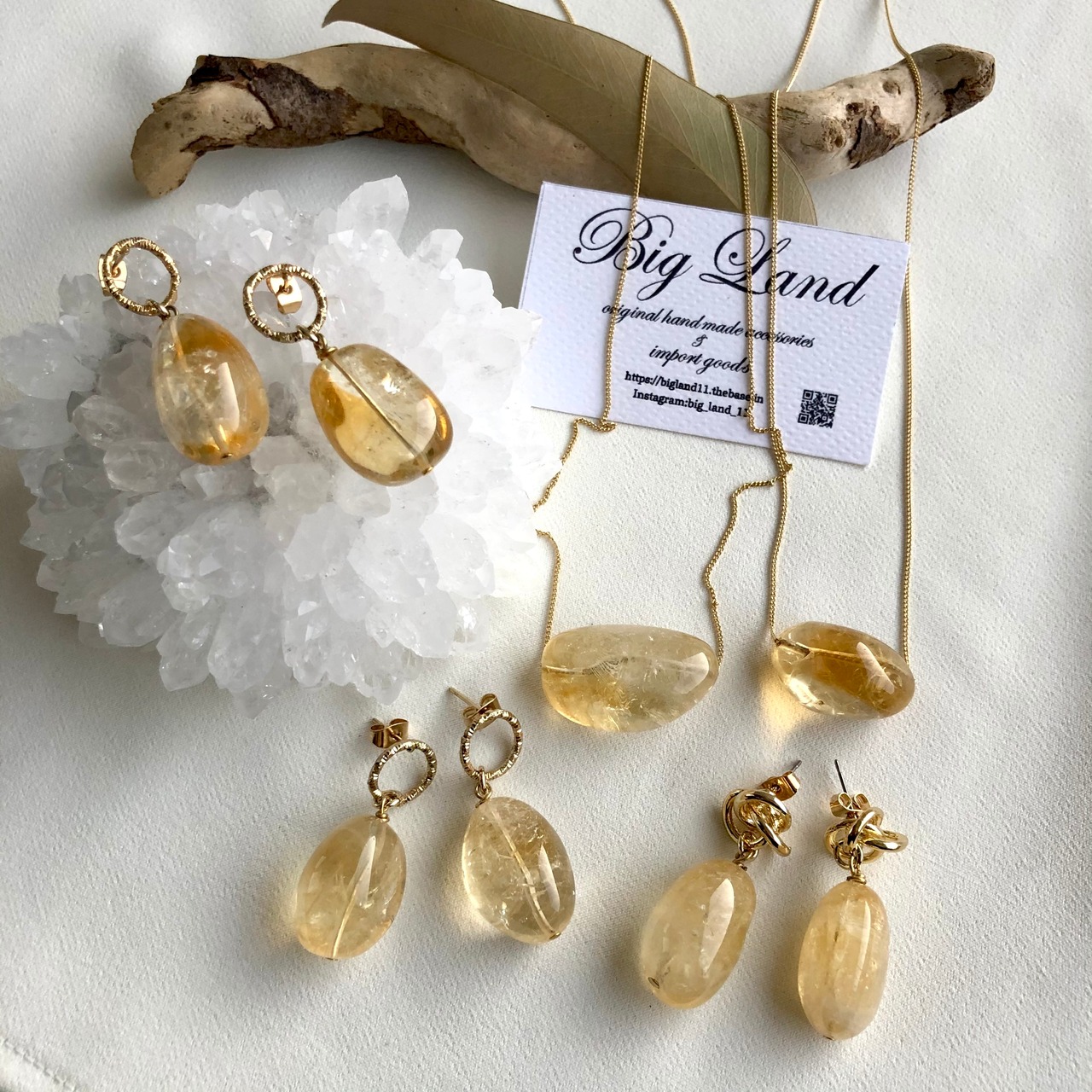 定番化している水晶ネックレスの黄色バージョンがこれまた個性的でセットコーデもgood
