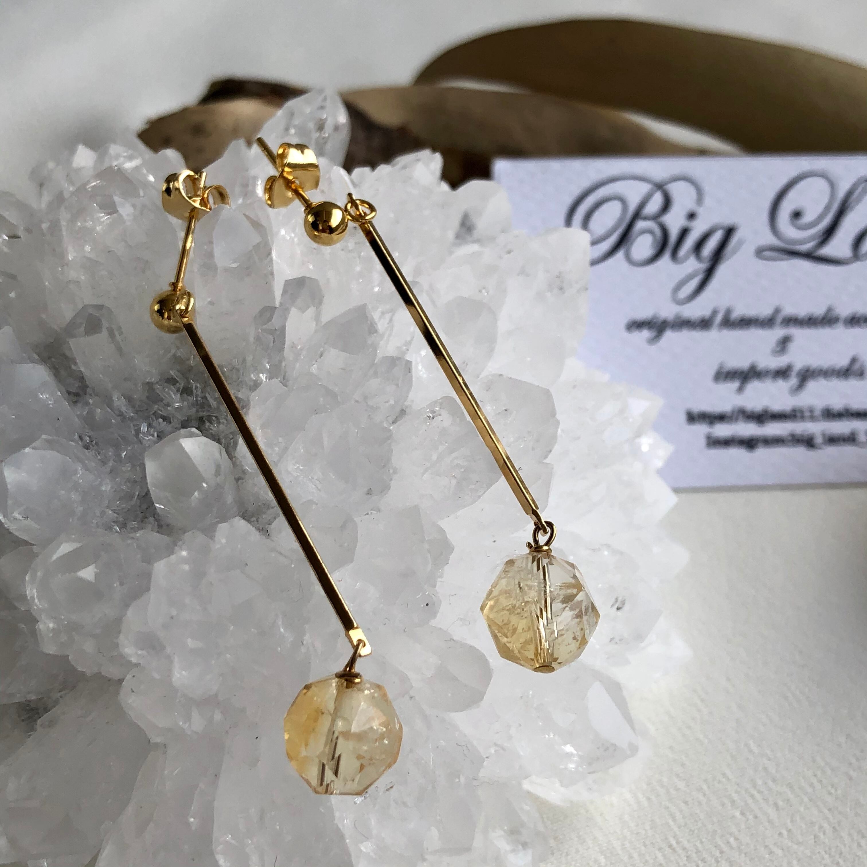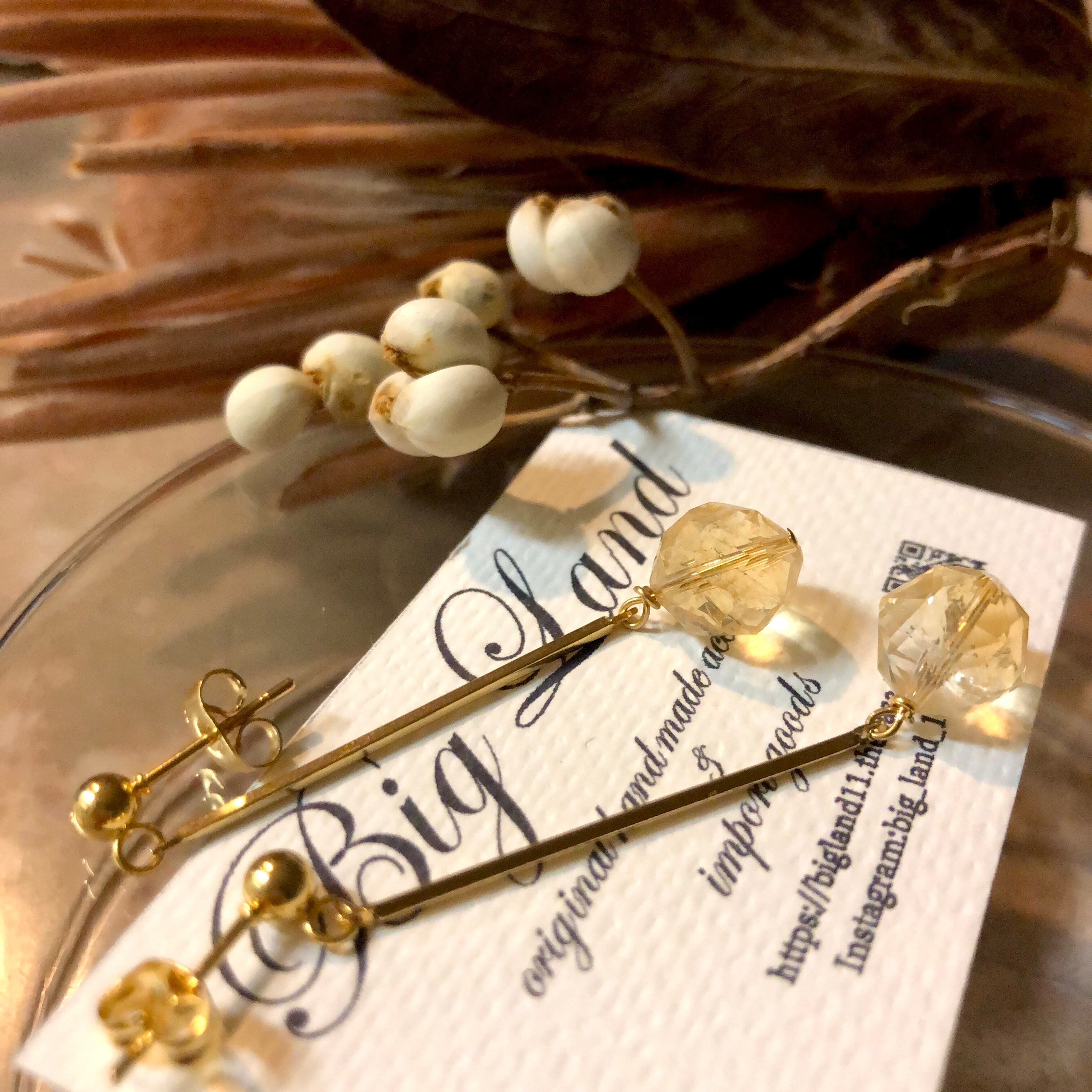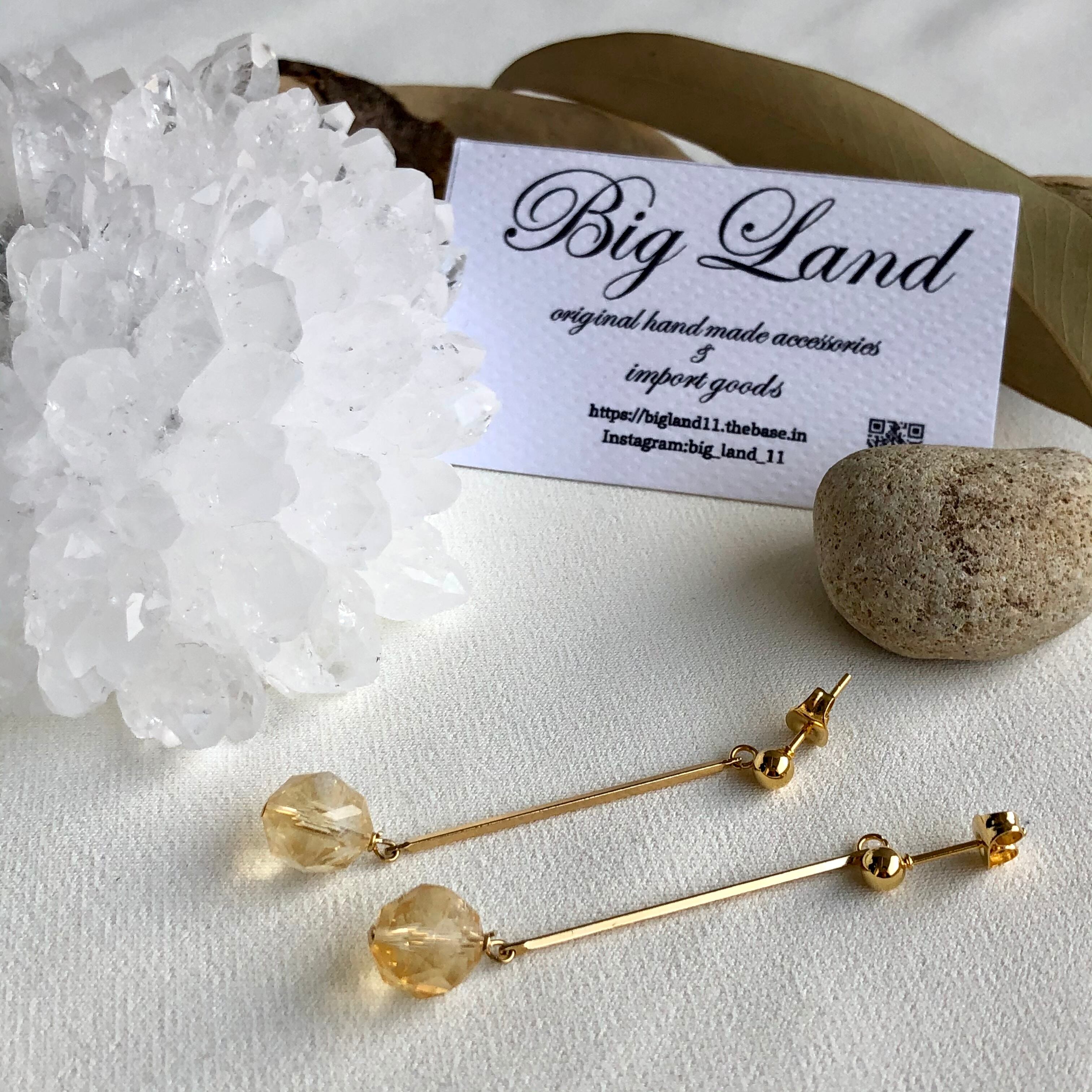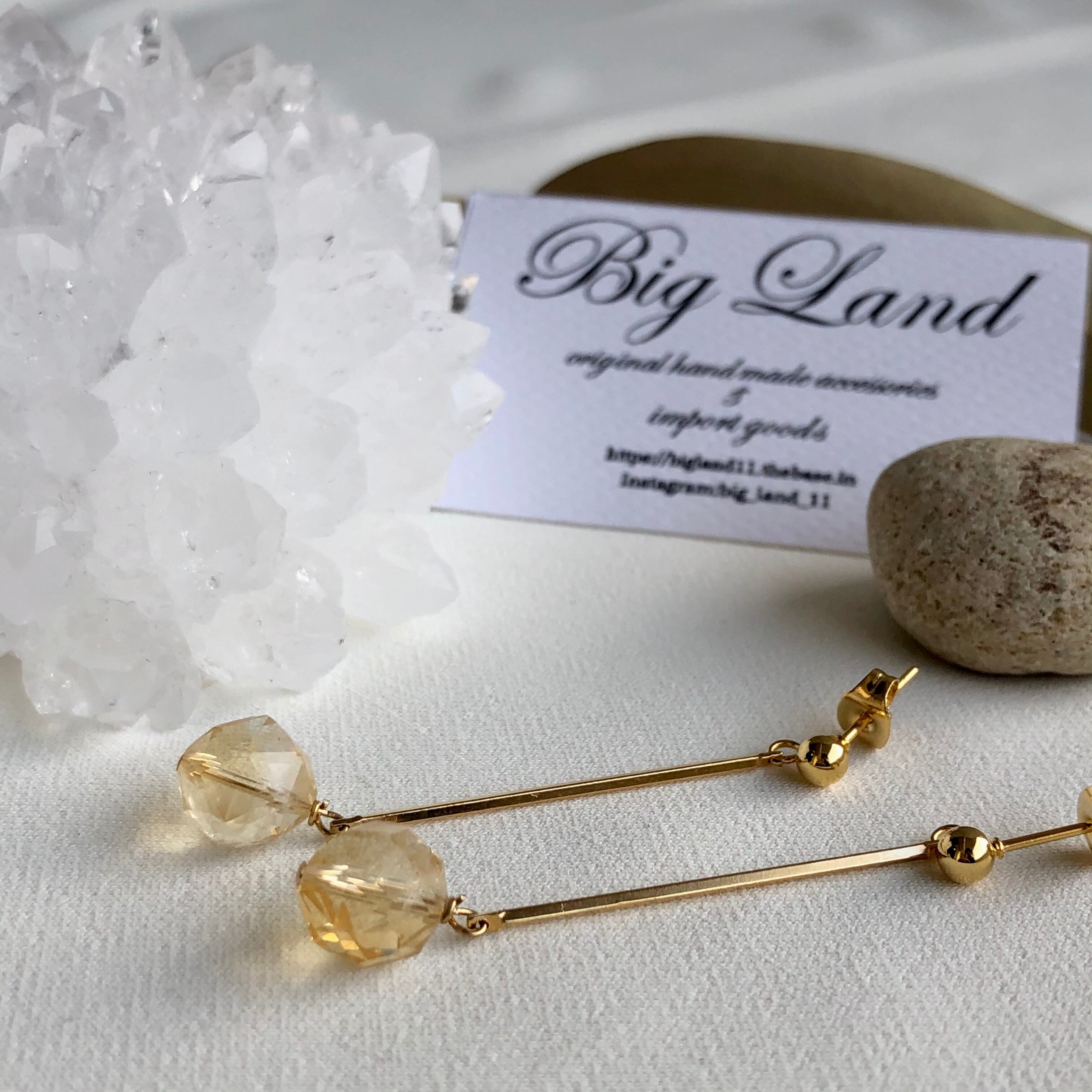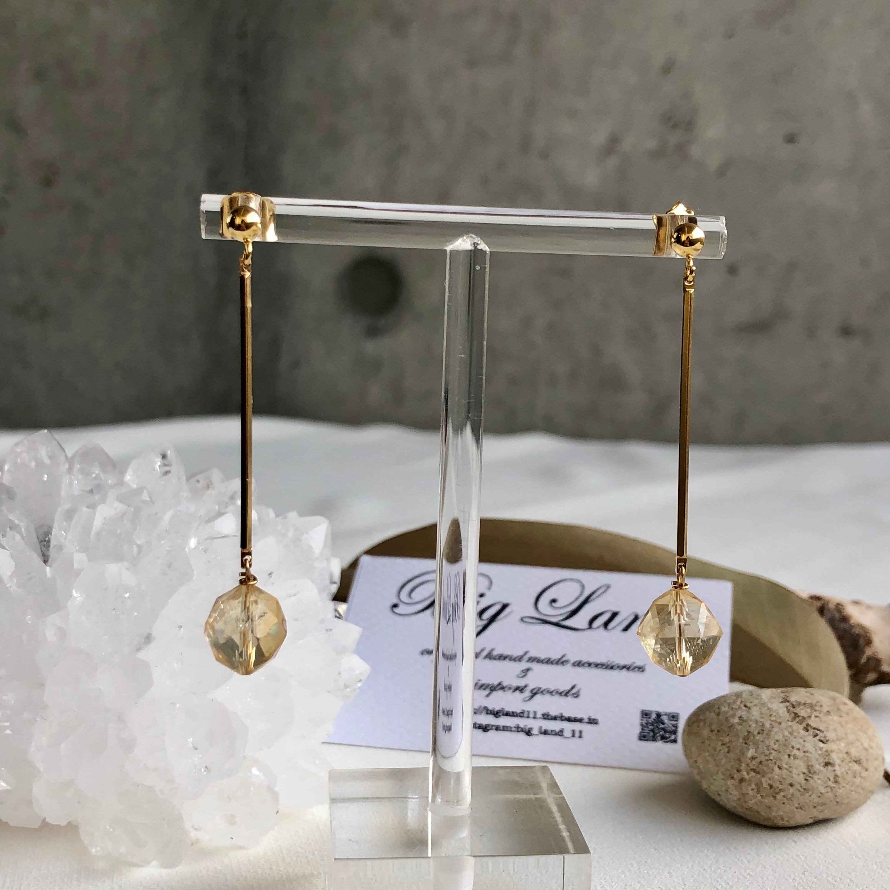 上質カットされた(シトリン)黄色水晶がキラキラ輝き洗練された雰囲気で神秘さと妖艶な美しさ.....縦長にする事により小顔効果があり揺れるモテピアスでこれから沢山着込む季節にもお顔周りに華やかさをもたらします!!