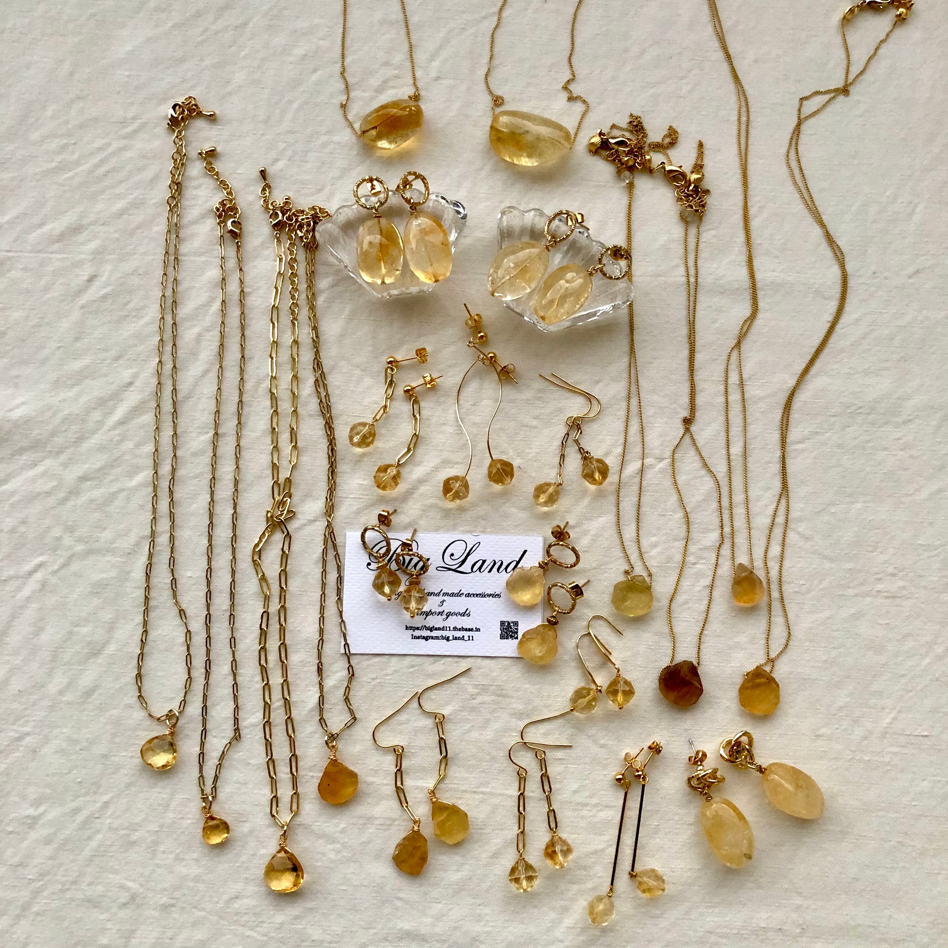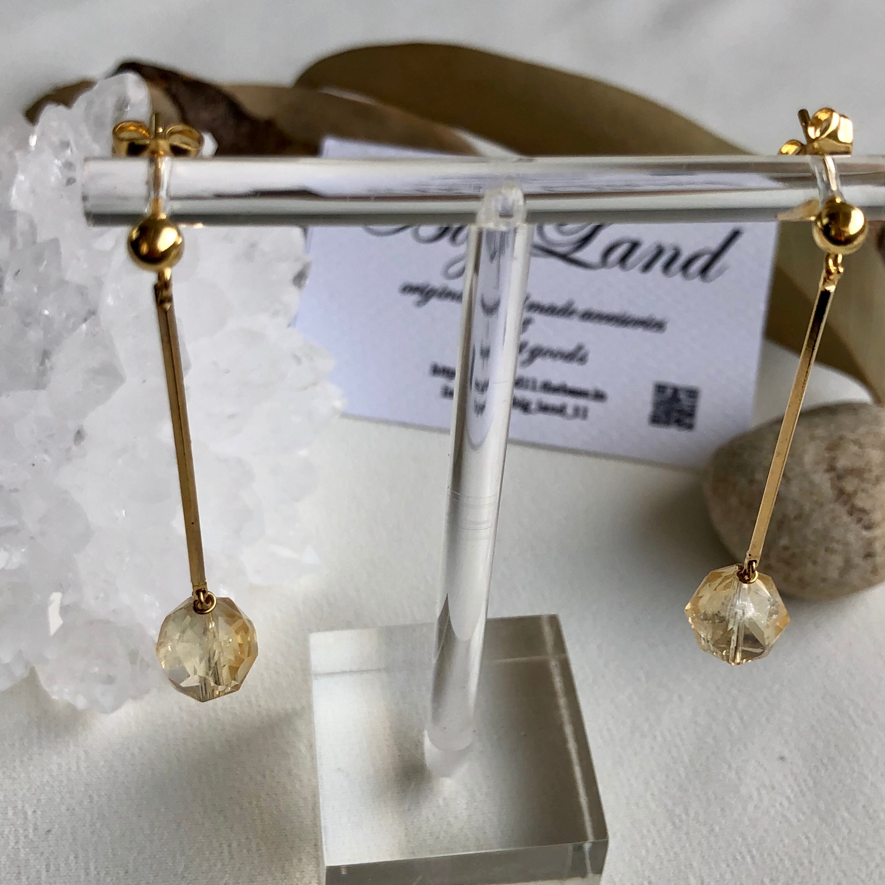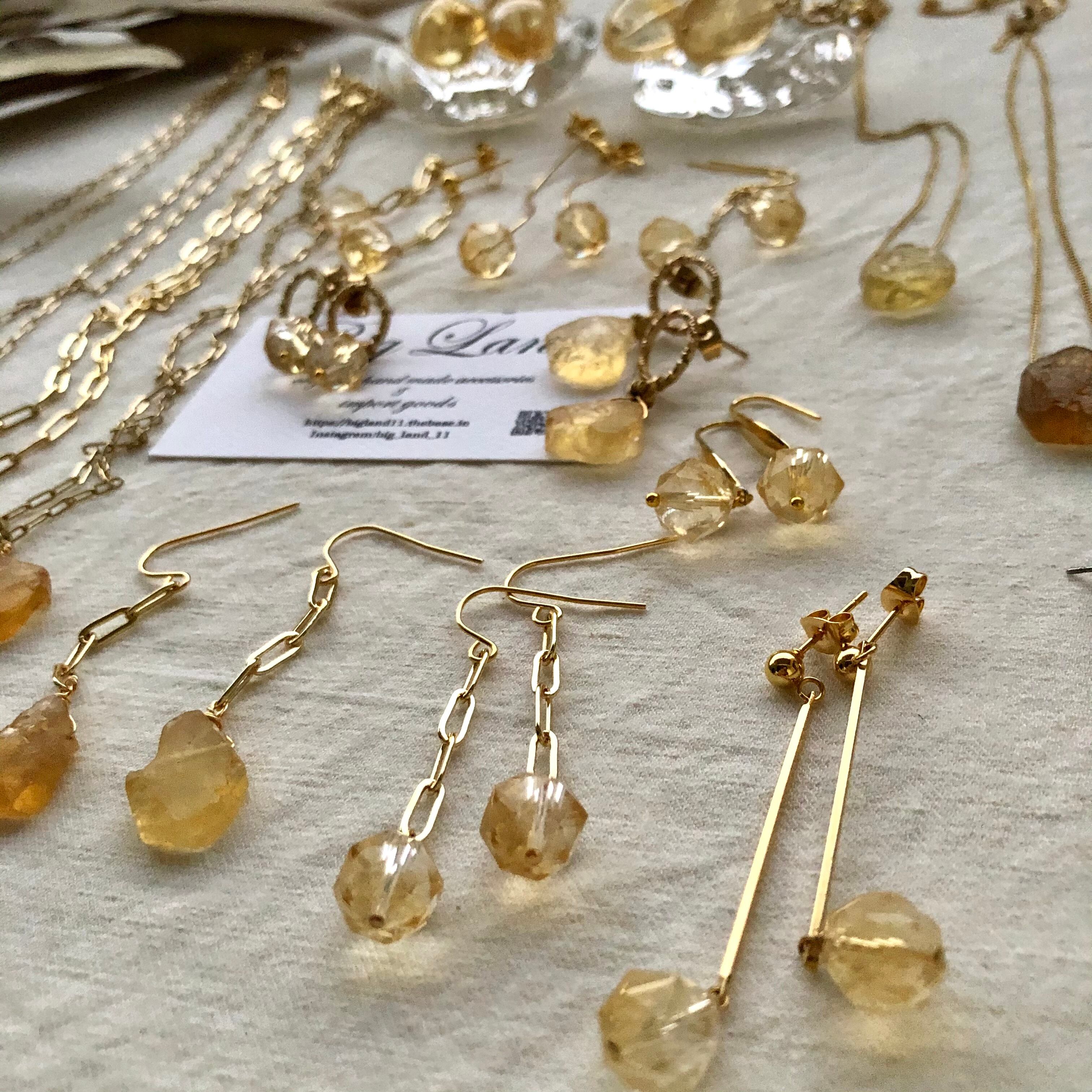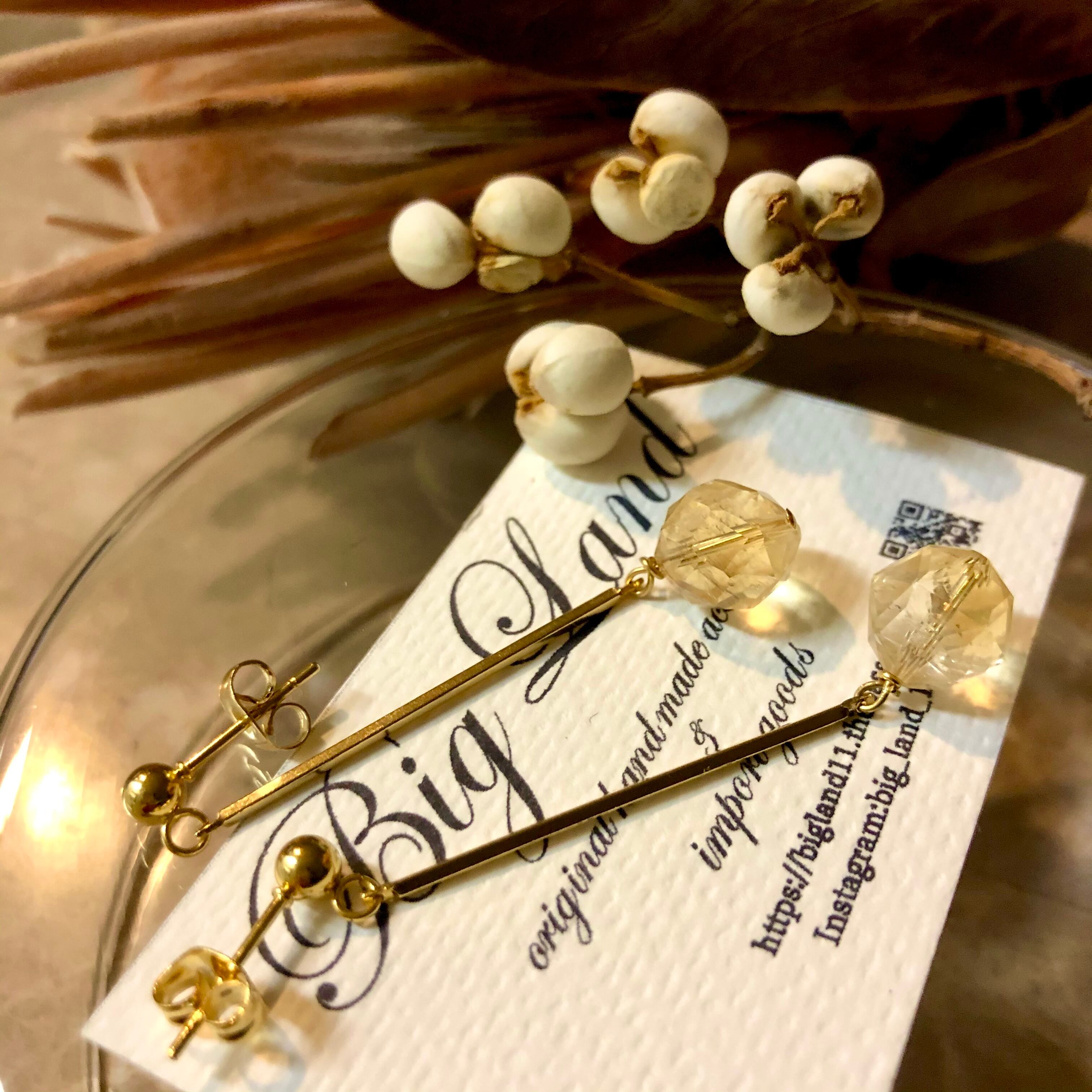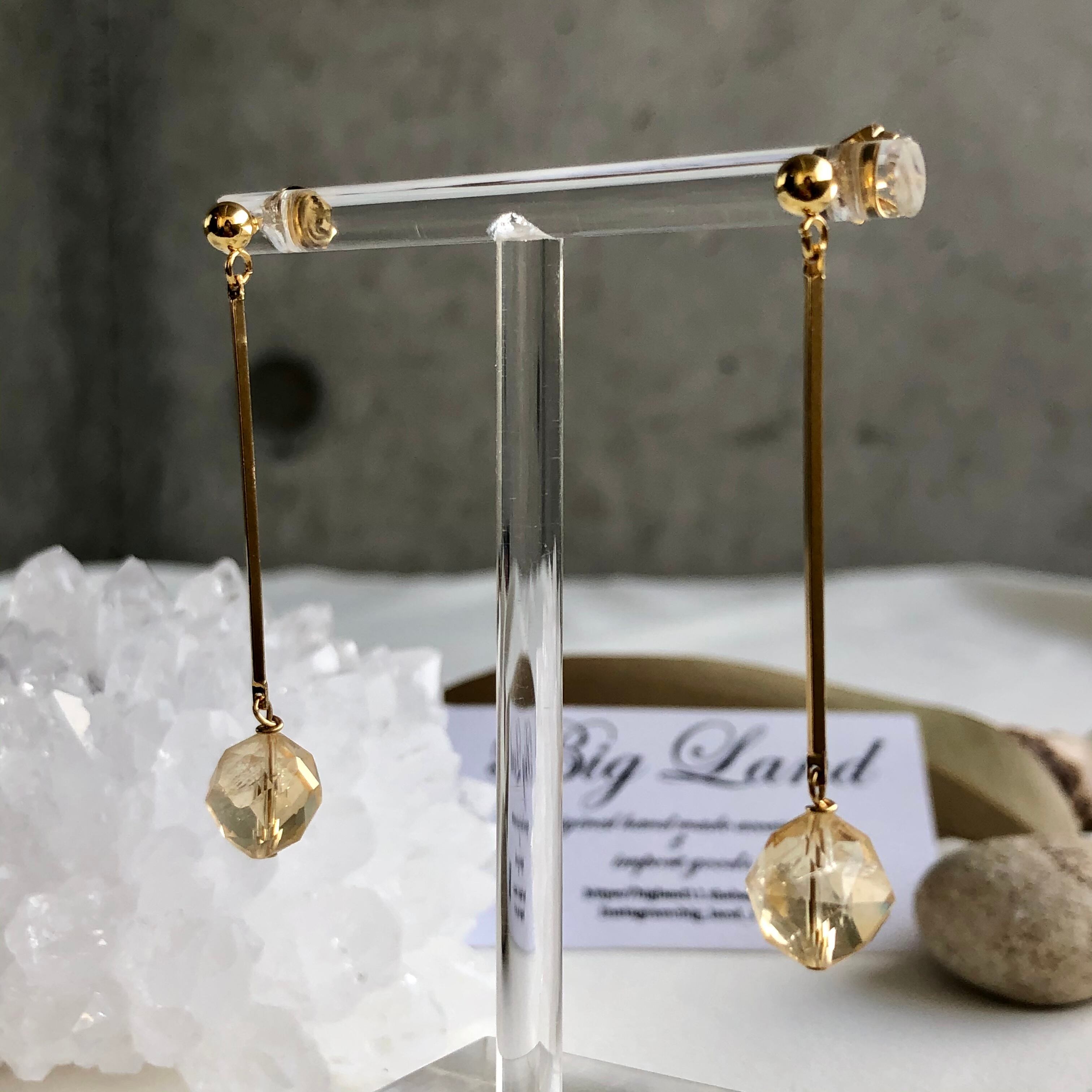 上質カットされた(シトリン)黄色水晶がキラキラ輝き洗練された雰囲気で神秘さと妖艶な美しさ.....縦長にする事により小顔効果があり揺れるモテピアスでこれから沢山着込む季節にもお顔周りに華やかさをもたらします!!