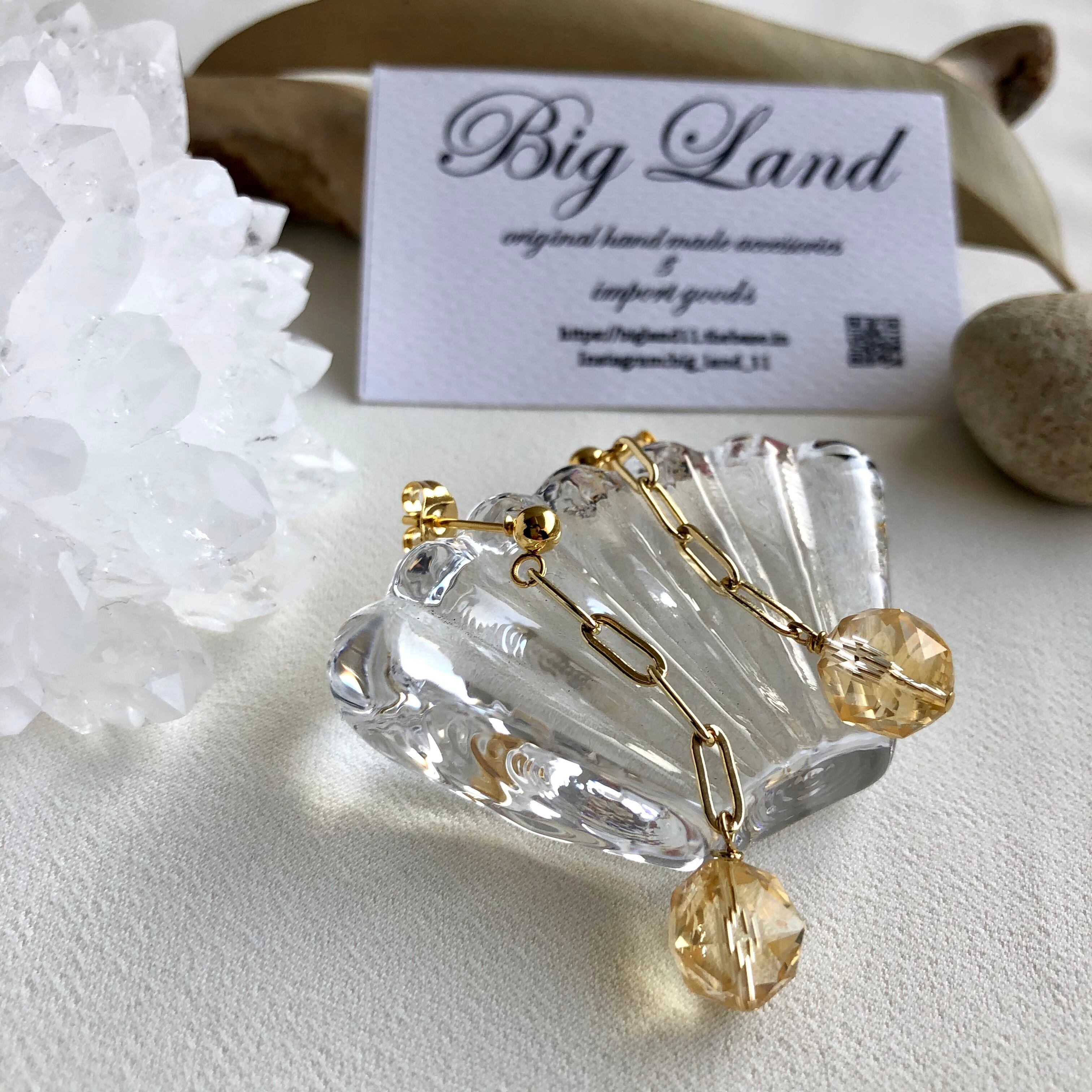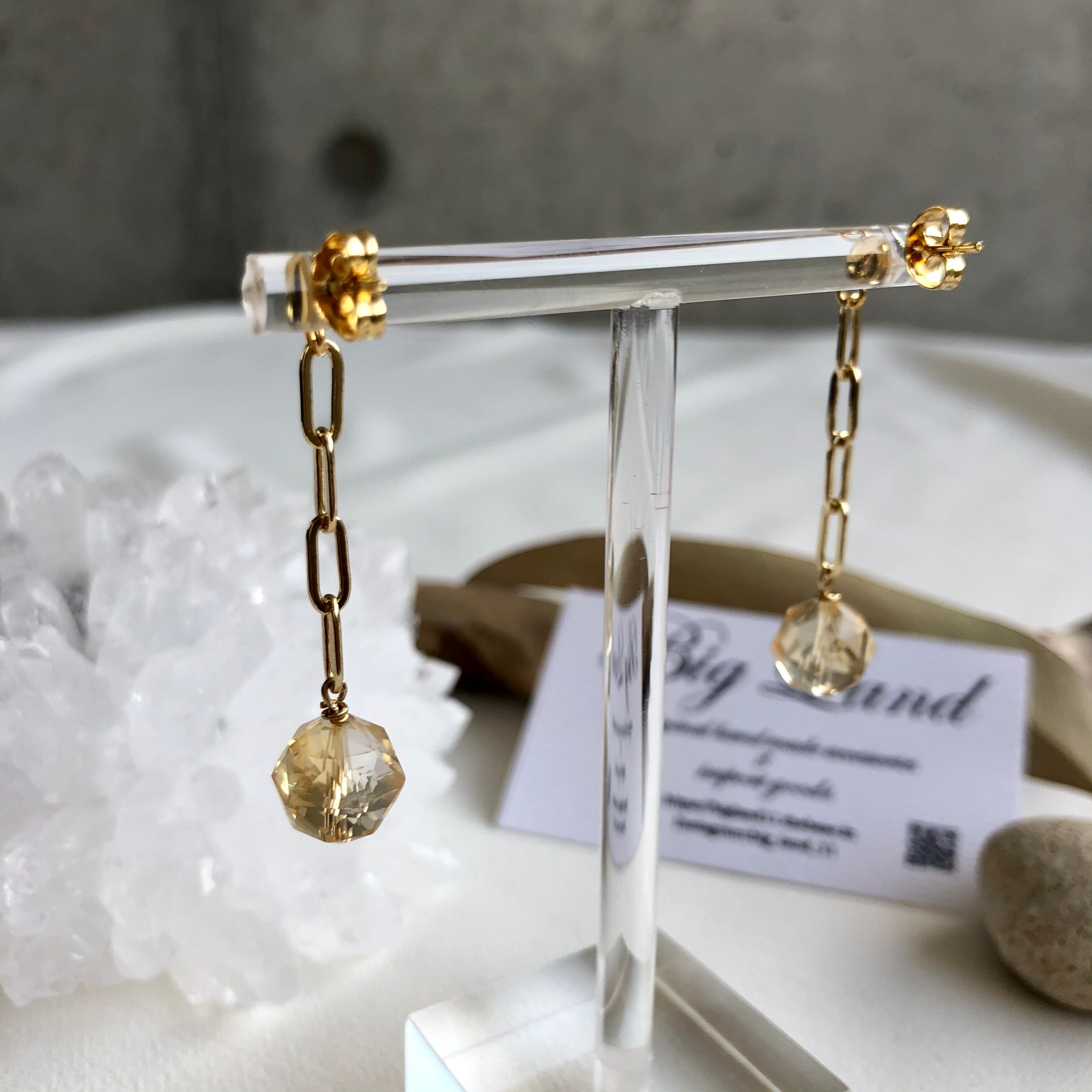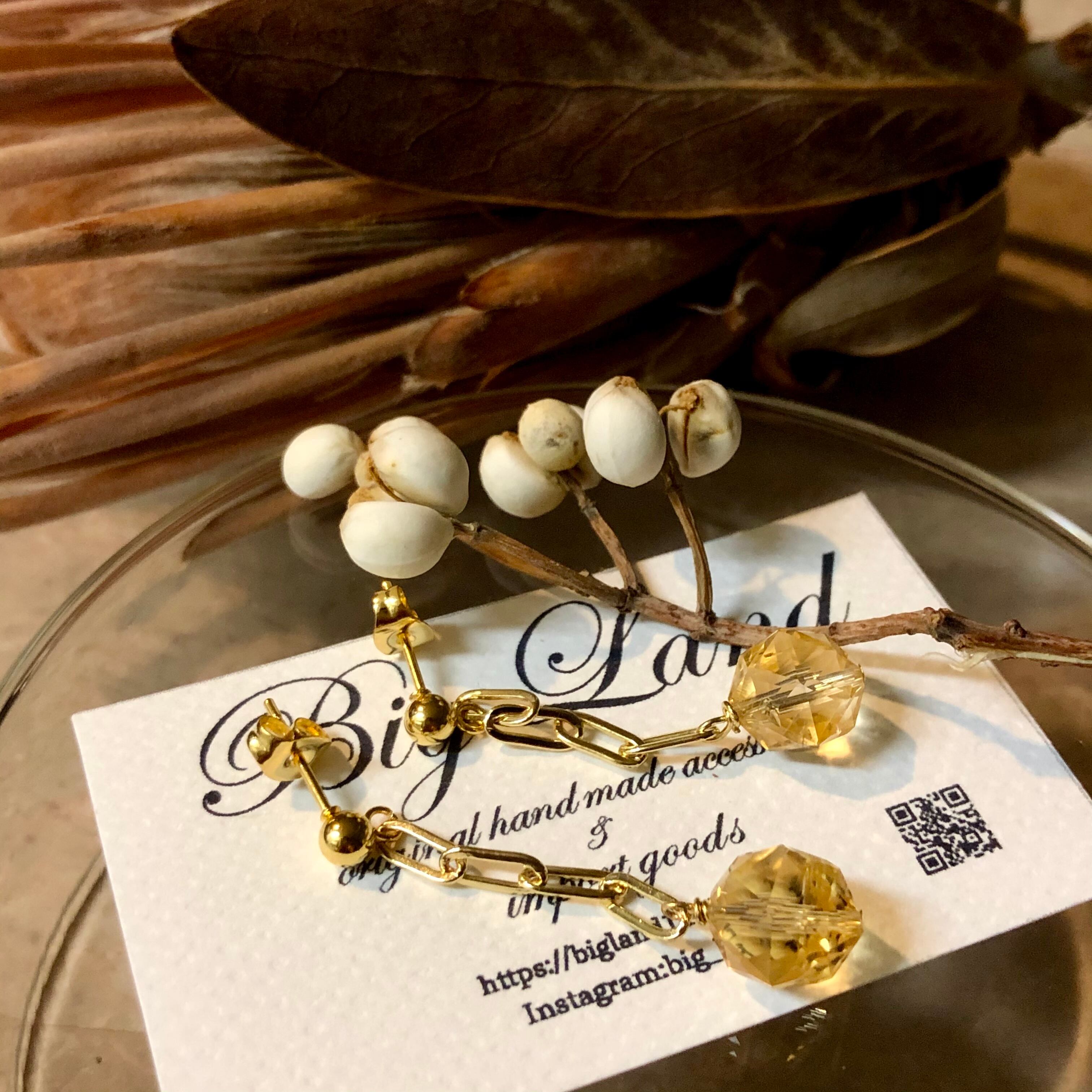 上質カットされた(シトリン)黄色水晶がキラキラ輝き洗練された雰囲気で神秘さと妖艶な美しさ.....縦長にする事により小顔効果があり揺れるモテピアスでこれから沢山着込む季節にもお顔周りに華やかさをもたらします!!