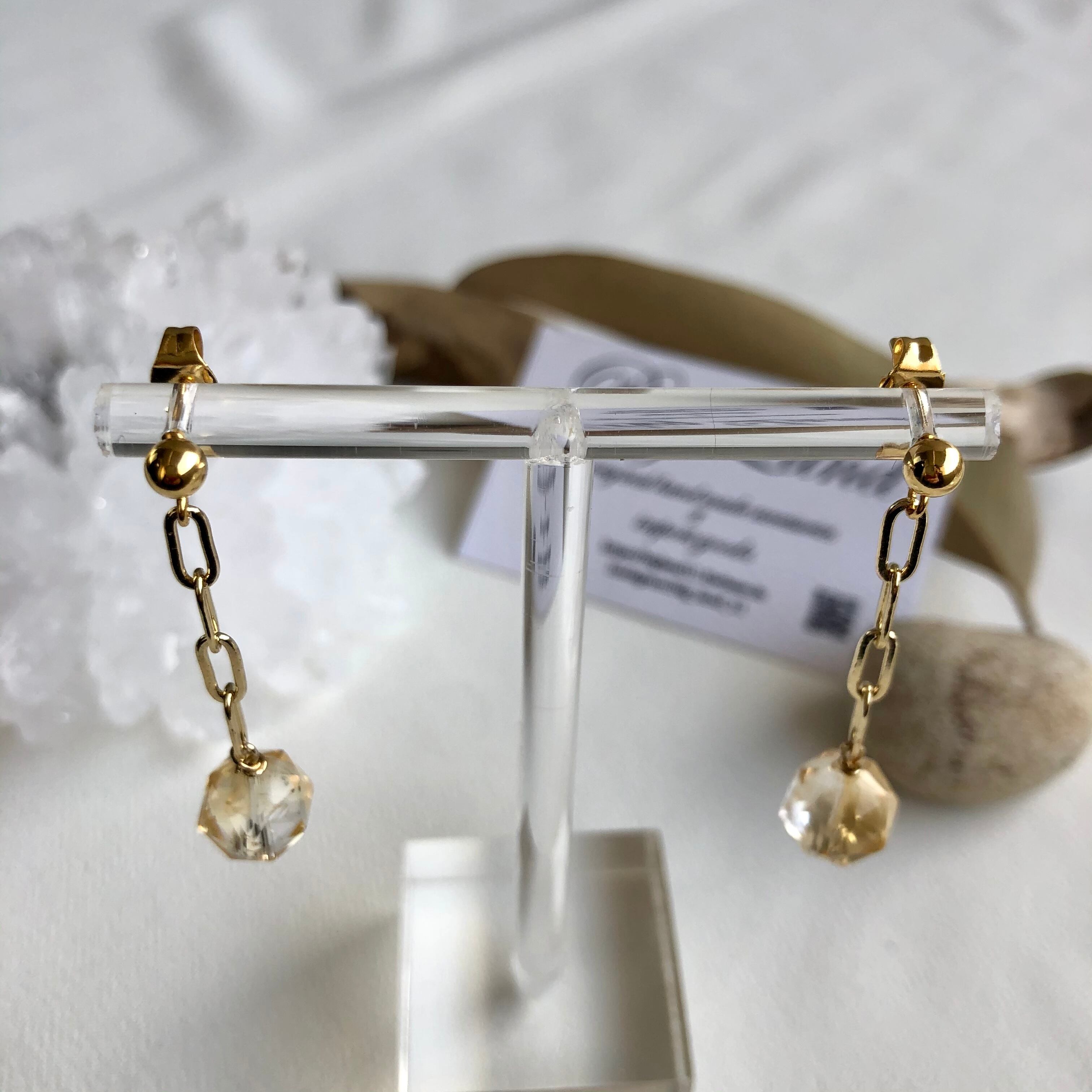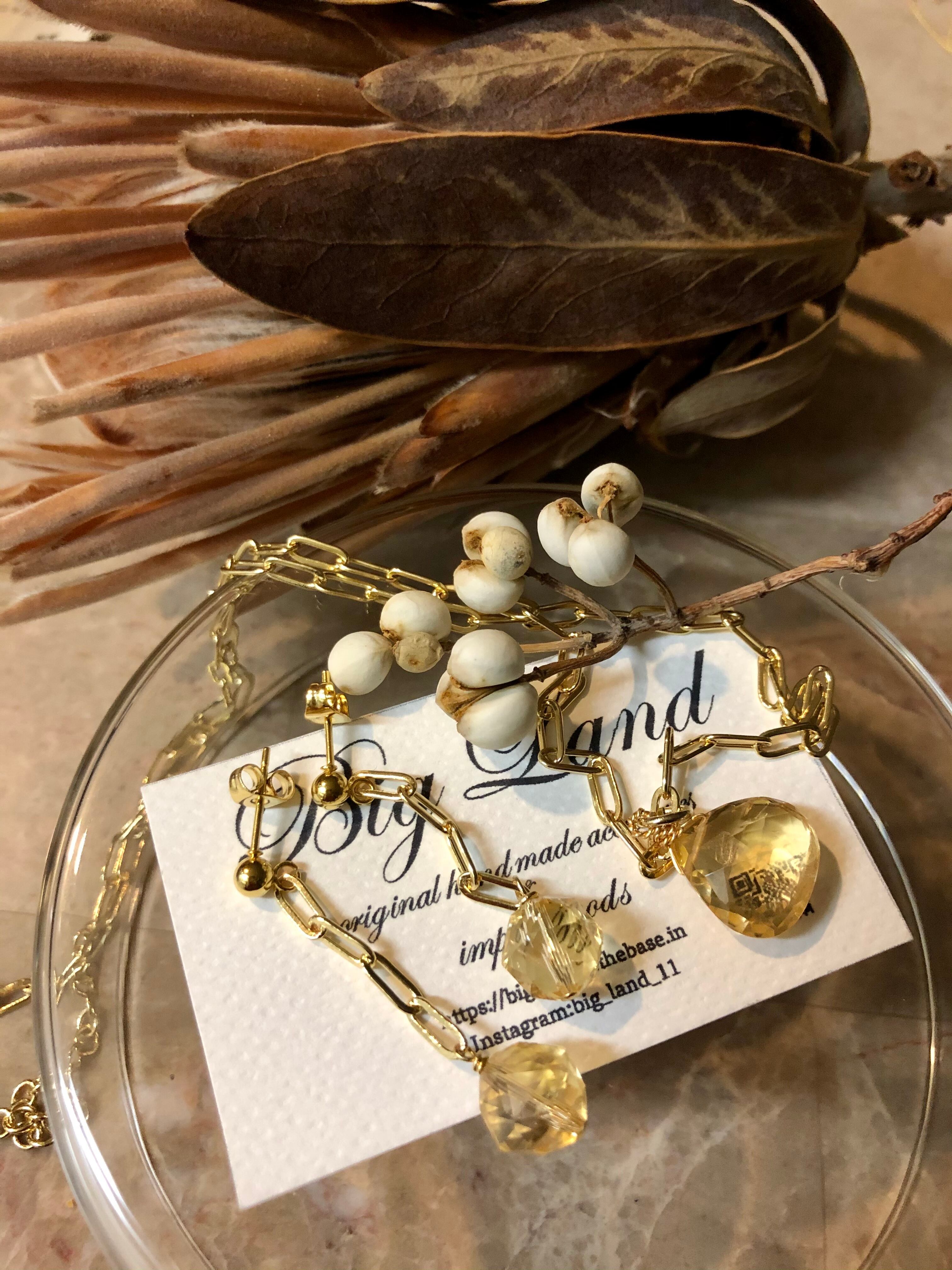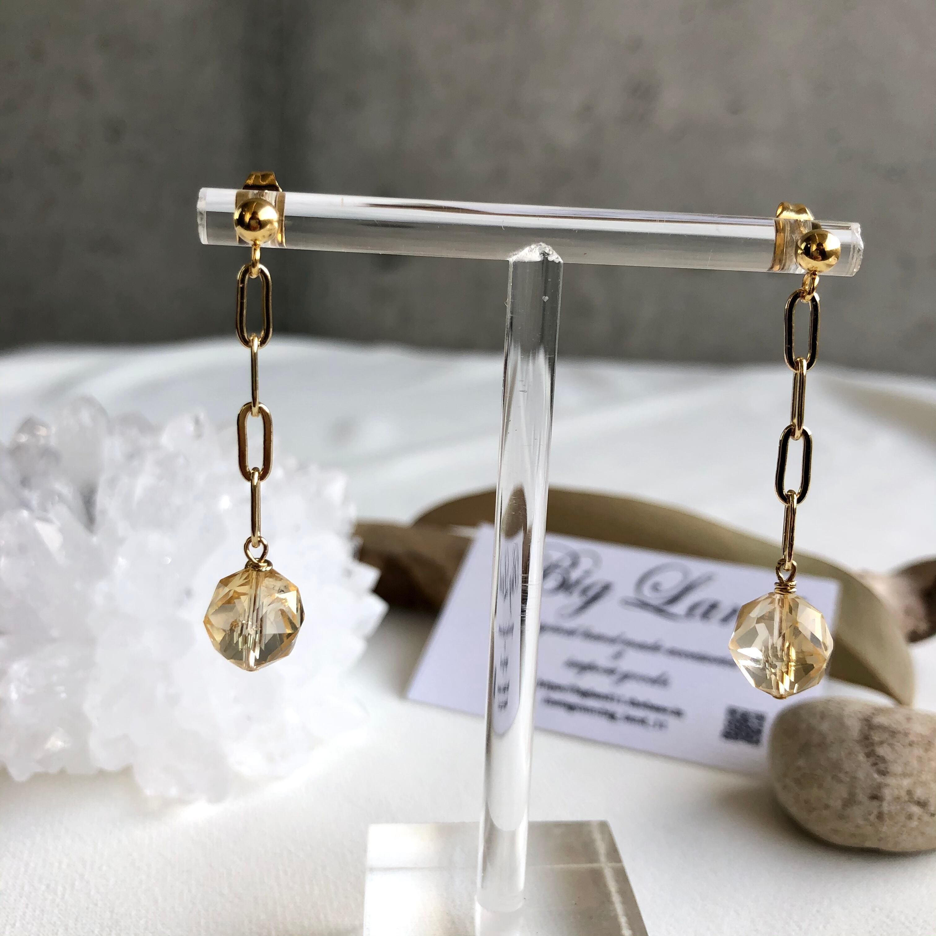 上質カットされた(シトリン)黄色水晶がキラキラ輝き洗練された雰囲気で神秘さと妖艶な美しさ.....縦長にする事により小顔効果があり揺れるモテピアスでこれから沢山着込む季節にもお顔周りに華やかさをもたらします!!