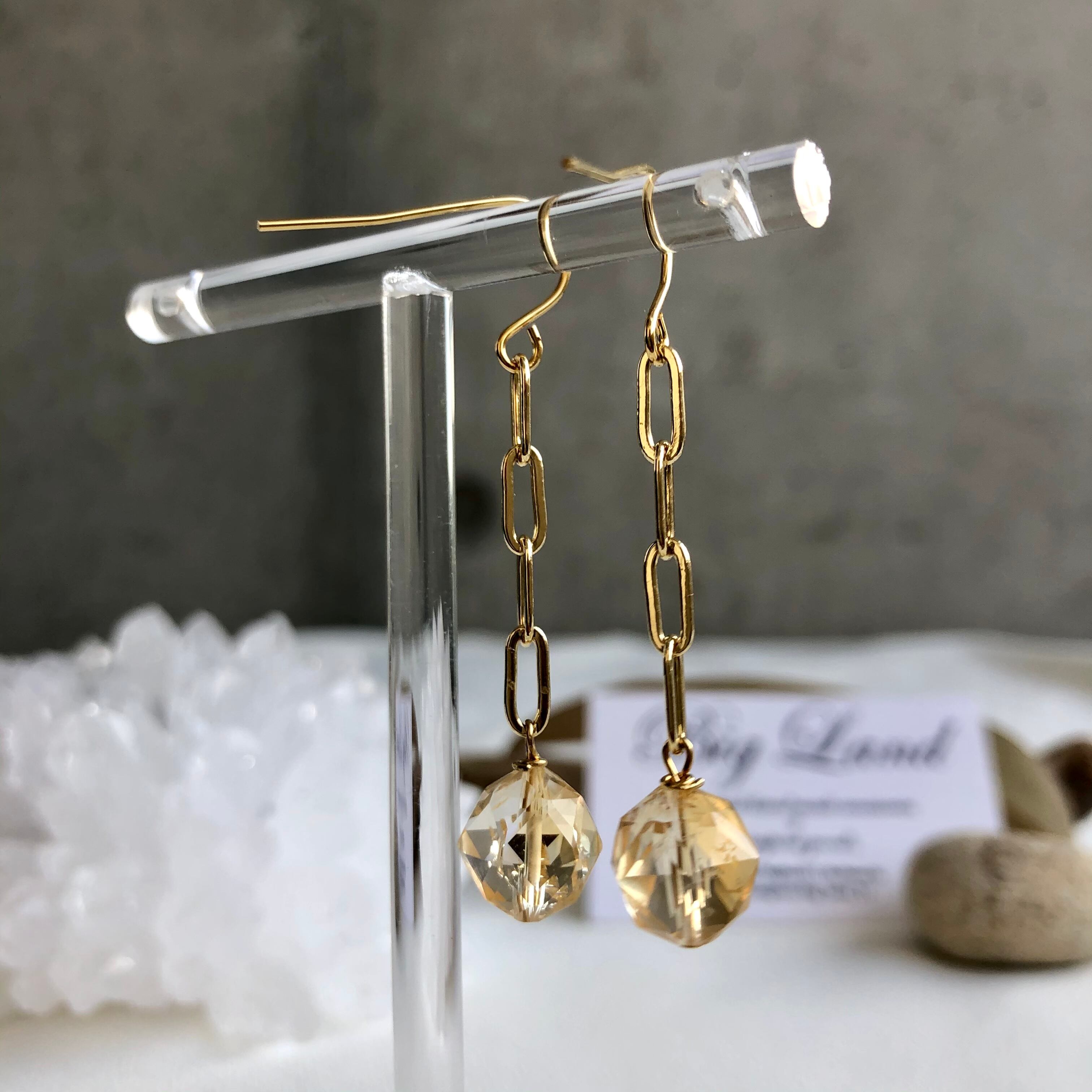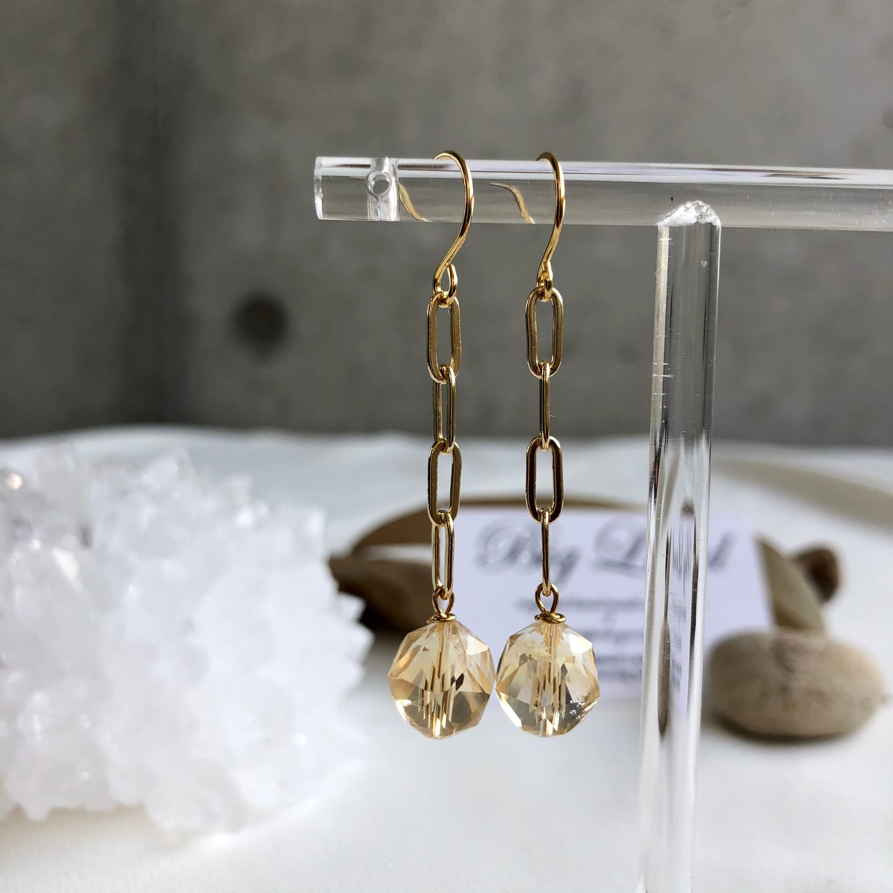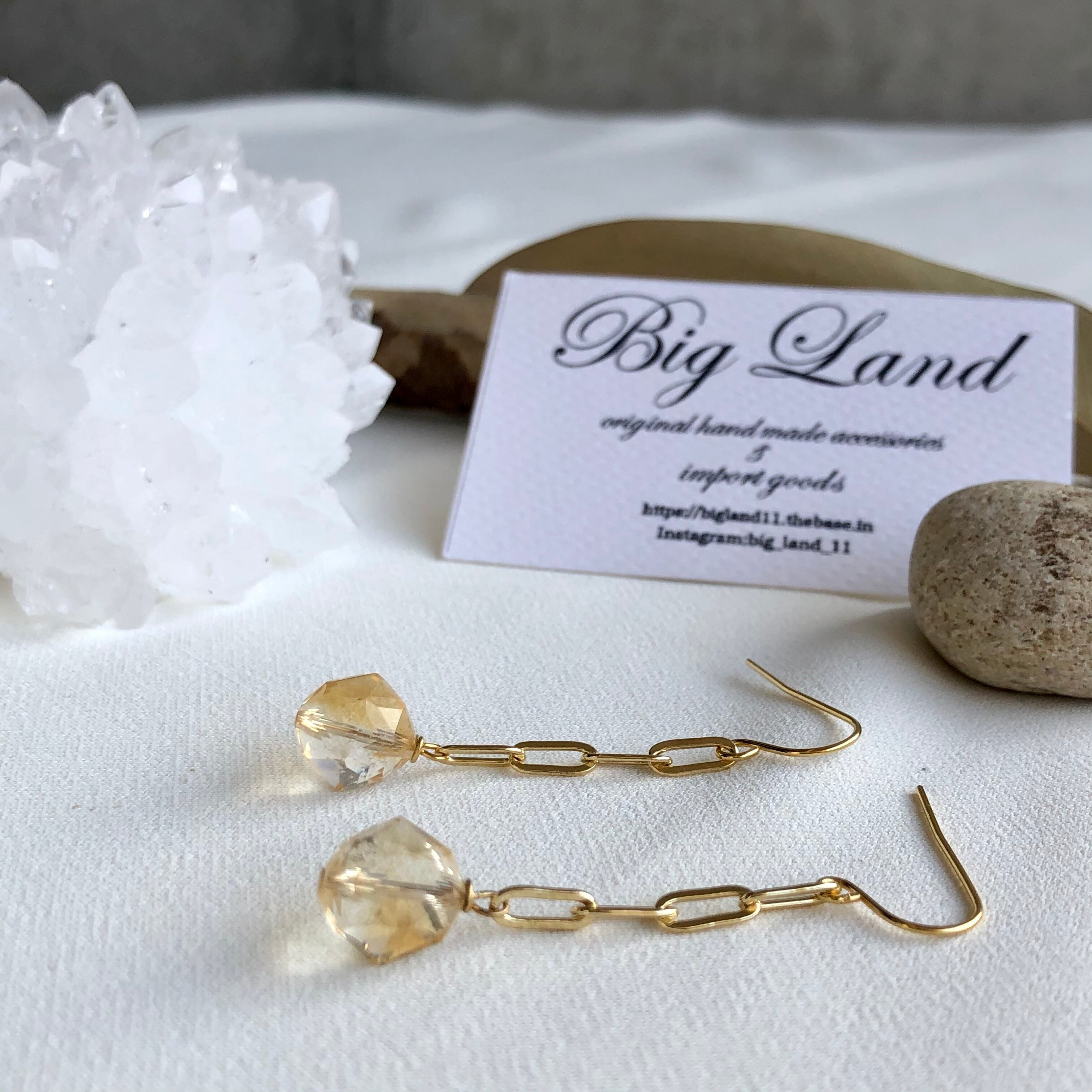 上質カットされた(シトリン)黄色水晶がキラキラ輝き洗練された雰囲気で神秘さと妖艶な美しさ.....縦長にする事により小顔効果があり揺れるモテピアスでこれから沢山着込む季節にもお顔周りに華やかさをもたらします!!
