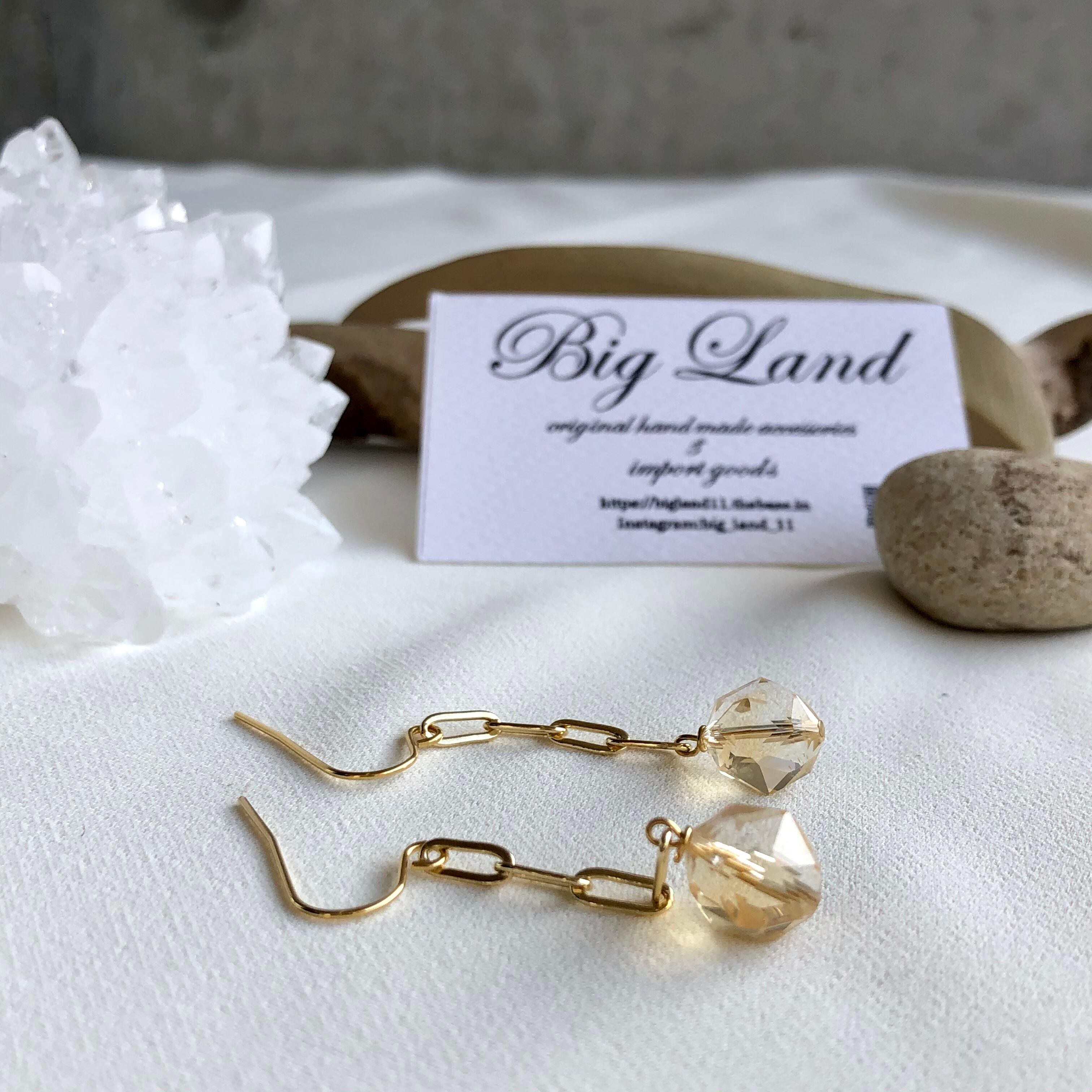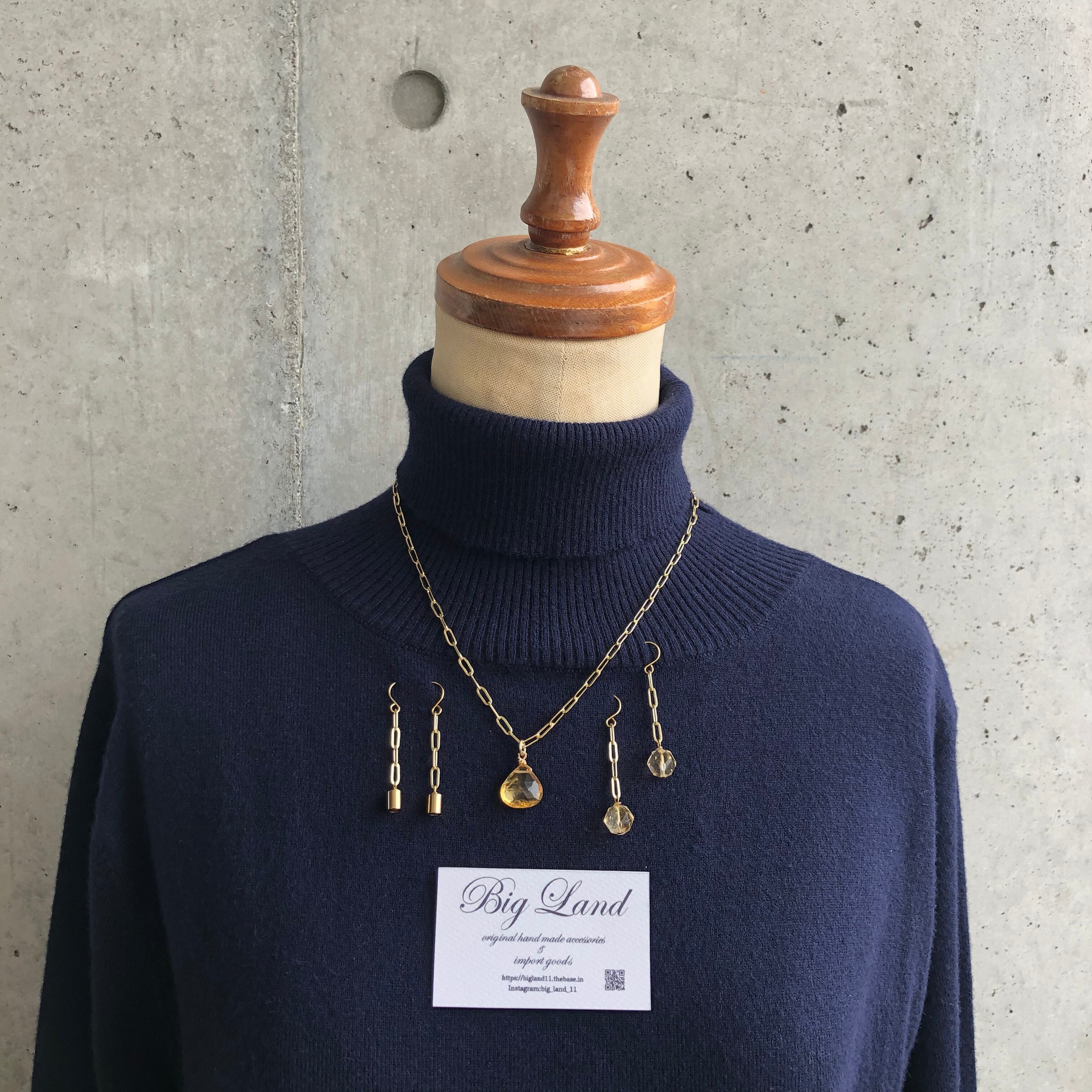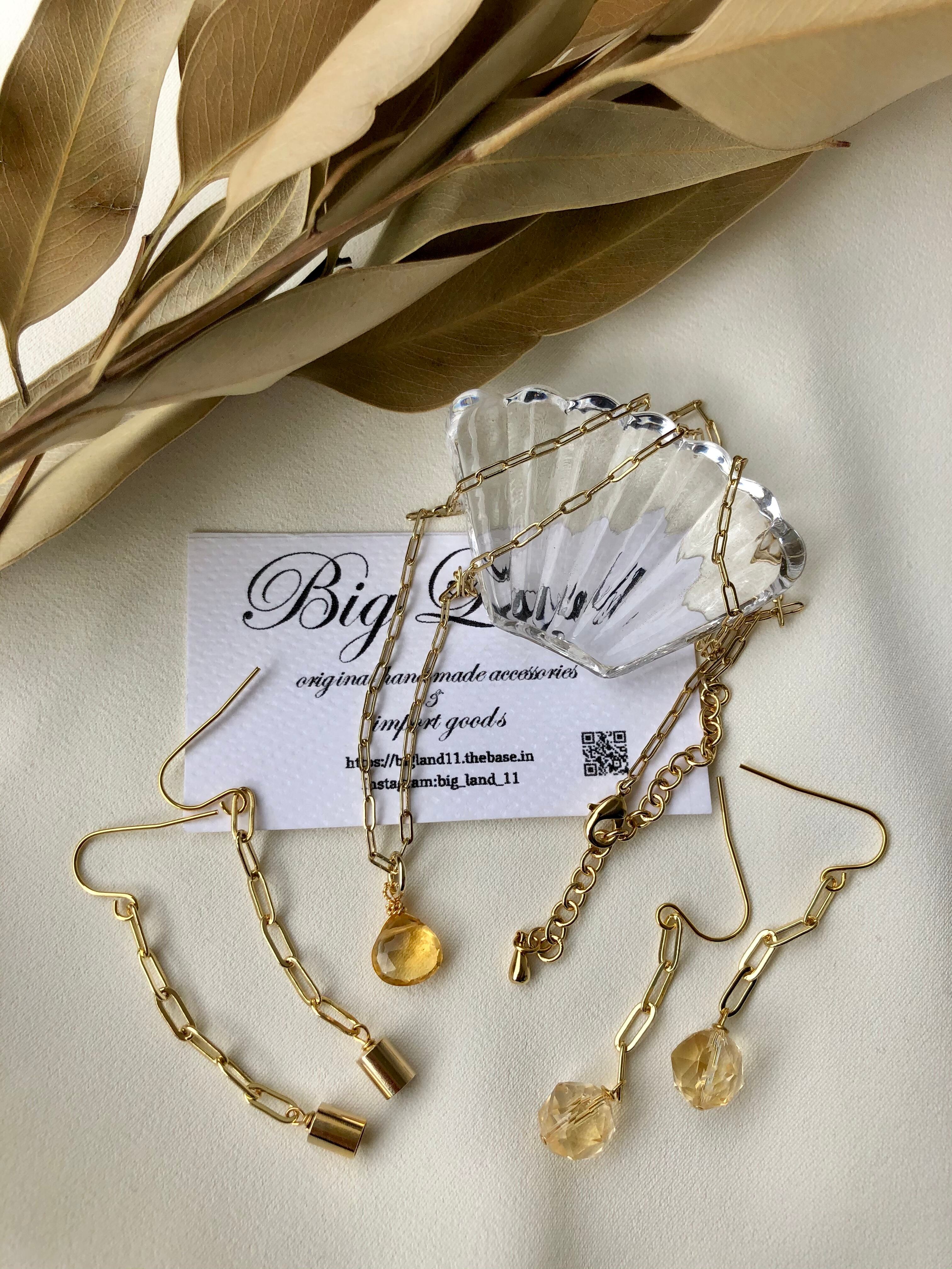 上質カットされた(シトリン)黄色水晶がキラキラ輝き洗練された雰囲気で神秘さと妖艶な美しさ.....縦長にする事により小顔効果があり揺れるモテピアスでこれから沢山着込む季節にもお顔周りに華やかさをもたらします!!