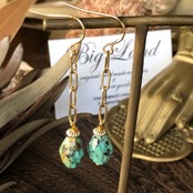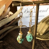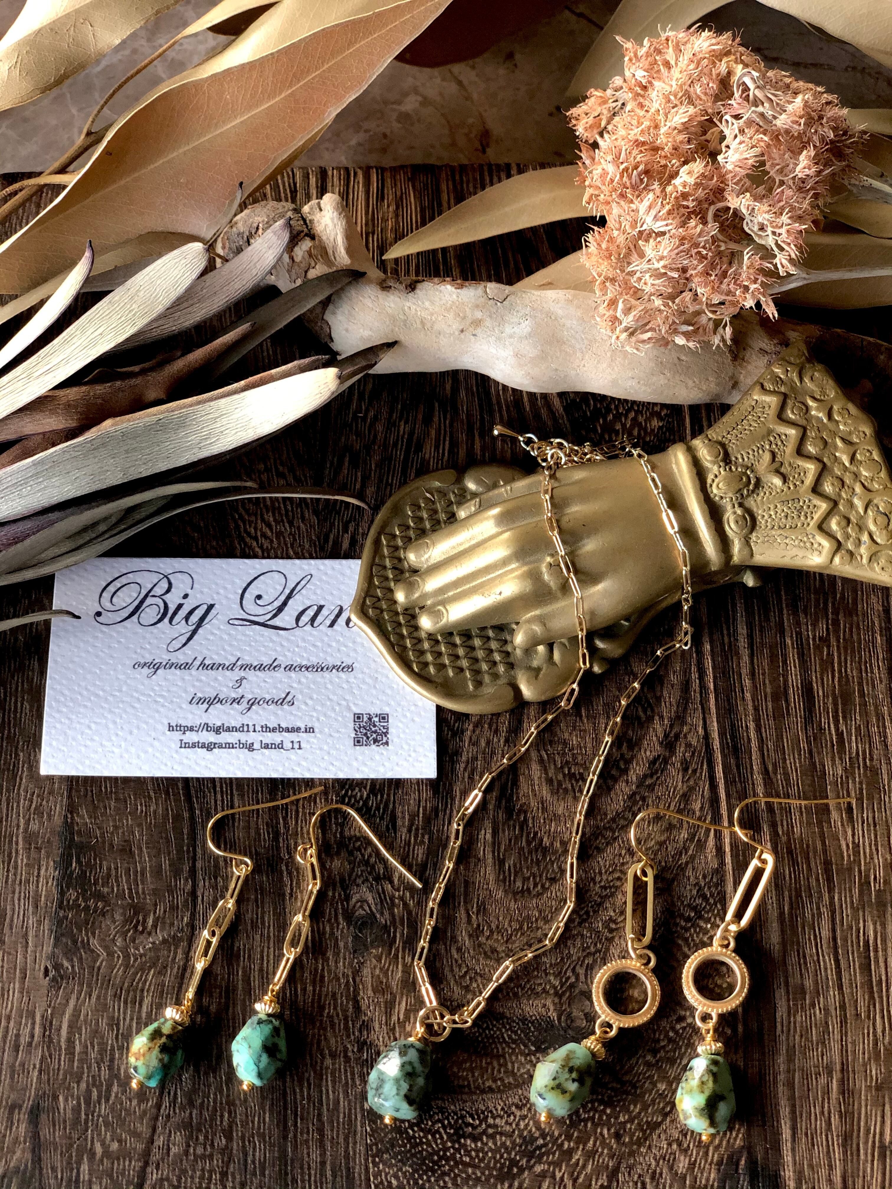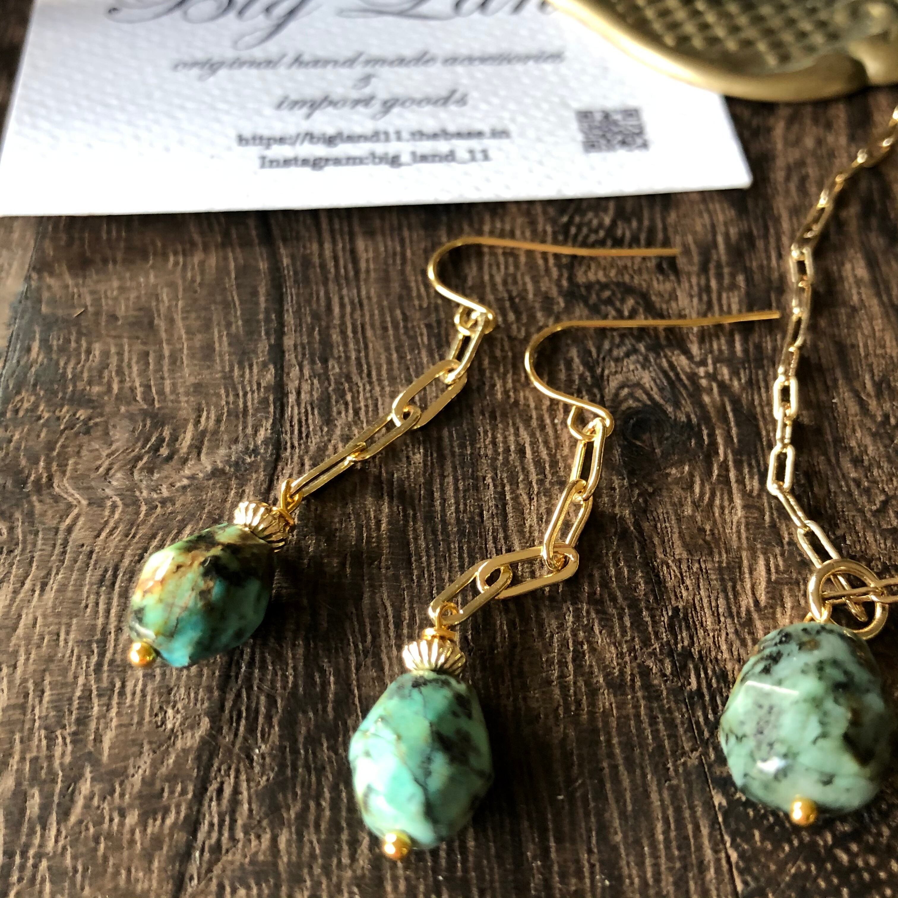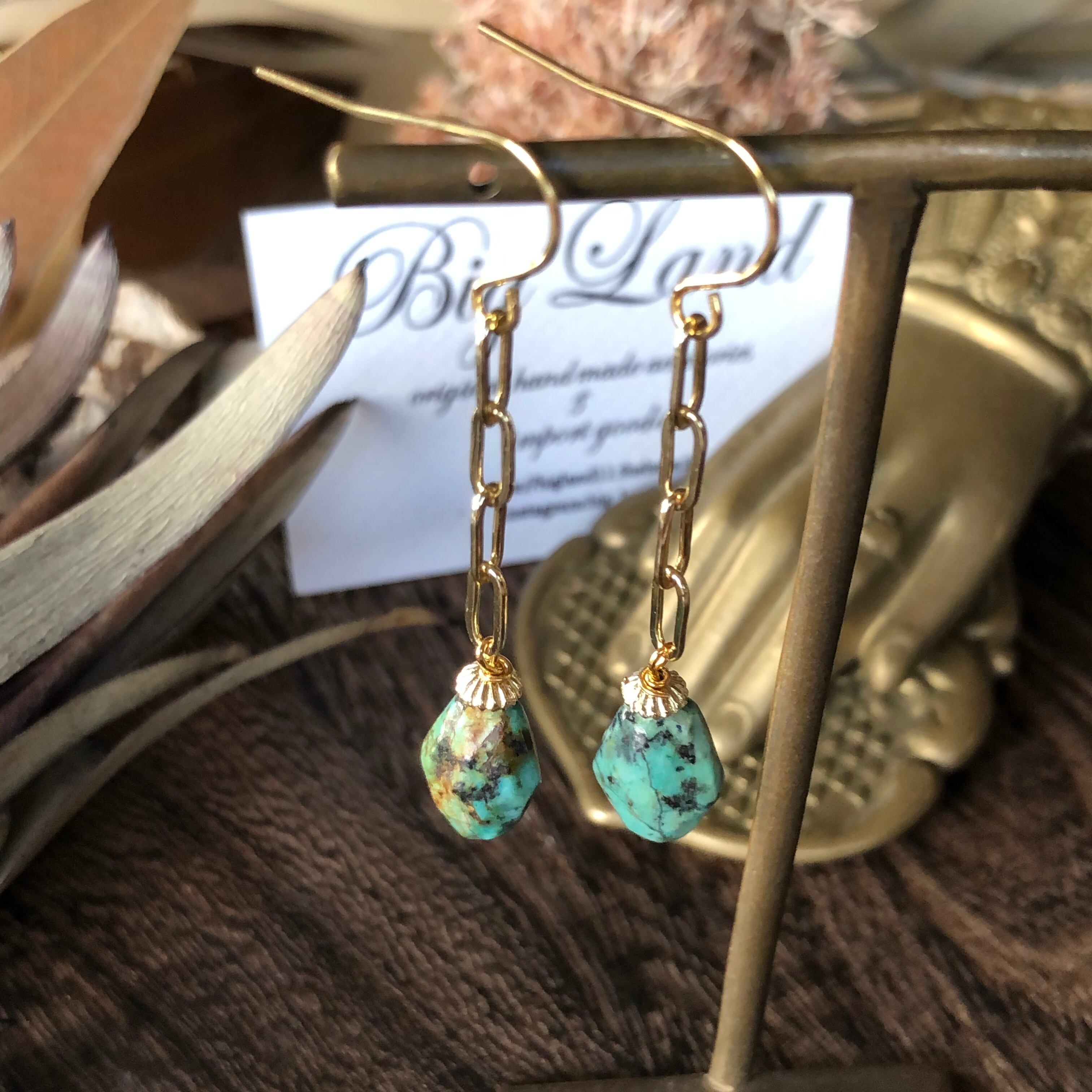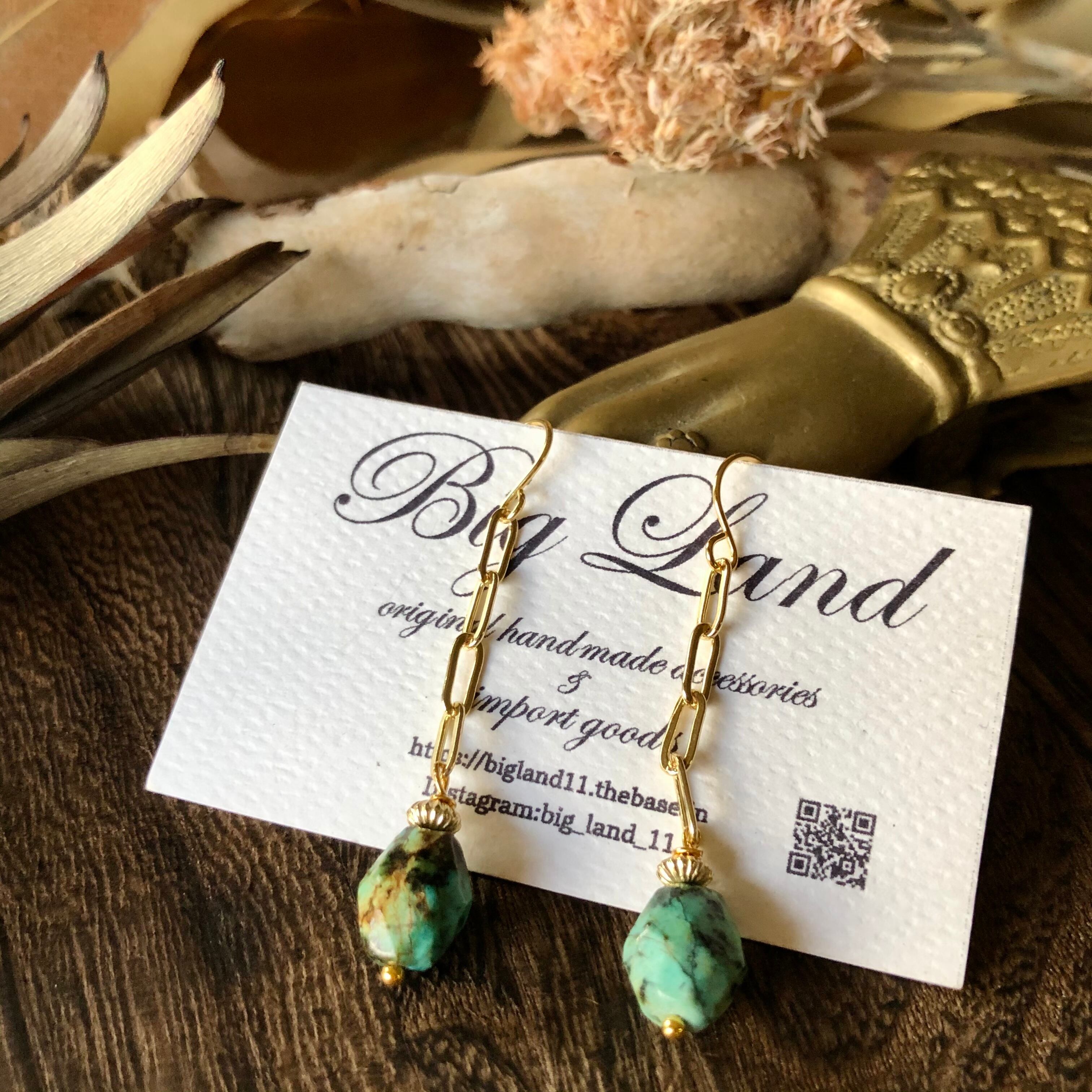 多面カットされたターコイズとトレンドのスクエアチェーンと組み合わせ上品さと華やかさがあり縦長にする事により小顔効果があり揺れるモテピアスでこれから沢山着込む季節にもお顔周りに華やかさをもたらします!!