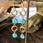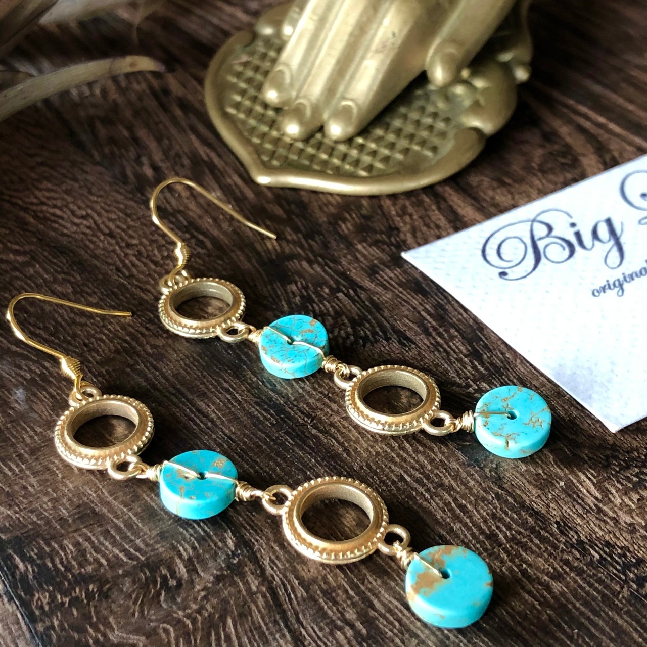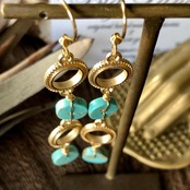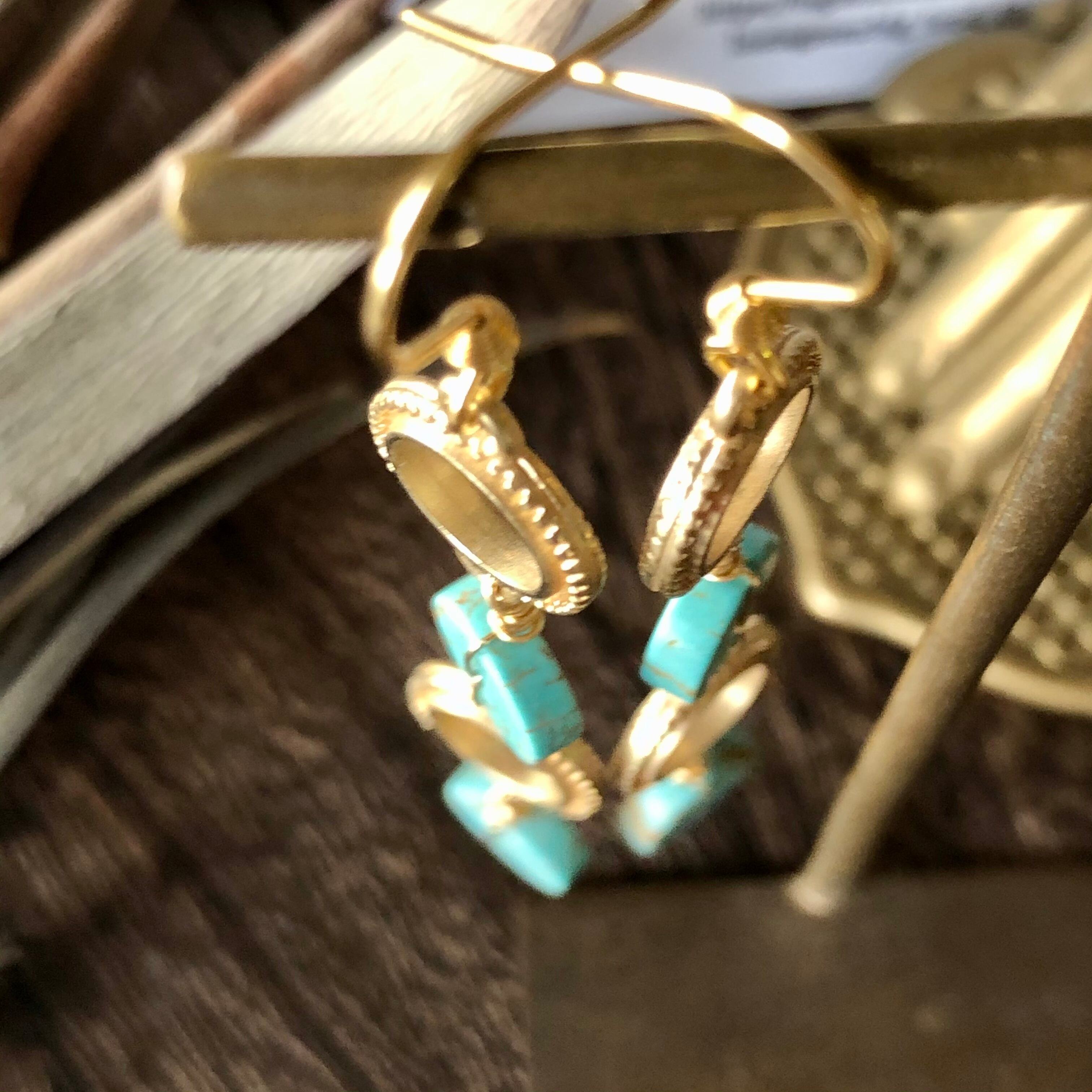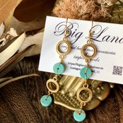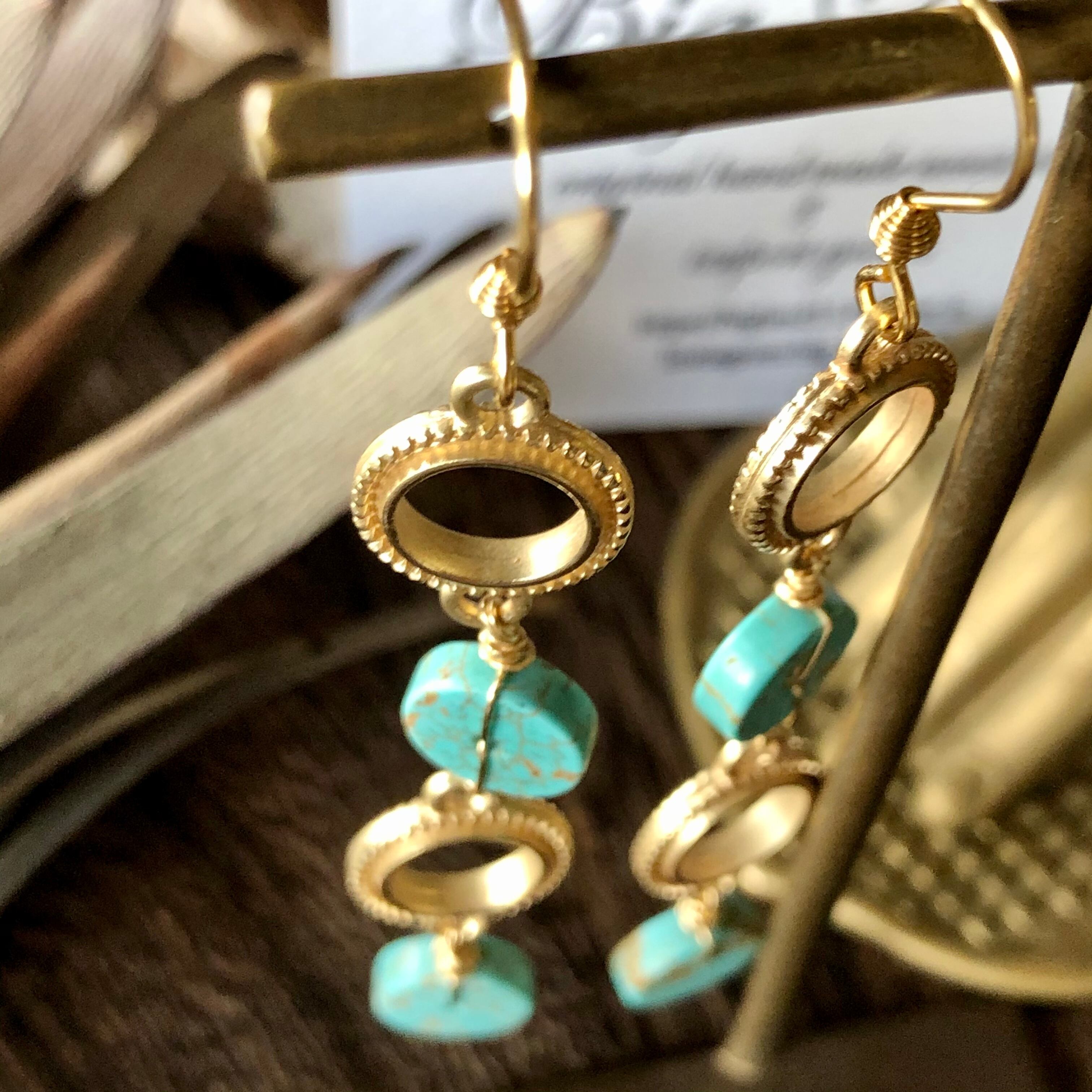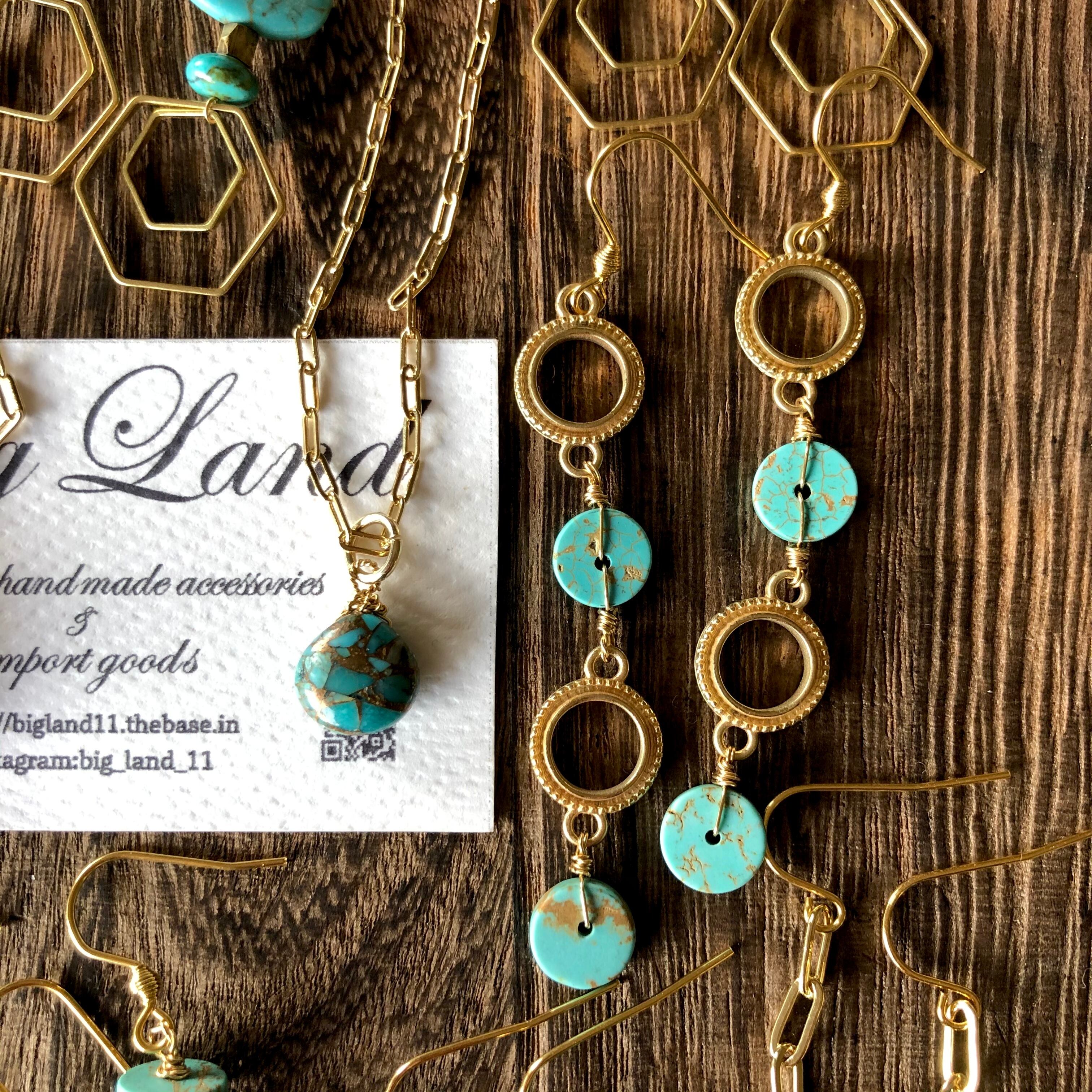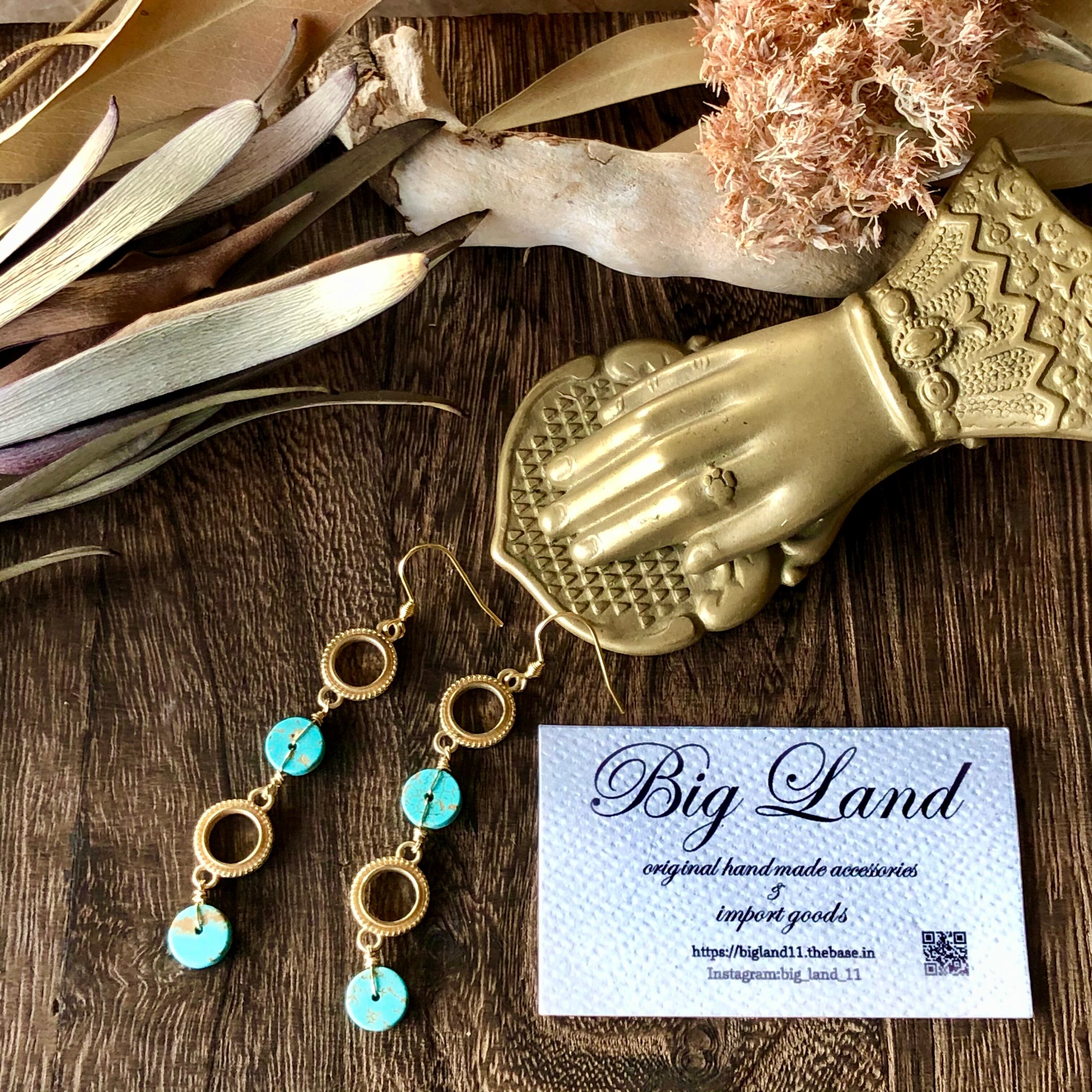 ターコイズと真鍮と組み合わせオリエンタルで華やかさがあり縦長にする事により小顔効果があり揺れるモテピアスでこれから沢山着込む季節にもお顔周りに華やかさをもたらします!!