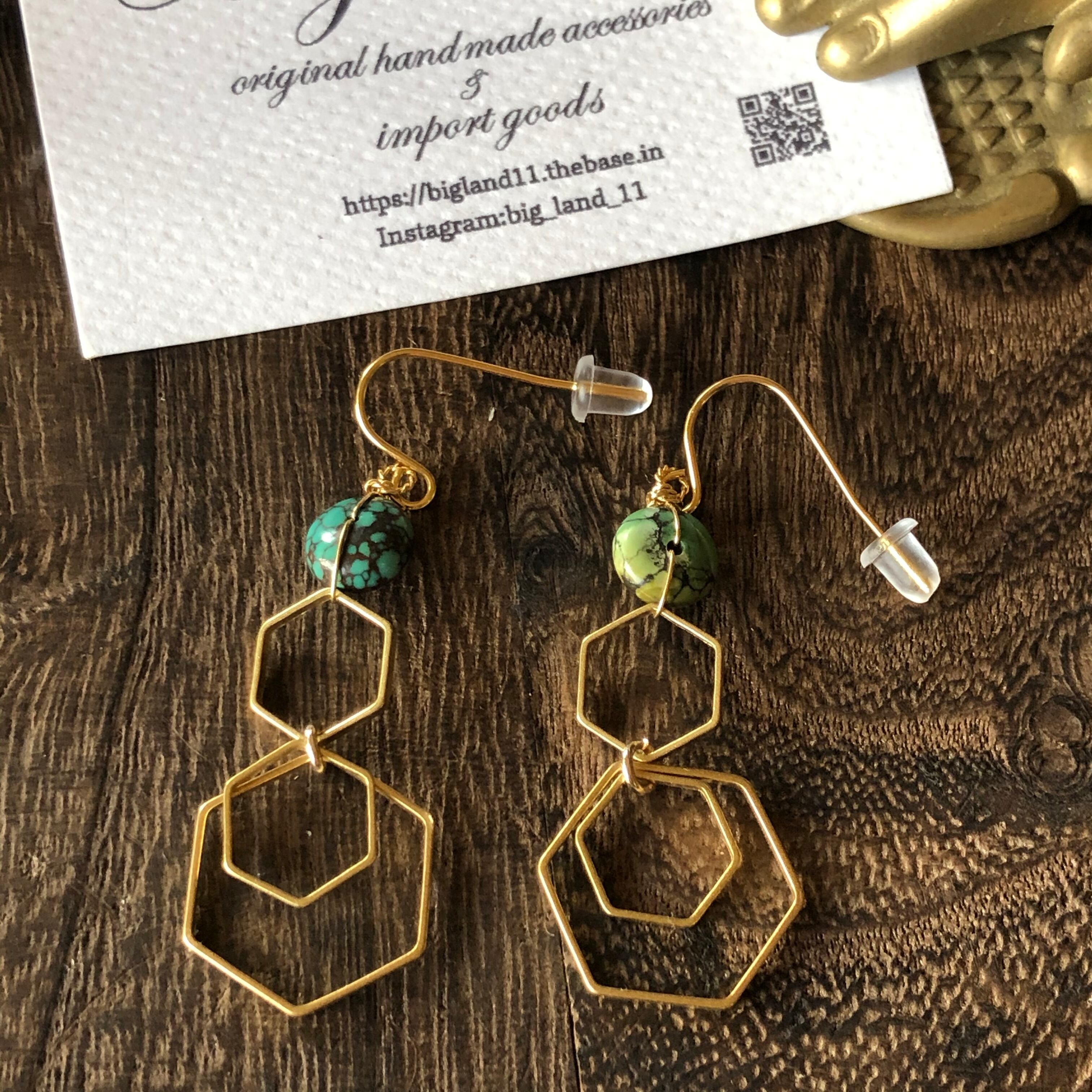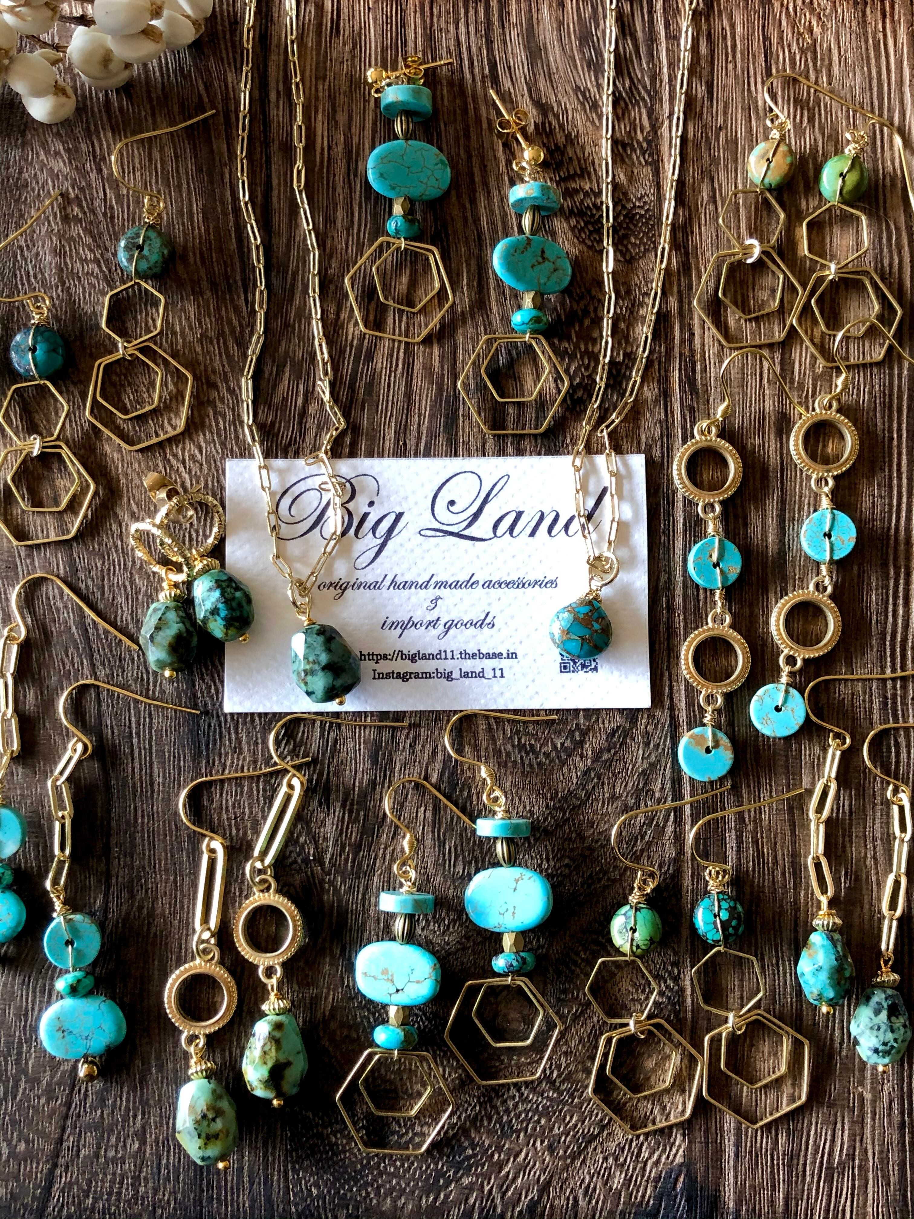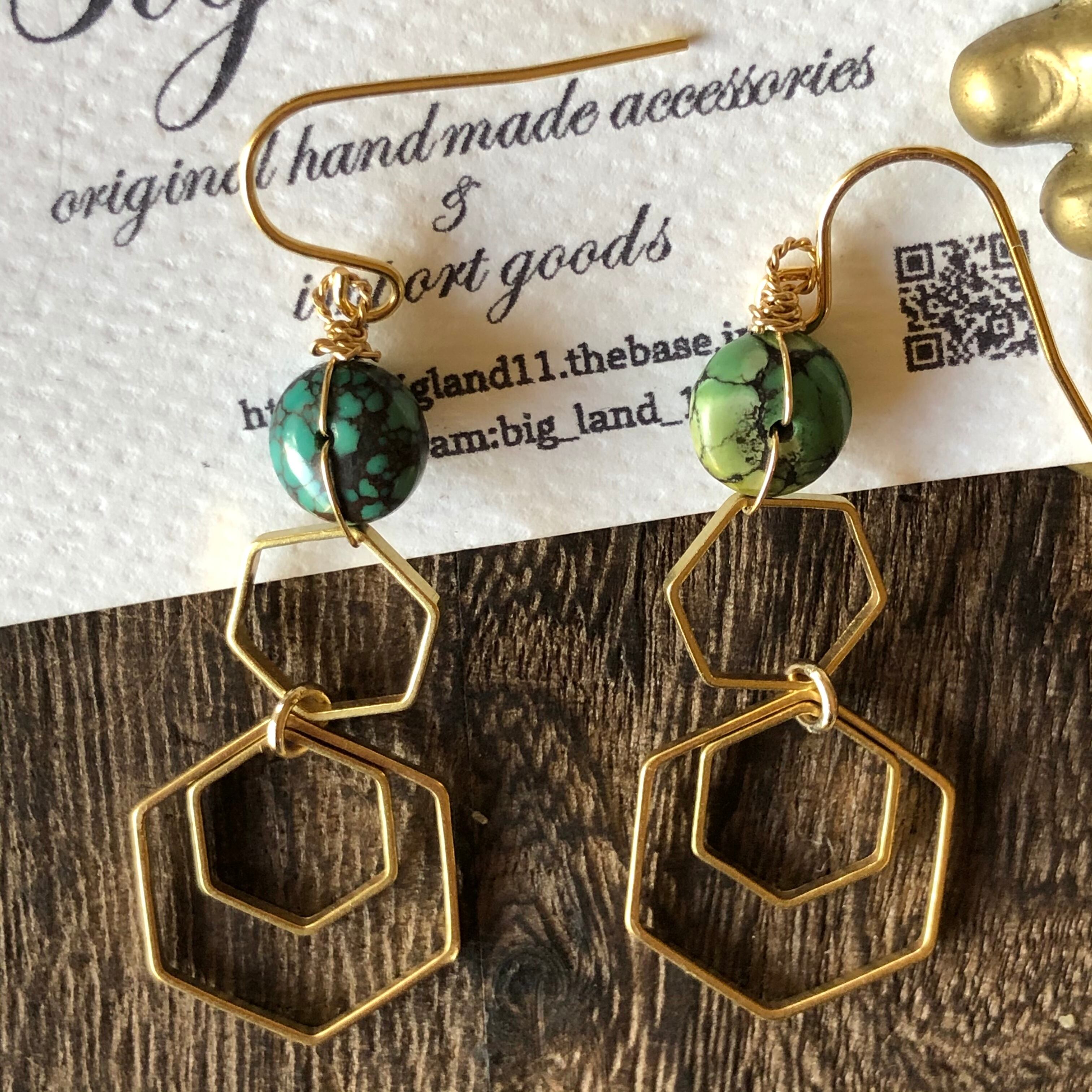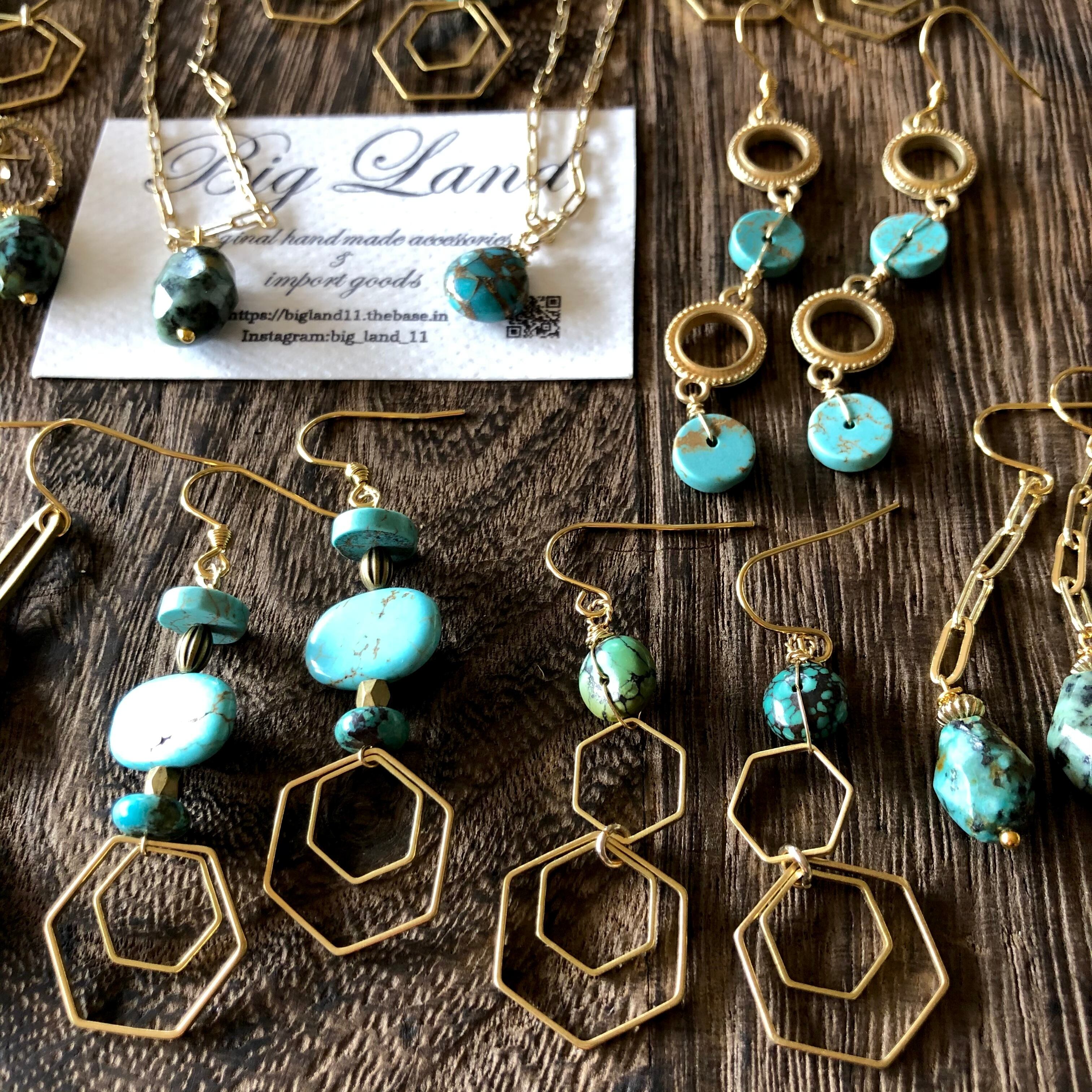 ターコイズと六角真鍮との組み合わせがなんとも洗練されたデザインに仕上がり私も愛用中‼️意外とどんなお洋服にも合わせ易く綺麗めの中に個性的で遊び心があり縦長にする事により小顔効果があり揺れるモテピアスでこれから沢山着込む季節にもお顔周りに華やかさをもたらします!!