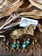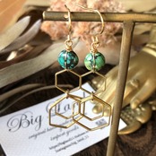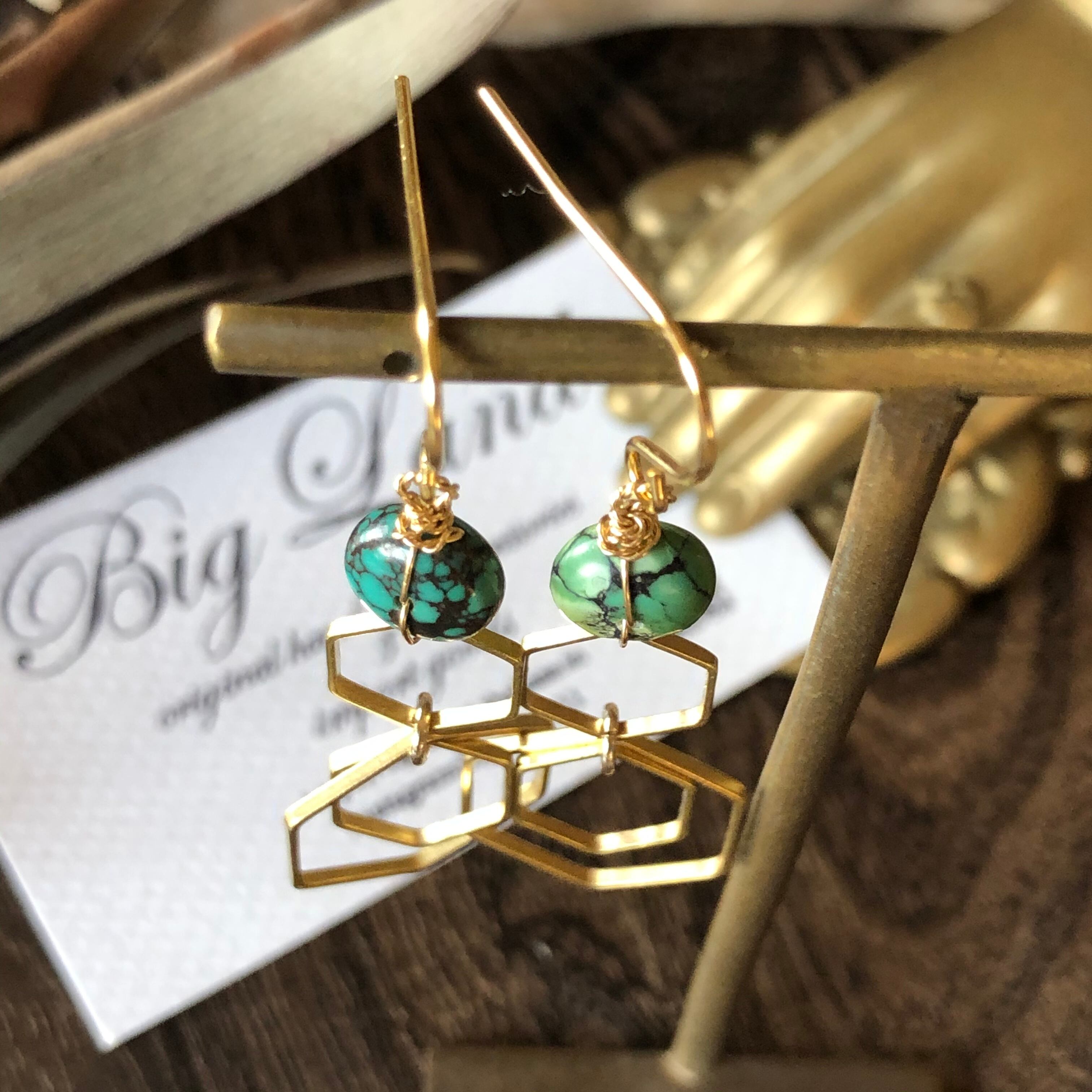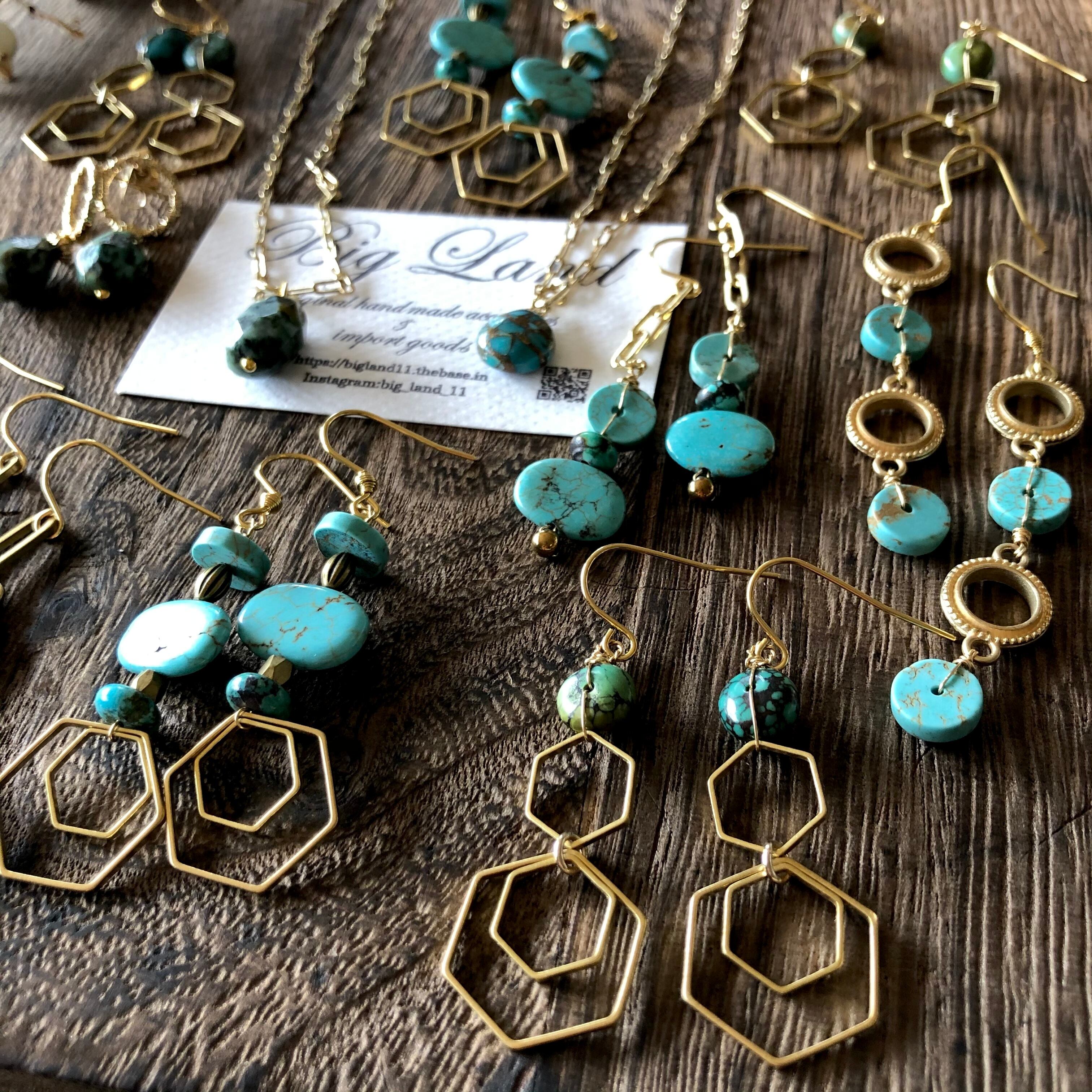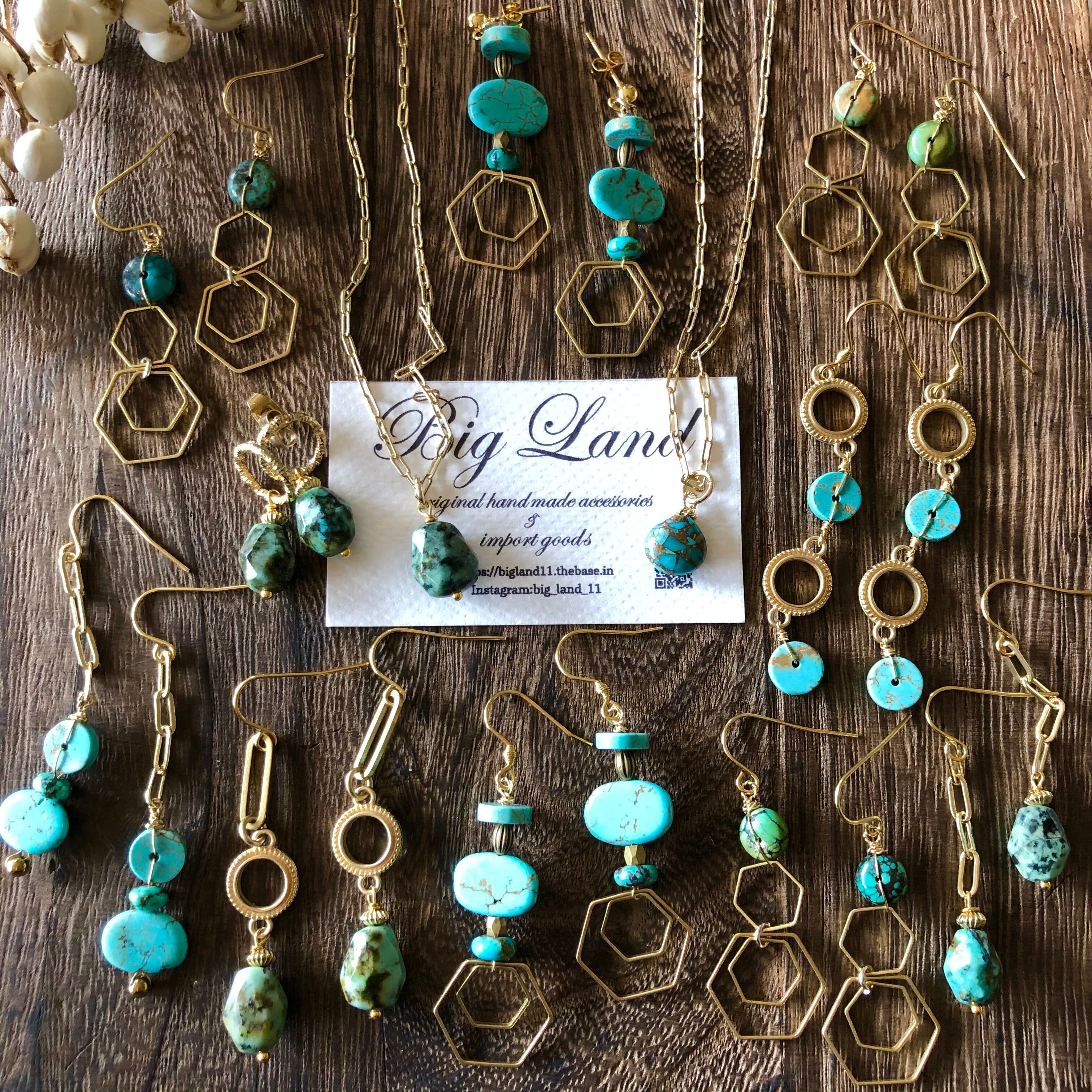 ターコイズと六角真鍮との組み合わせがなんとも洗練されたデザインに仕上がり私も愛用中‼️意外とどんなお洋服にも合わせ易く綺麗めの中に個性的で遊び心があり縦長にする事により小顔効果があり揺れるモテピアスでこれから沢山着込む季節にもお顔周りに華やかさをもたらします!!
