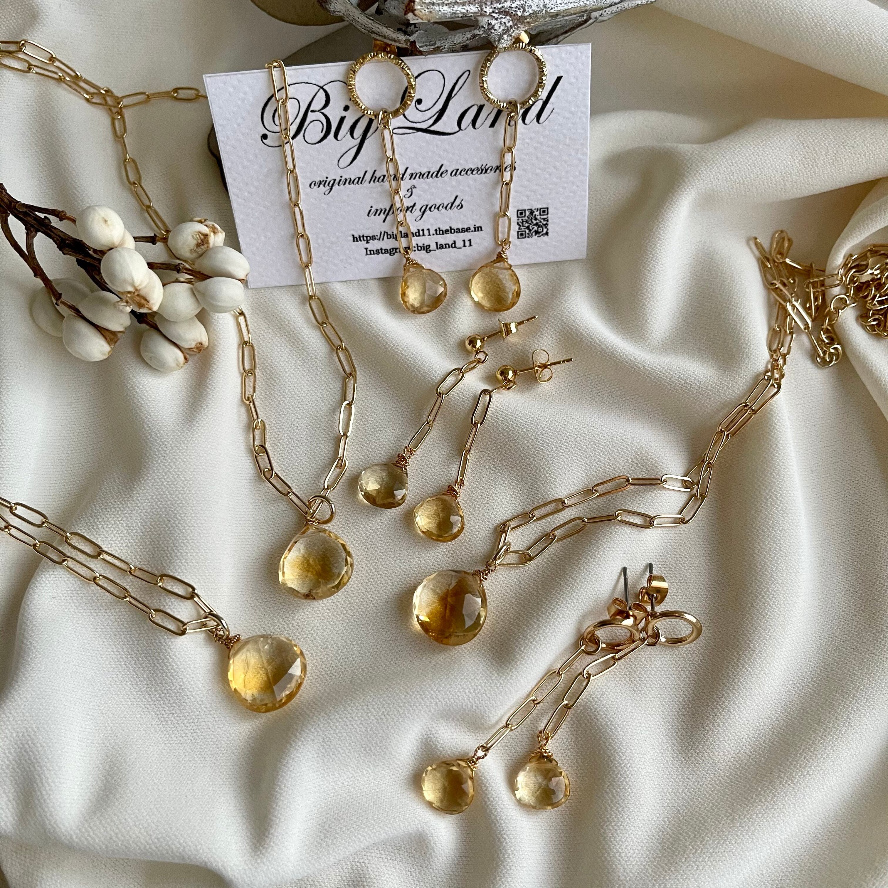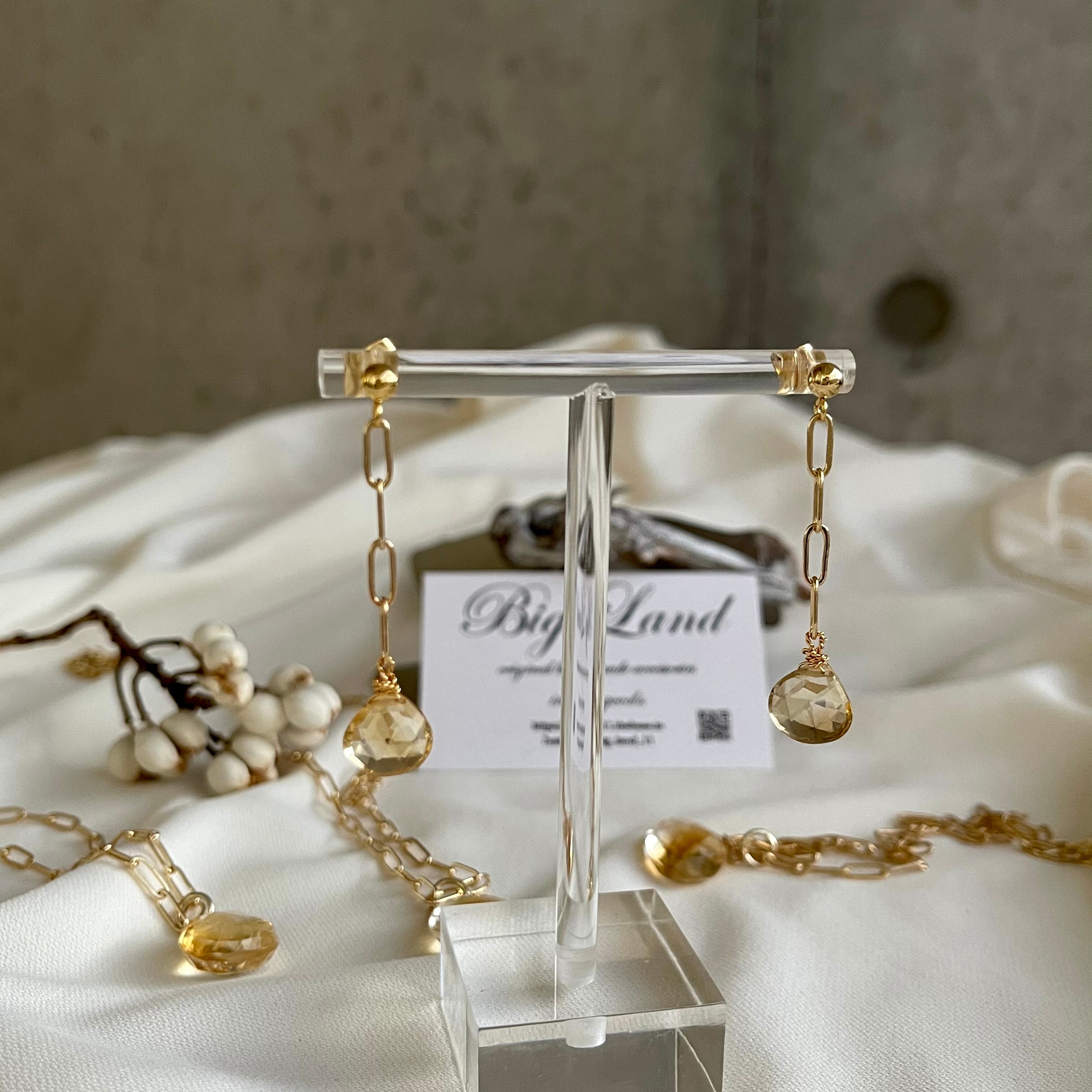 宝石質A AA上質カットされた(シトリン)黄色水晶がキラキラ輝き洗練された雰囲気で神秘さと妖艶な美しさ.....縦長にする事により小顔効果があり揺れるモテピアスでお顔周りがグッと華やかになり大変上品で高見えするイチオシ商品です‼️