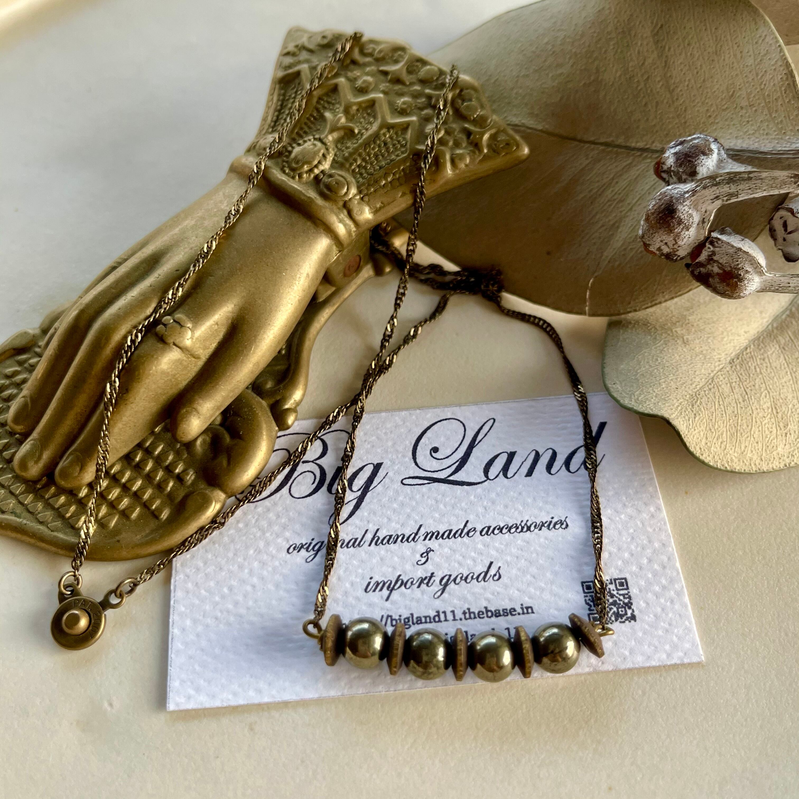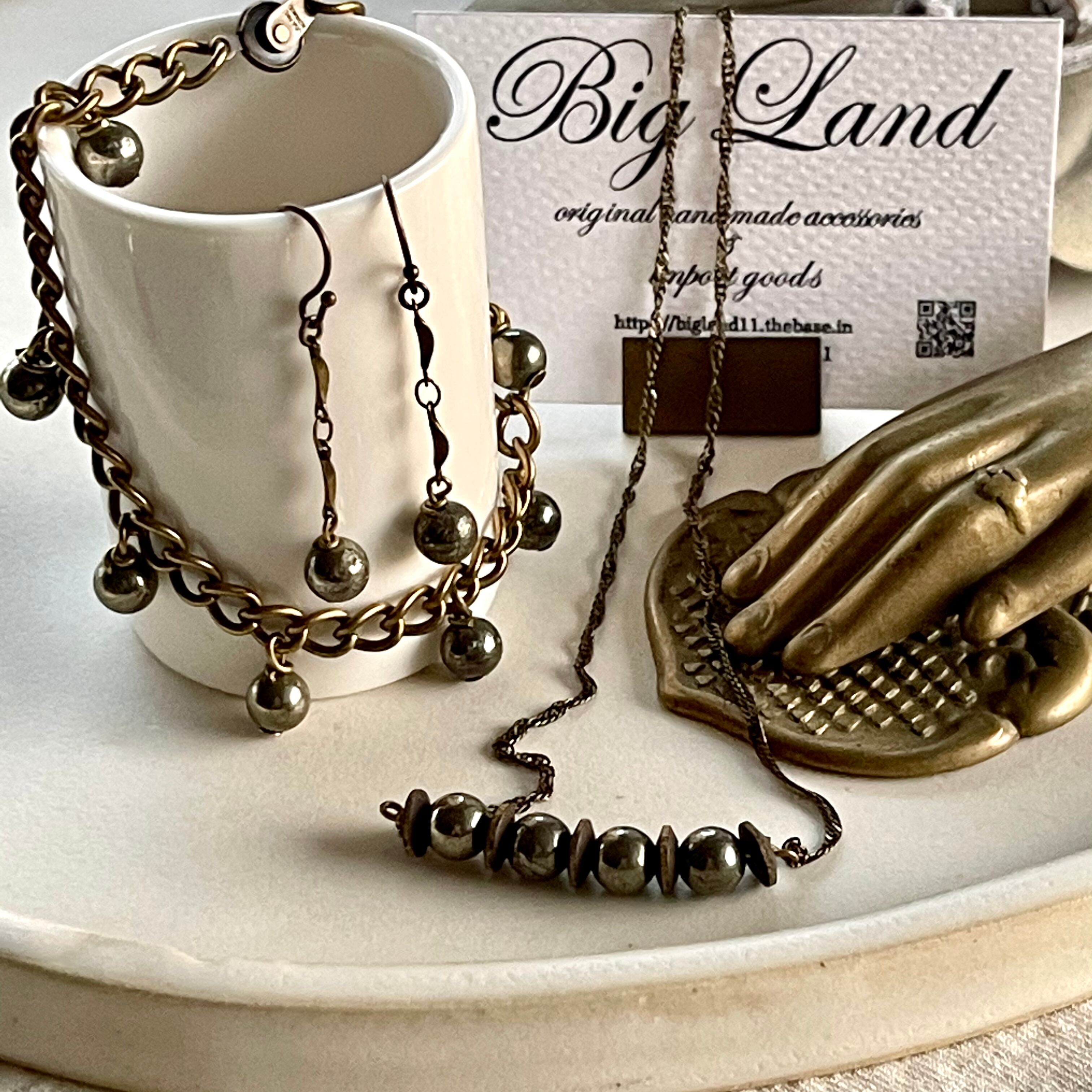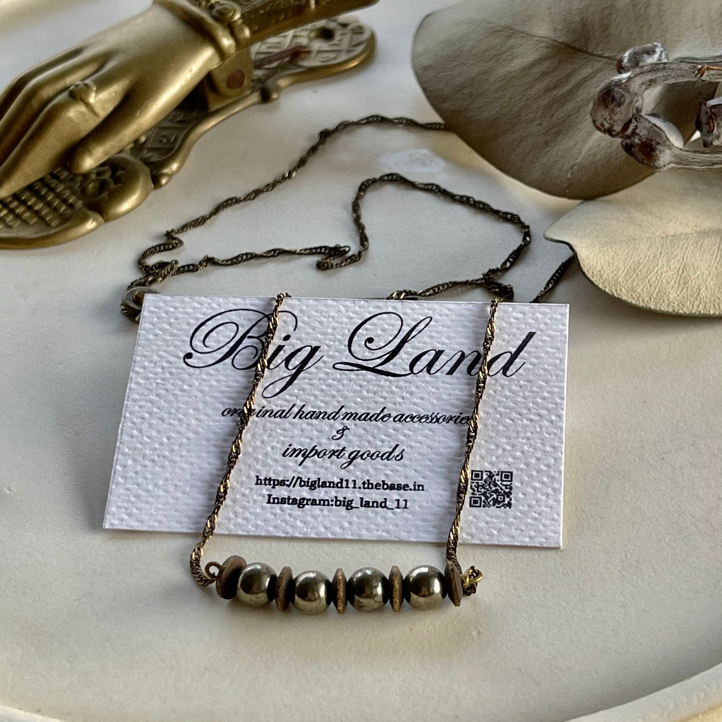 燻したような天然石パイライトを使いアンティーク風のツイストチェーンと組み合わせ、さりげないサイズ感でシンプルなお洋服にワンポイントとして使い易いと思います‼︎