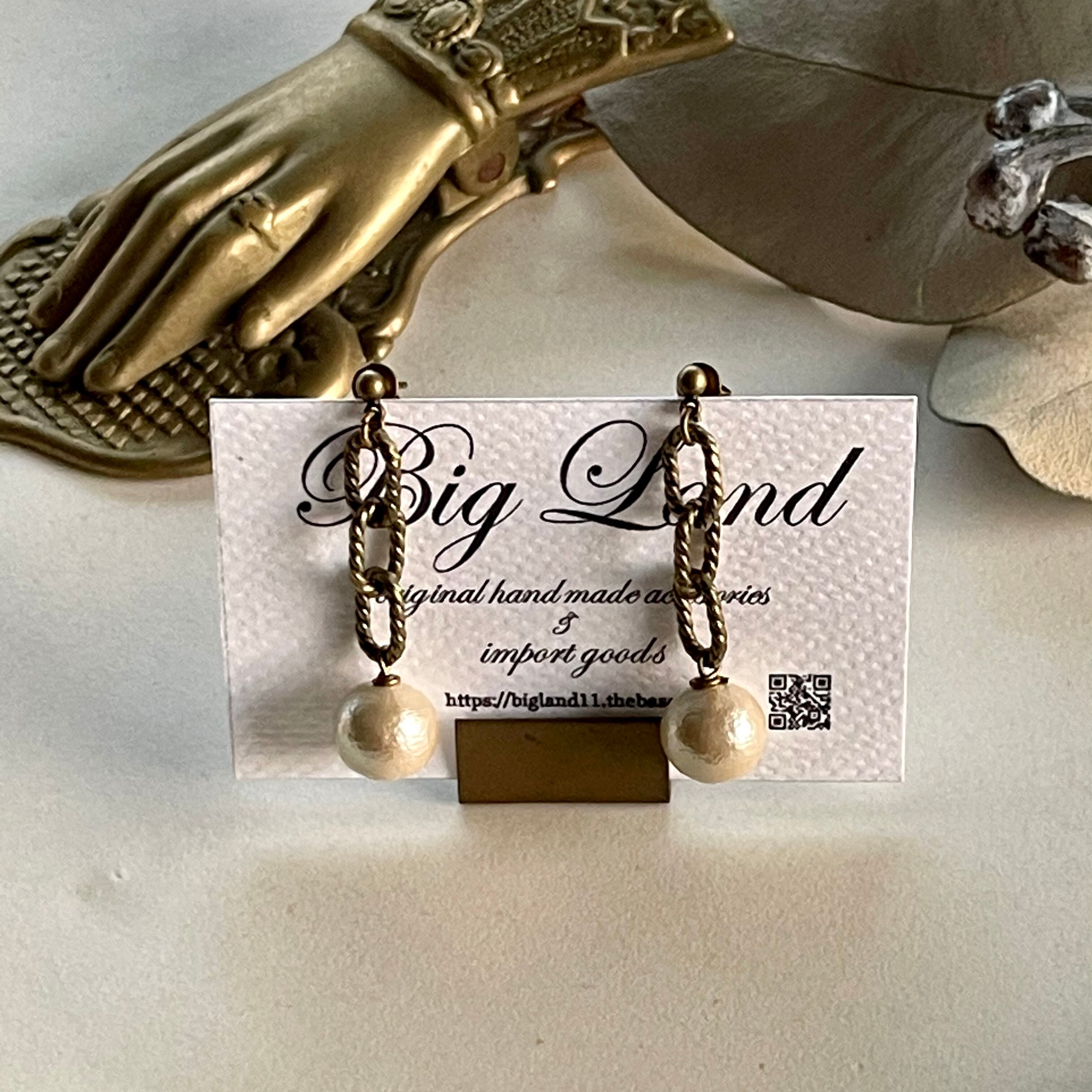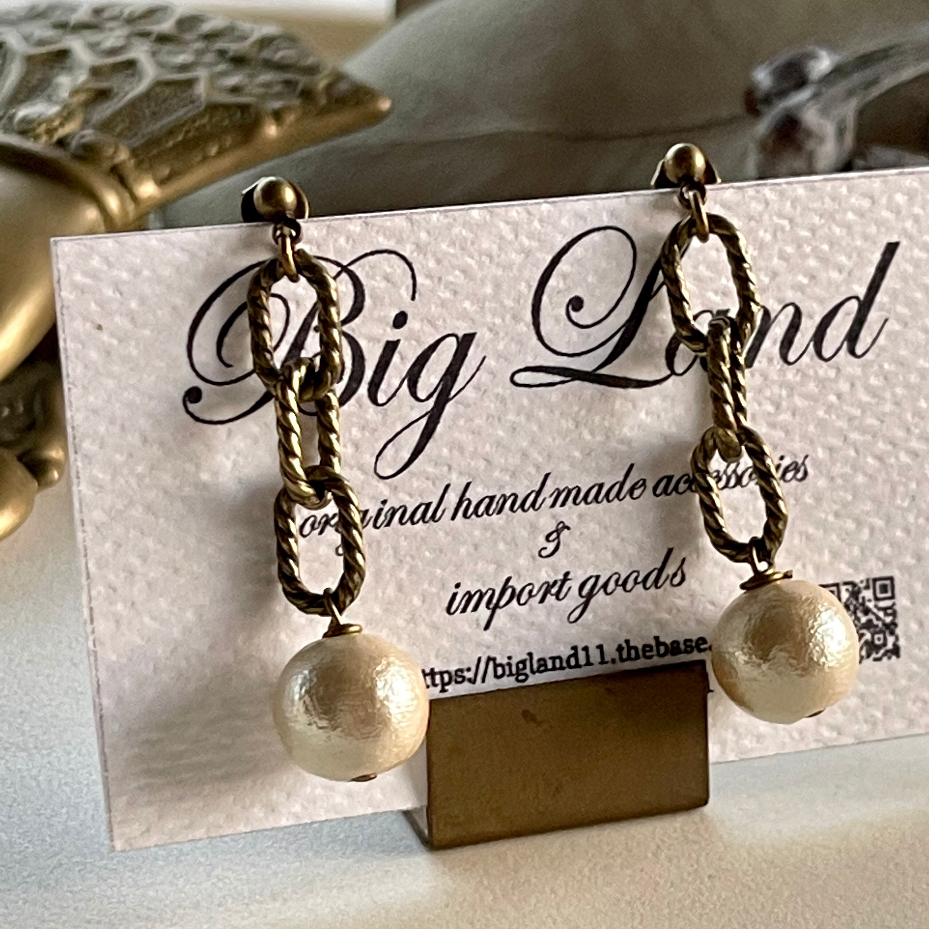 アンティークな雰囲気とオリエンタルな雰囲気がミックスされたデザインに仕上げコットンパールと燻した色のデザインチェーンの組み合わせはこなれ感があり、同系色のネックレスやブレスとセットコーデもオススメです✨