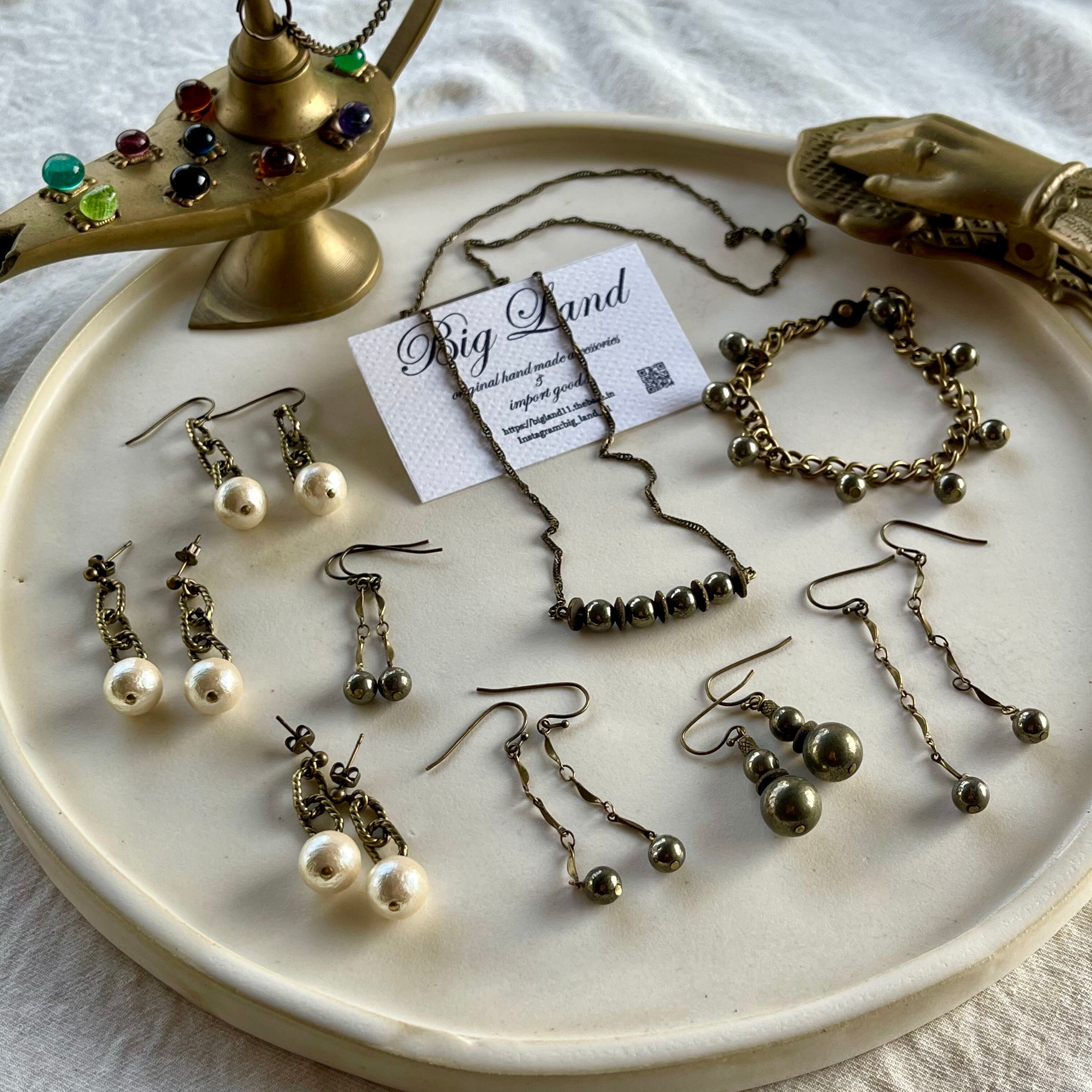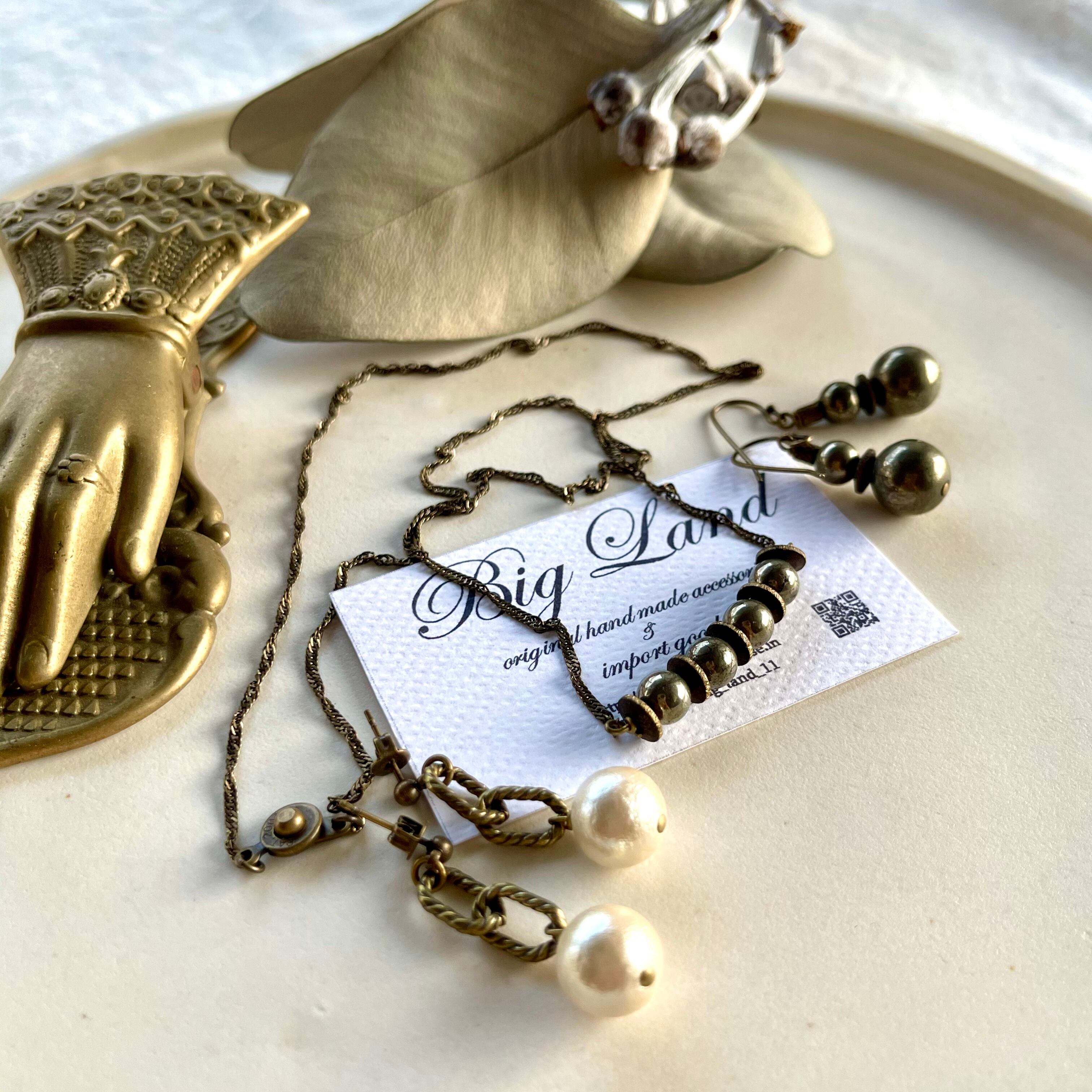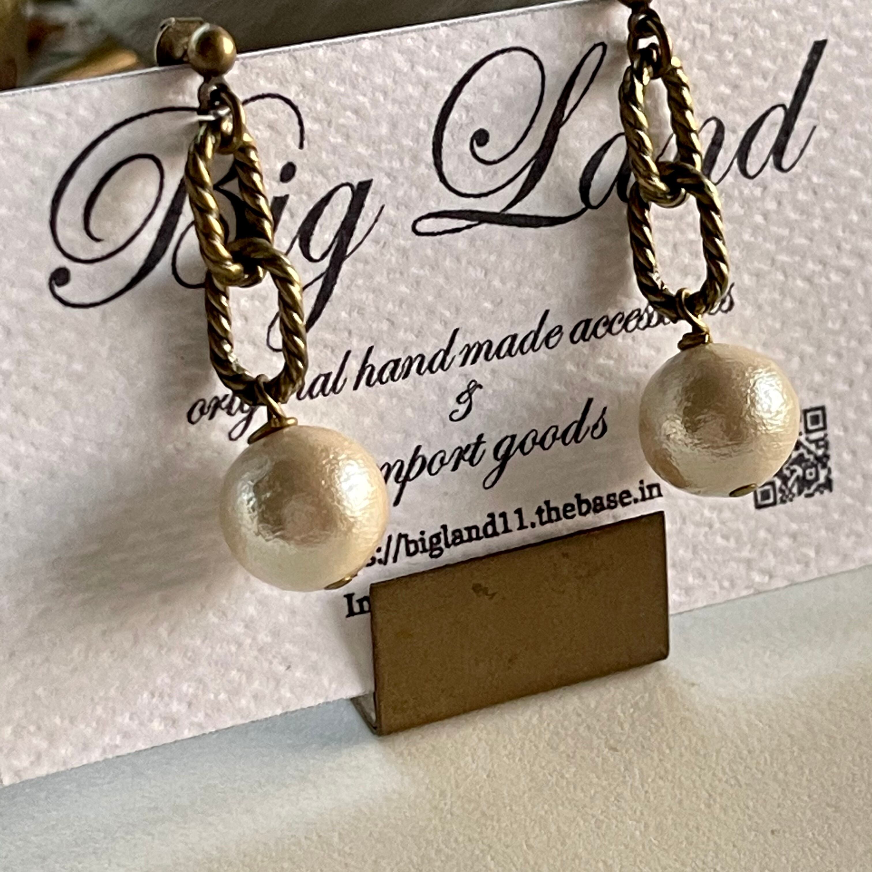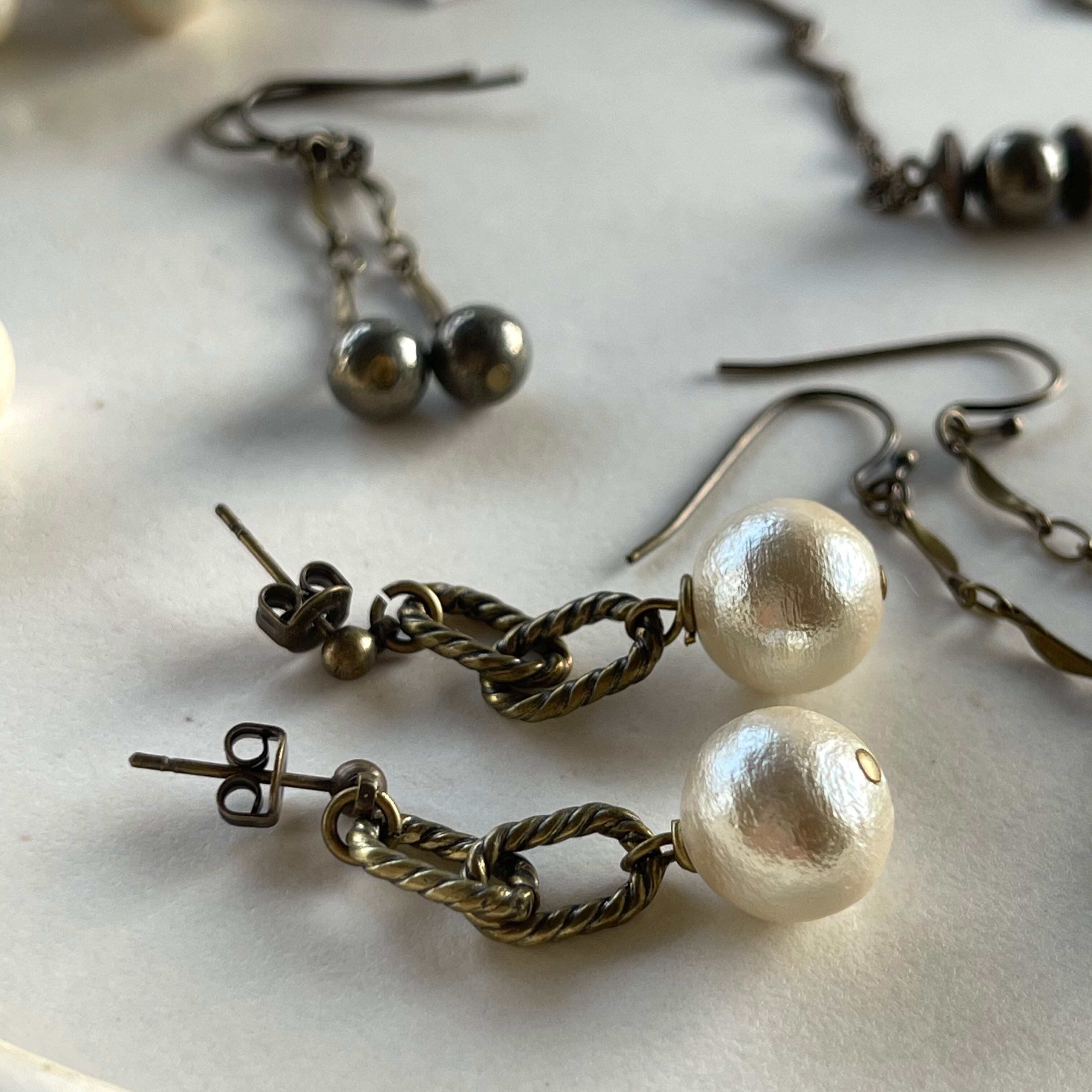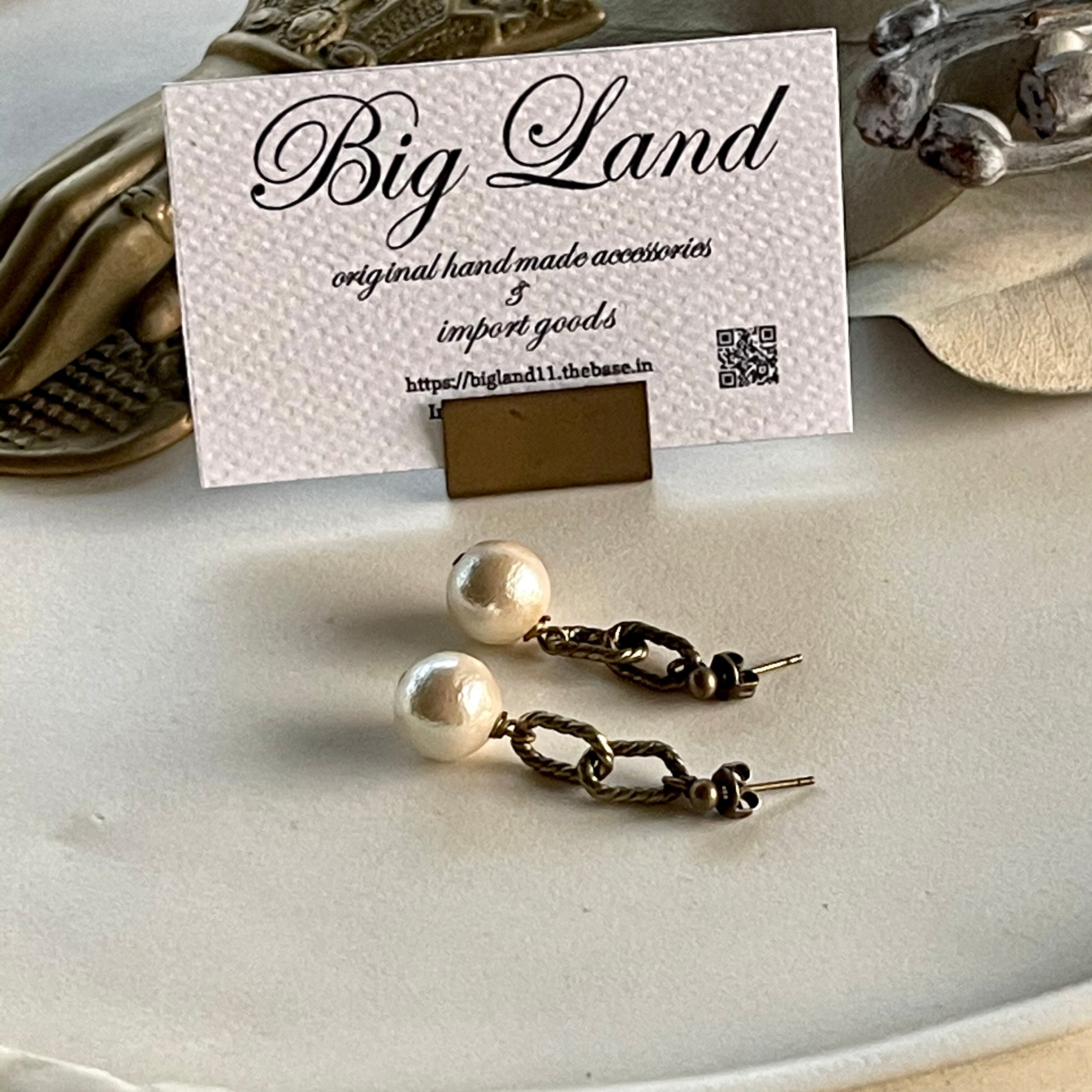 アンティークな雰囲気とオリエンタルな雰囲気がミックスされたデザインに仕上げコットンパールと燻した色のデザインチェーンの組み合わせはこなれ感があり、同系色のネックレスやブレスとセットコーデもオススメです✨