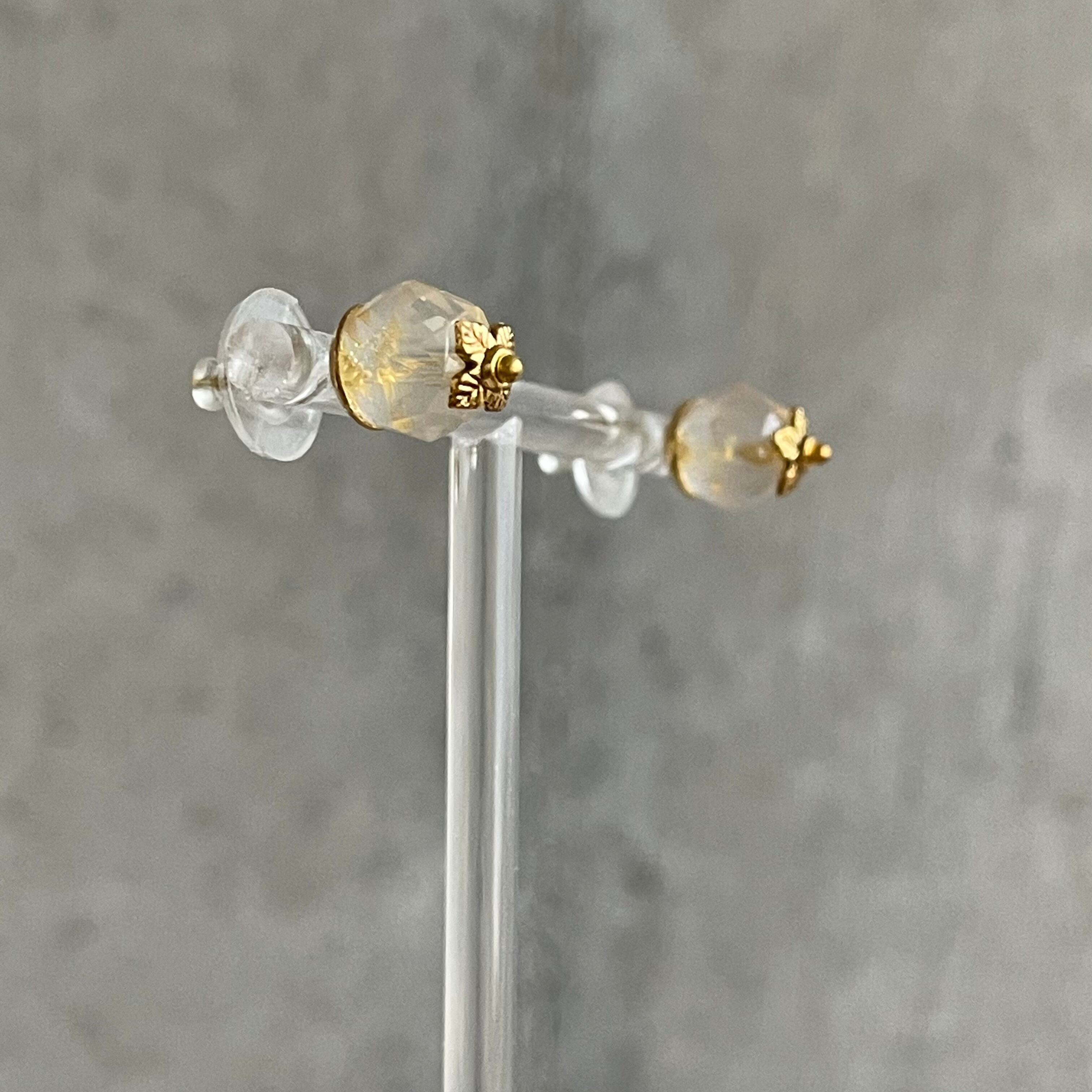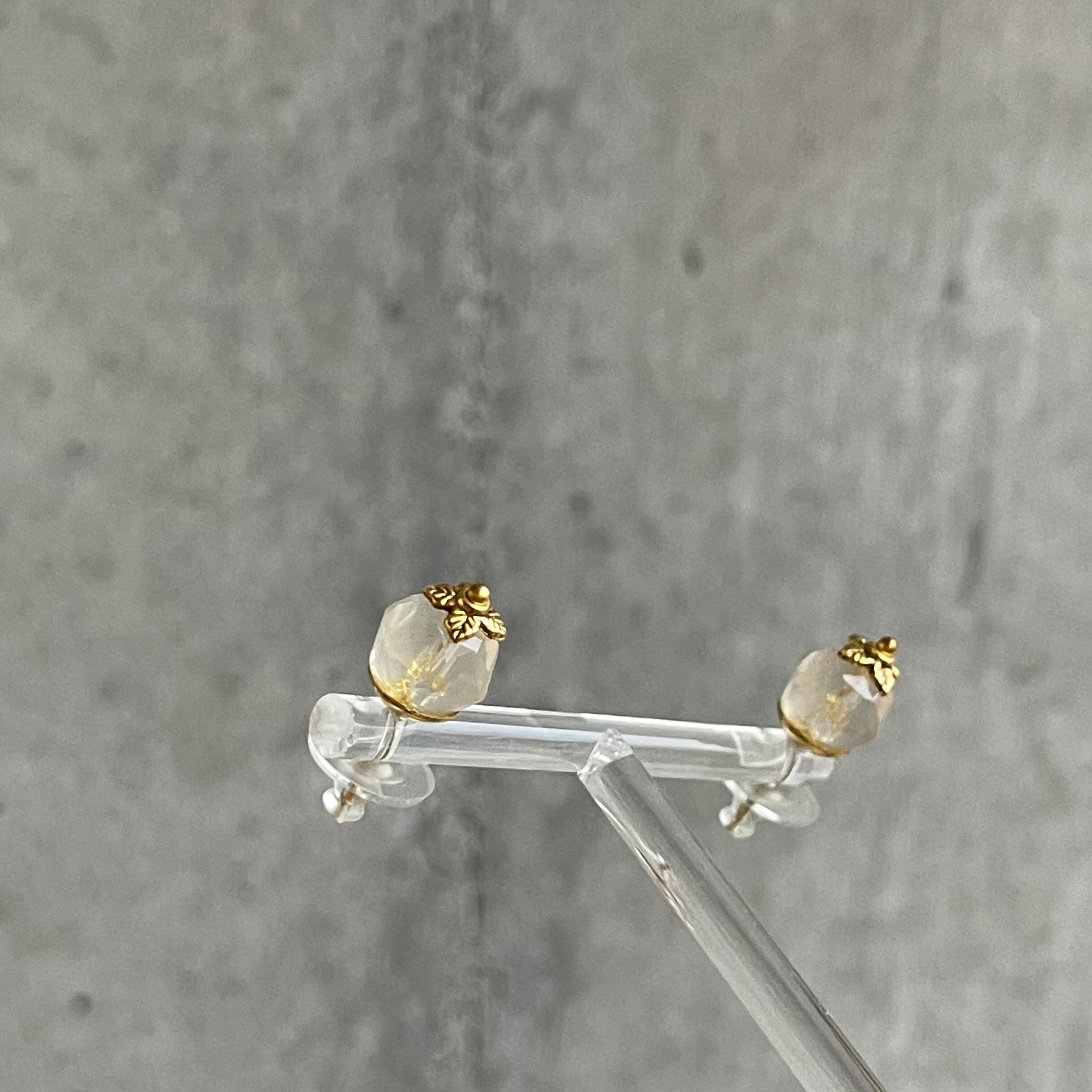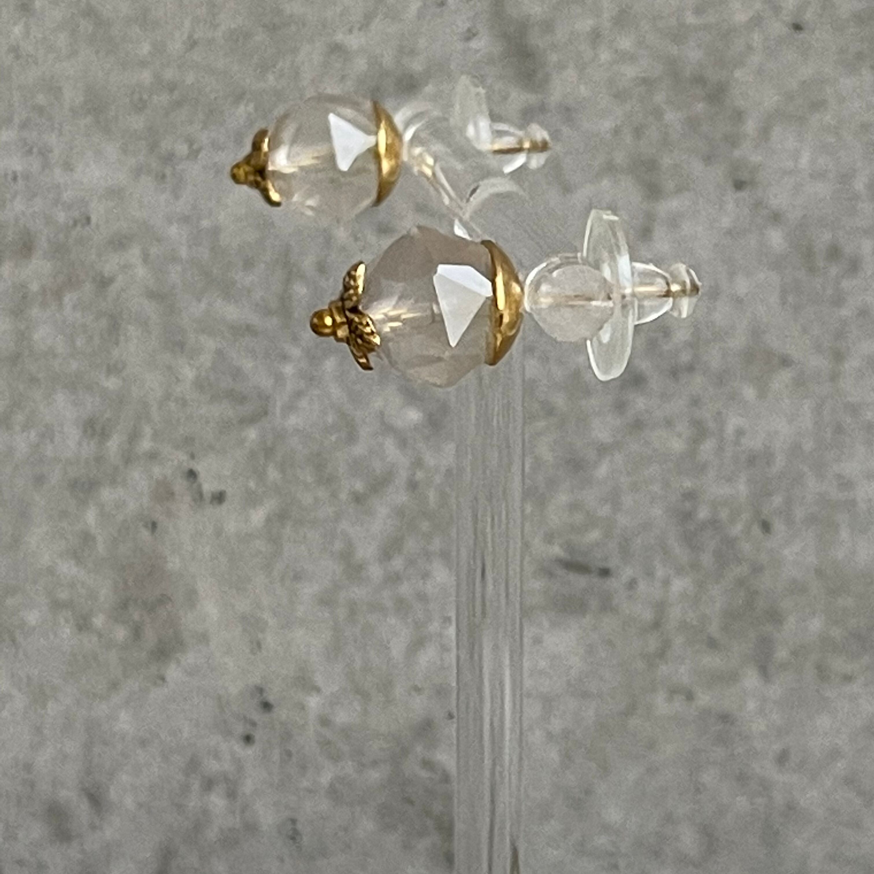 正面からだとピアスの地金が透けて黄色っぽく、横からだとローズクォーツの優しい色合いで角度によって2色楽しめ遊び心あるのが特徴です‼︎