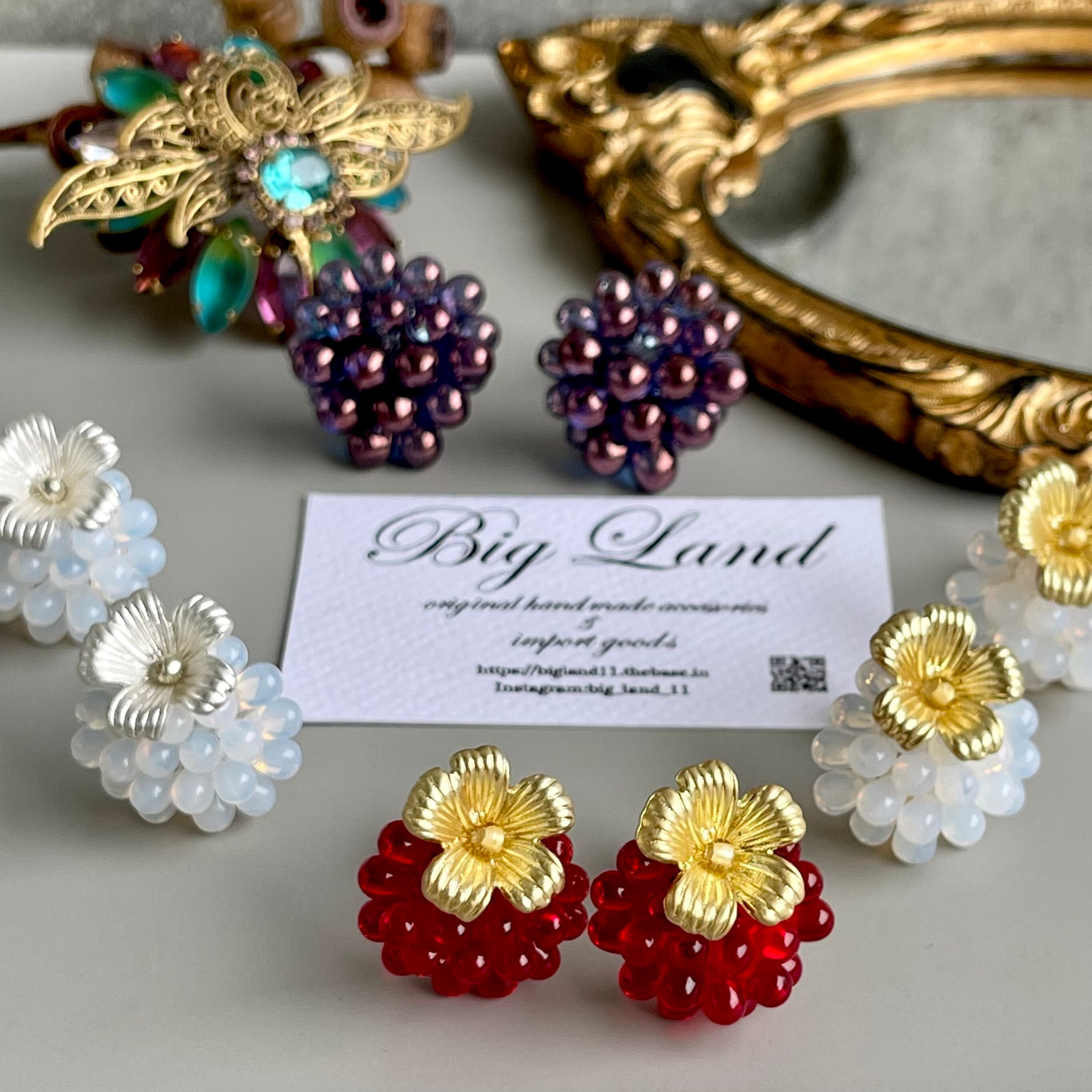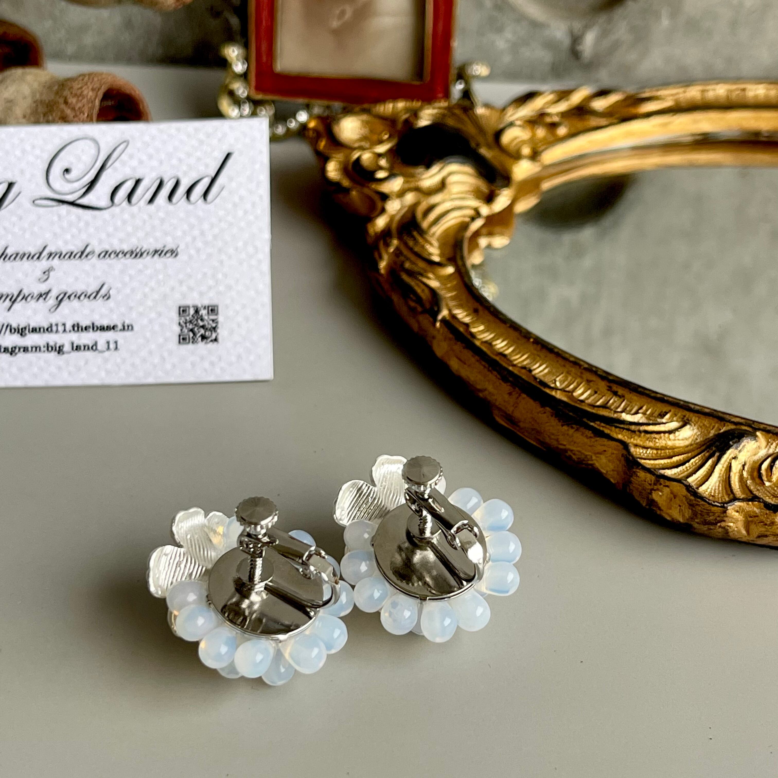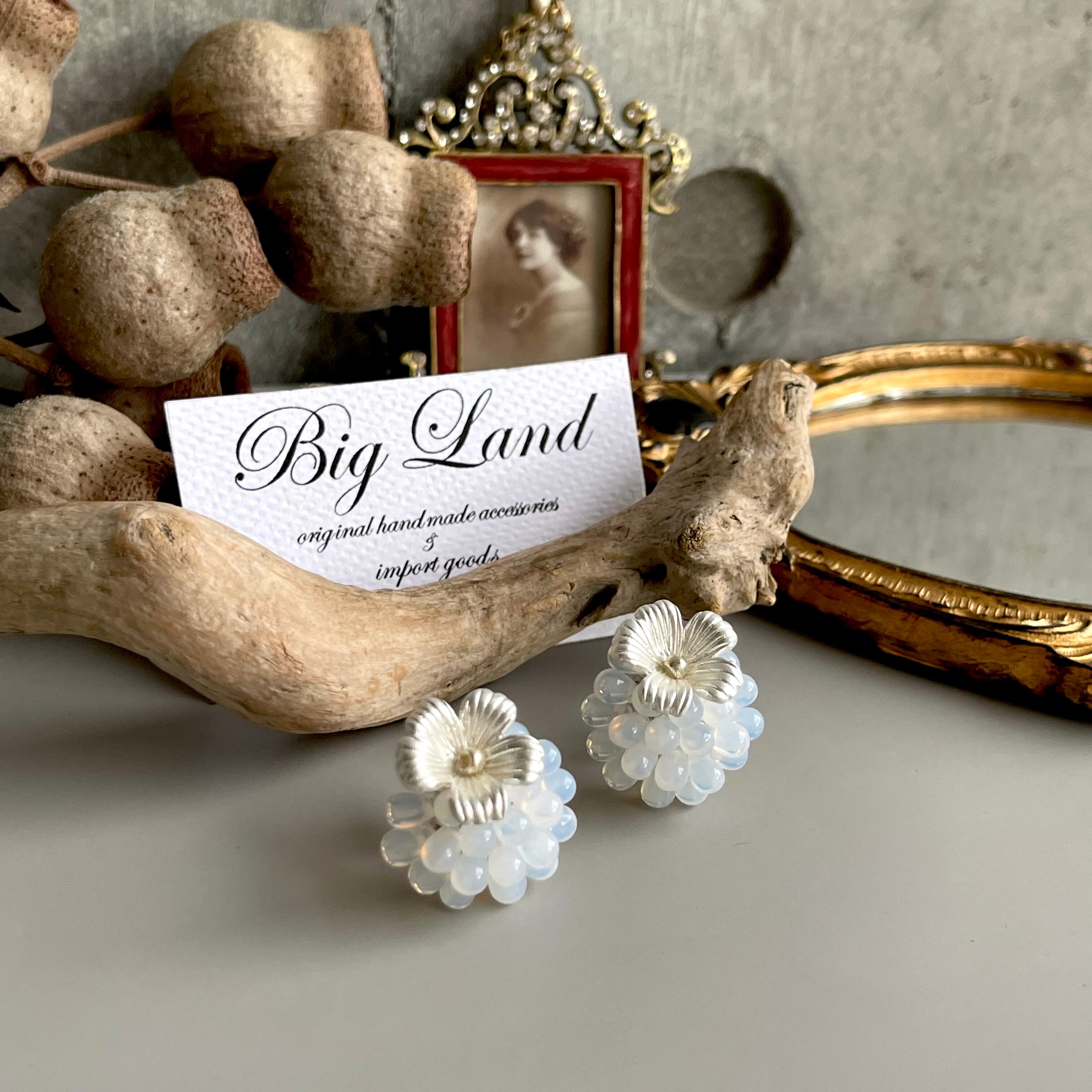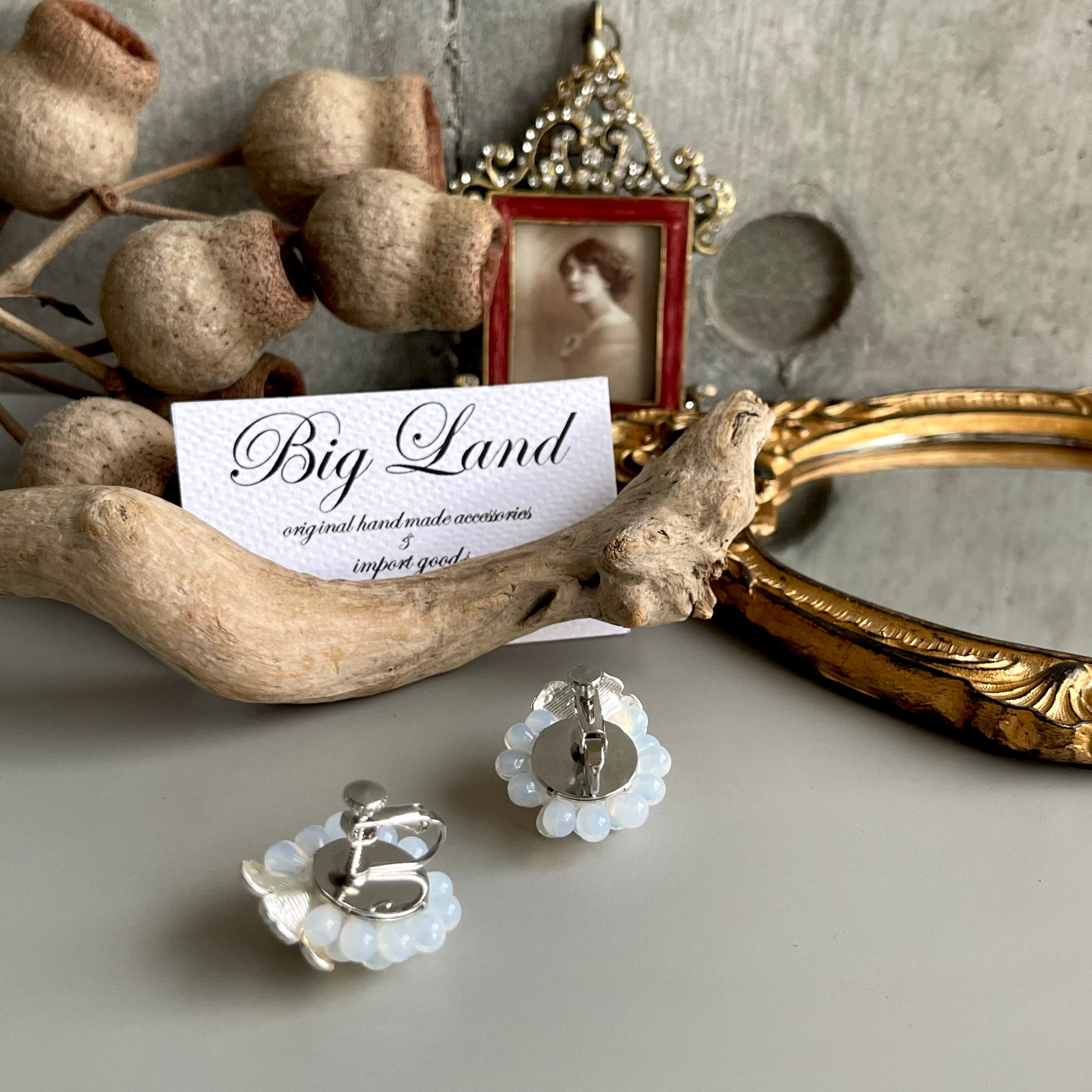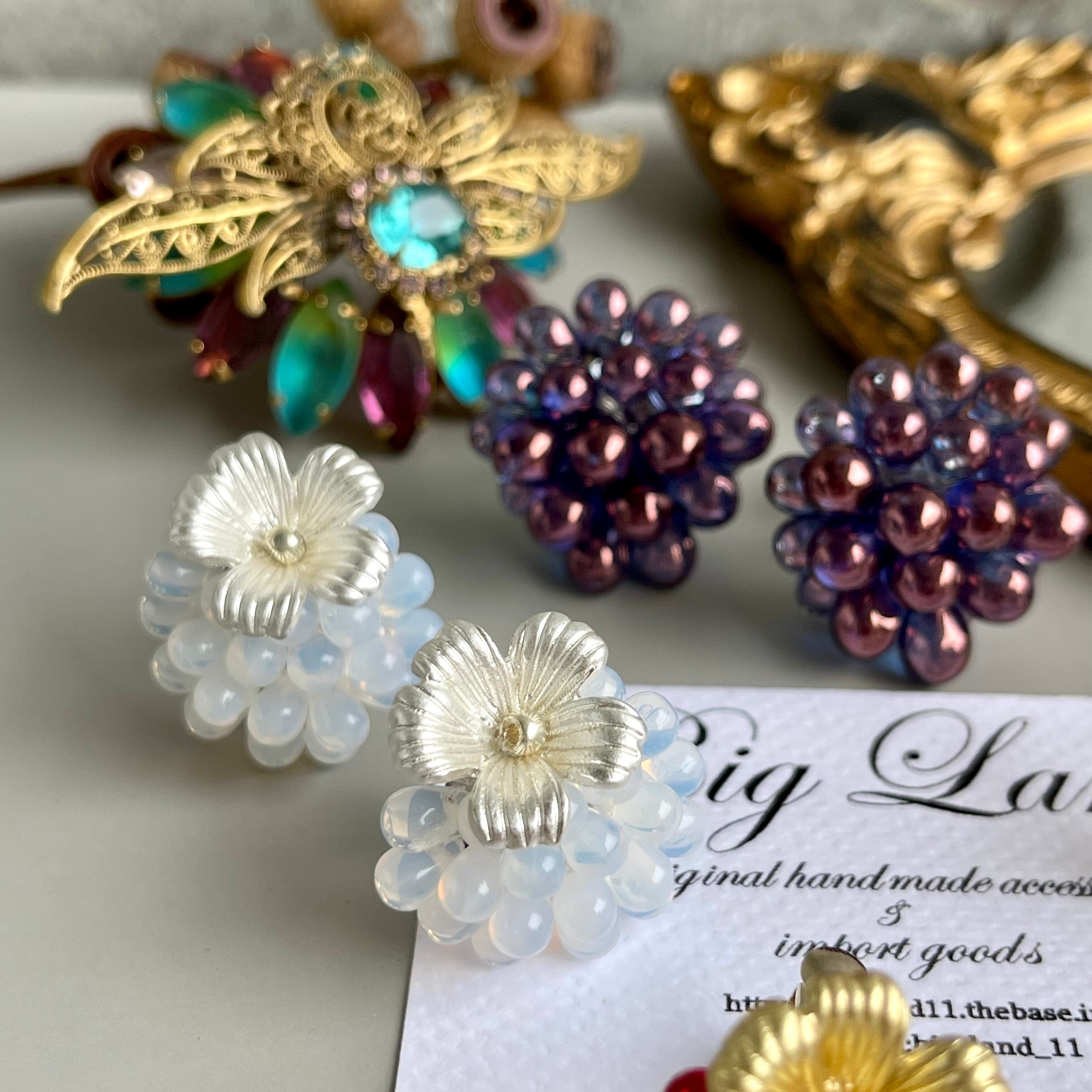 マットなお花とチェコガラスの組み合わせが堪らないキュートさで乳白色はどんな色のお洋服にも合い上品さが際立ちます✨