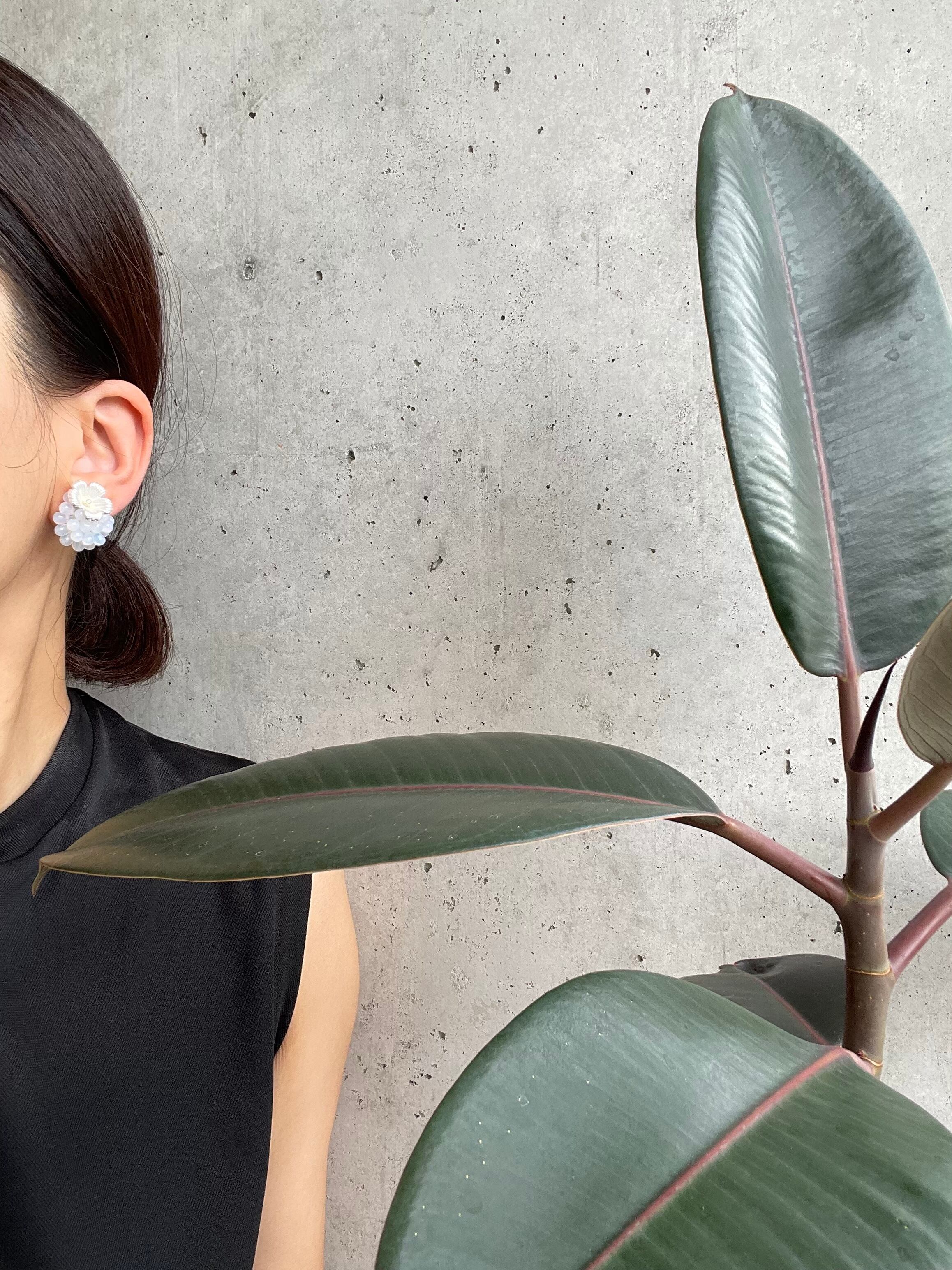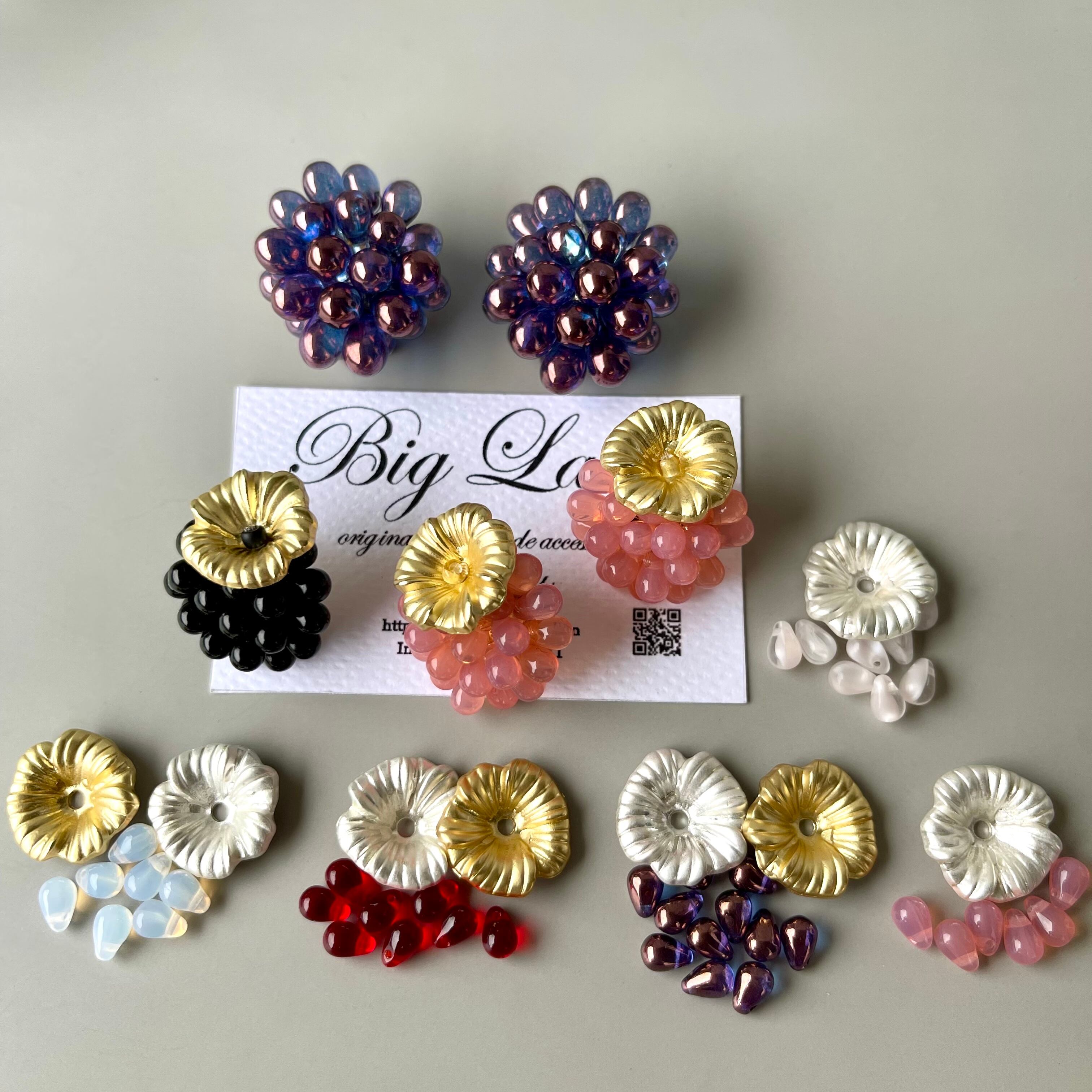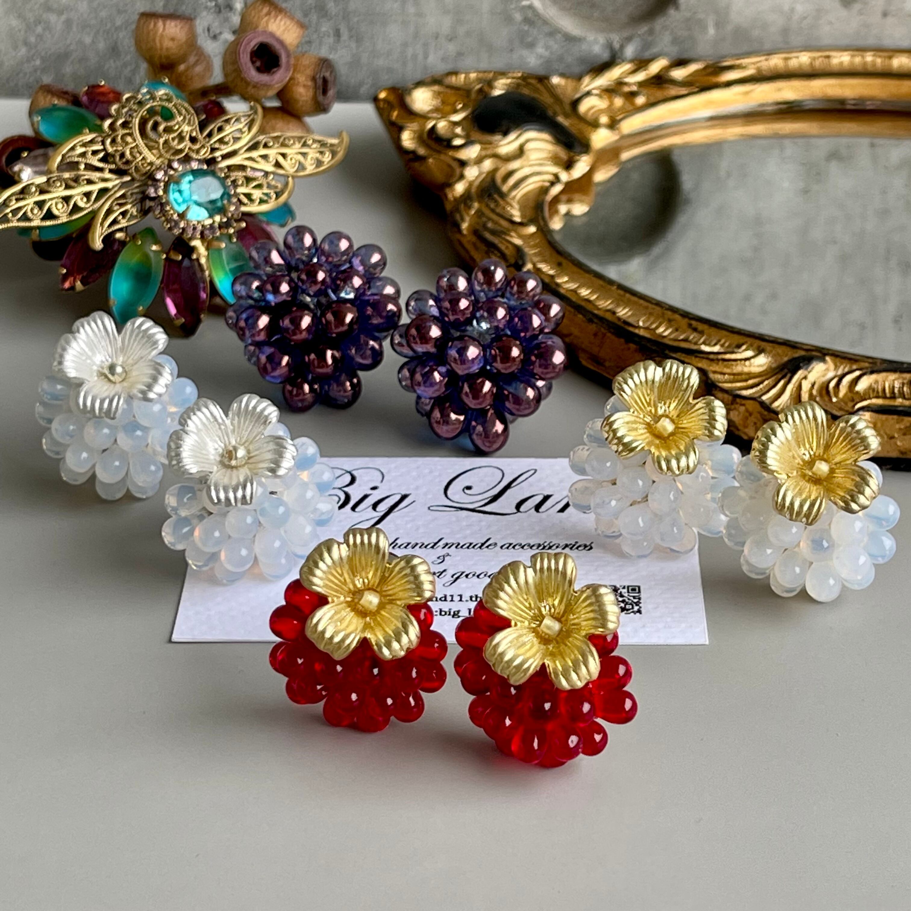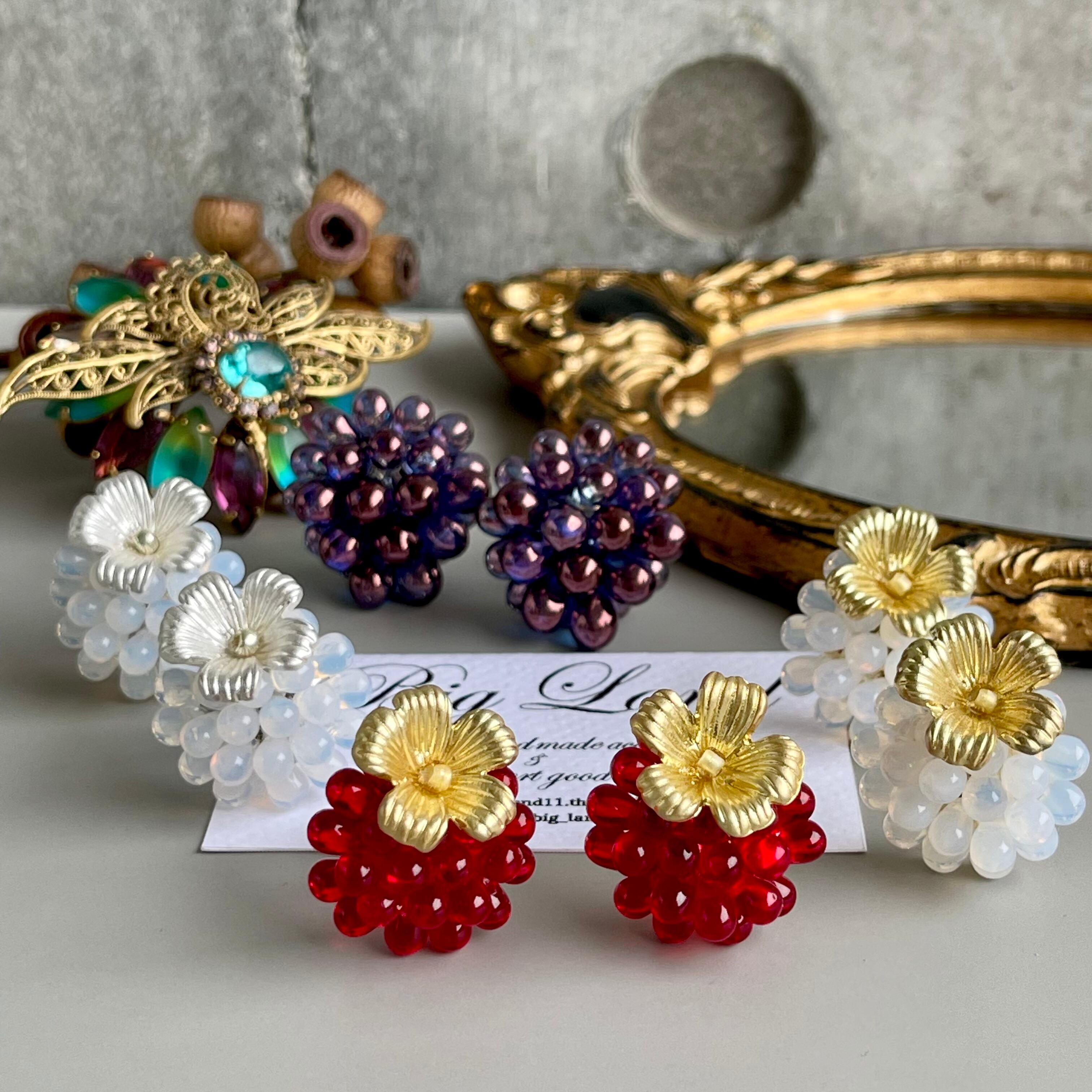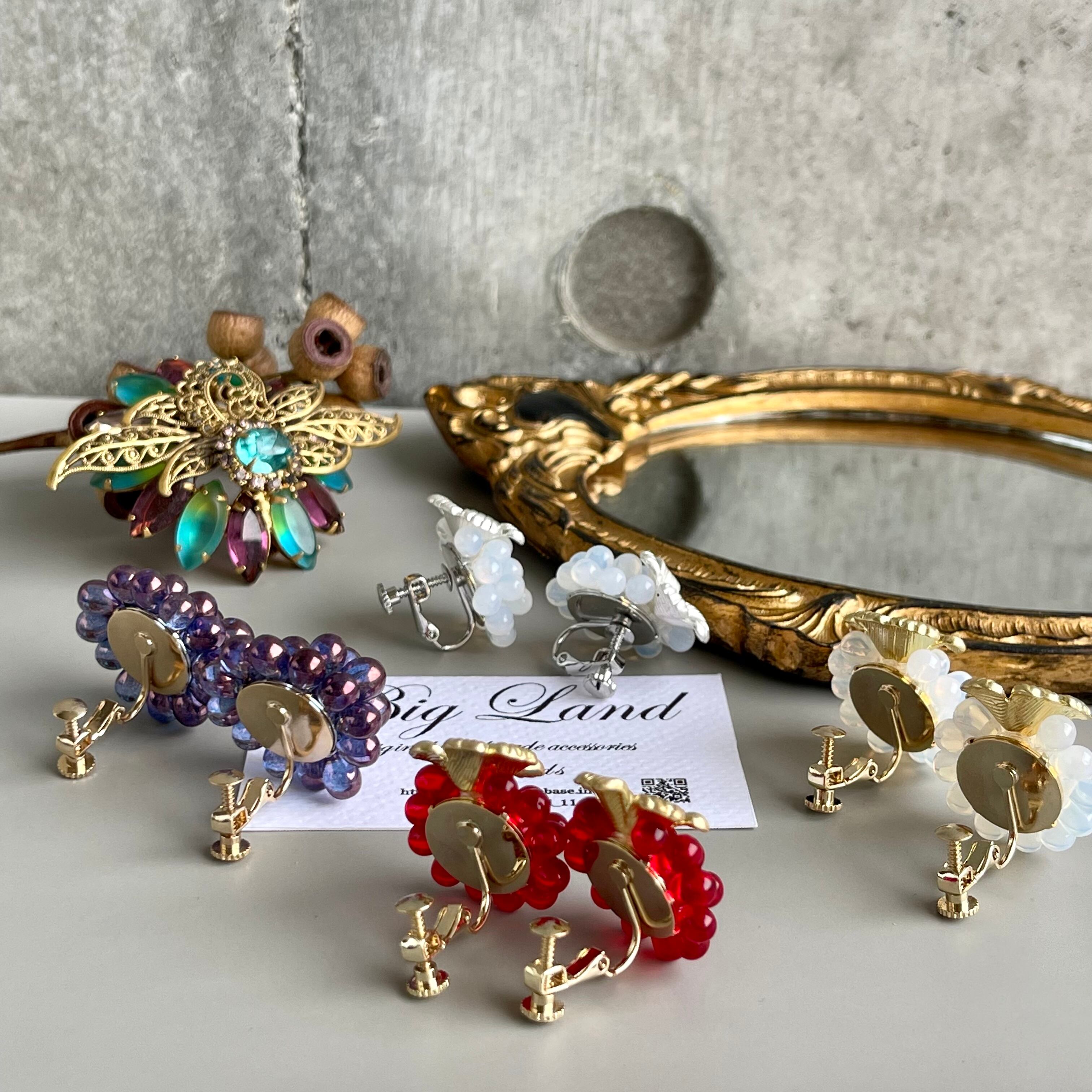 マットなお花とチェコガラスの組み合わせが堪らないキュートさで乳白色はどんな色のお洋服にも合い上品さが際立ちます✨