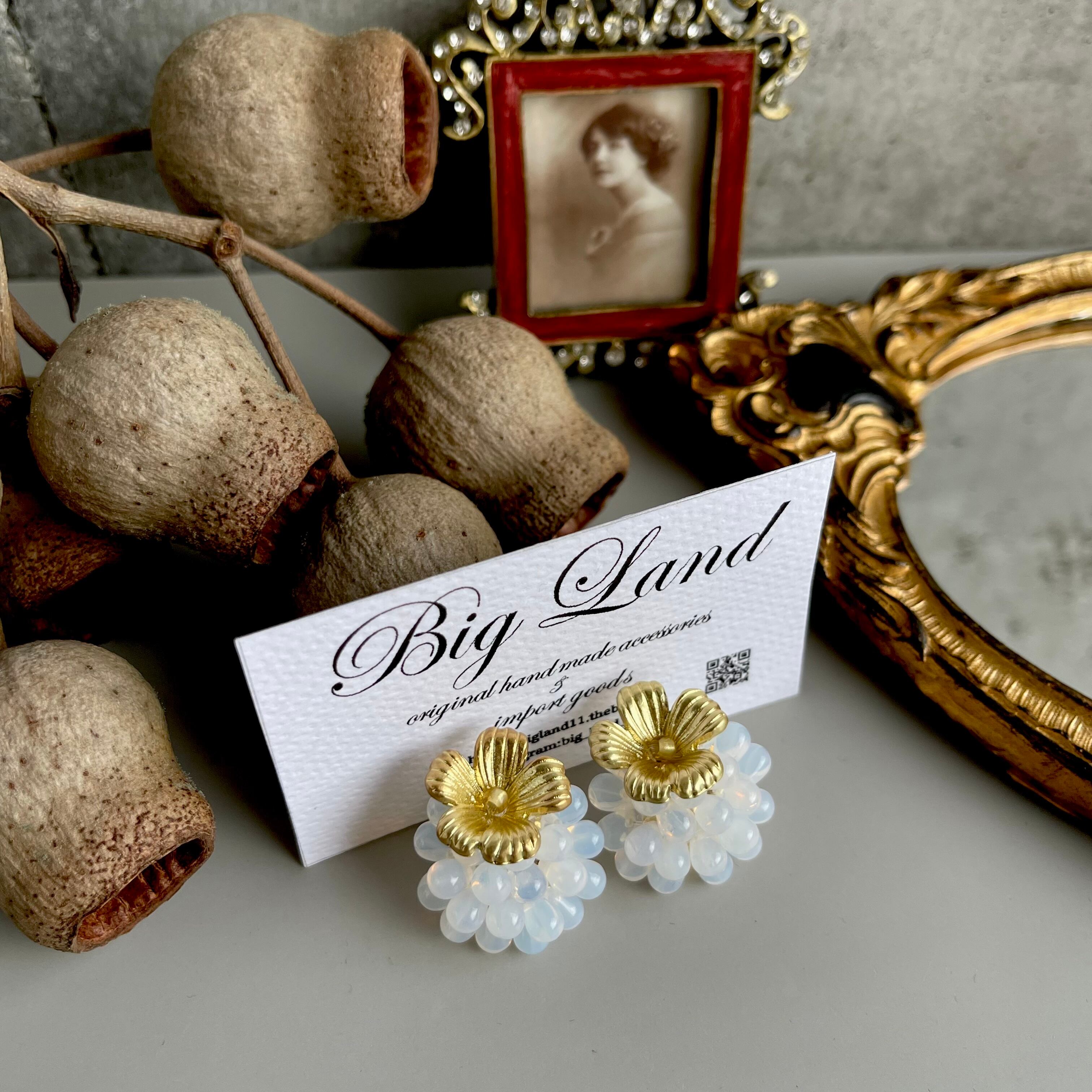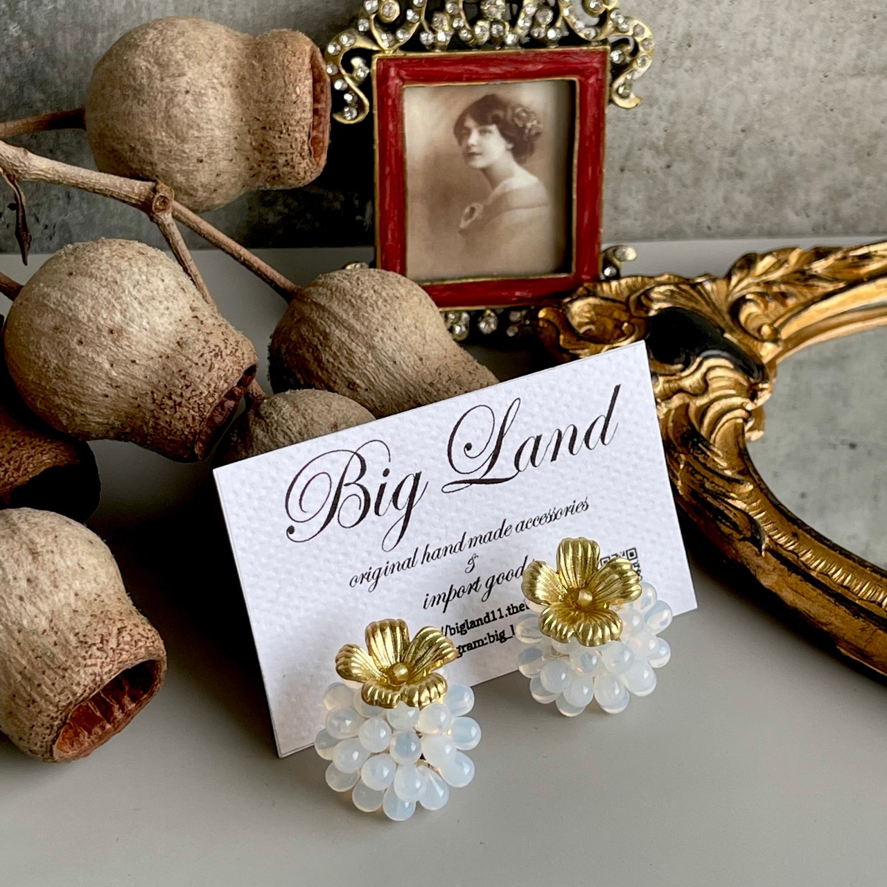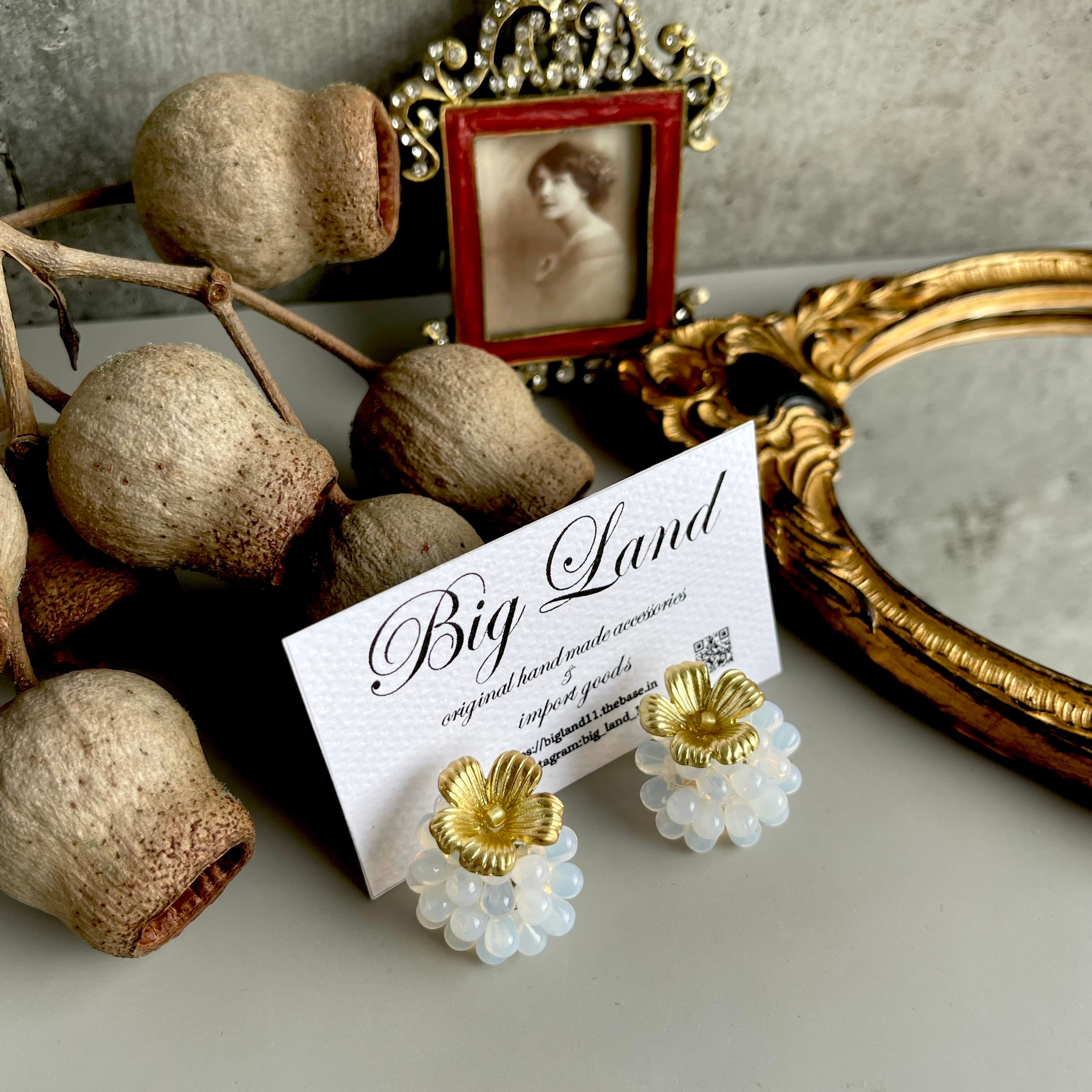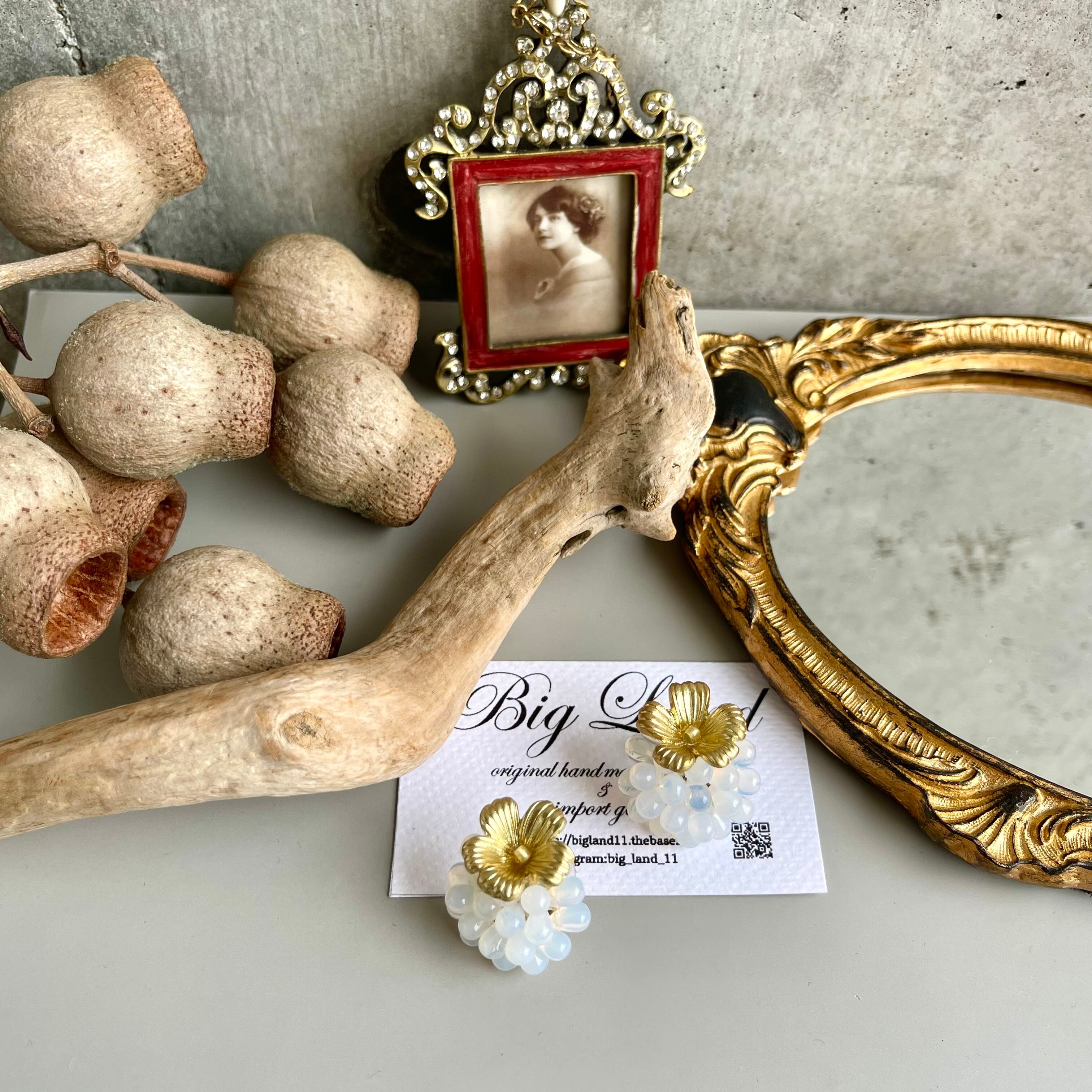 マットなお花とチェコガラスの組み合わせが堪らないキュートさで乳白色はどんな色のお洋服にも合い上品さが際立ちます✨