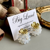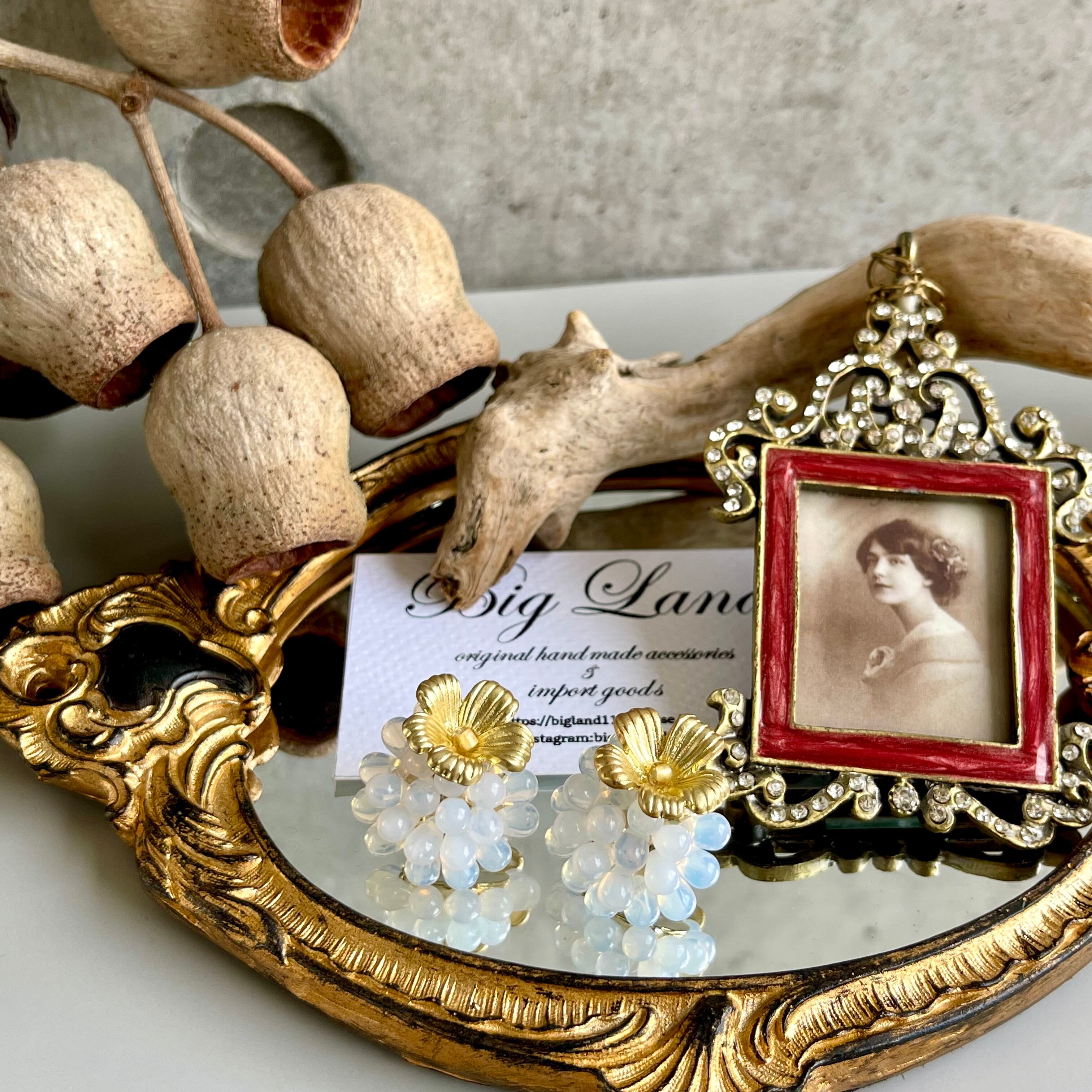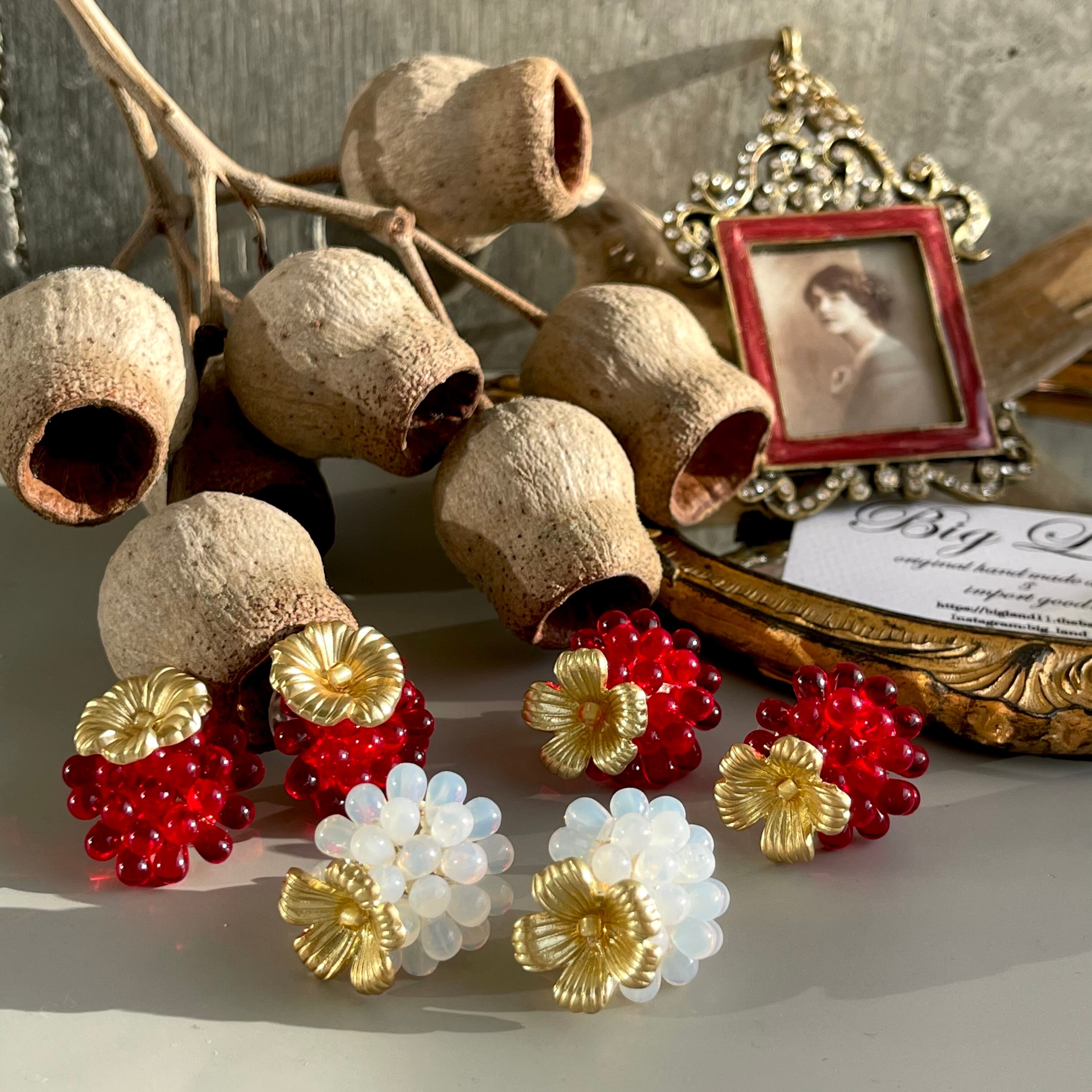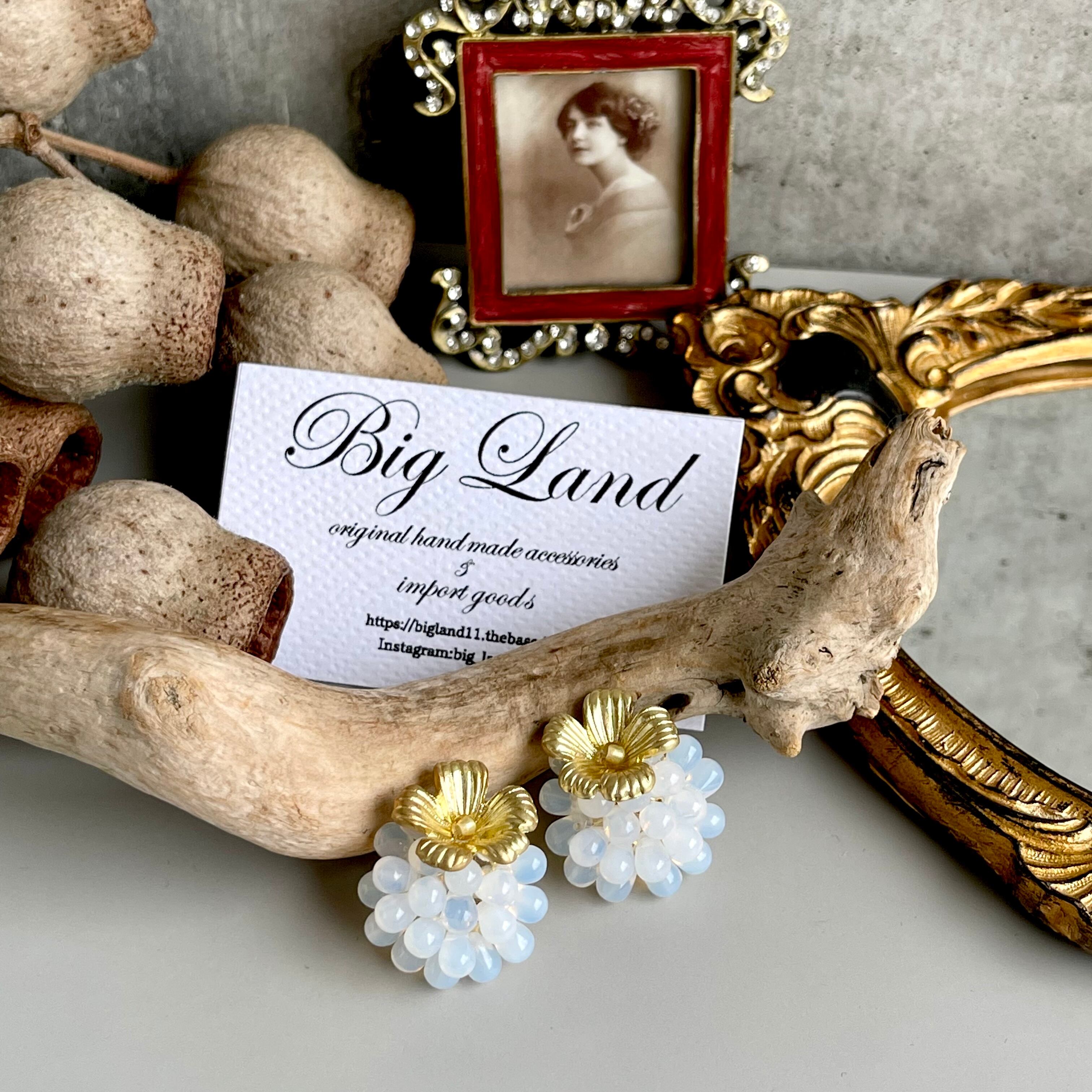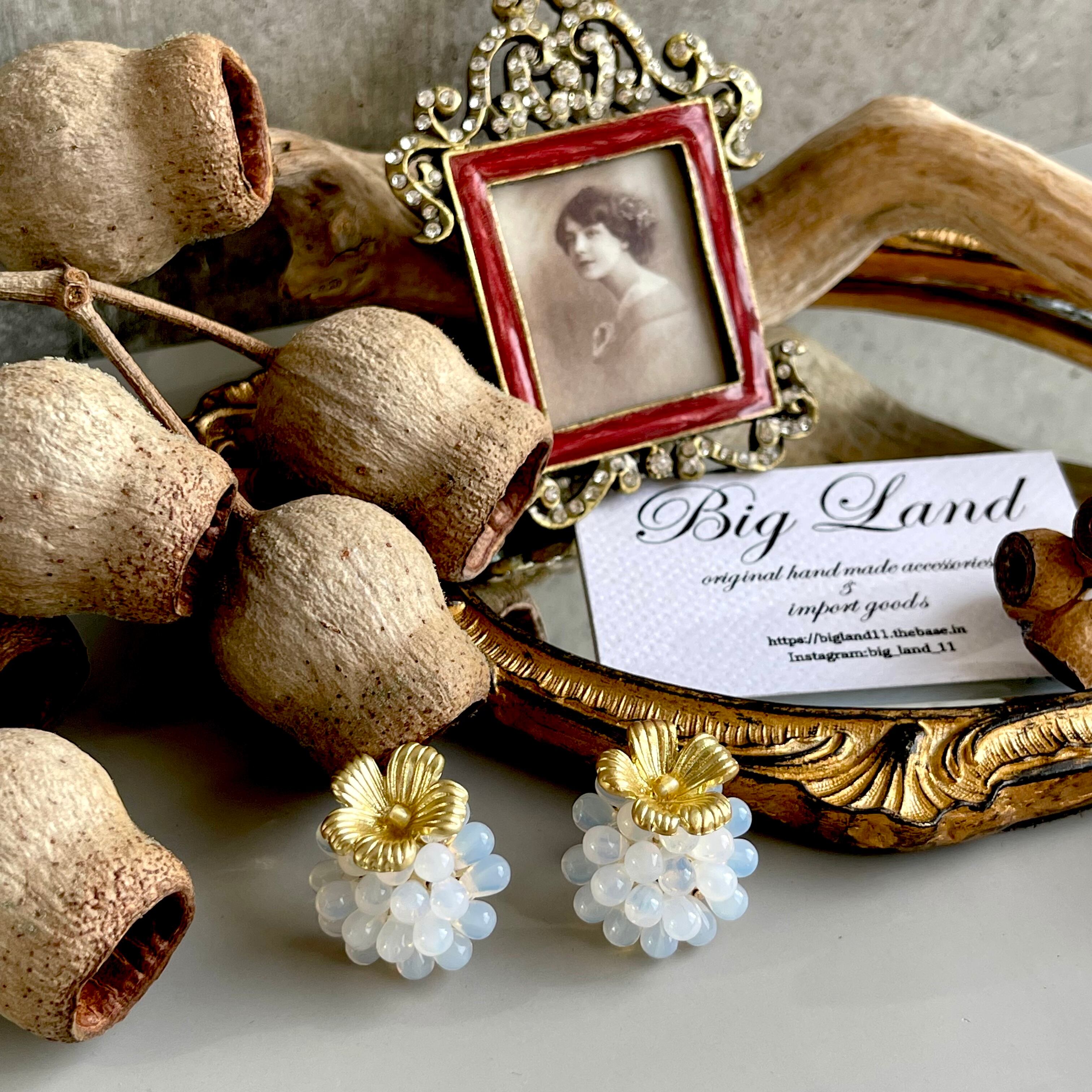 マットなお花とチェコガラスの組み合わせが堪らないキュートさで乳白色はどんな色のお洋服にも合い上品さが際立ちます✨