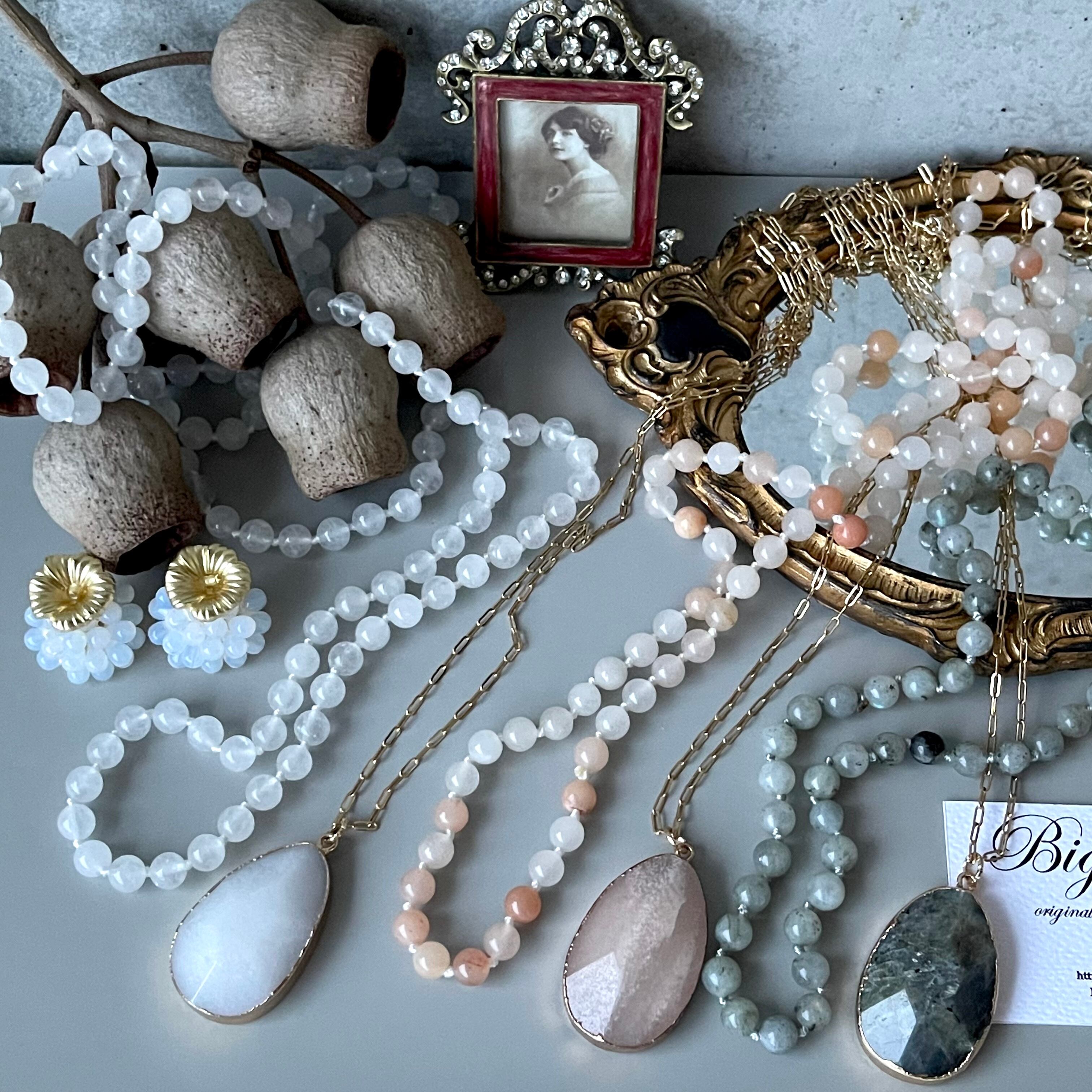 同系色のネックレスやチェコガラスピアスでお色を揃えるとコーデに迷わず、まとまり感がでるかと思います‼️