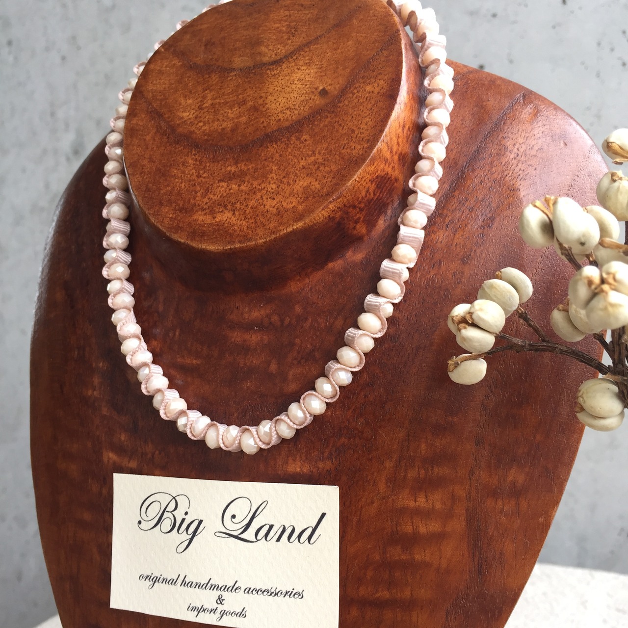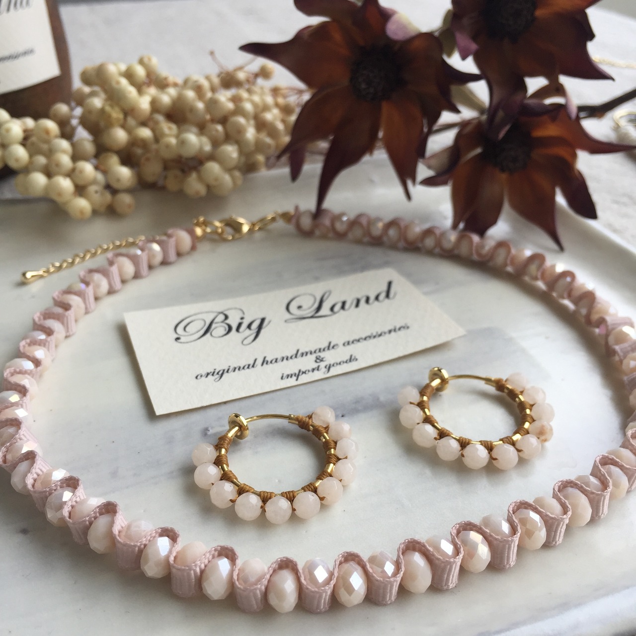 今年の春夏にも流行るべージュピンクのボタンガラスと落ち着いたピンクリボンで織り込みながらひと針ひと針丁寧に仕上げました。