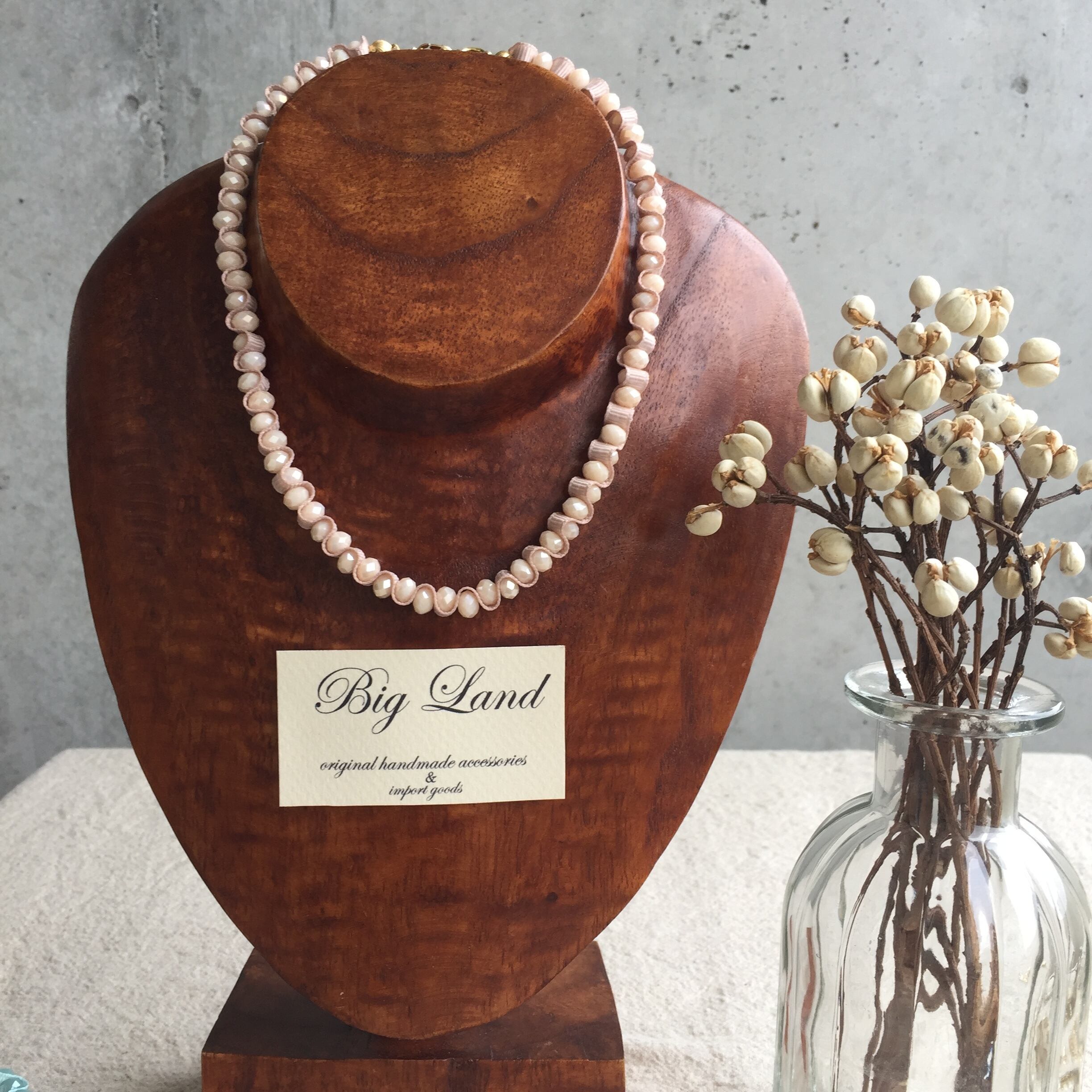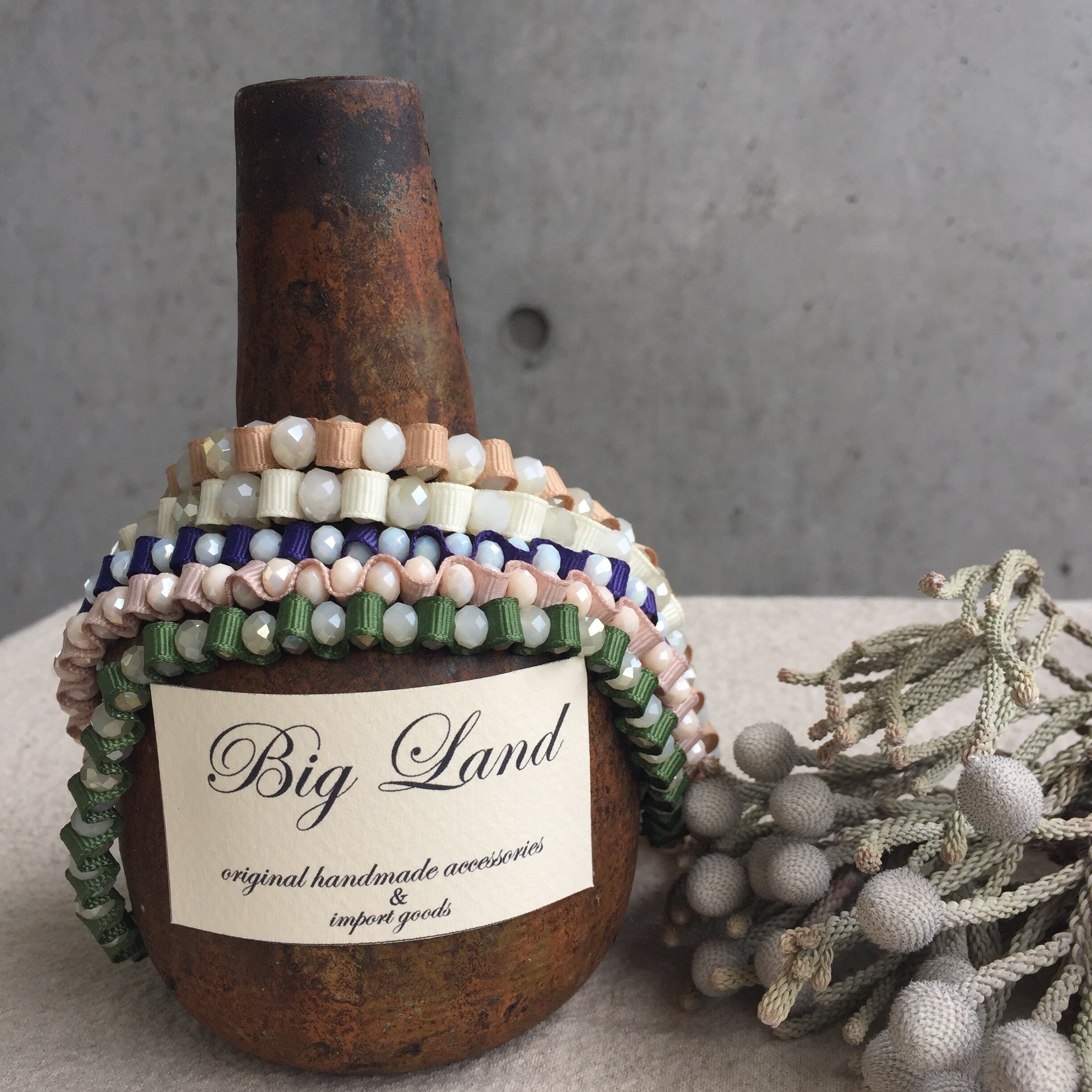 今年の春夏にも流行るべージュピンクのボタンガラスと落ち着いたピンクリボンで織り込みながらひと針ひと針丁寧に仕上げました。