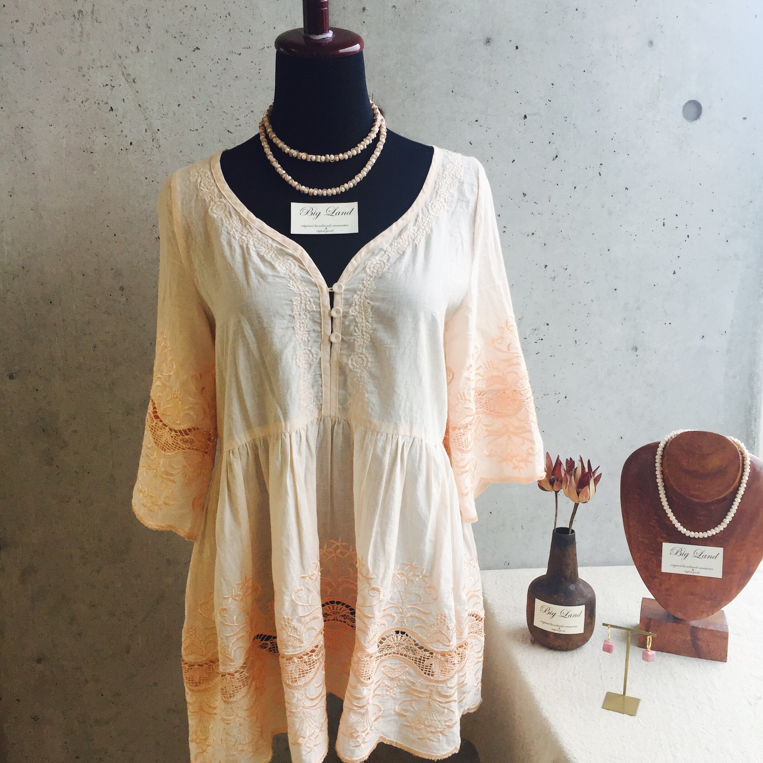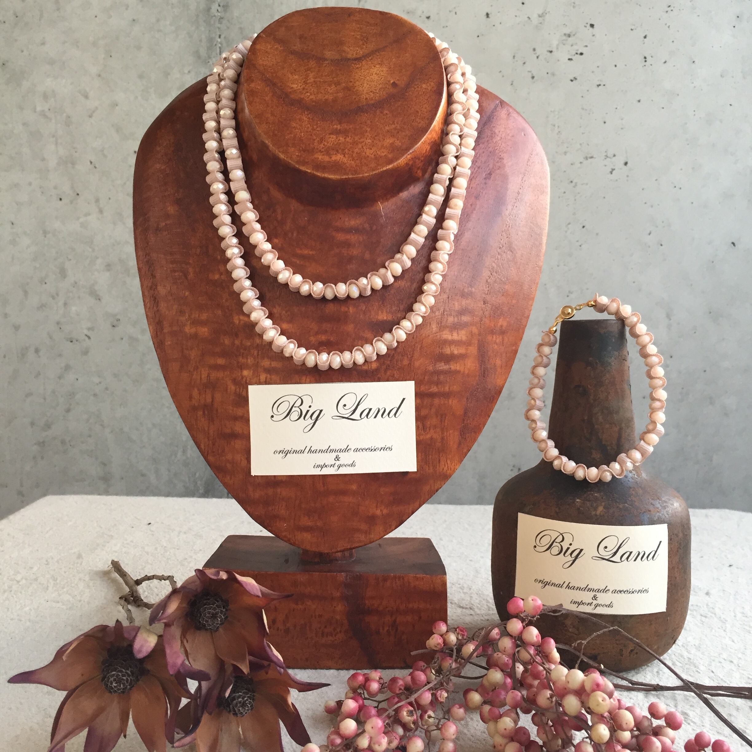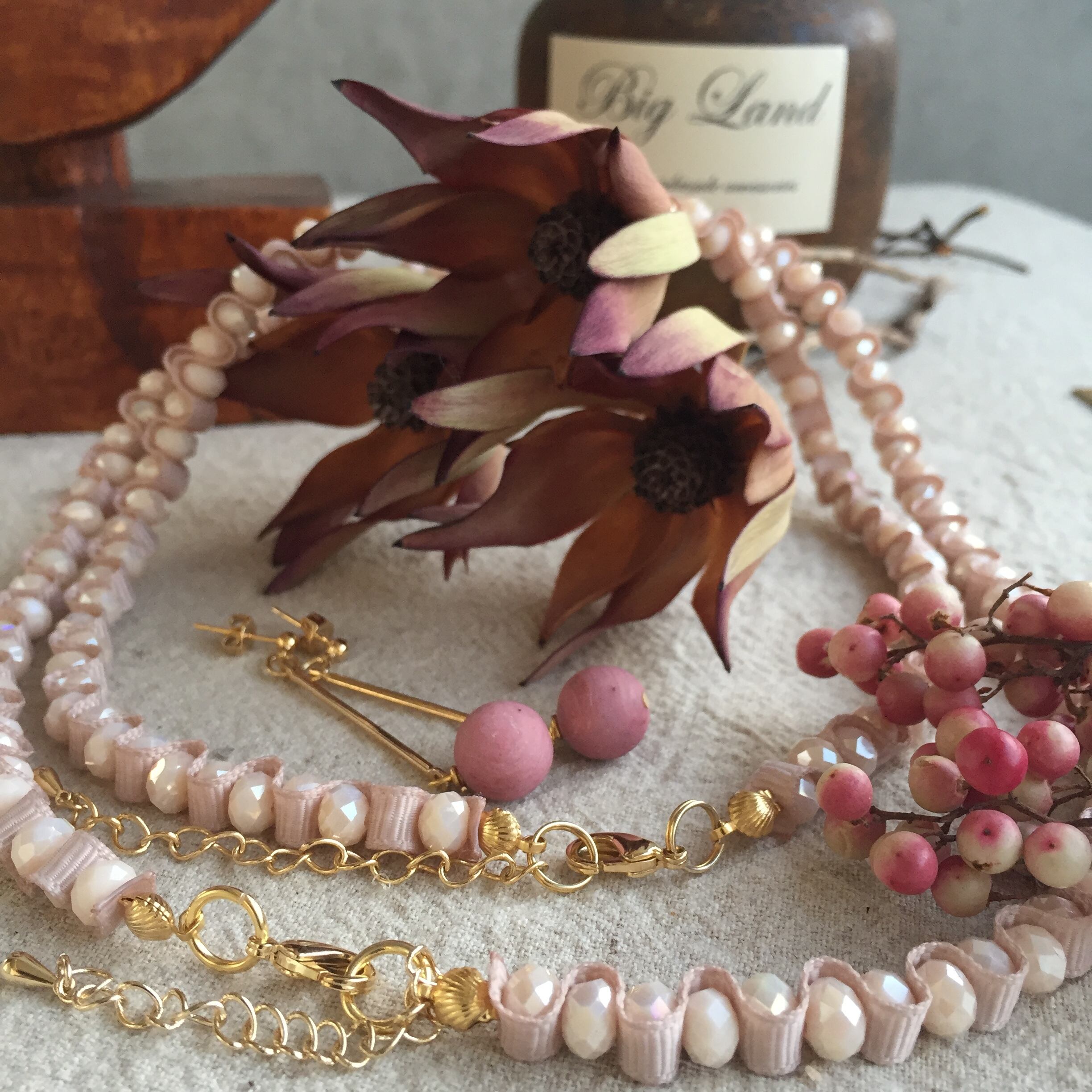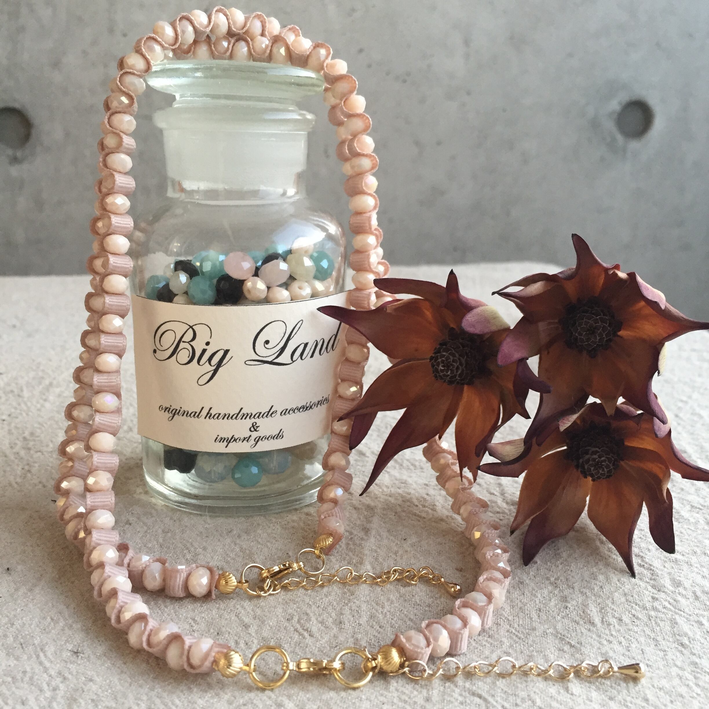 今年の春夏にも流行るべージュピンクのボタンガラスと落ち着いたピンクリボンで織り込みながらひと針ひと針丁寧に仕上げました。
