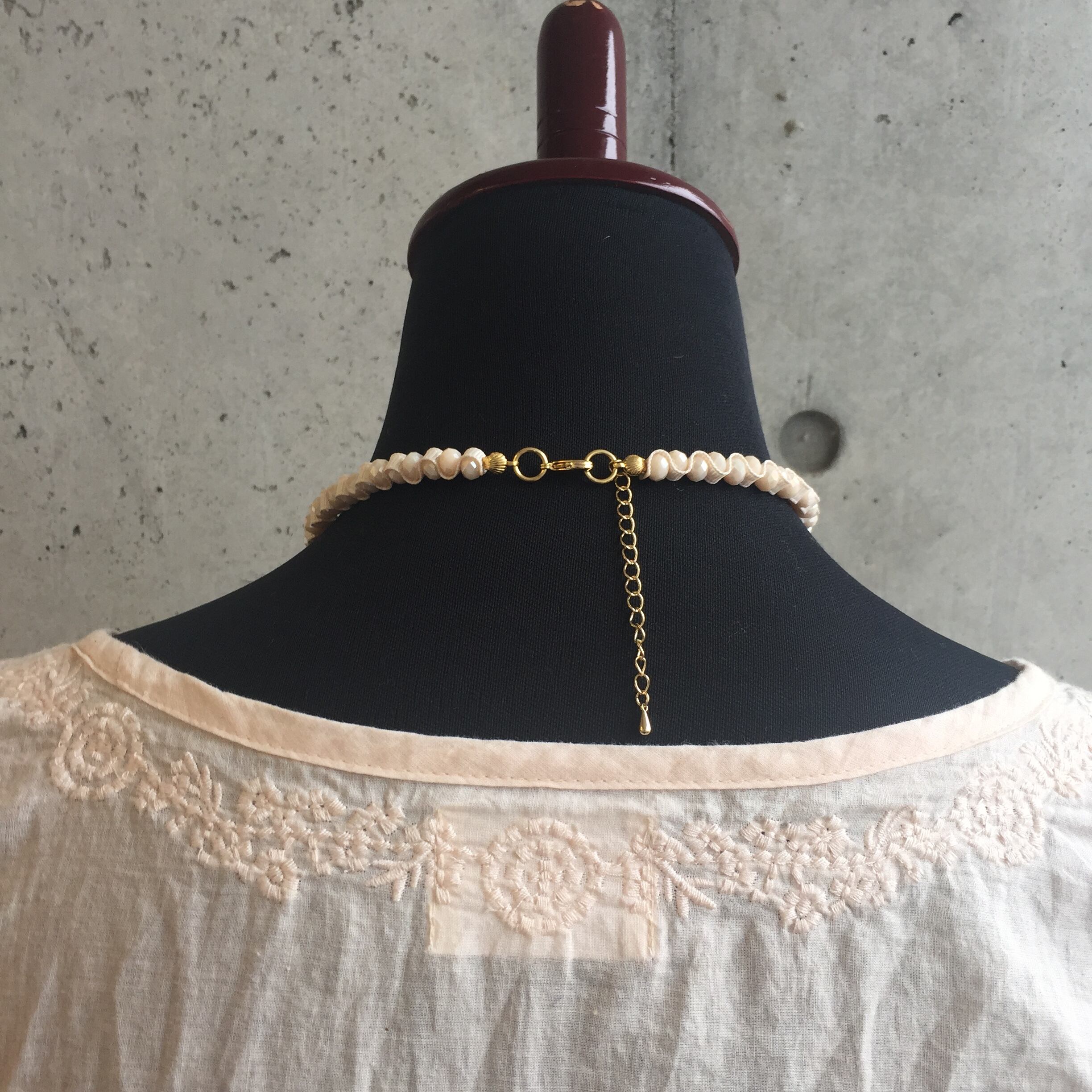 こちらの長さは今年流行りのチョーカータイプですが、約6cmのアジャスター付きなので鎖骨上の位置にもなります。