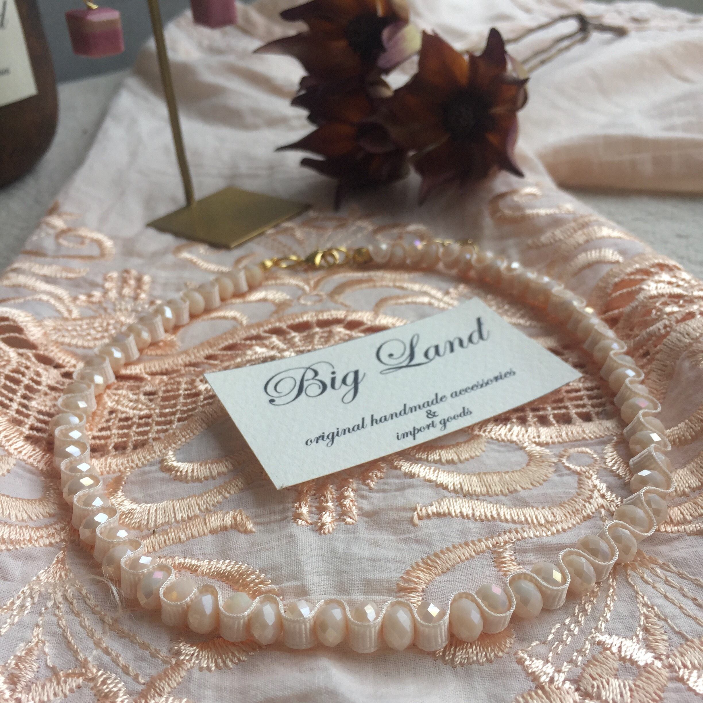 今年の春夏にも流行るベージュピンクのボタンガラスと桜貝の様な淡いピンクリボンで織り込みながらひと針ひと針丁寧に仕上げました。