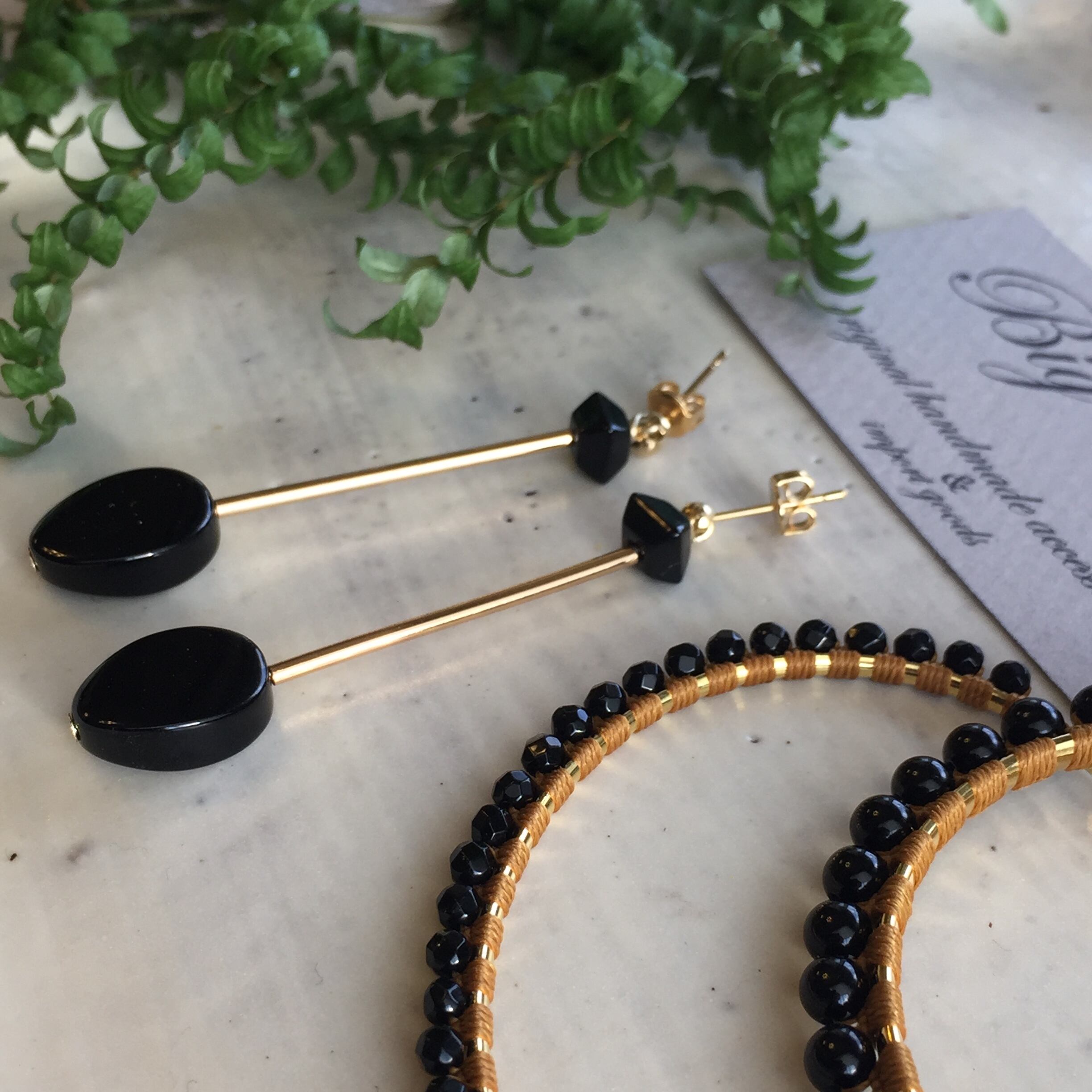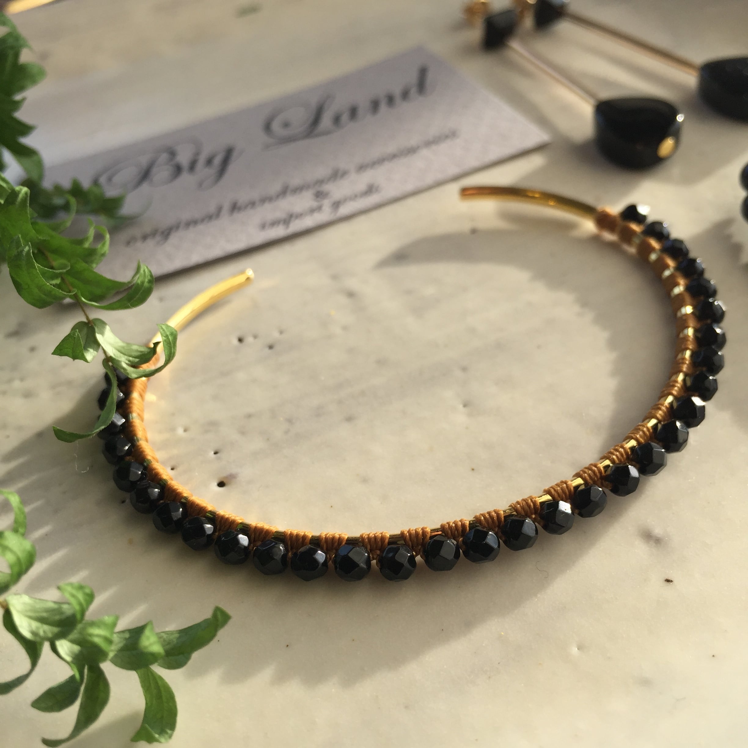 約2.5〜3mmの多面カットのオニキスを地金に紐でひと編みひと編みして仕上げました✨