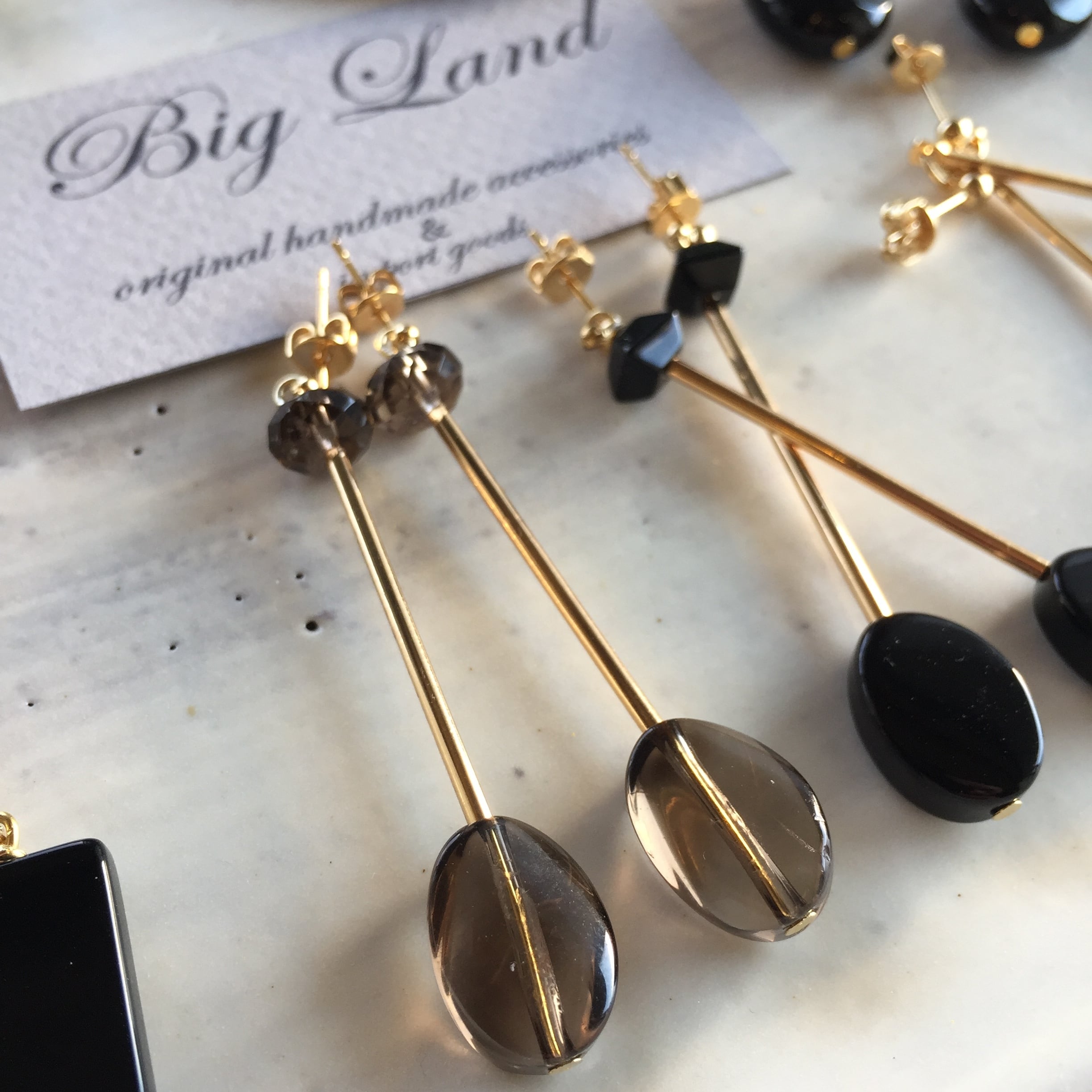 少しツイストカットされたスモーキークォーツと上の部分の多面カットのバランスが、高級感があり艶のある女性を演出できる雰囲気に仕上げました。