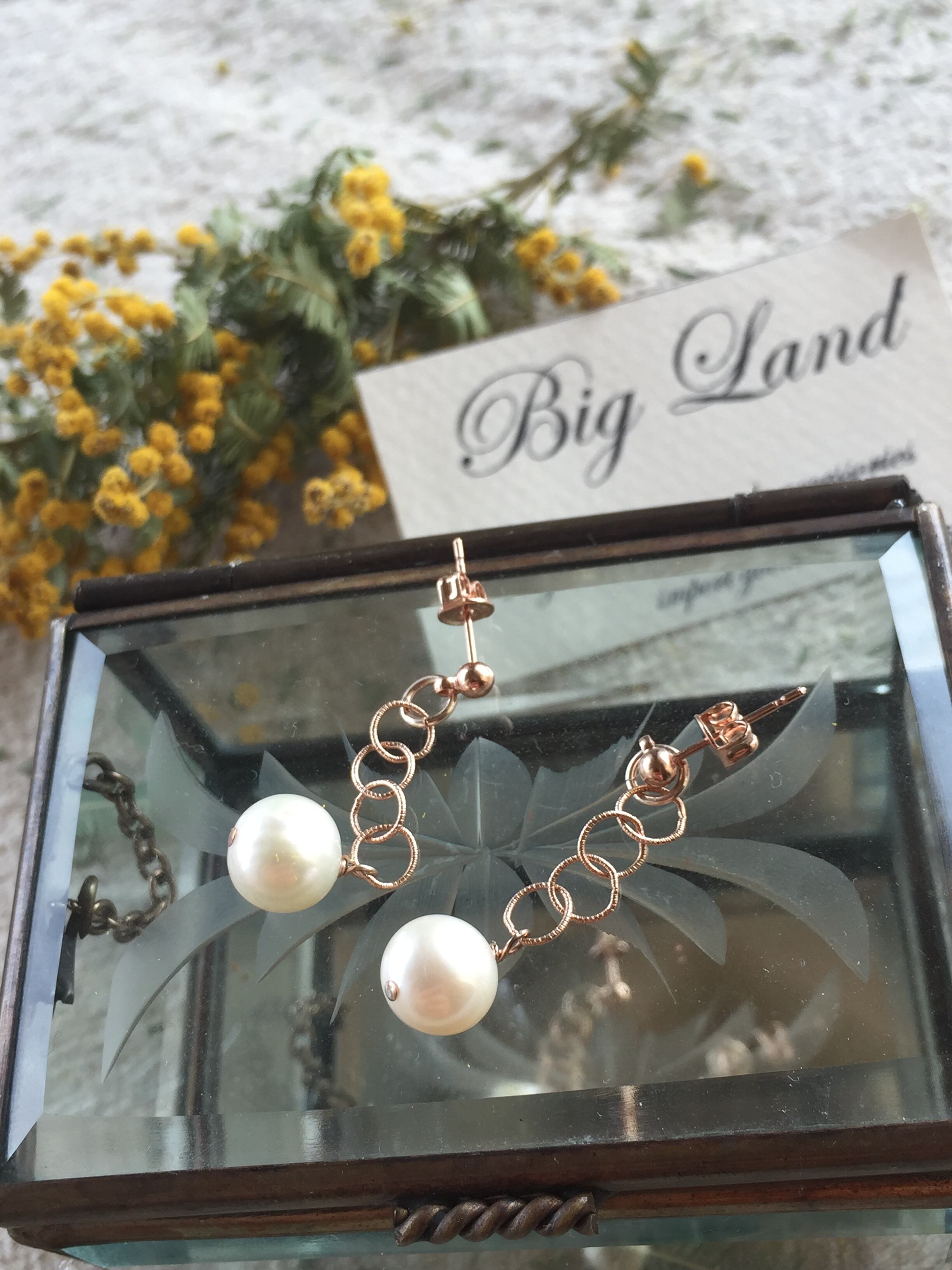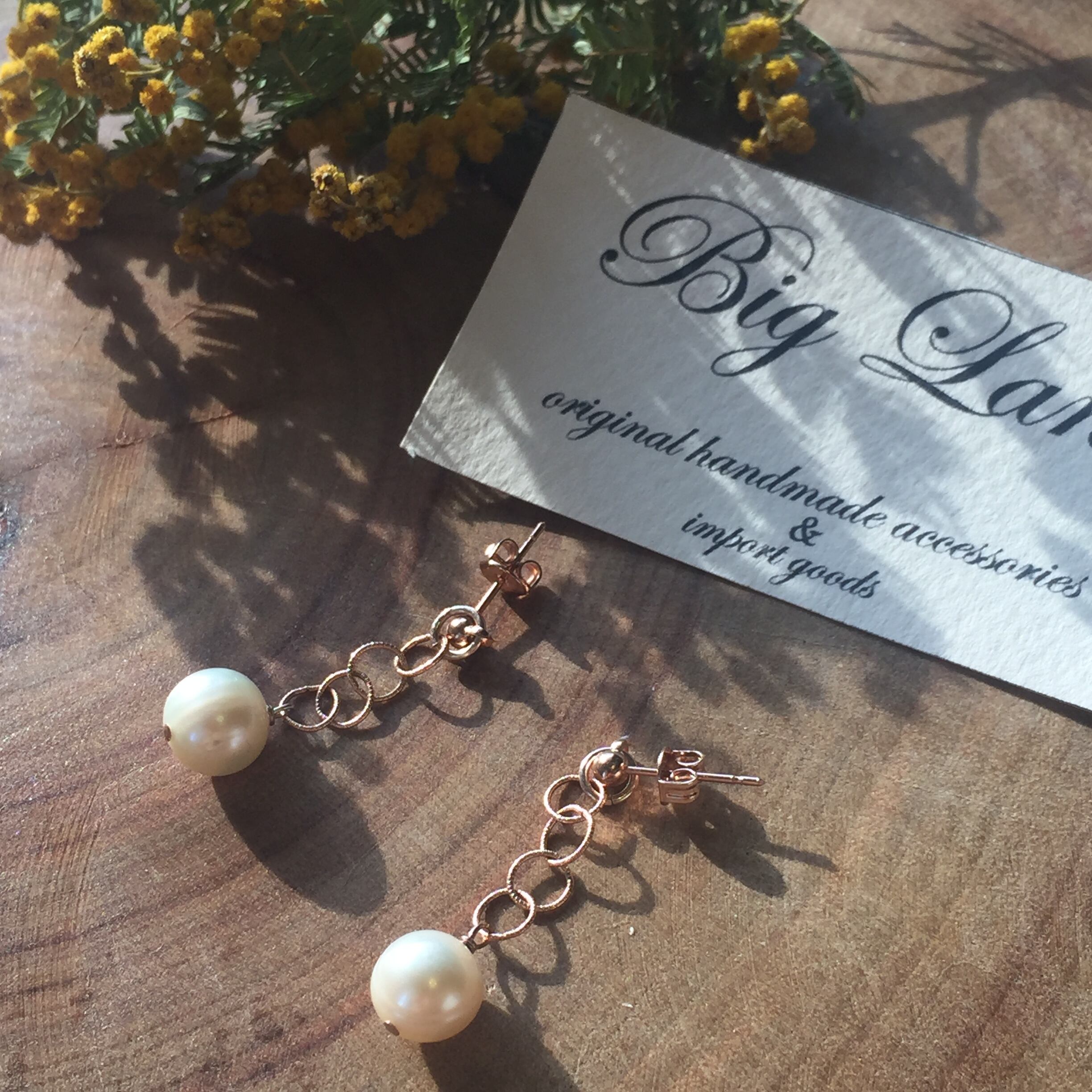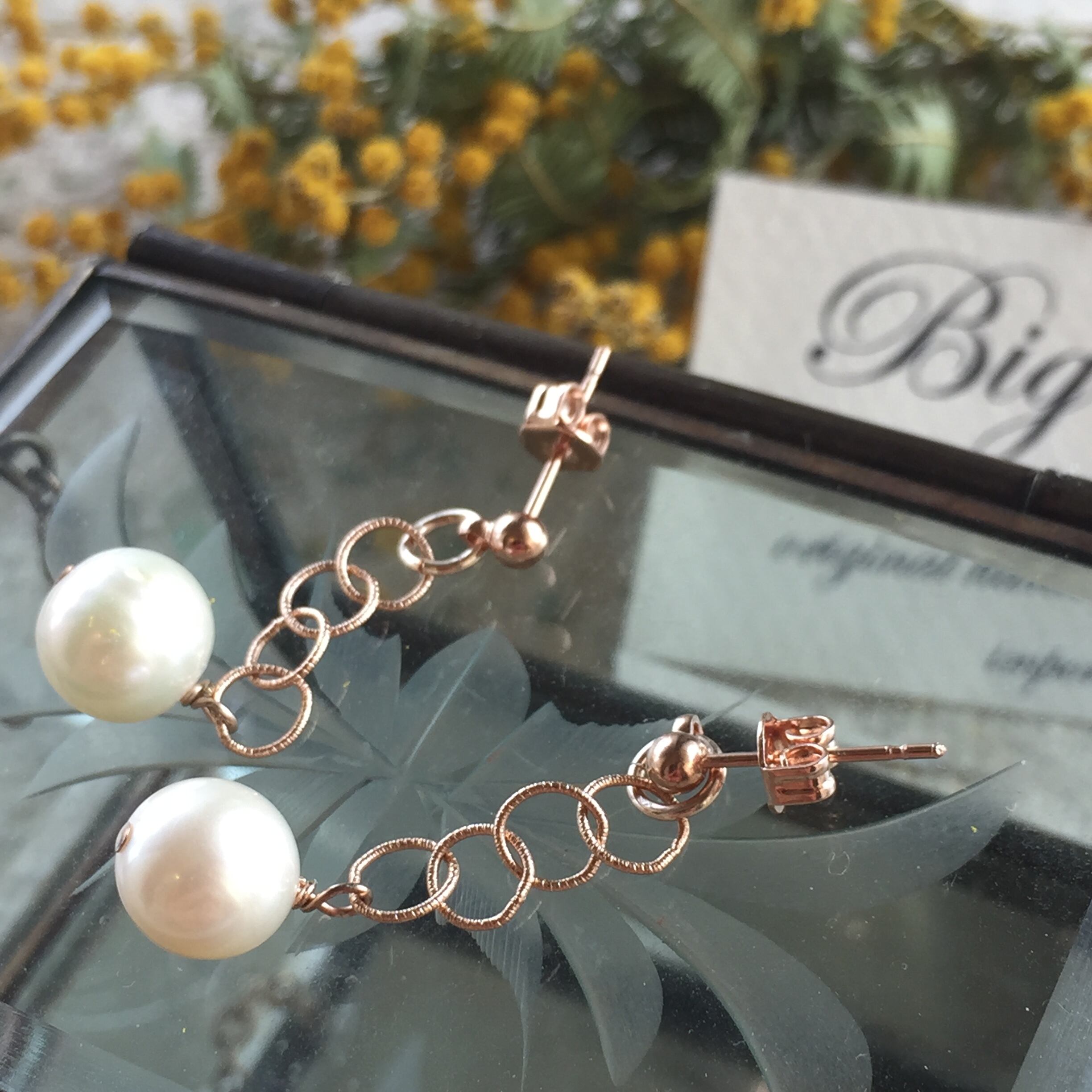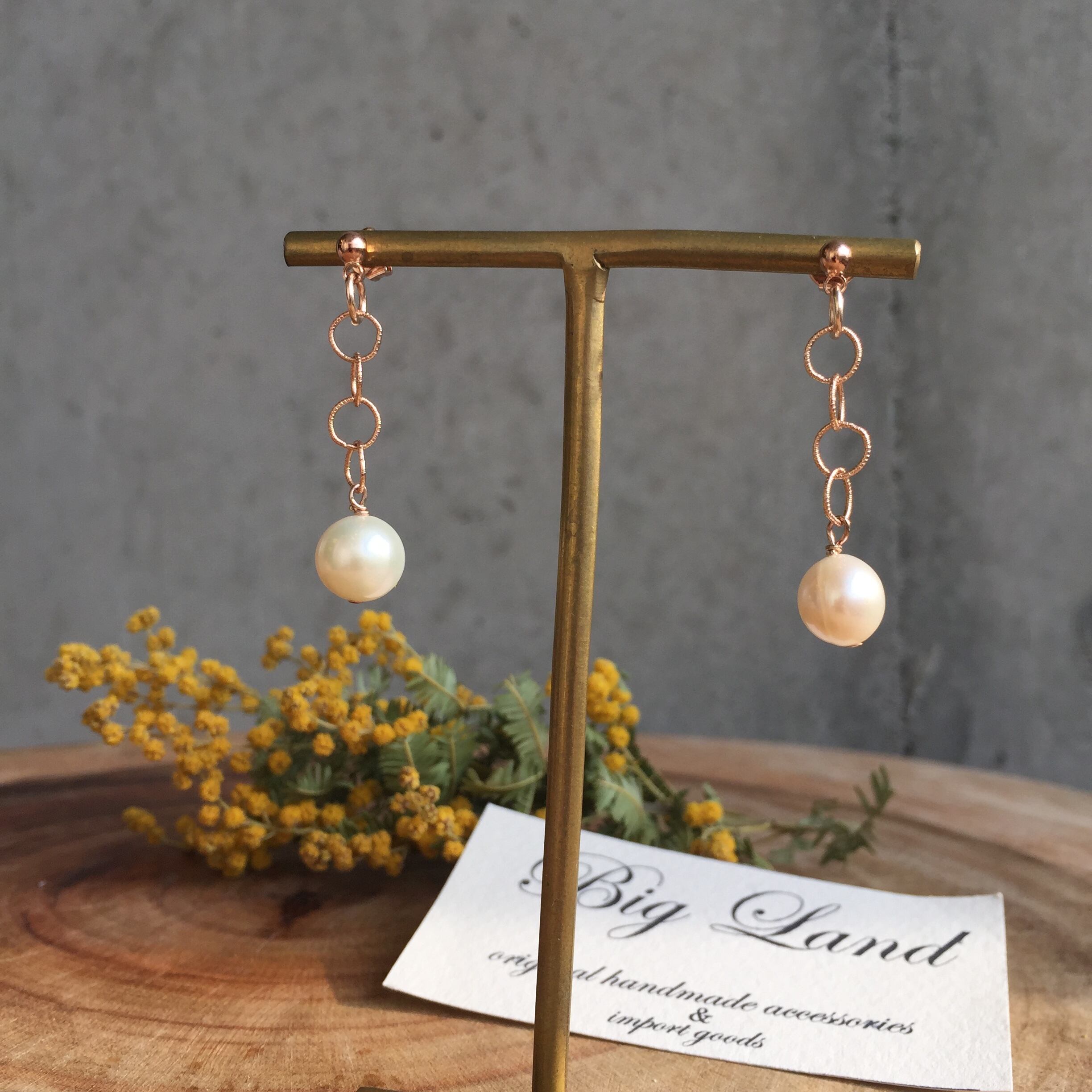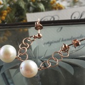 ピンクゴールド色のデザインチェーンに淡水パールを付けて上品な揺れるピアスにしました