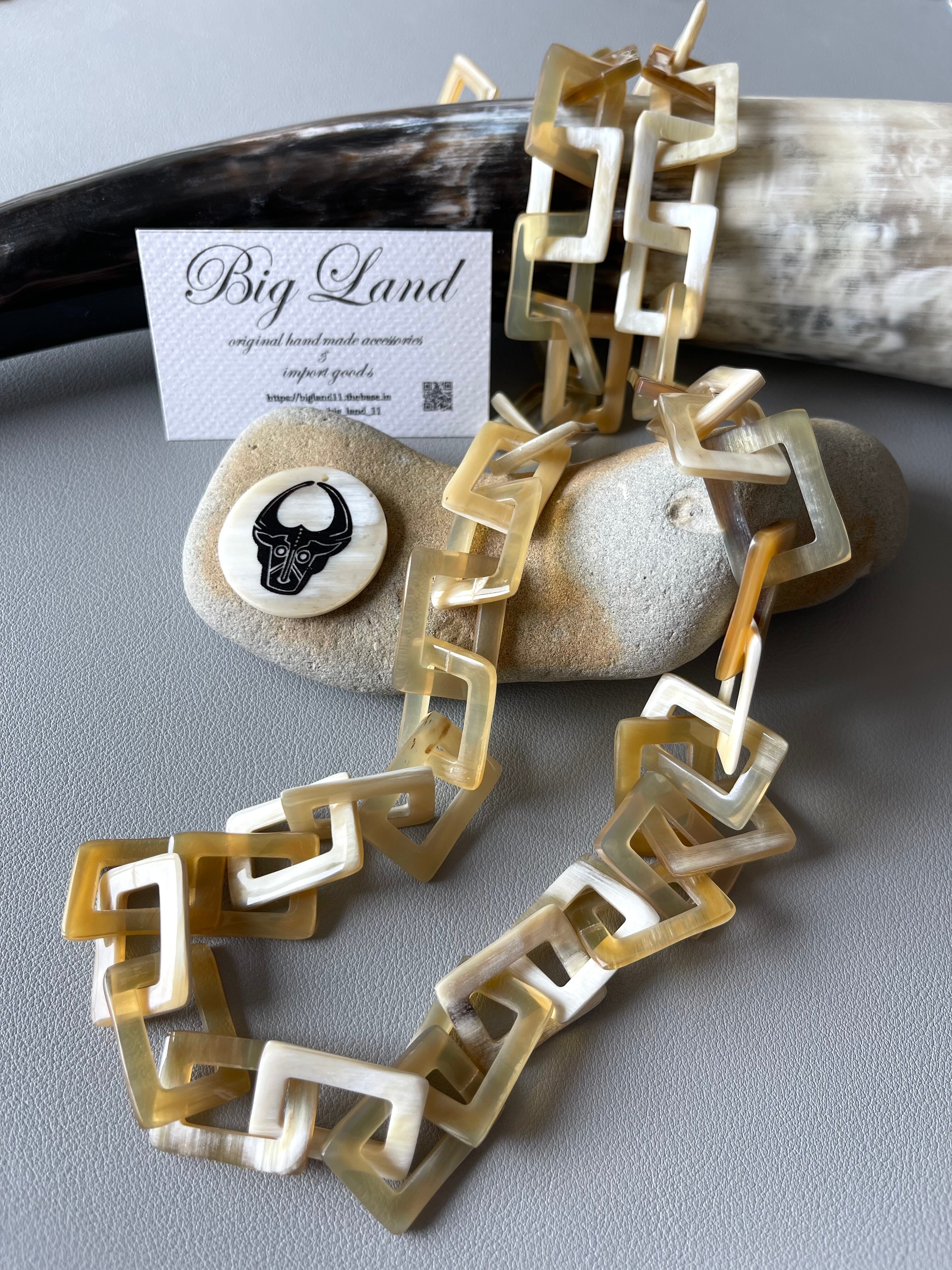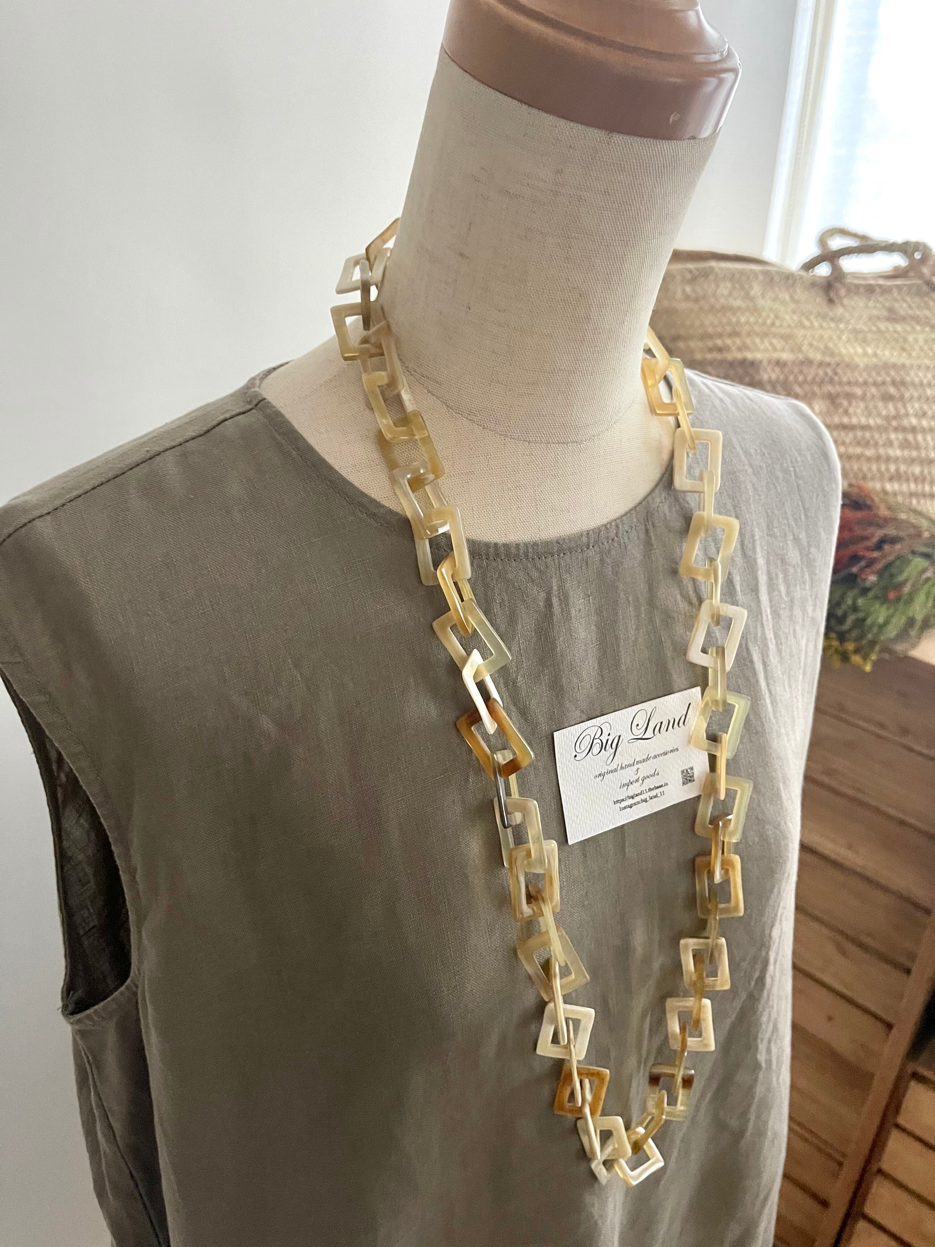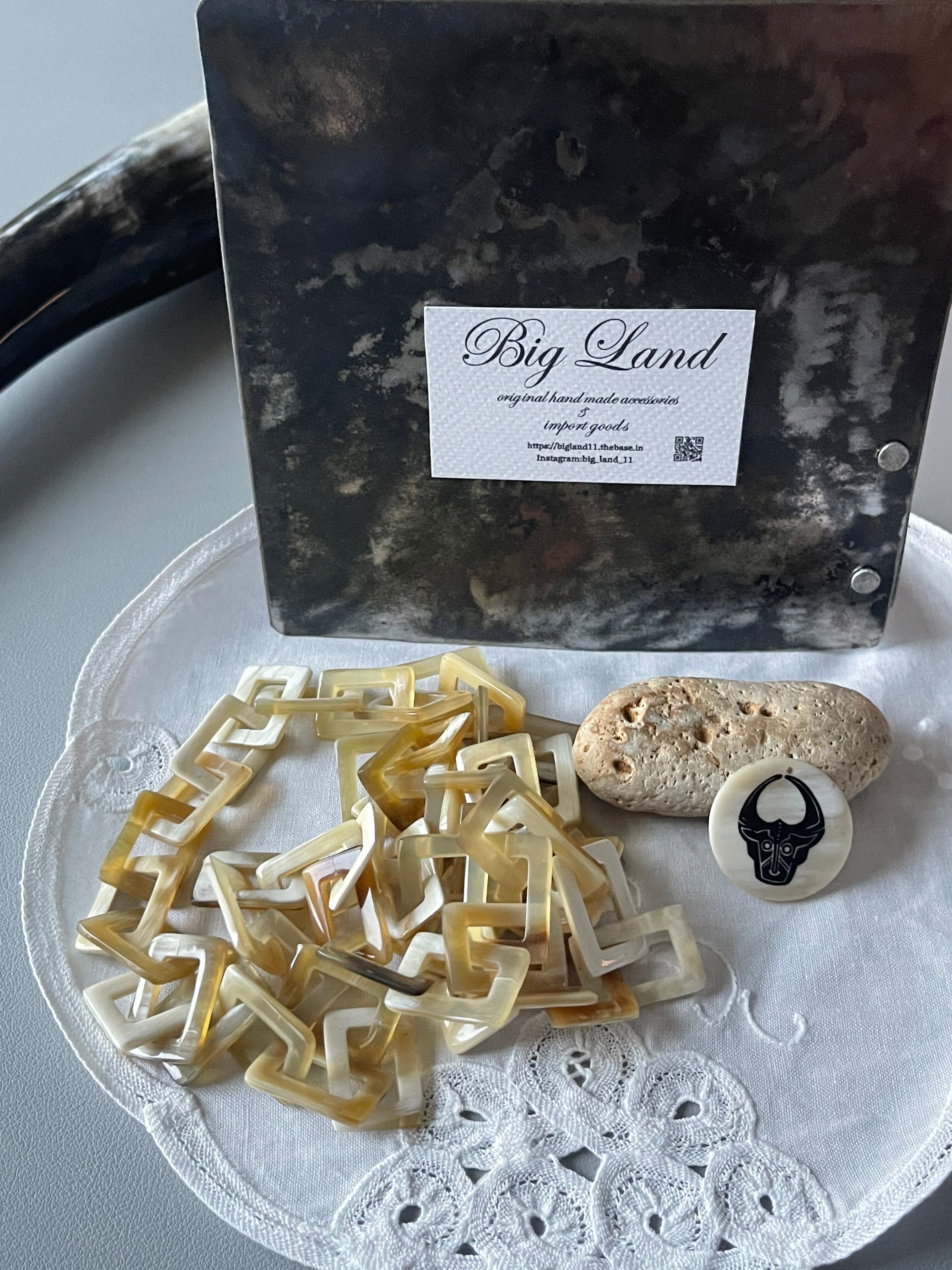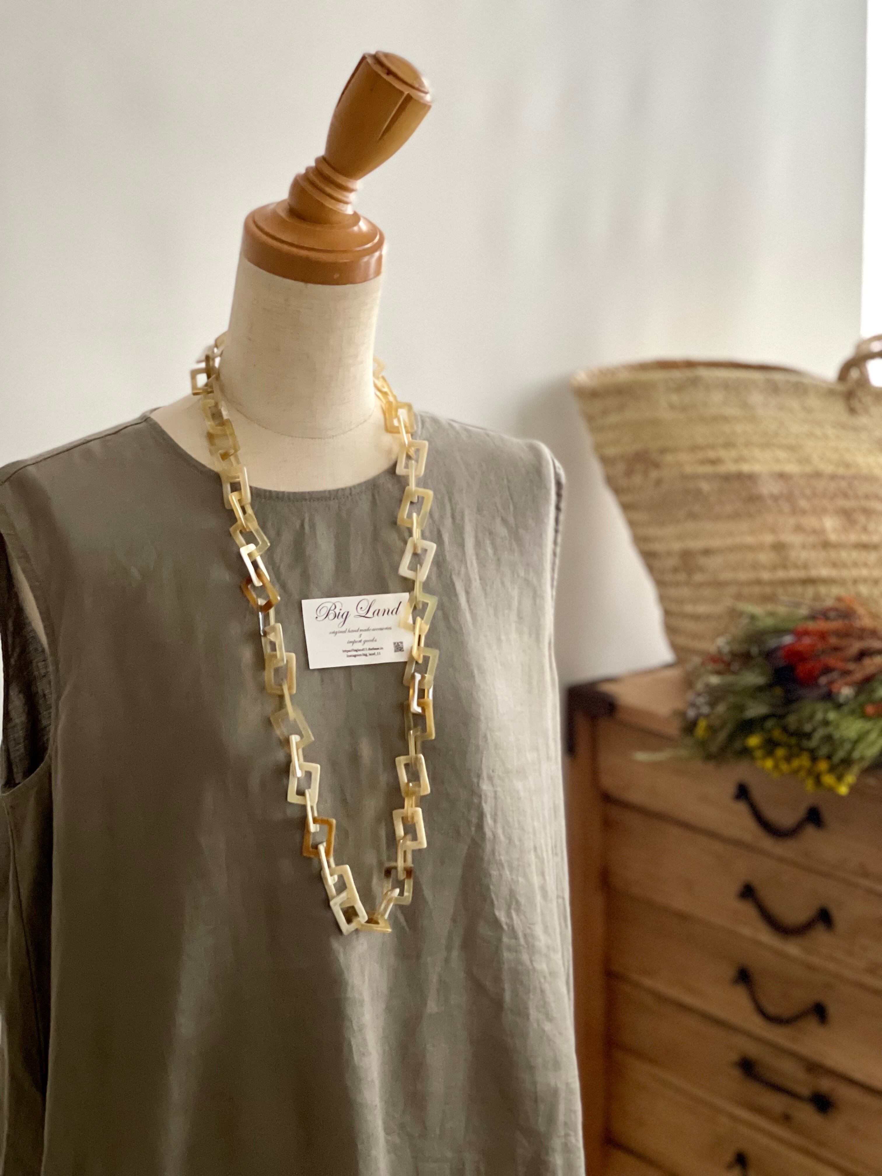 こちらのネックレスは、艶感がありスクエアがスタイリッシュでカッコイイ雰囲気になり...水牛ならではの軽い装着感とこなれたワンランク上の雰囲気で夏の汗ばむ季節でも天然素材の水牛角の為お肌に優しく、秋冬はニットにこちらを装着するだけで、存在感がありオシャレに差がつきます✨