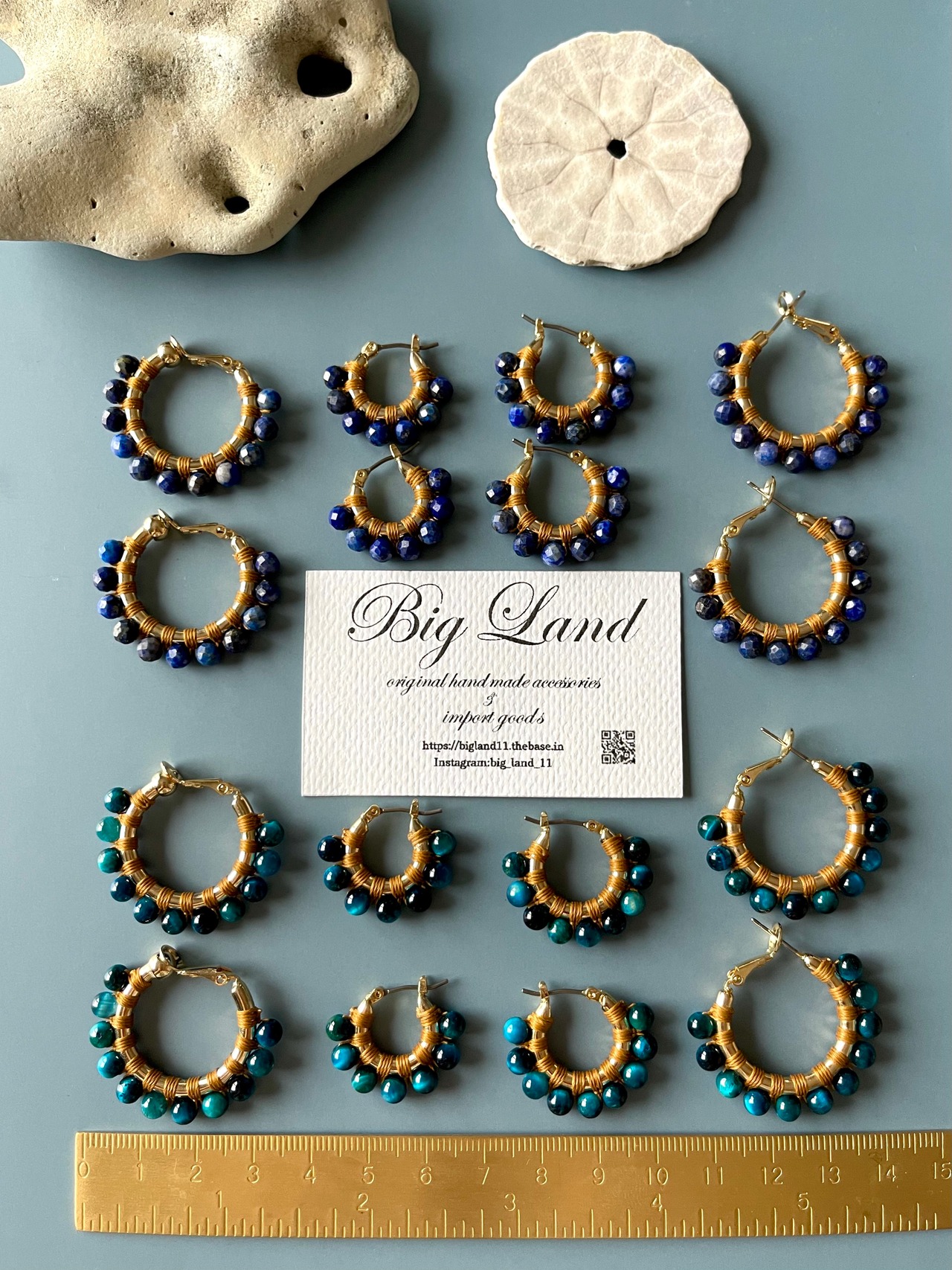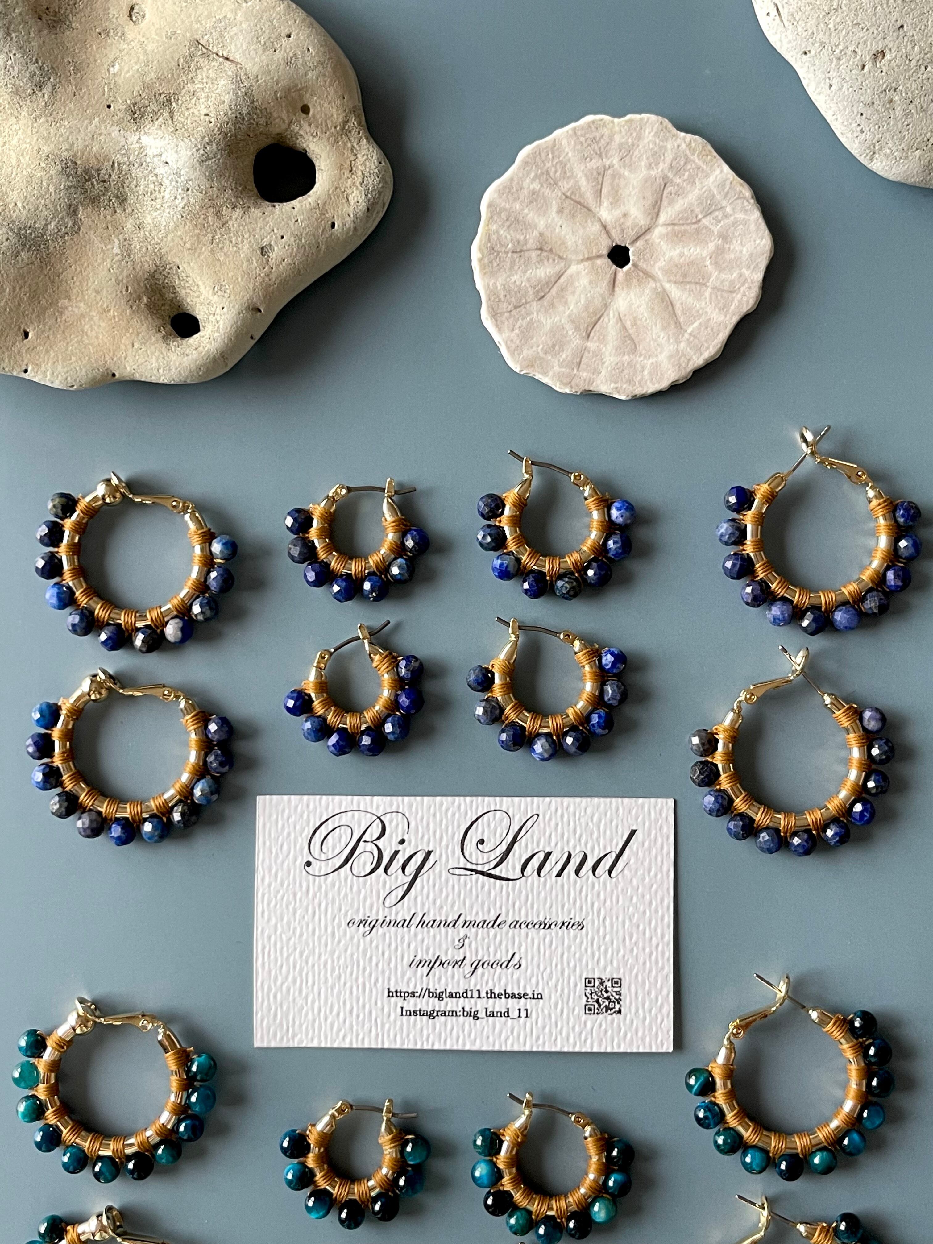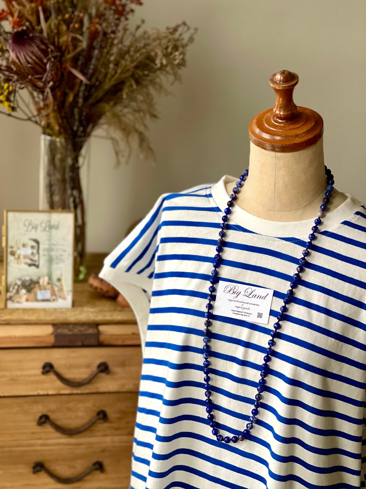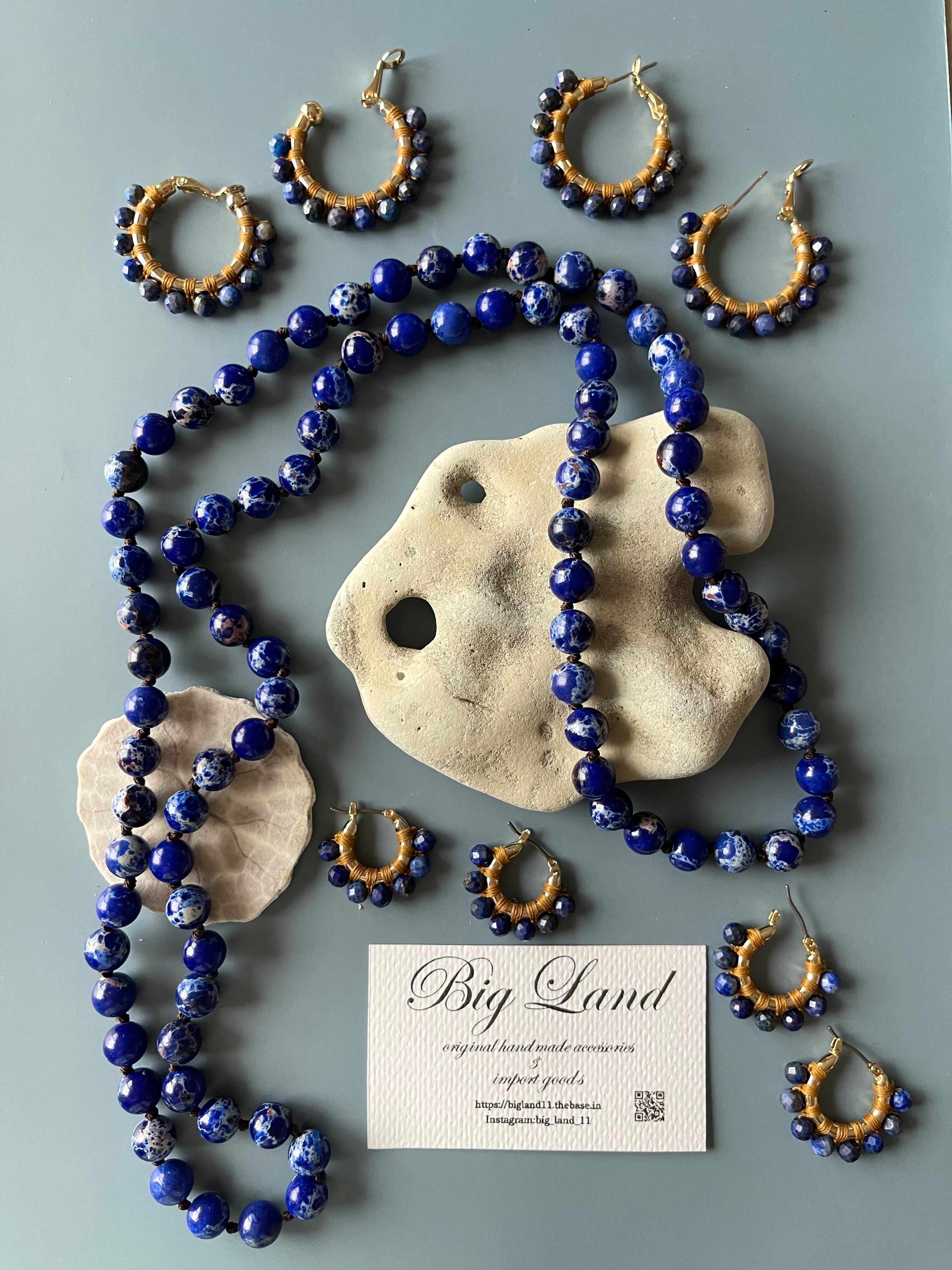多面カット天然石ラピスラズリを一粒一粒糸で丁寧にしっかり編みあげ、高級感がありどんなお洋服にも合うと皆様色違いでご購入されてます
